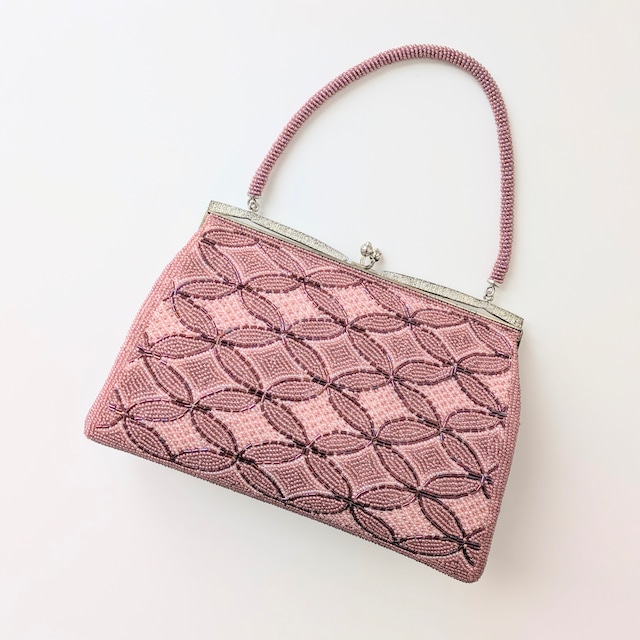 【Vintage】ビーズ刺繍バッグ くすみピンク 七宝繋ぎ パーティーバッグ 昭和レトロ 大正浪漫 フォーマルバッグ