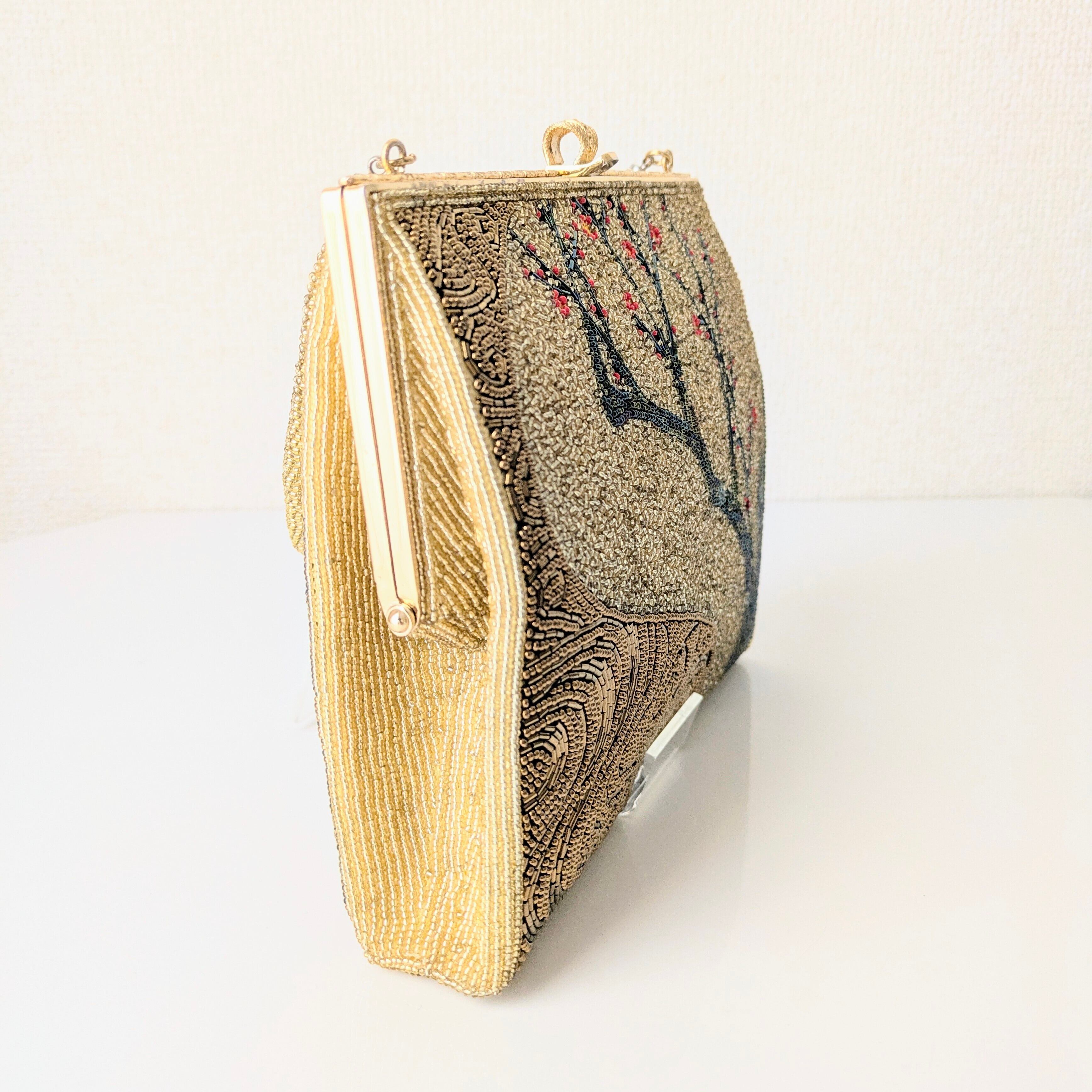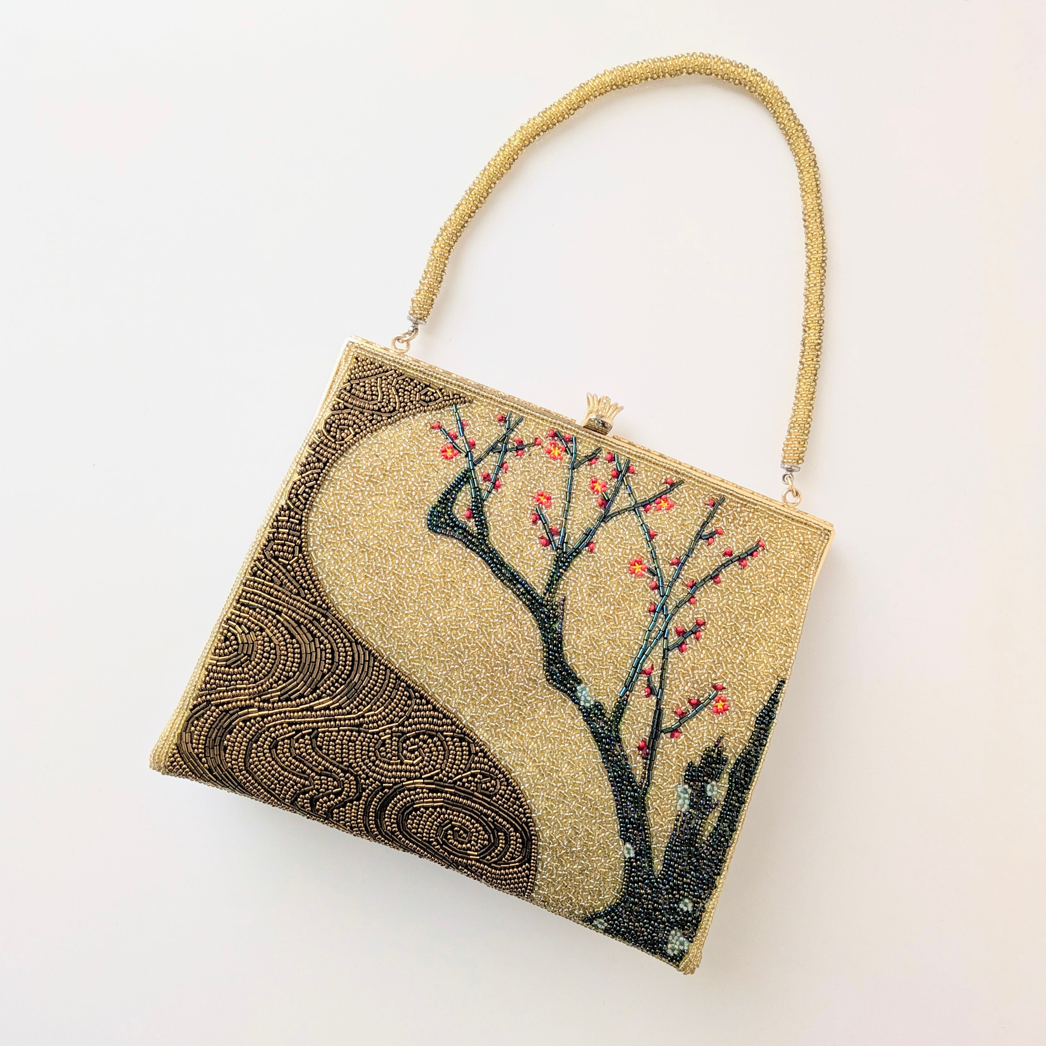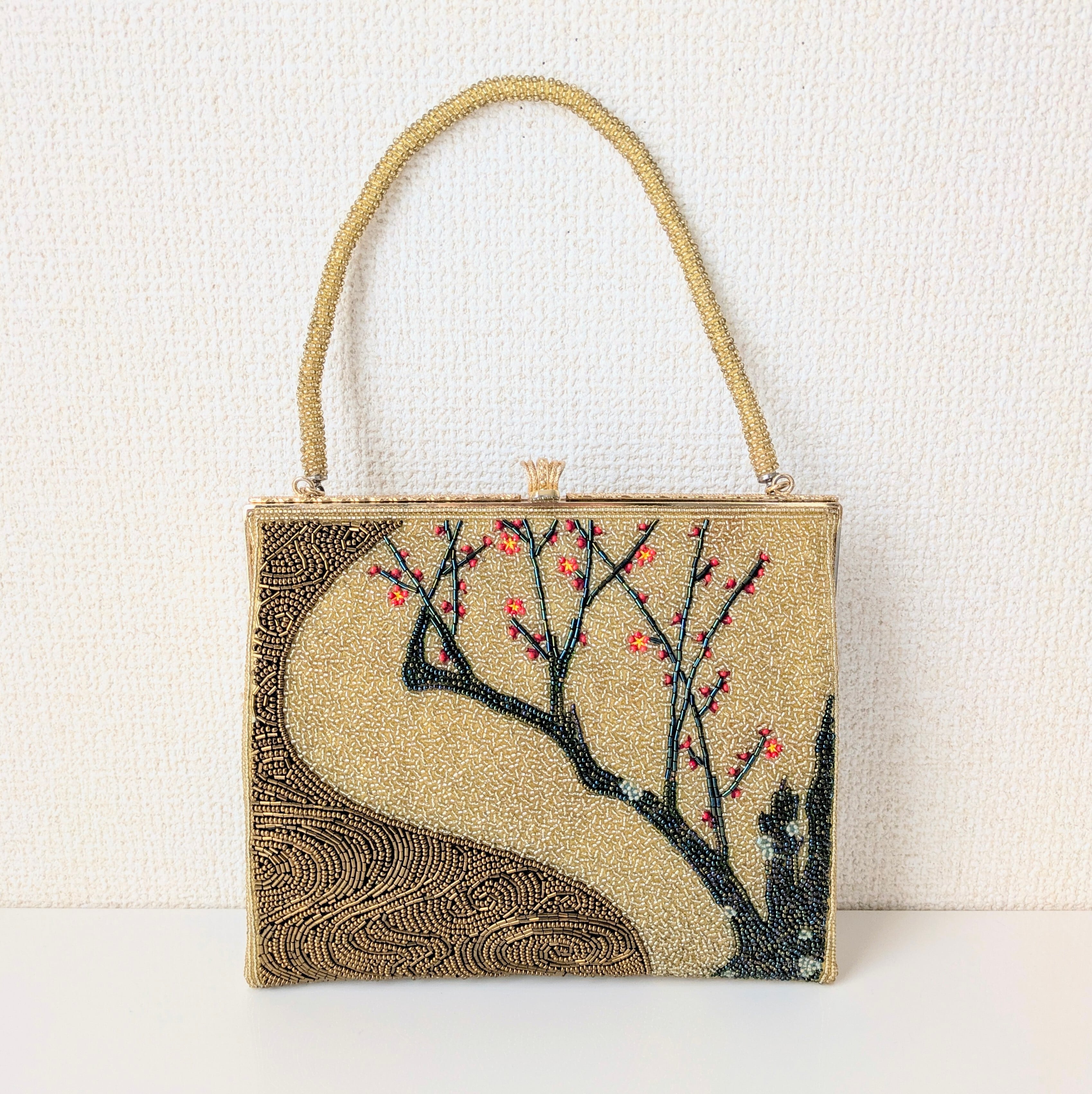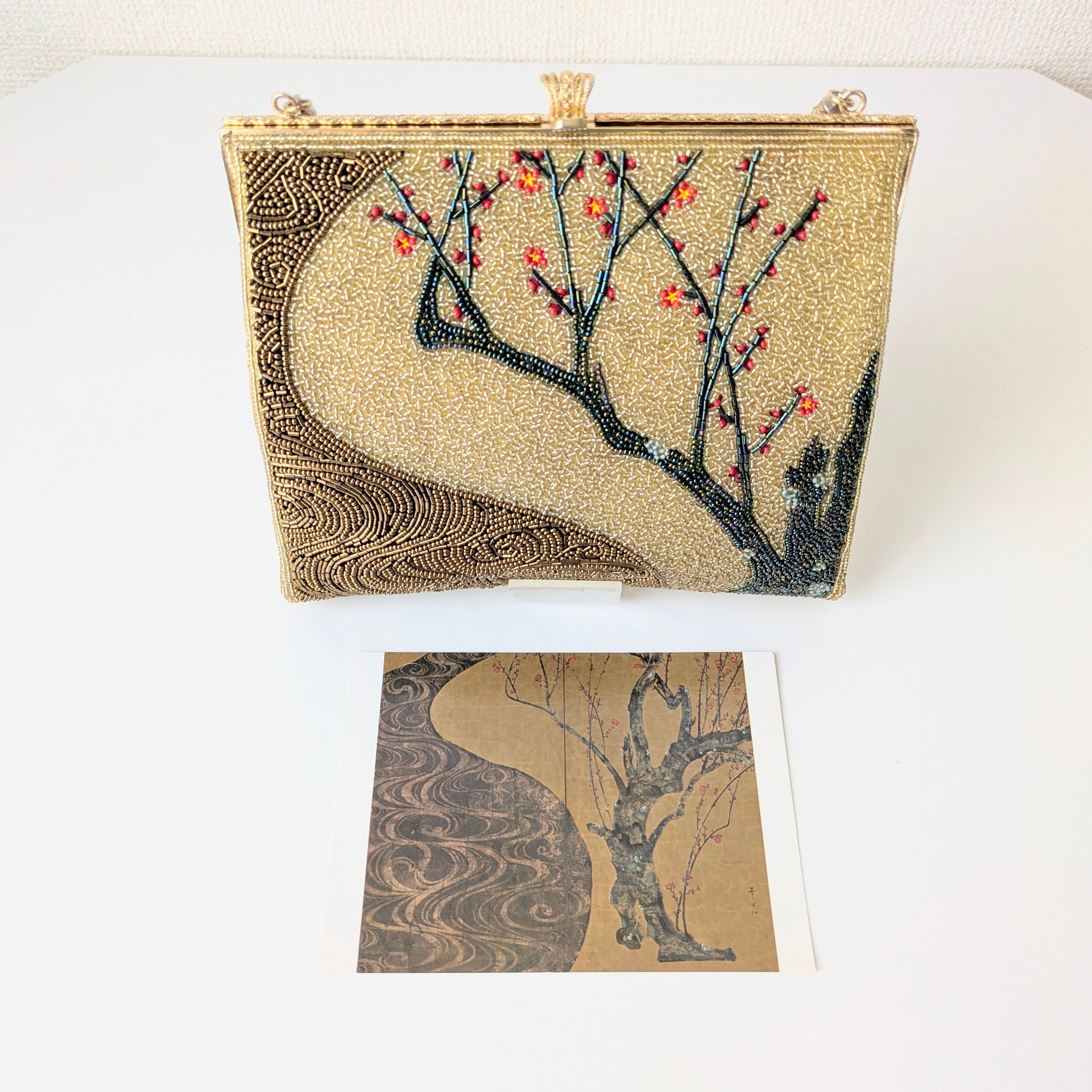 江戸時代の著名な絵師、尾形光琳が晩年に描いた屏風絵「紅白梅図屏風」をビーズで再現した、大変貴重なビーズバッグです。「紅白梅図屏風」は国宝に指定されている重要文化財で、日本美術を代表する名品として知られています。当店のビーズバッグコレクションの中でも特に希少価値の高い逸品です。ビーズには精巧な刺繍が施されており、高い技術が光ります。裏面に多少の汚れがありますが、その他は目立ったダメージはなく、状態は良好です。
