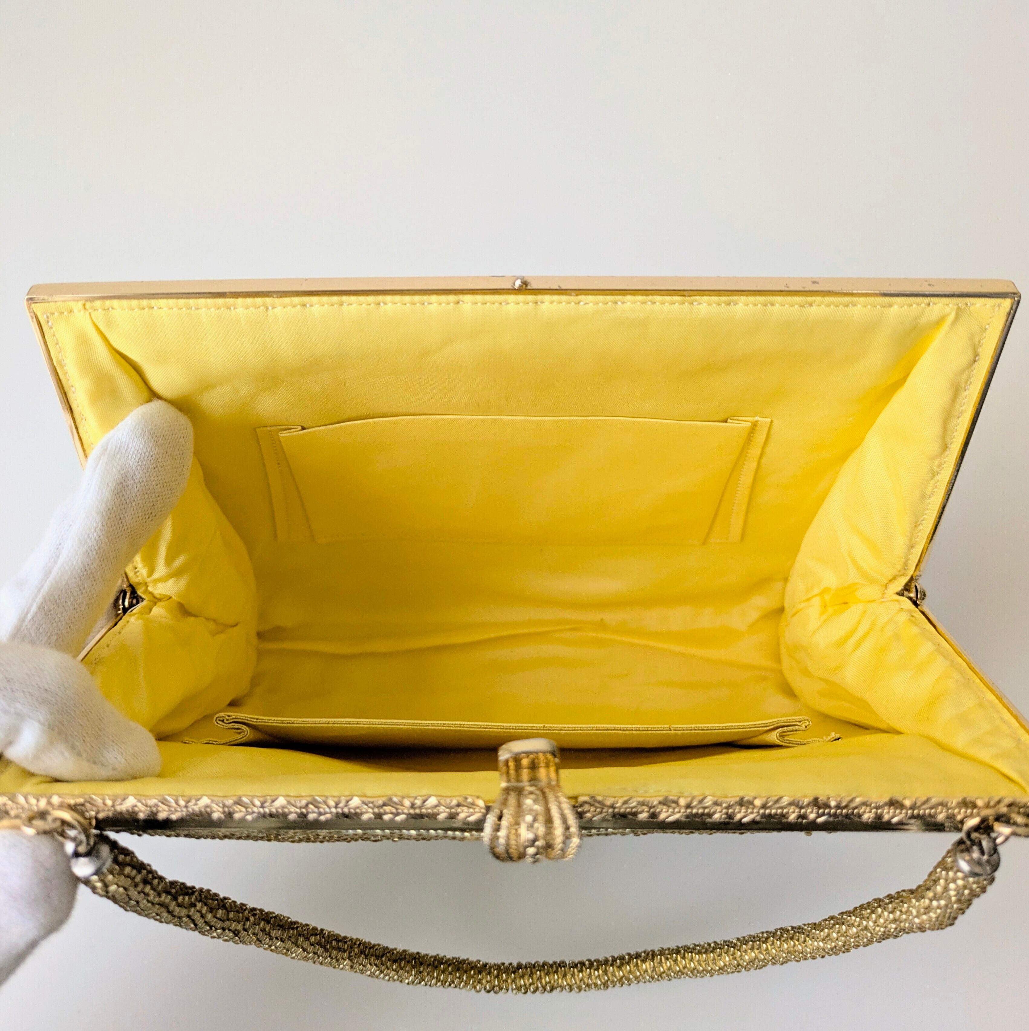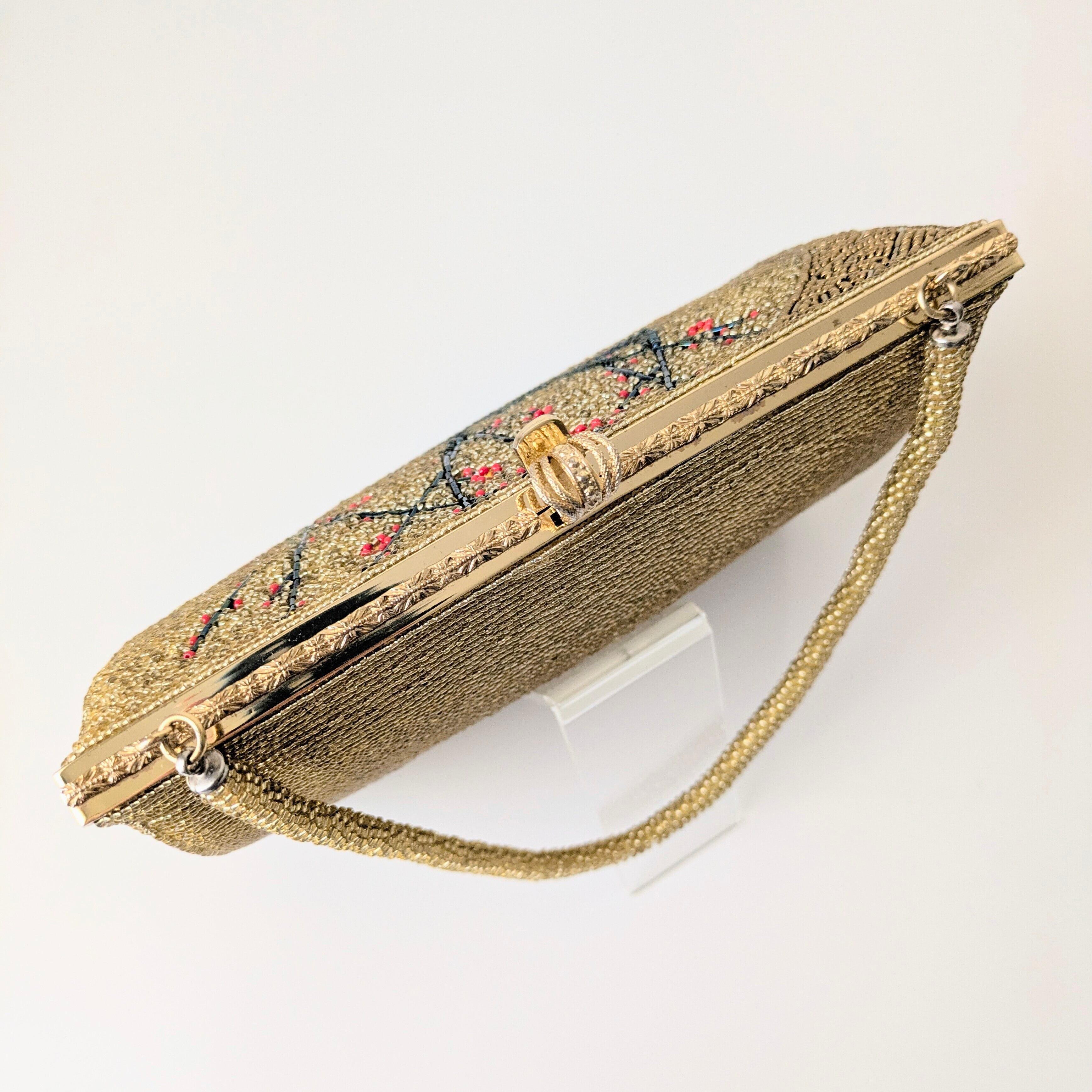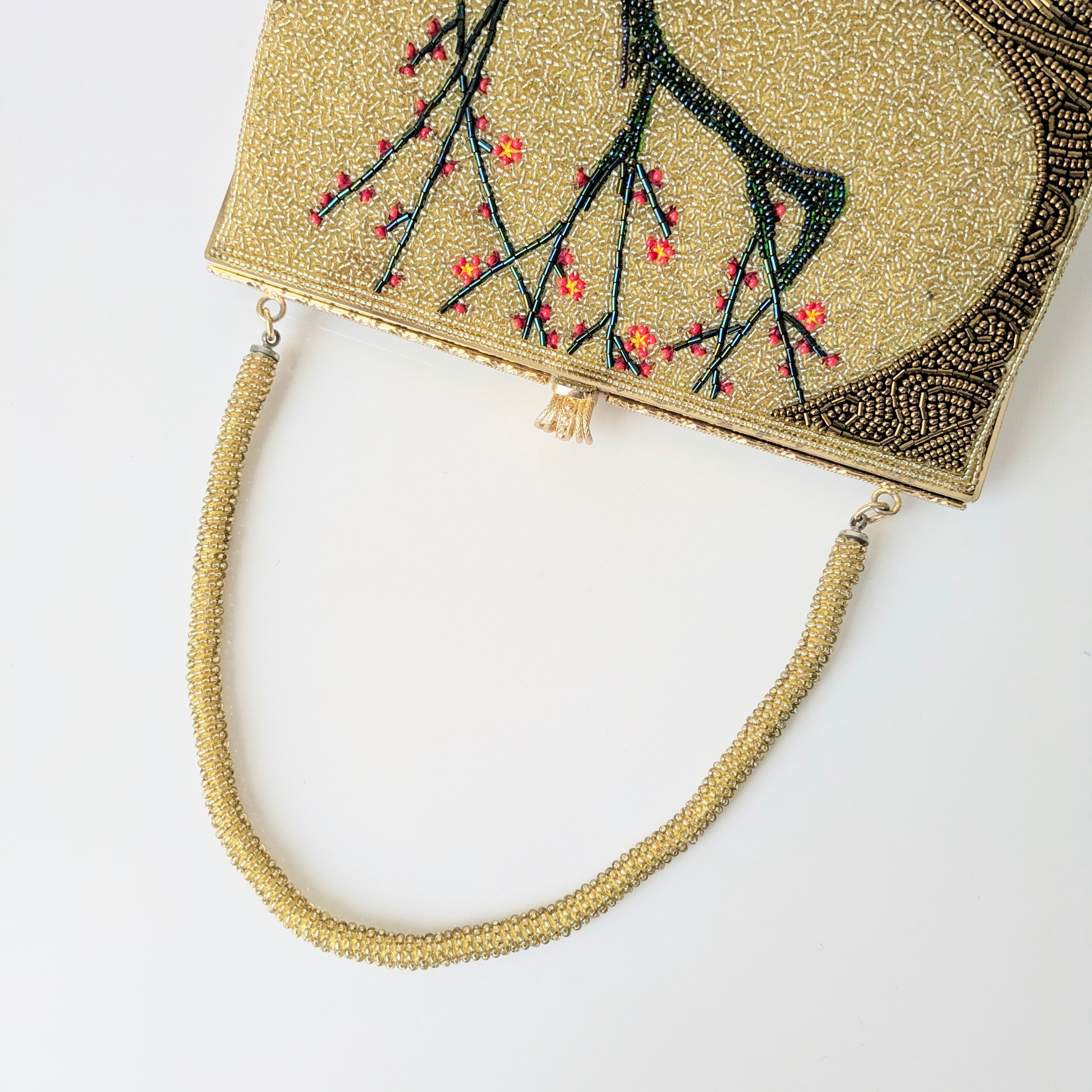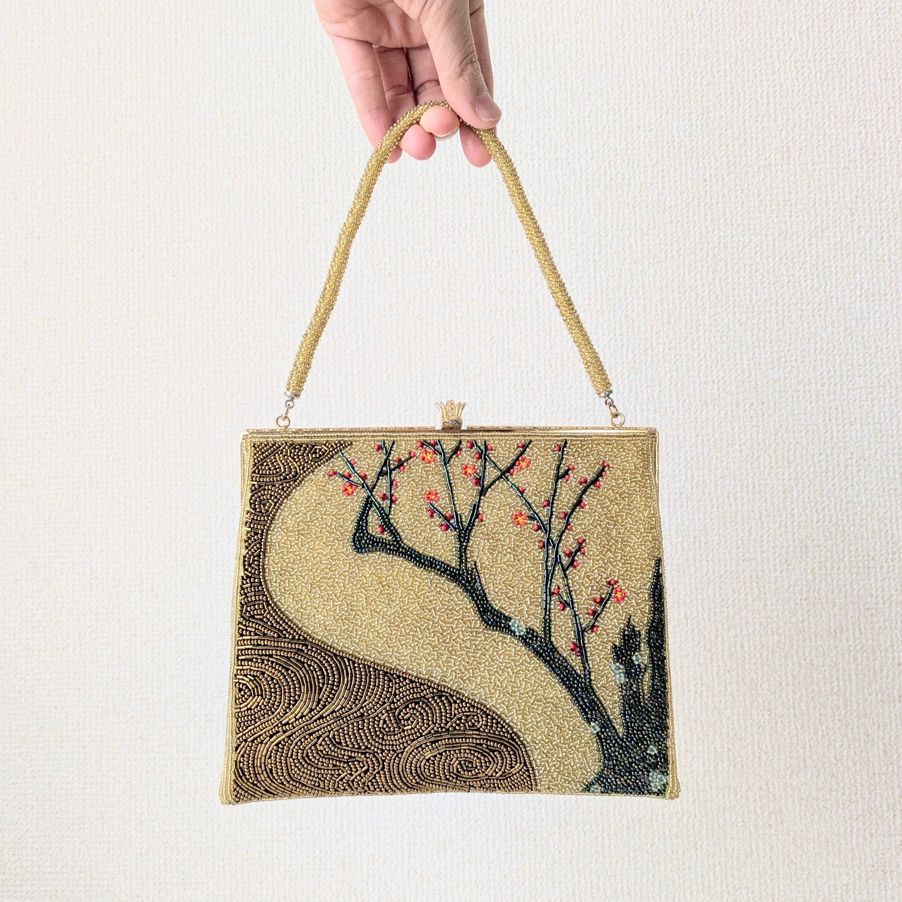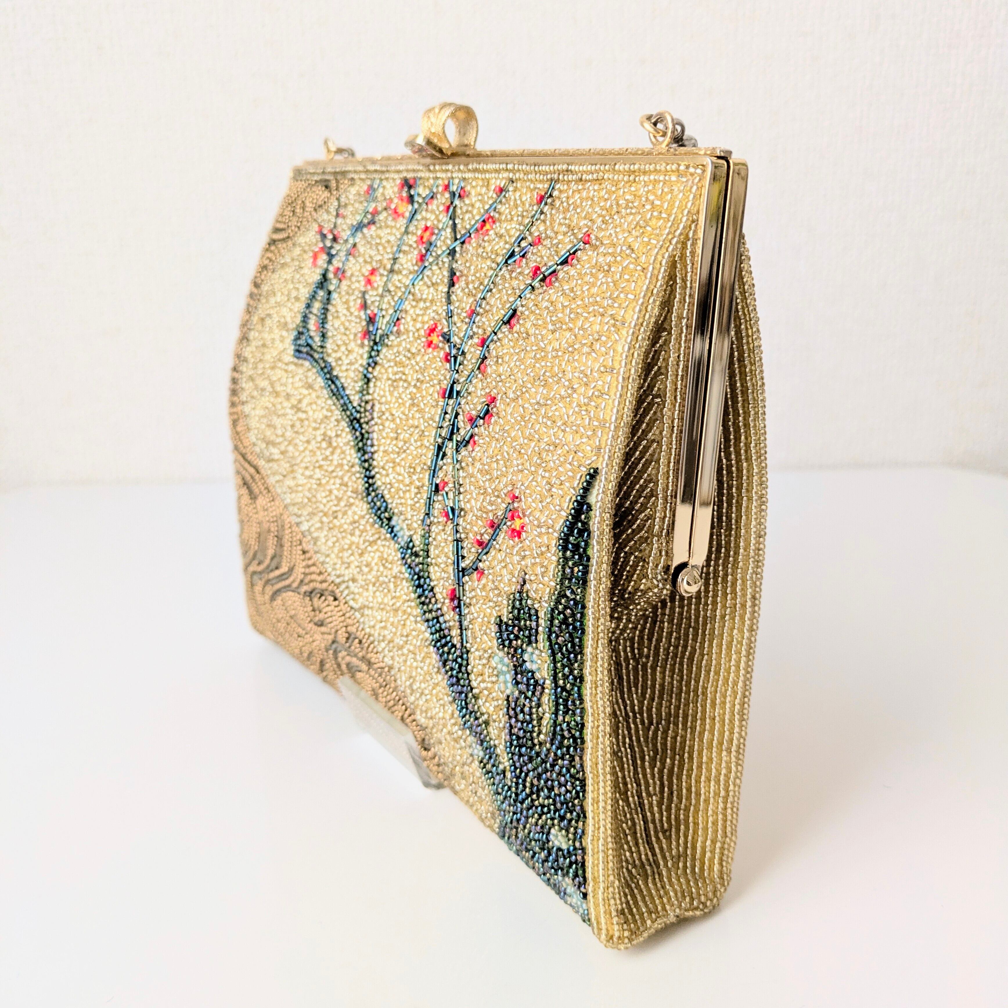 江戸時代の著名な絵師、尾形光琳が晩年に描いた屏風絵「紅白梅図屏風」をビーズで再現した、大変貴重なビーズバッグです。「紅白梅図屏風」は国宝に指定されている重要文化財で、日本美術を代表する名品として知られています。当店のビーズバッグコレクションの中でも特に希少価値の高い逸品です。ビーズには精巧な刺繍が施されており、高い技術が光ります。裏面に多少の汚れがありますが、その他は目立ったダメージはなく、状態は良好です。