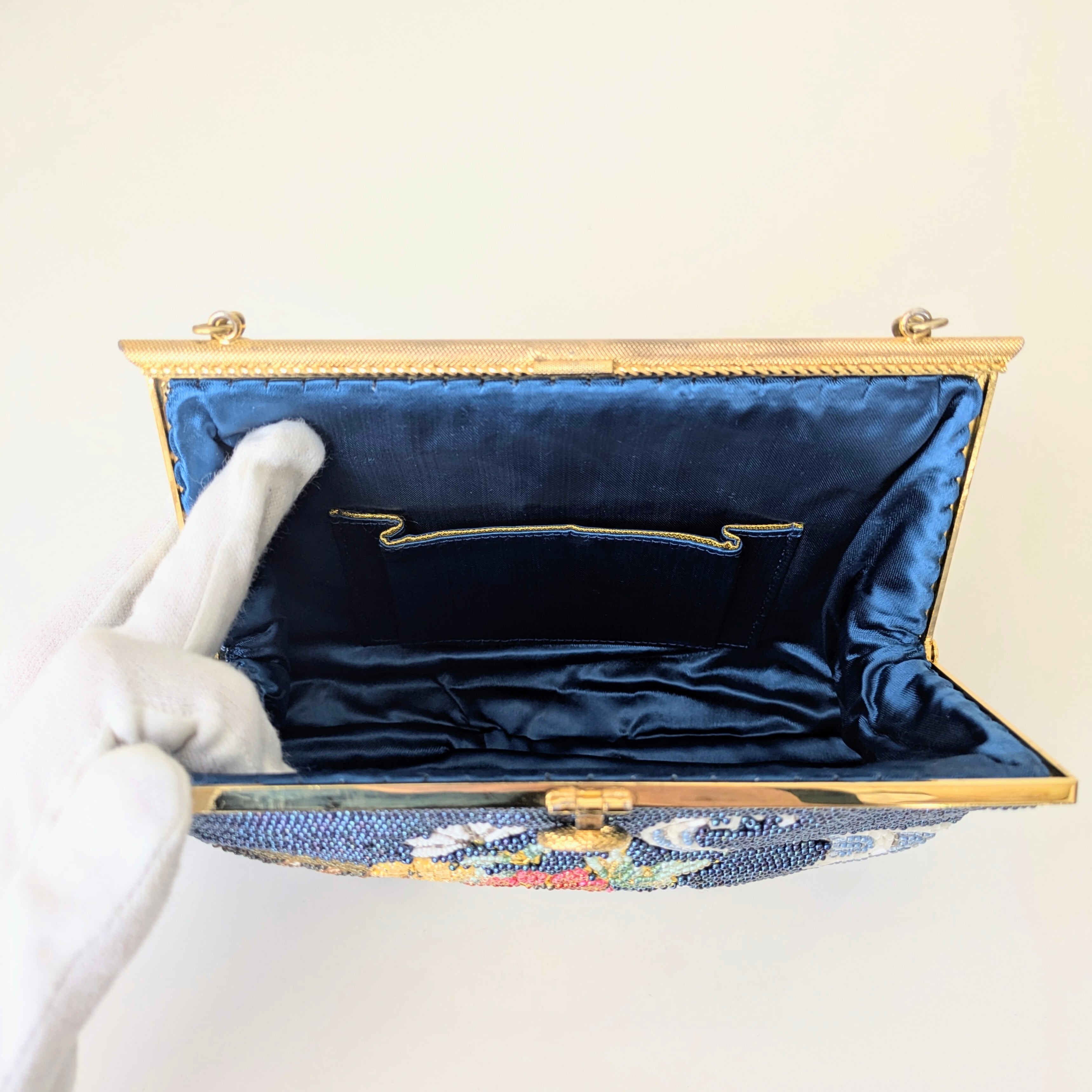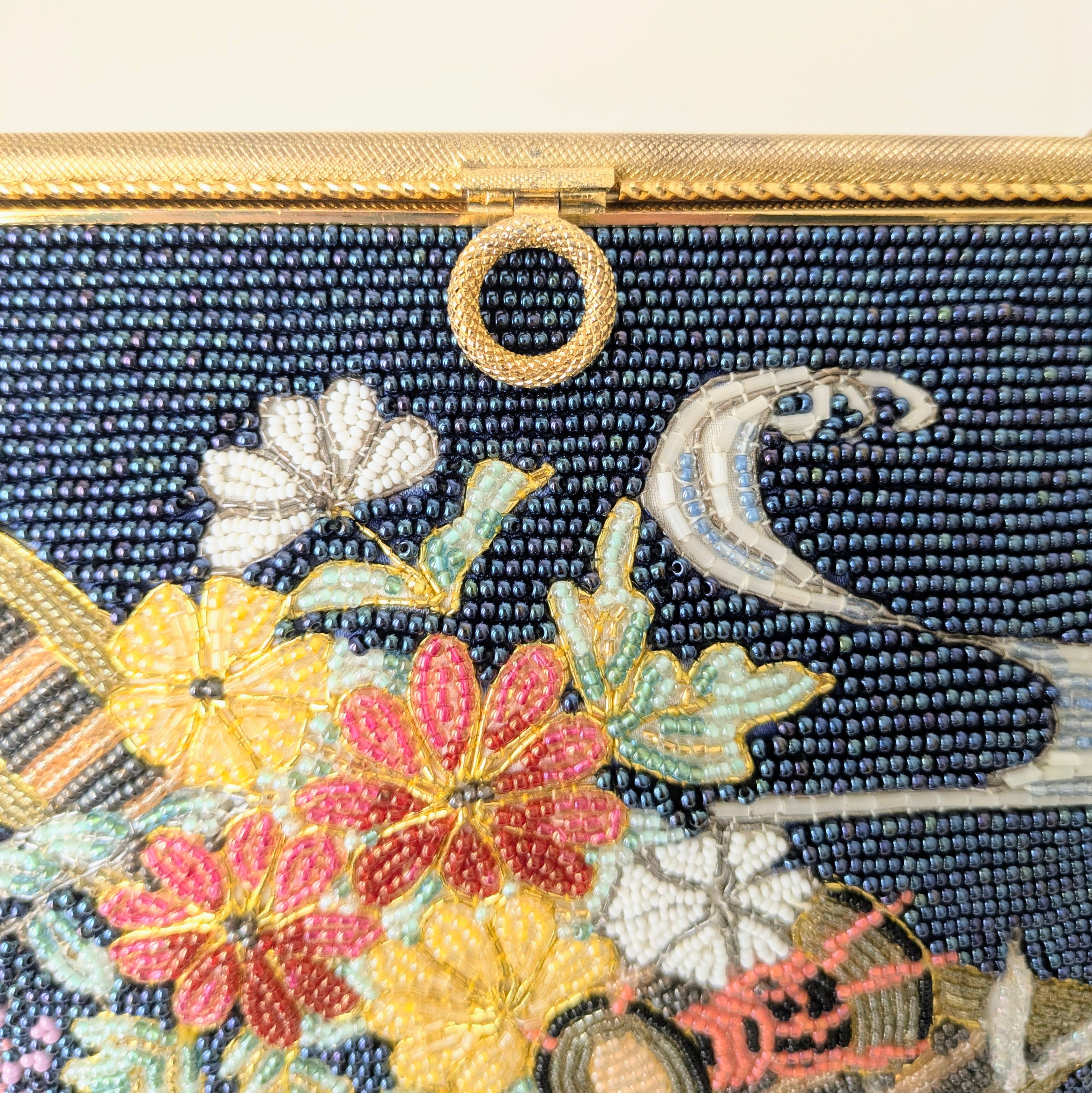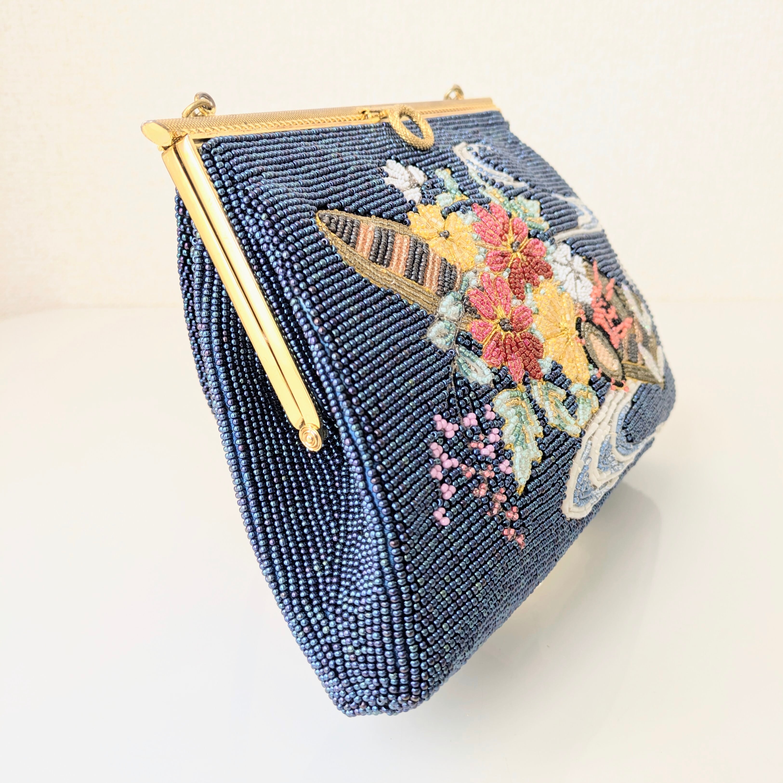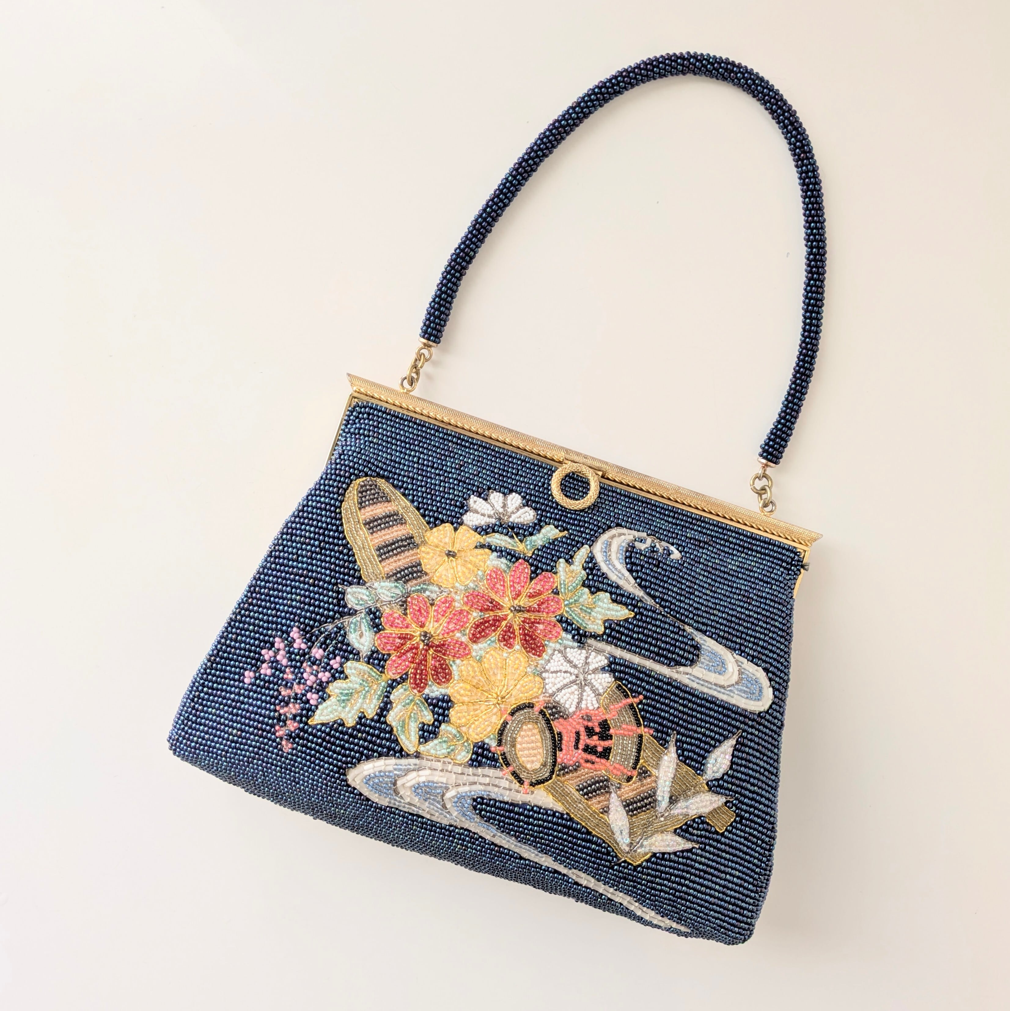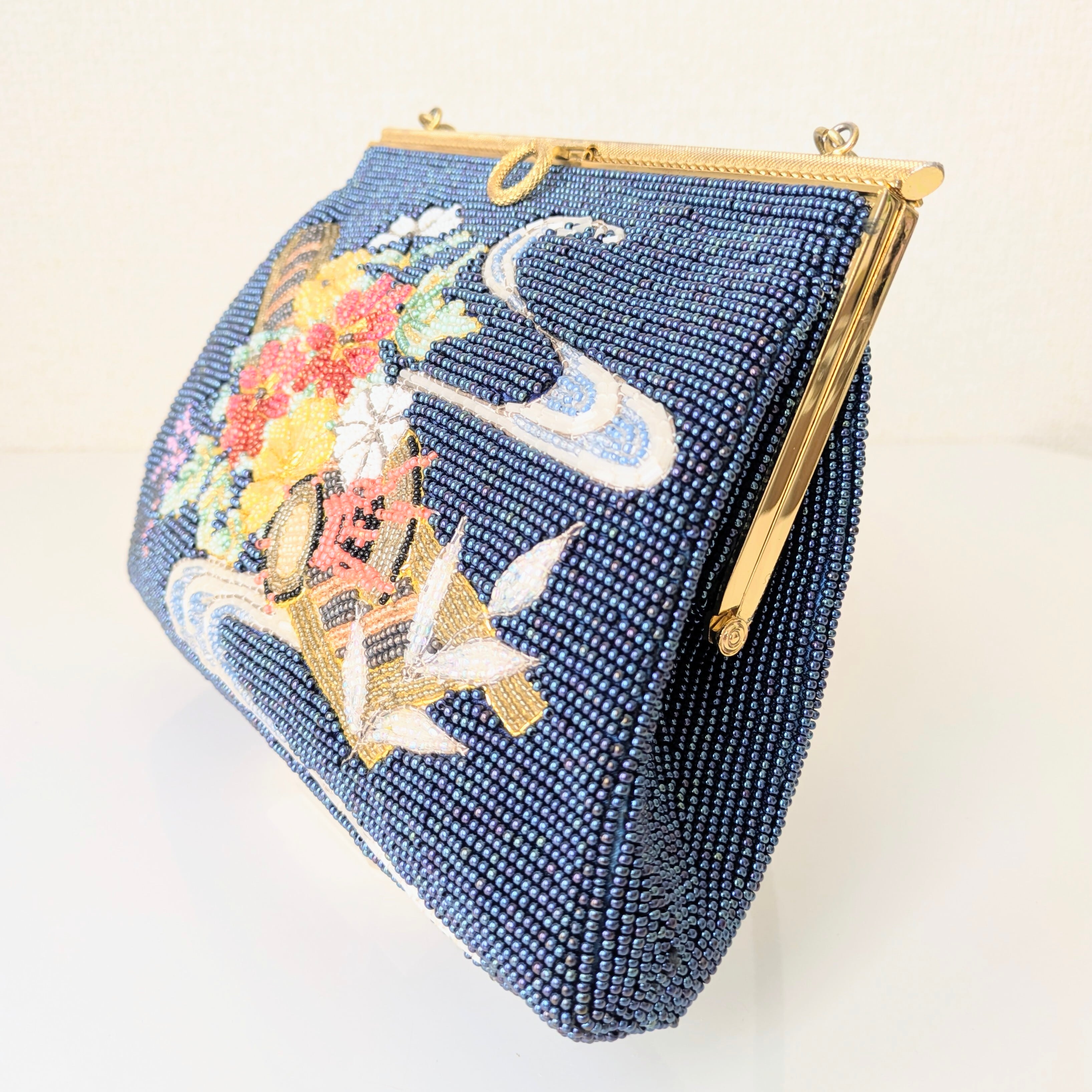 花筏をモチーフにしたビーズバッグです。花筏はとても風雅で優美な美しさのある文様です。花、鼓、流水などの繊細な刺繍、その形や構成に高い技術力を感じさせます。