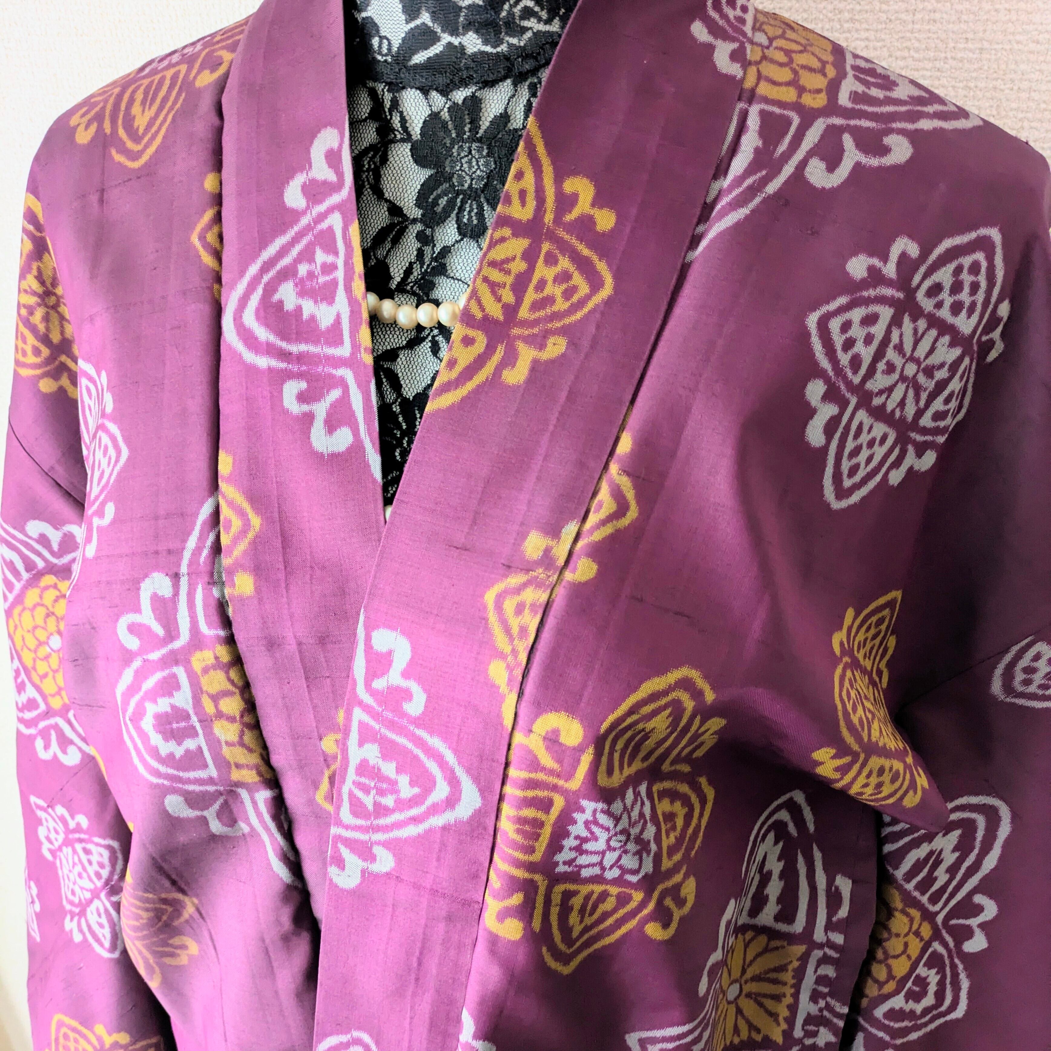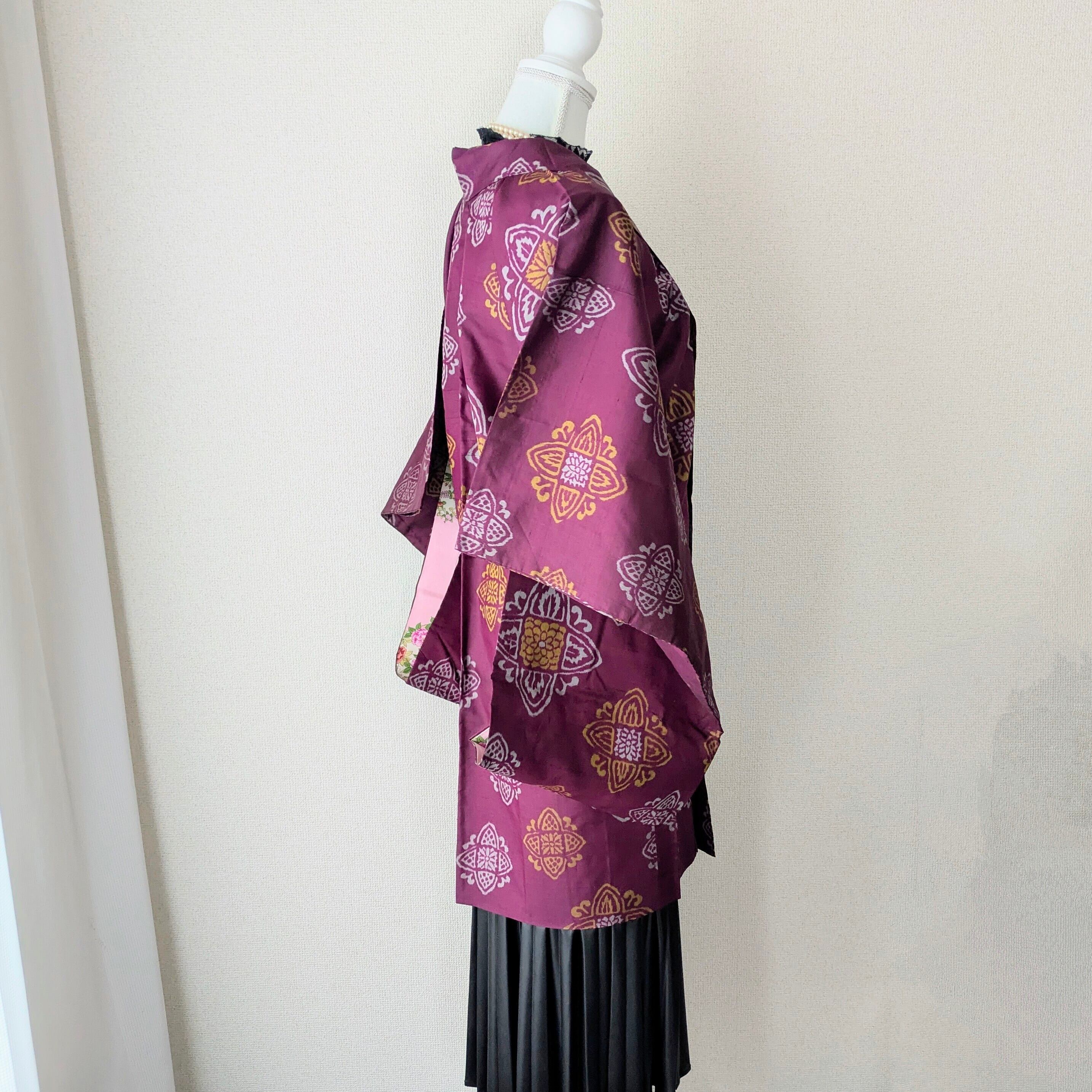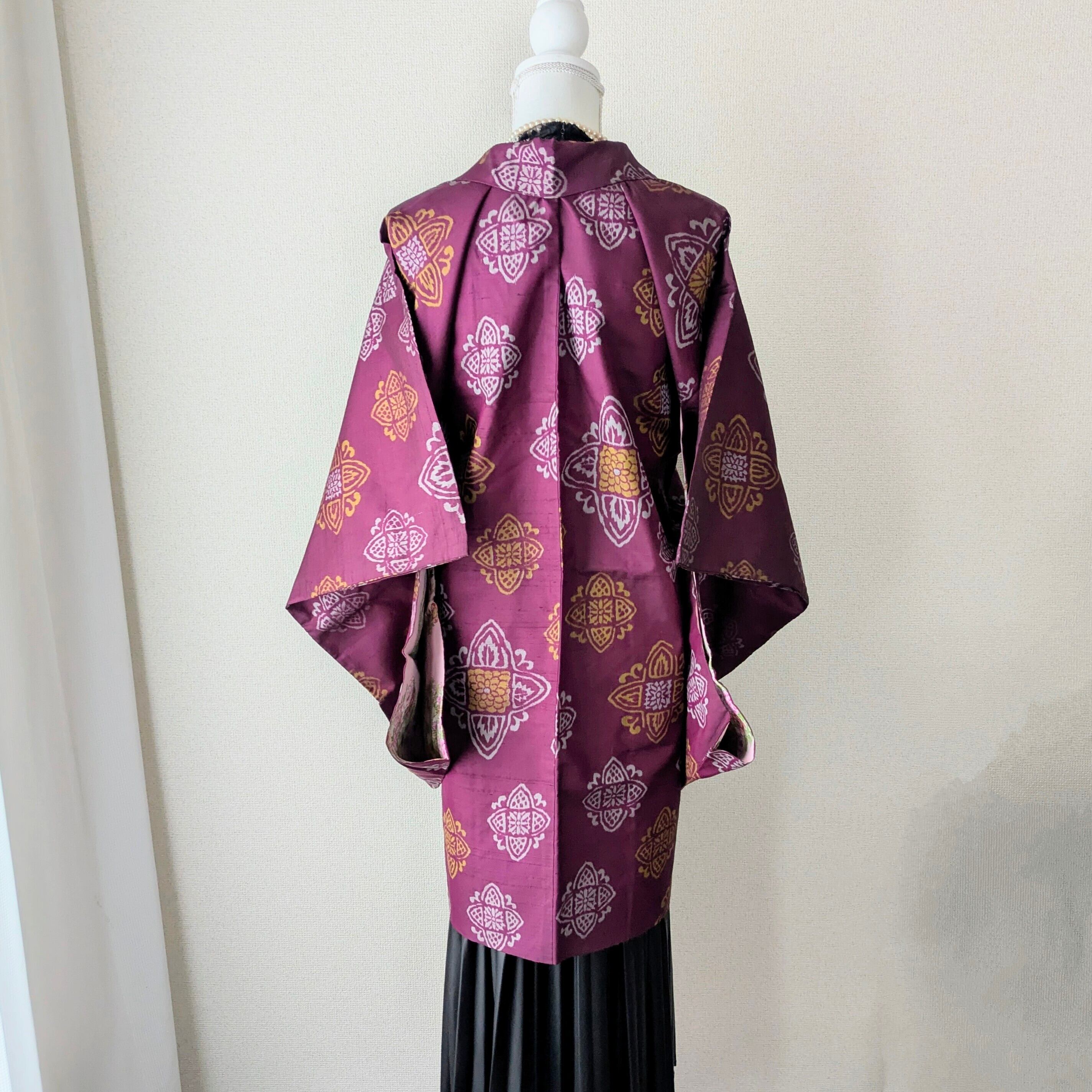 赤紫色の銘仙の長羽織です。紋章のような柄がリズミカルに配置されています。羽裏は華やかな花丸文様が描かれており、色鮮やかな裏地と表地のコントラストも楽しい逸品です。