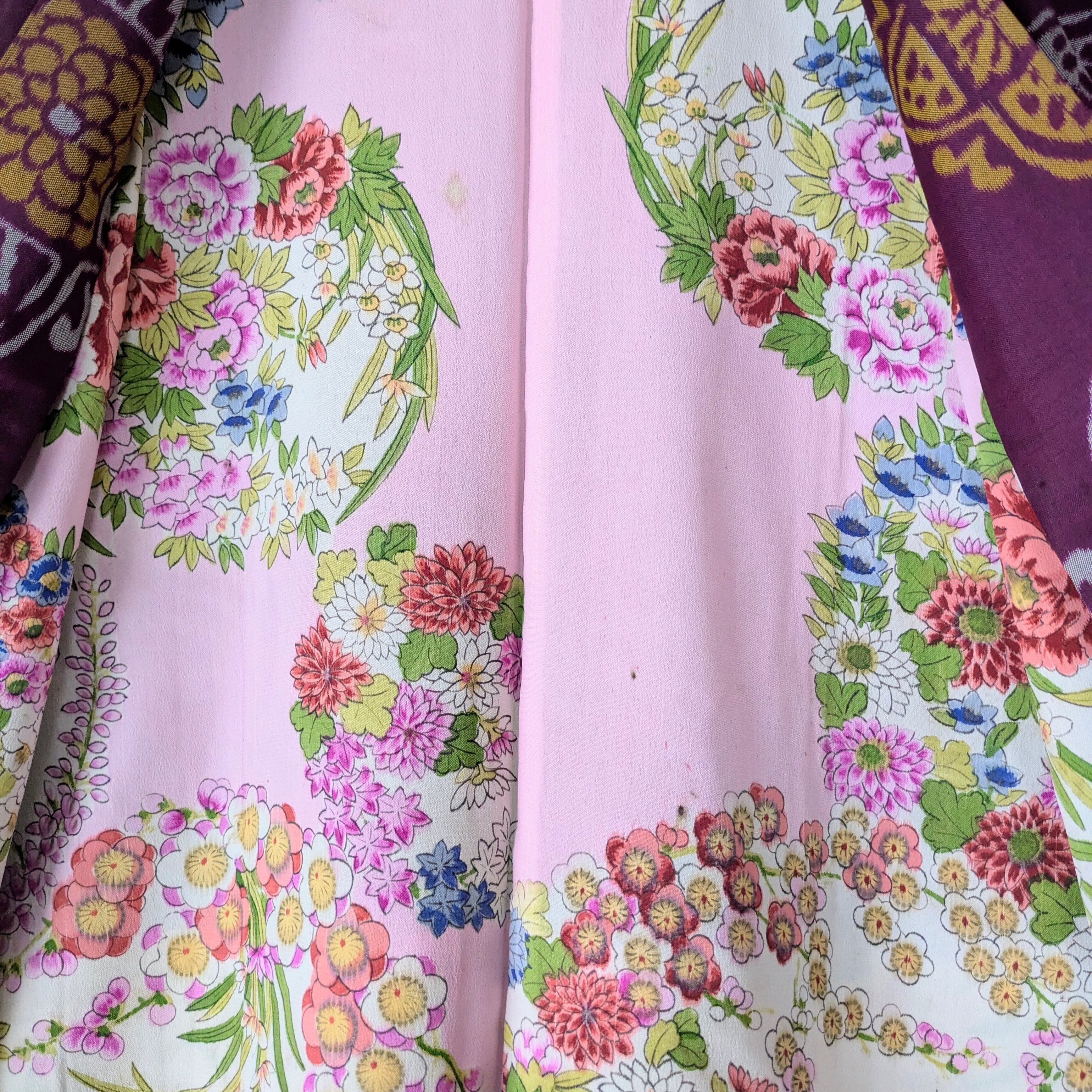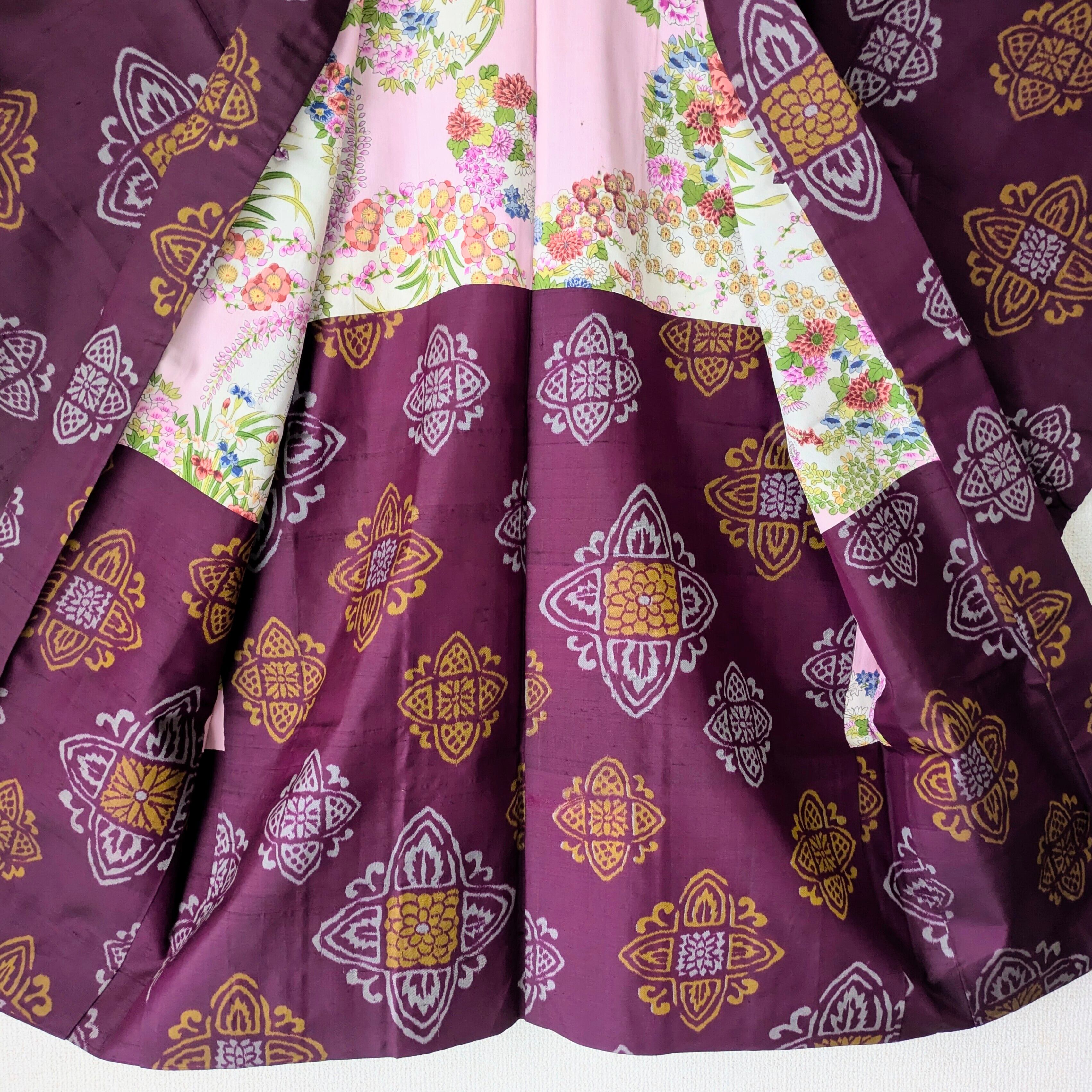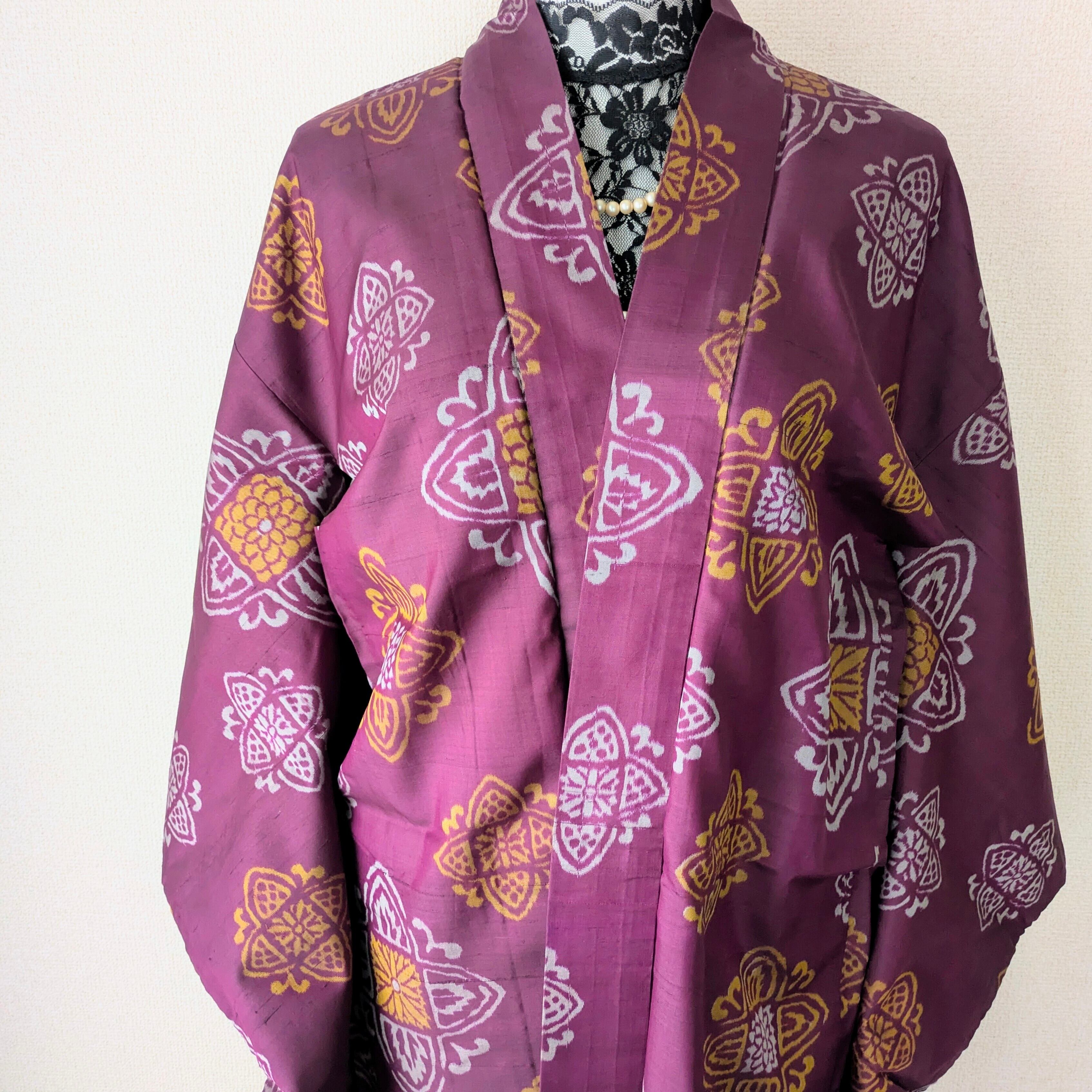 赤紫色の銘仙の長羽織です。紋章のような柄がリズミカルに配置されています。羽裏は華やかな花丸文様が描かれており、色鮮やかな裏地と表地のコントラストも楽しい逸品です。