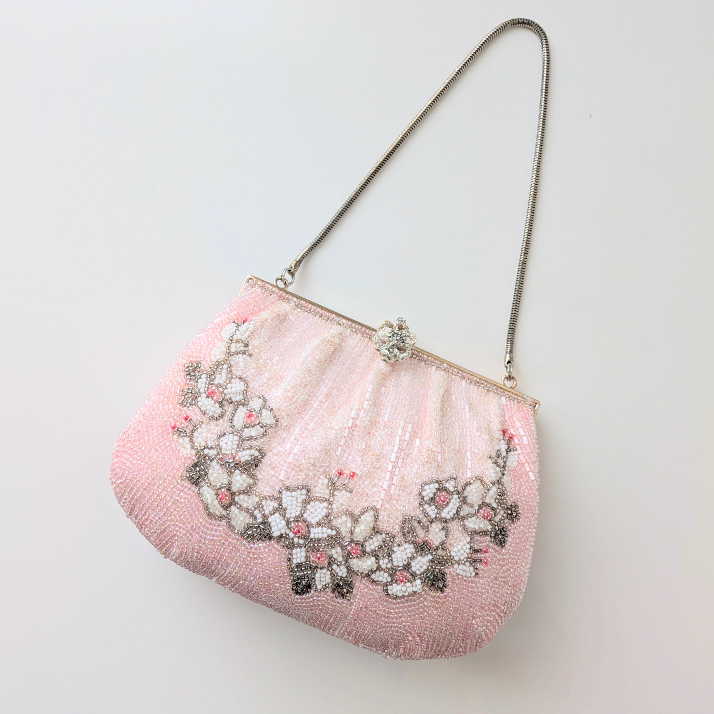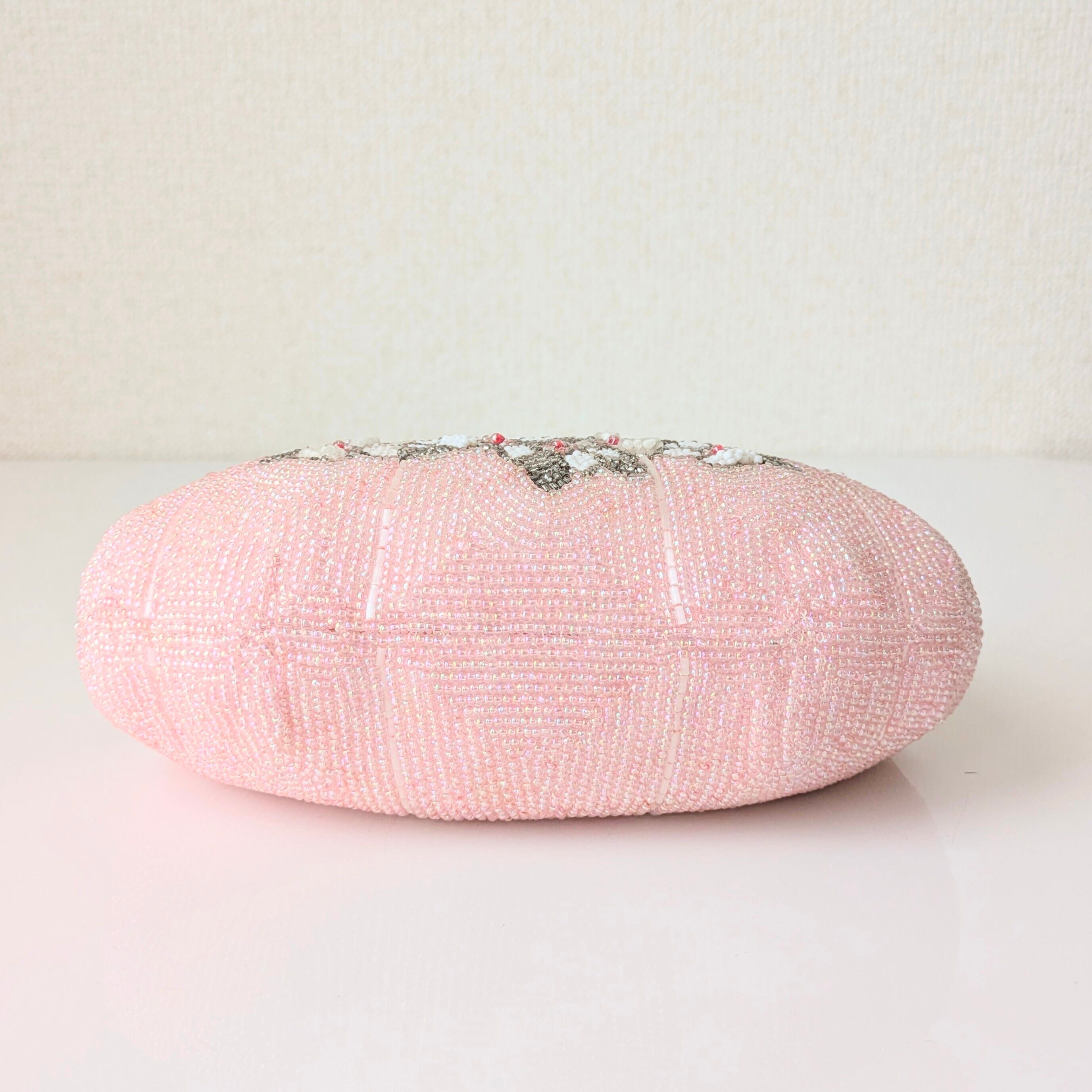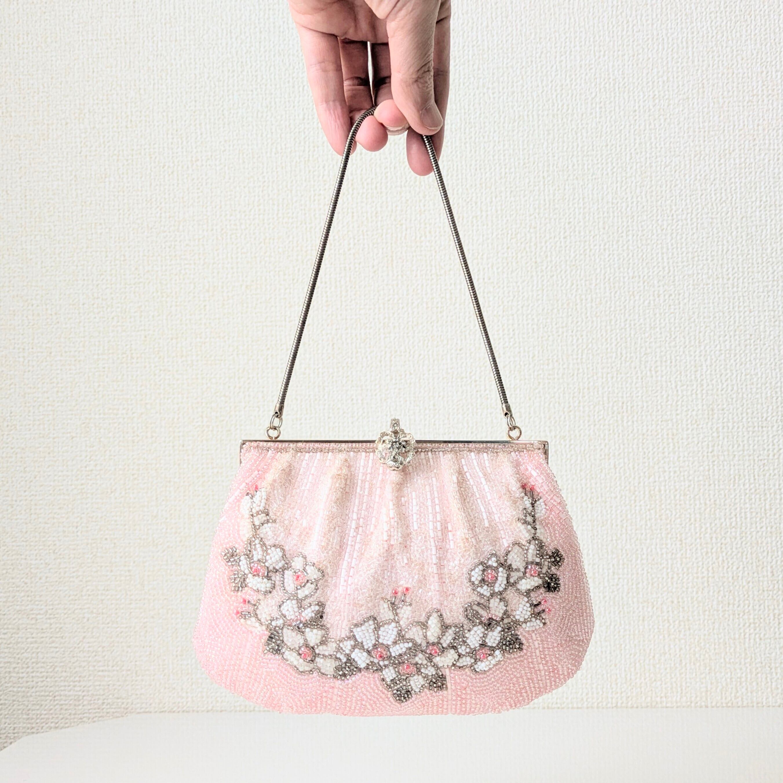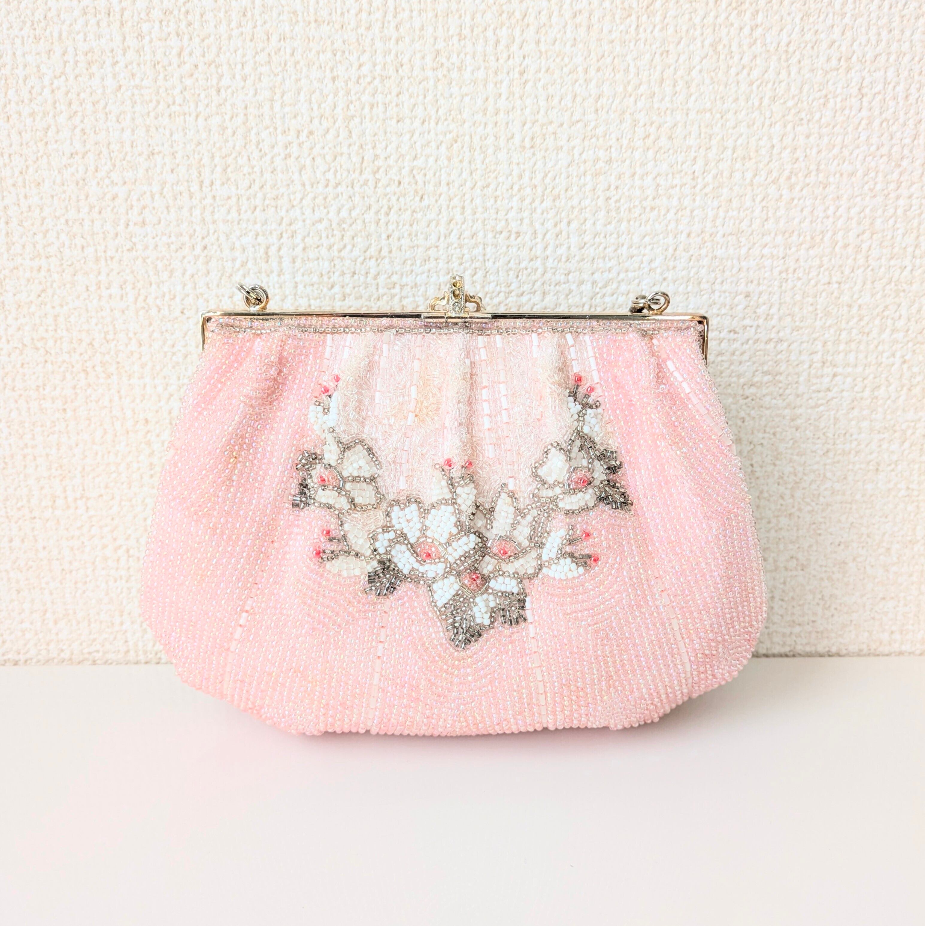 ピンクの花で飾られたとても愛らしい小ぶりなビーズバッグです。 ひだ部分にシミのようなものが薄っすらとありますが、影になっているためか目立ちません。特筆すべきダメージもなく、状態は良好です。