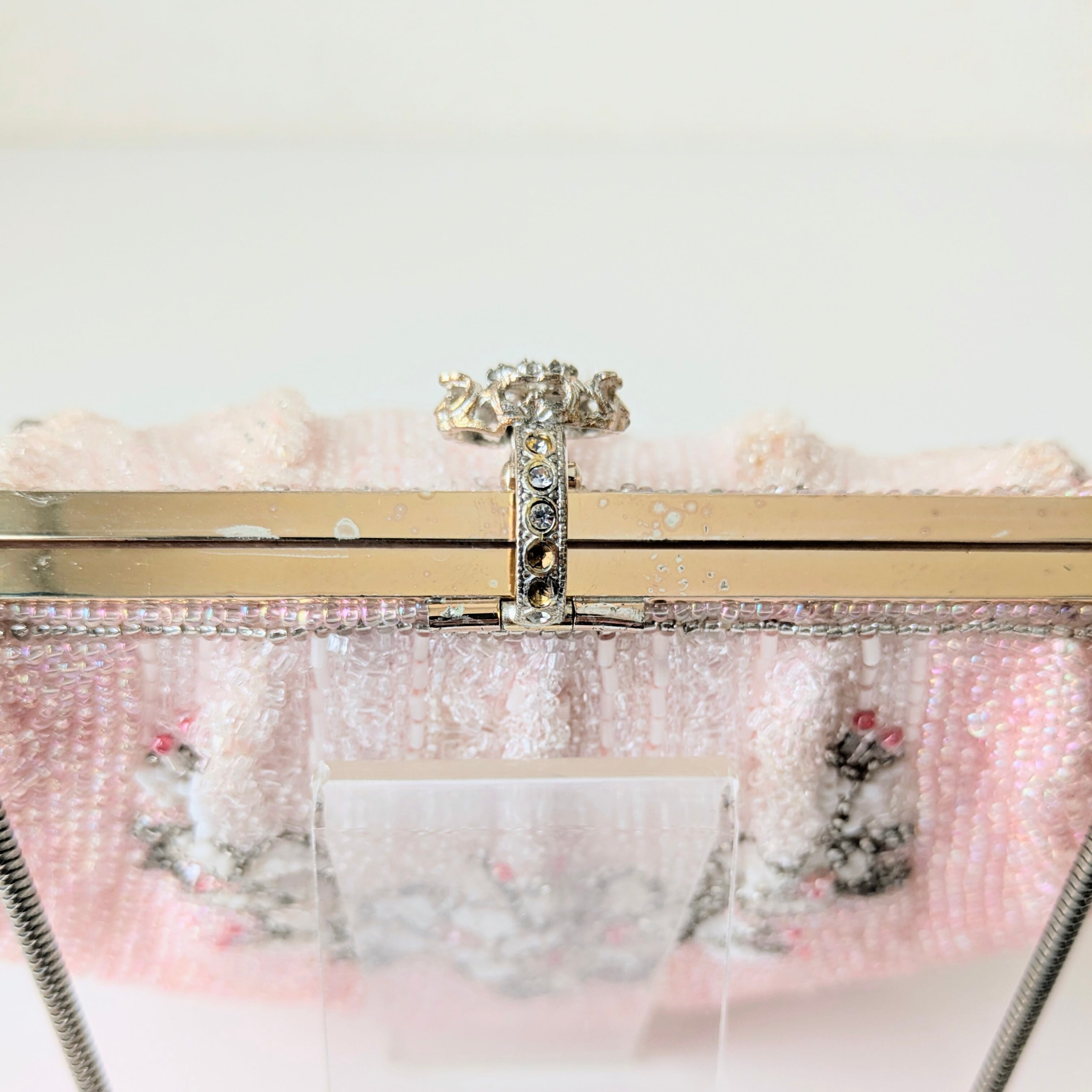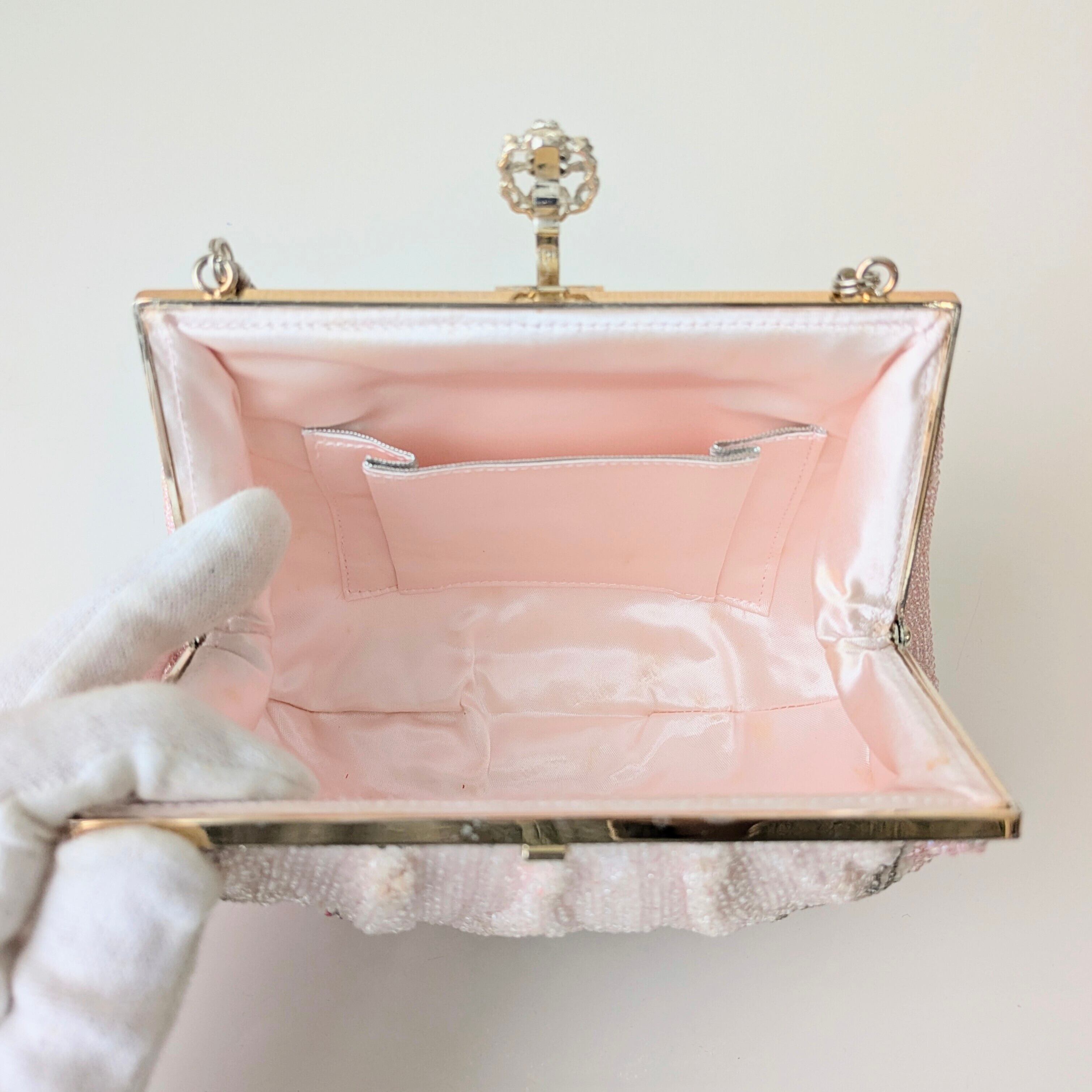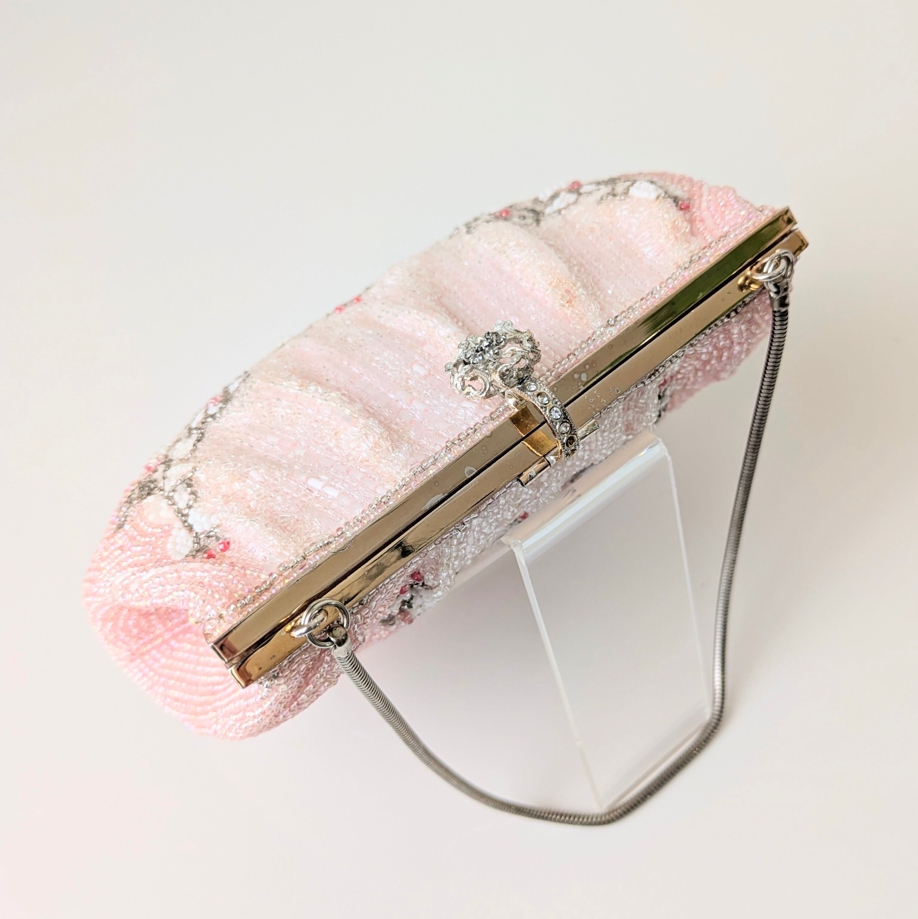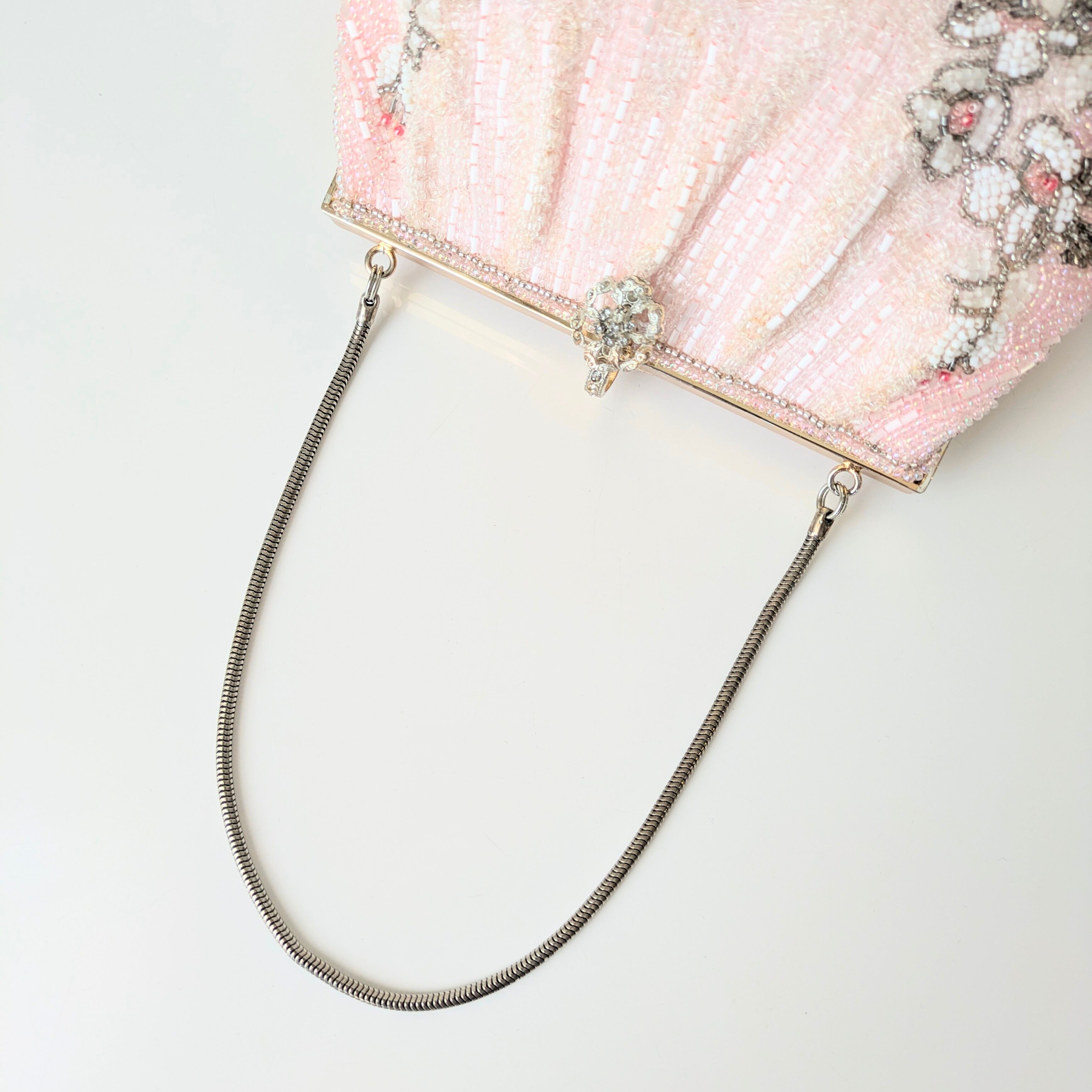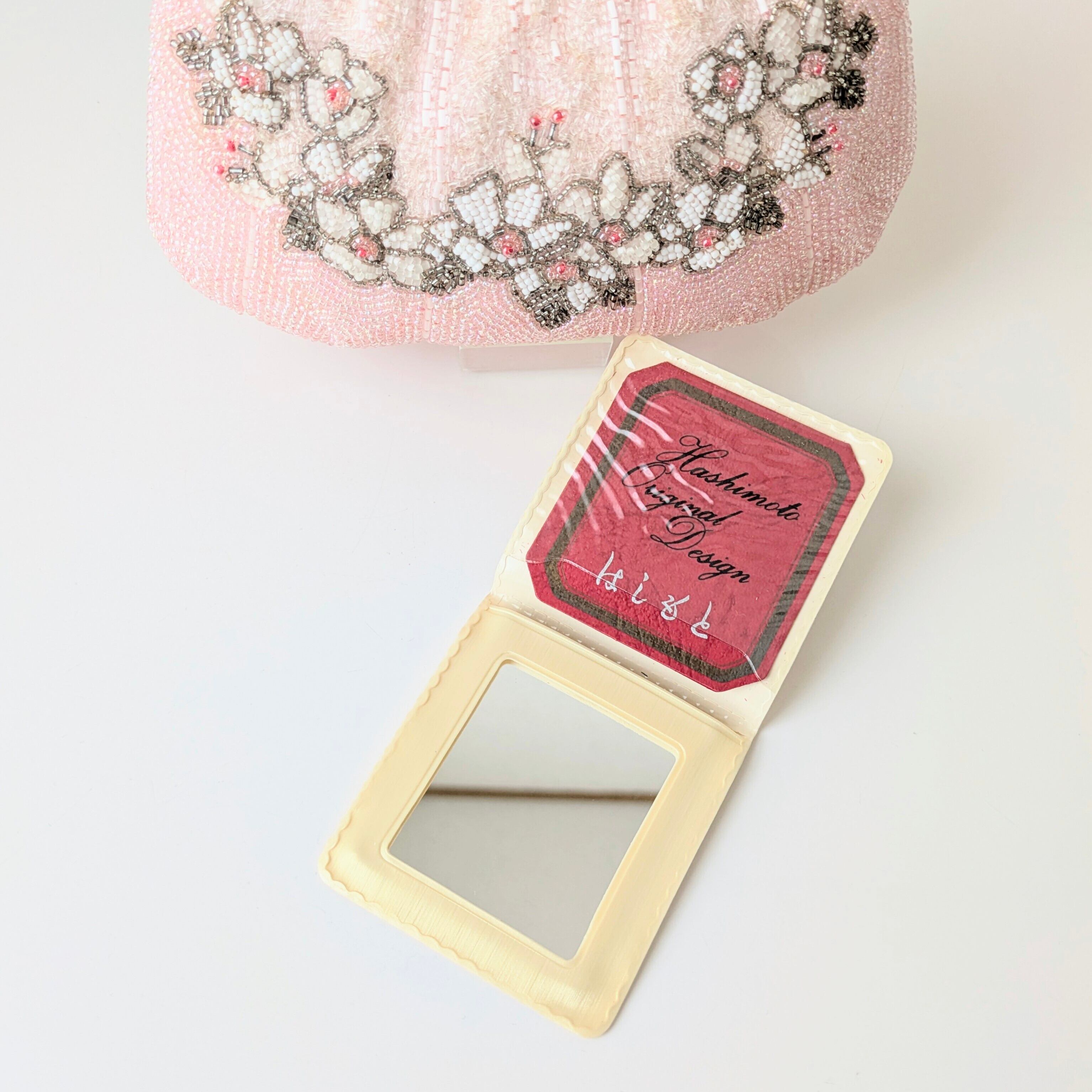 ピンクの花で飾られたとても愛らしい小ぶりなビーズバッグです。 ひだ部分にシミのようなものが薄っすらとありますが、影になっているためか目立ちません。特筆すべきダメージもなく、状態は良好です。