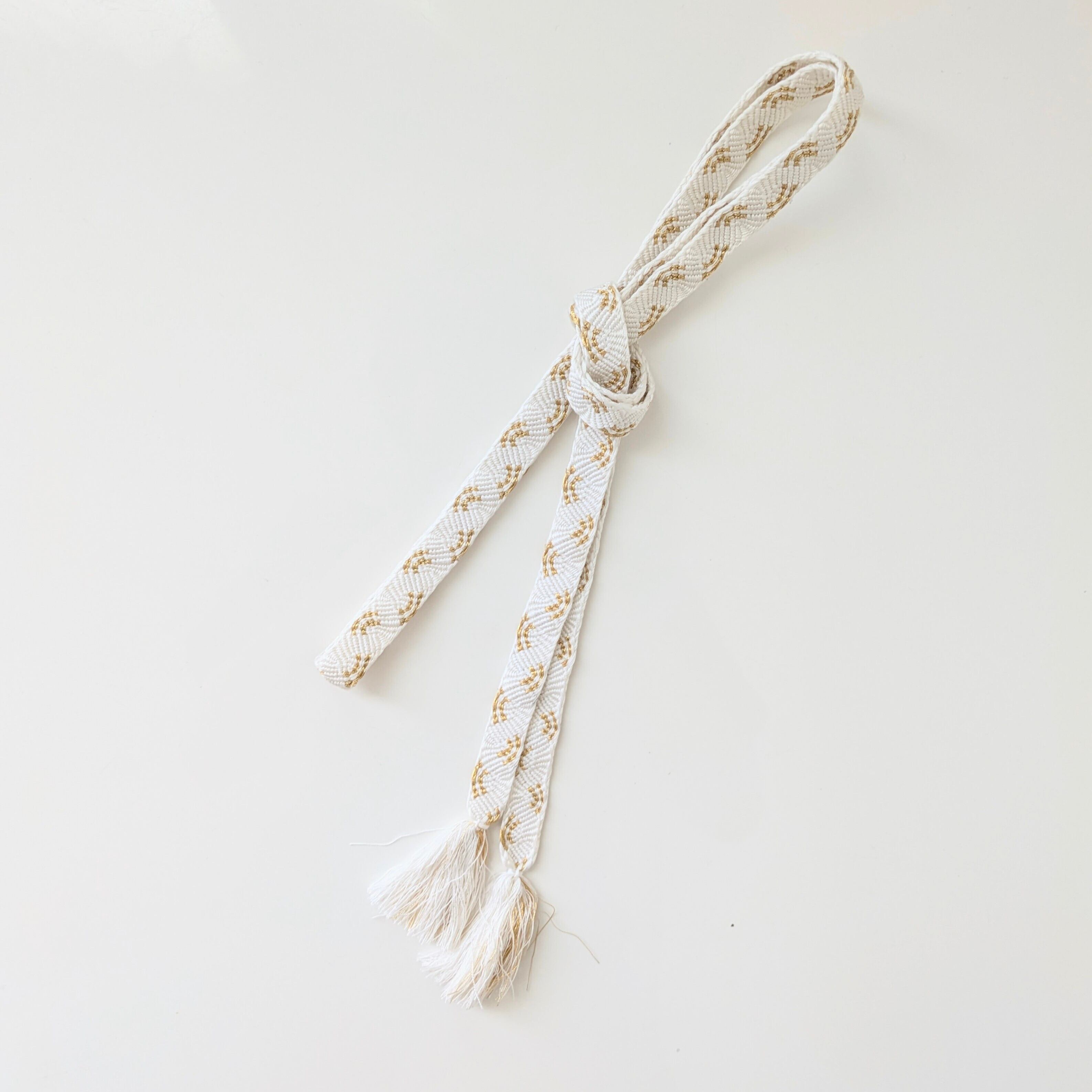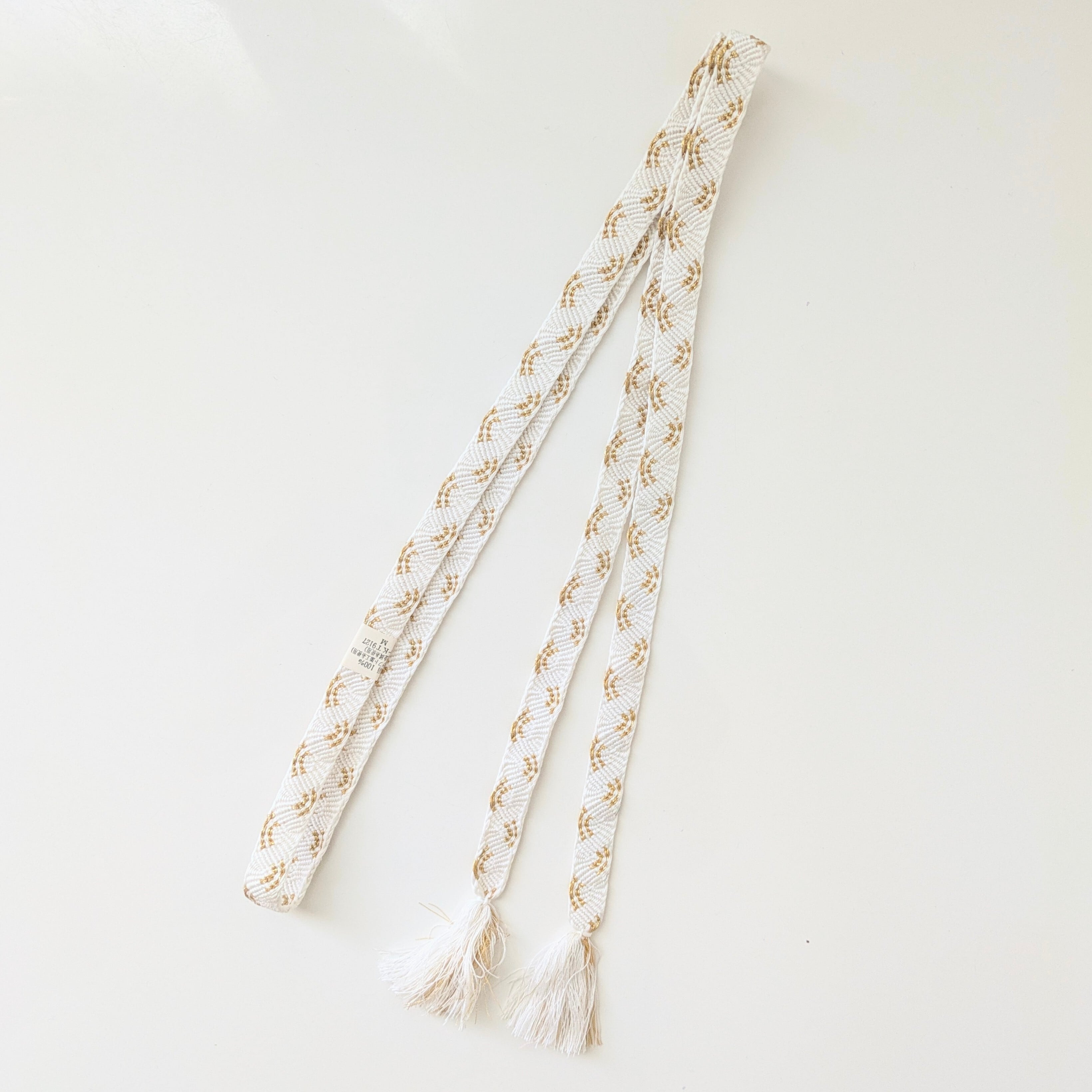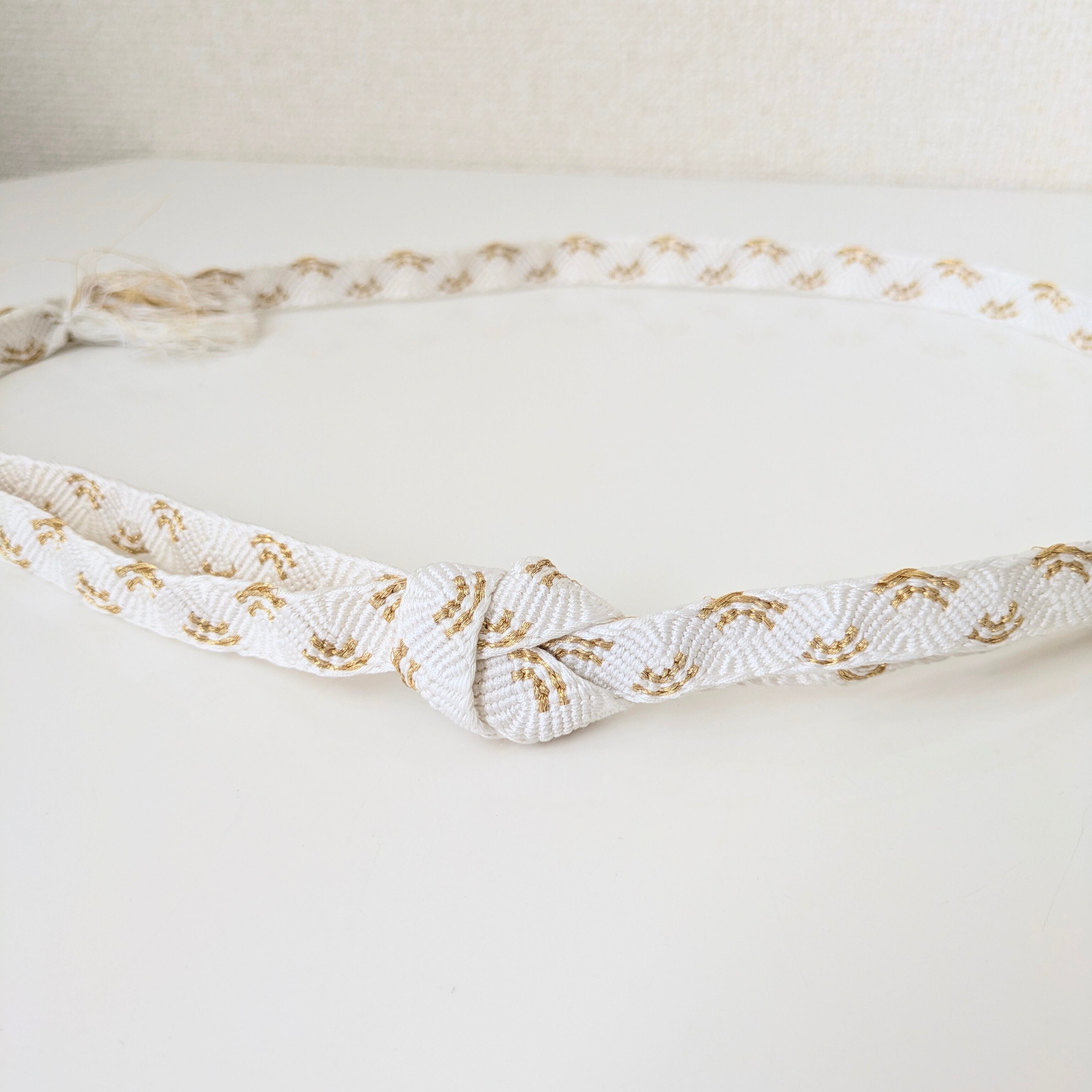 白に金のアクセントが入った薄手の夏物の帯締めとなります。