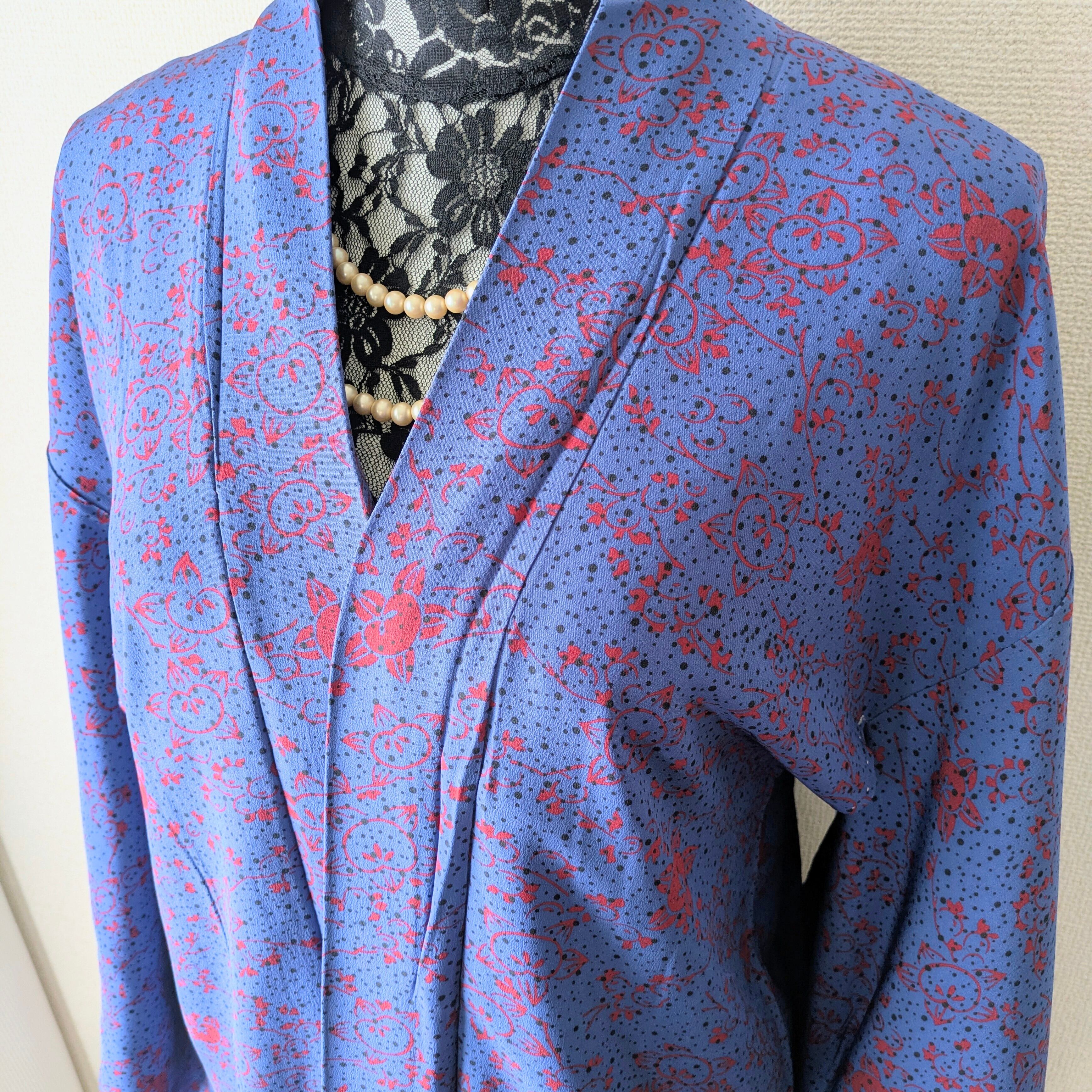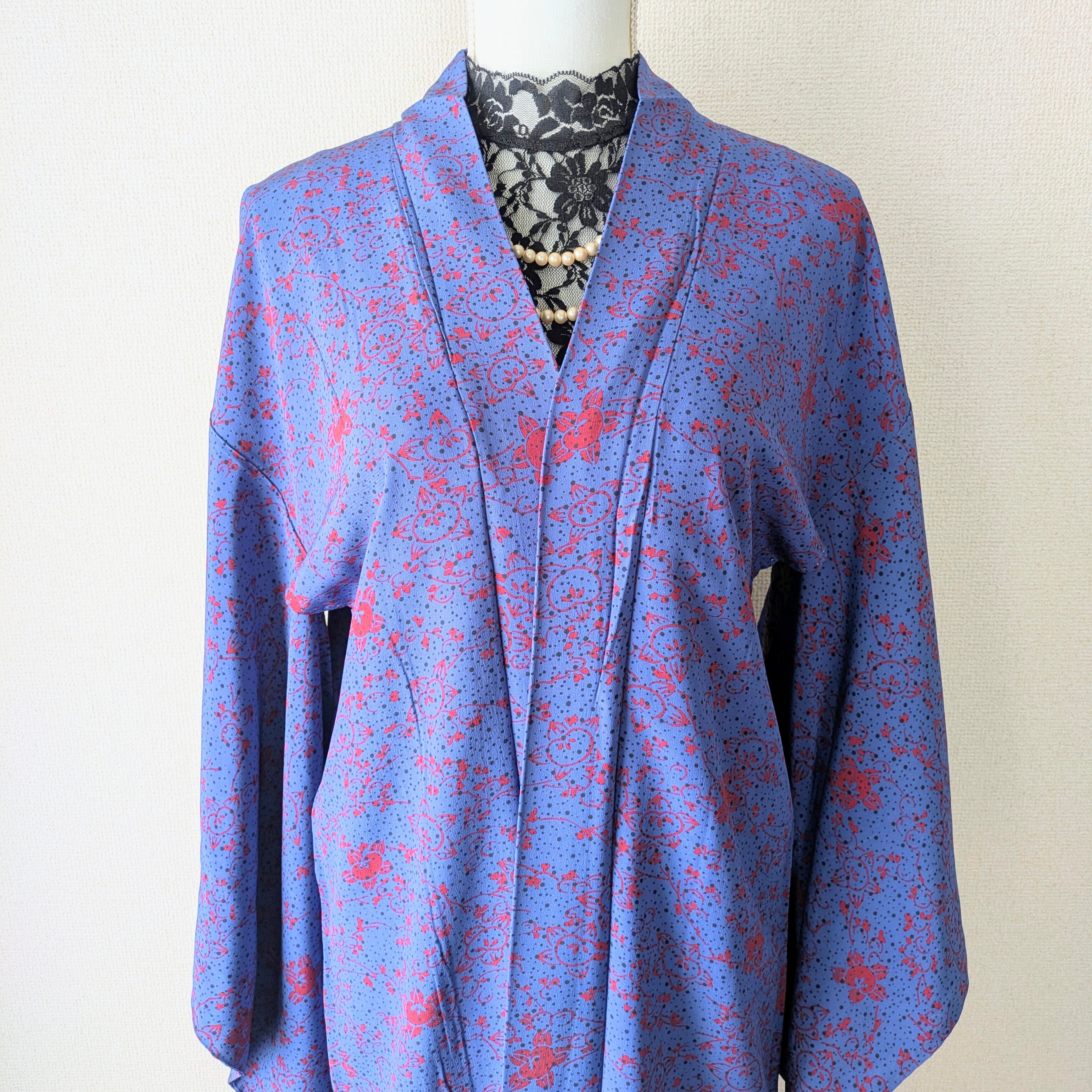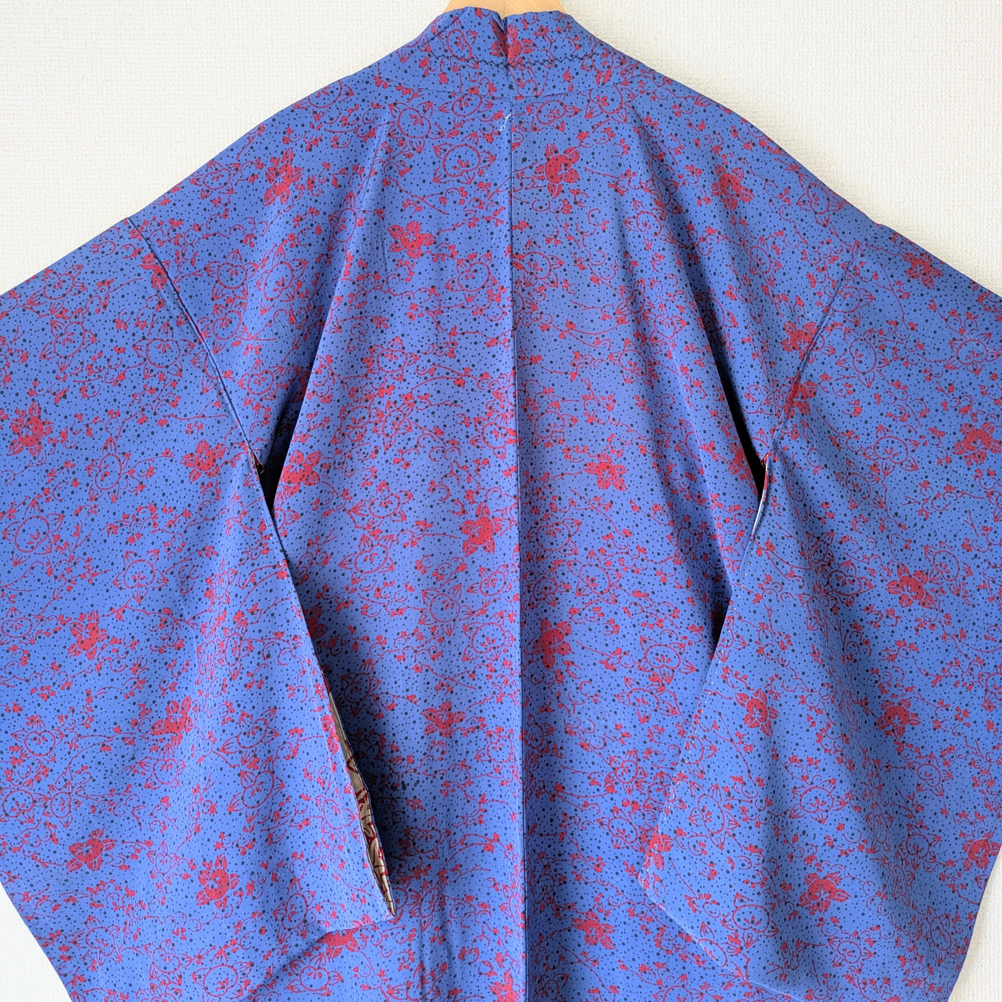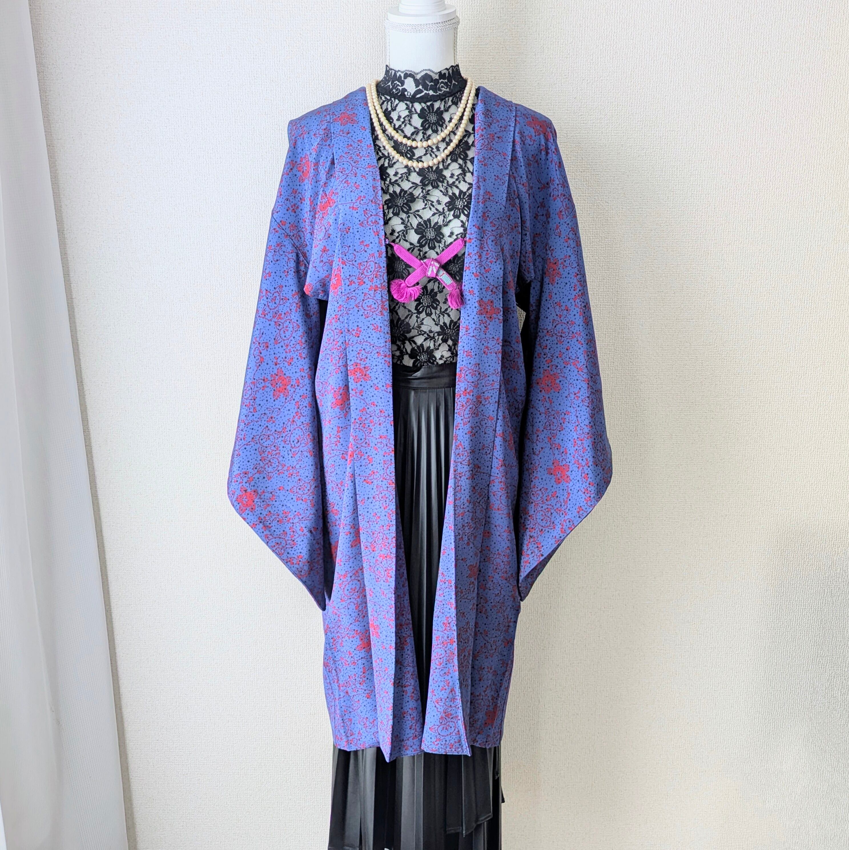 青紫色に赤色の花橘柄が唐草模様のようにあしらわれた長羽織です。青紫と赤のコントラストが綺麗です。