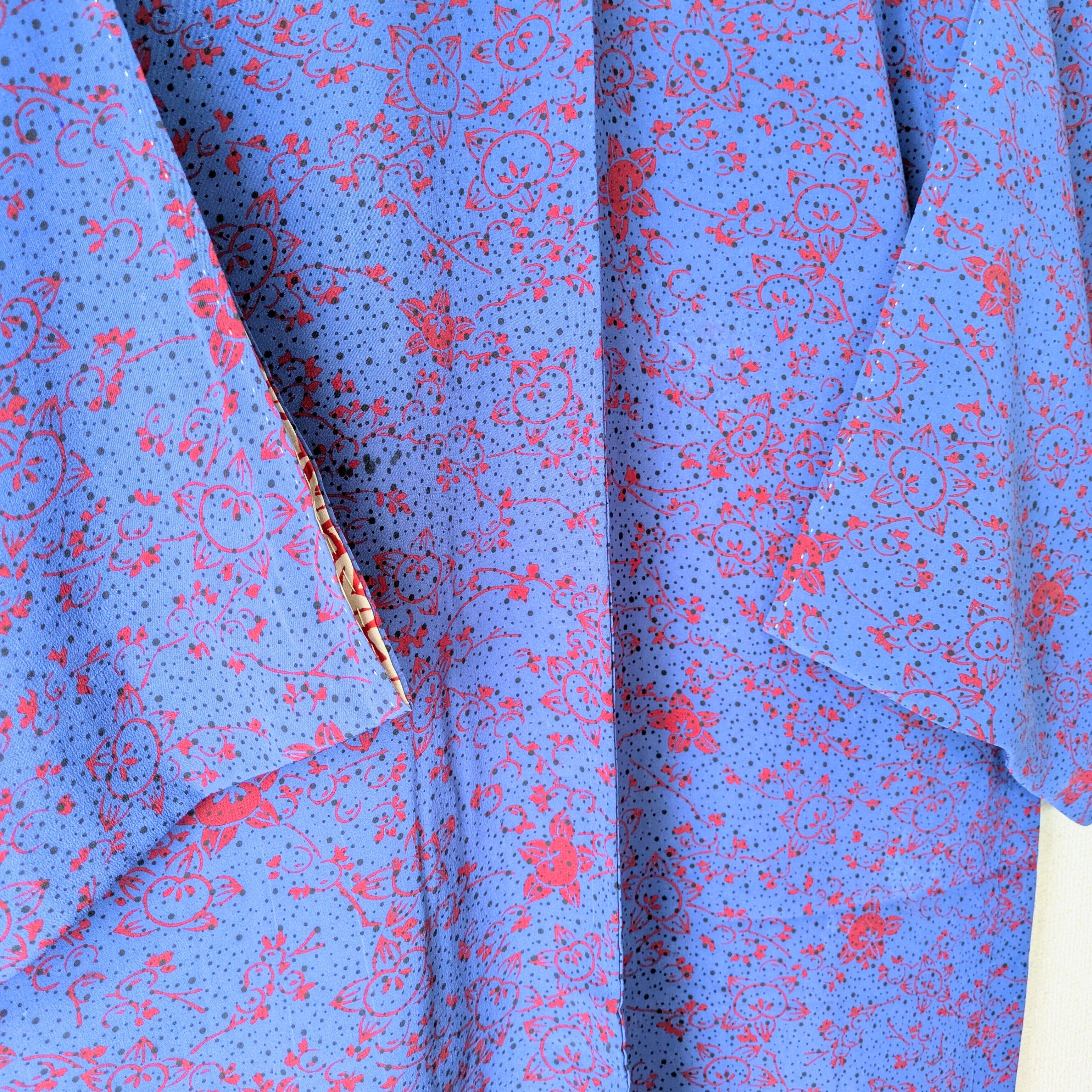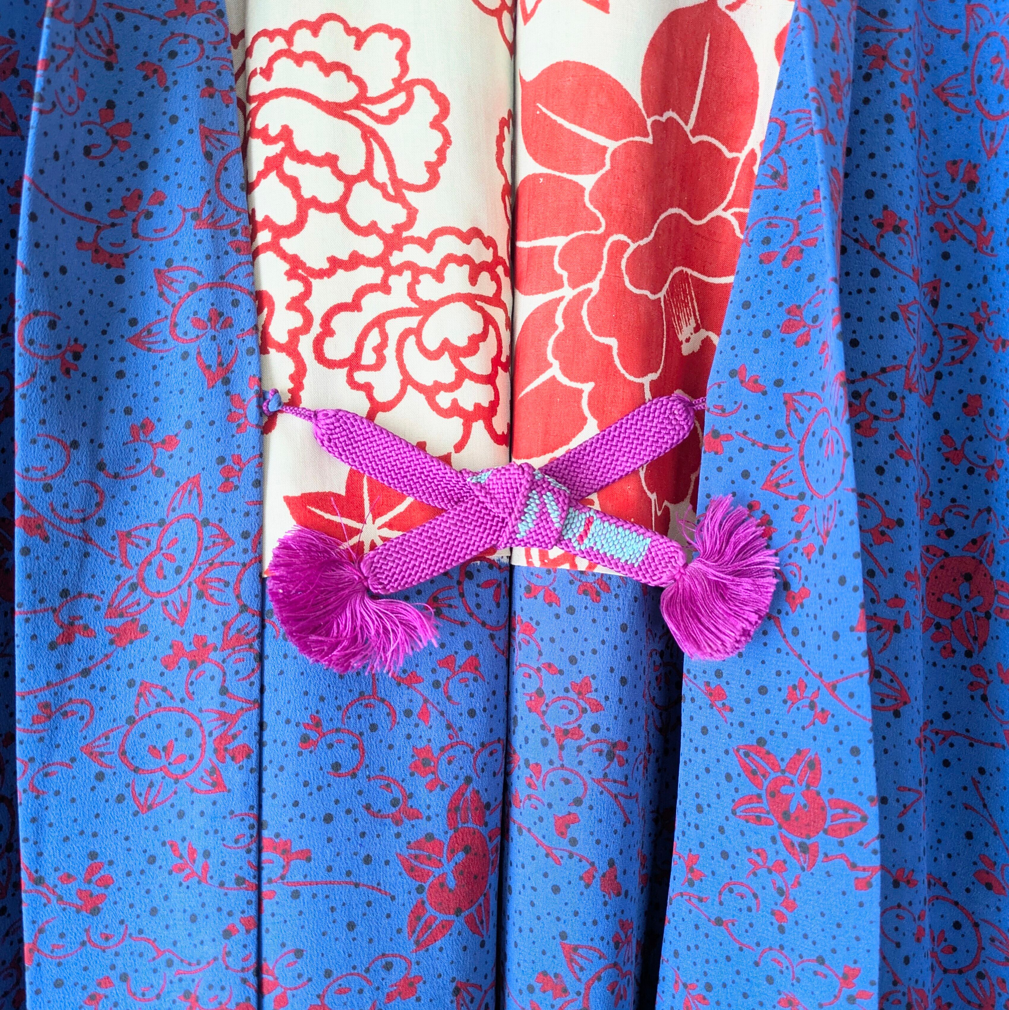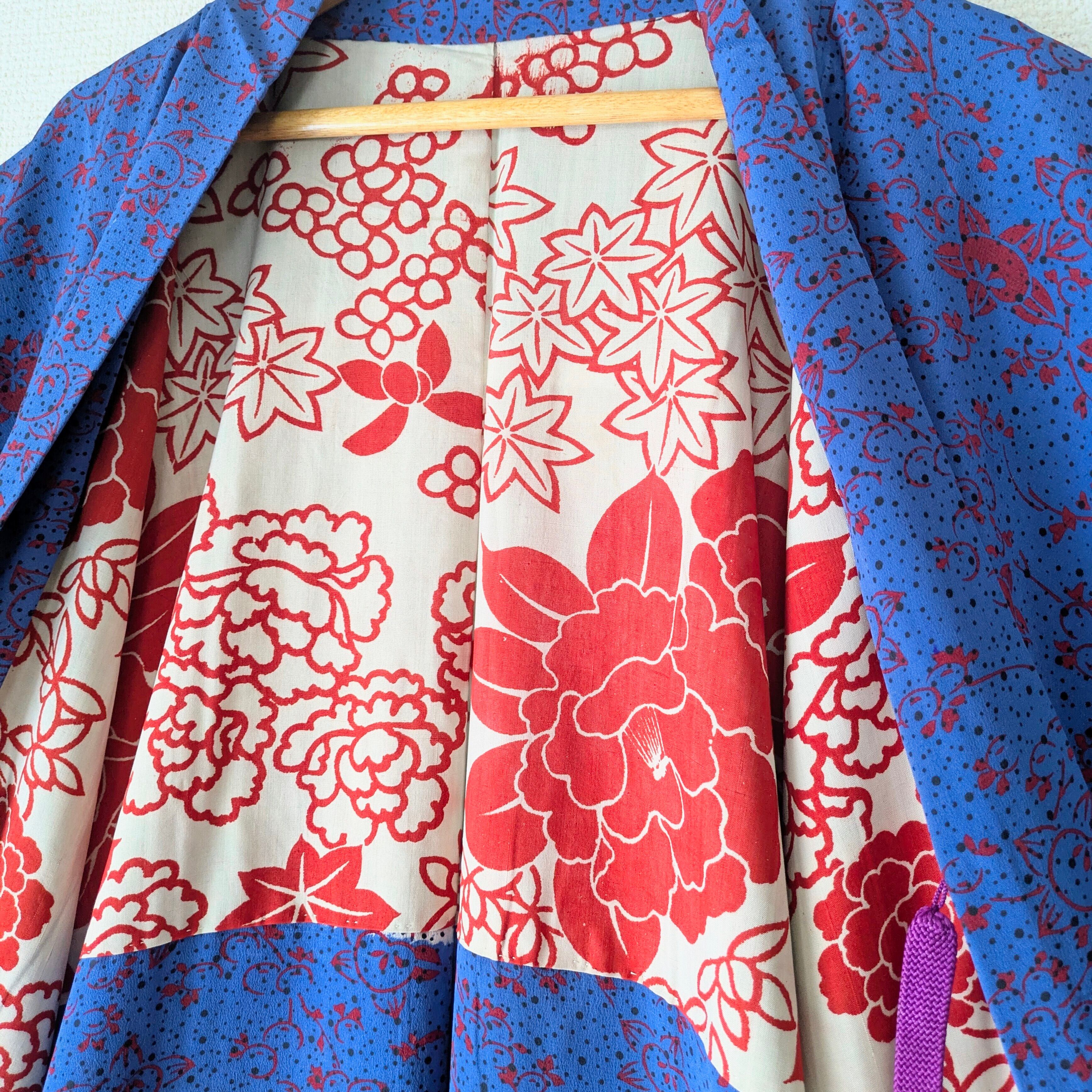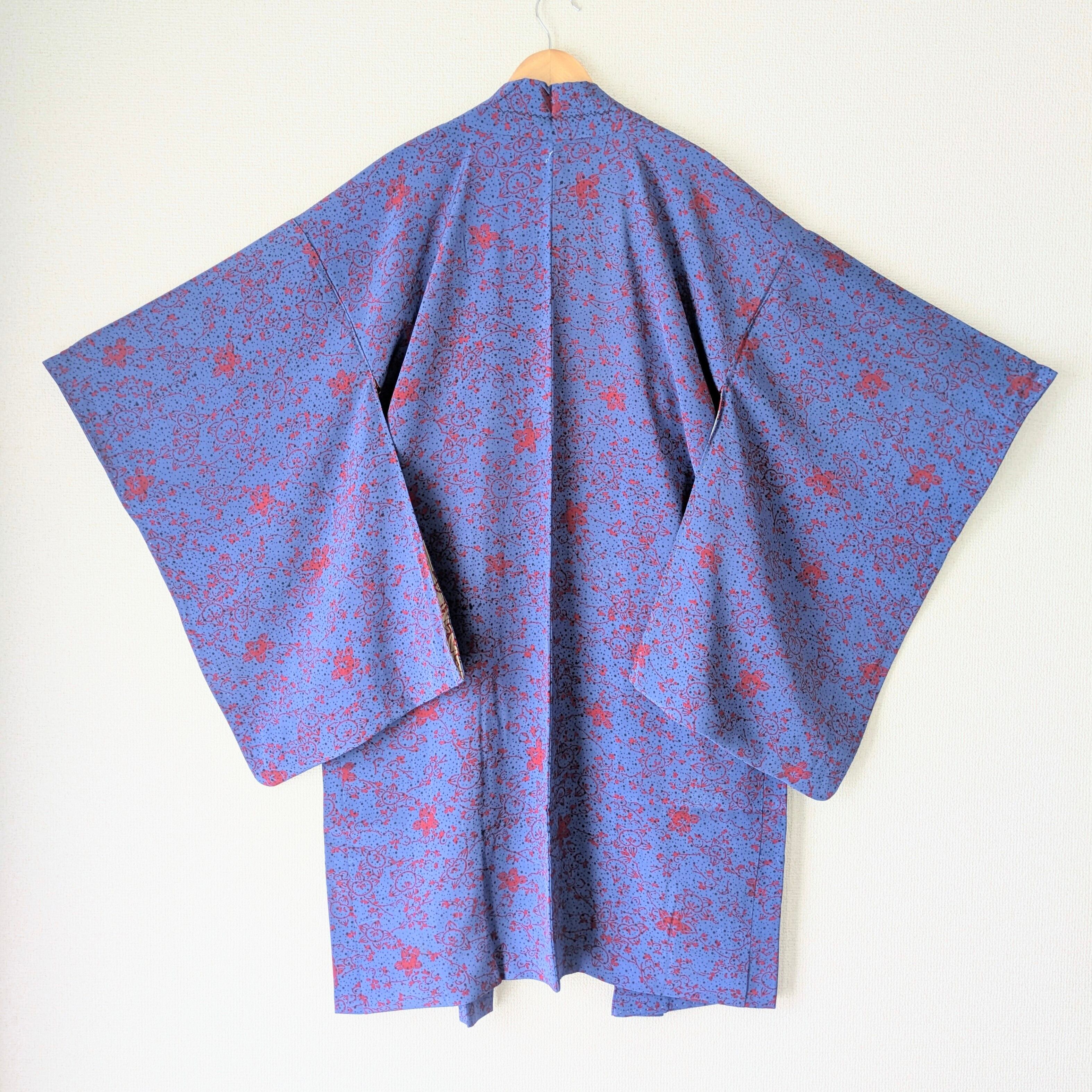 青紫色に赤色の花橘柄が唐草模様のようにあしらわれた長羽織です。青紫と赤のコントラストが綺麗です。