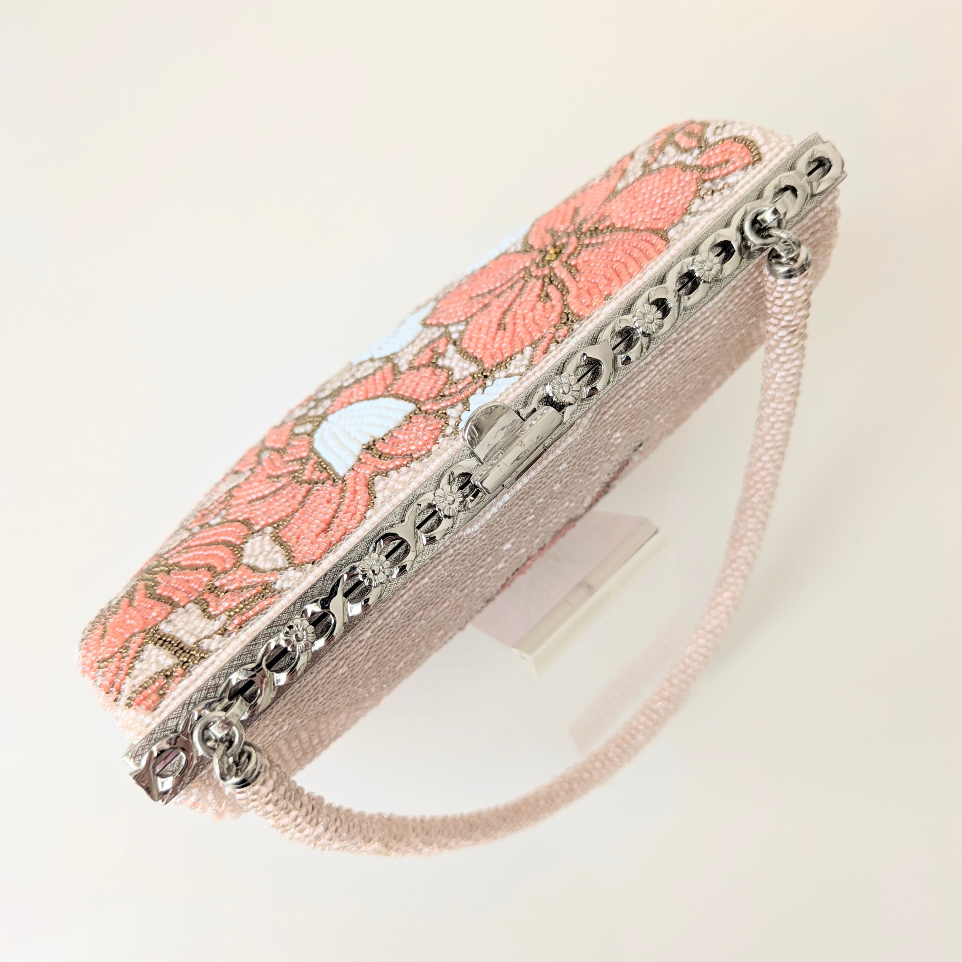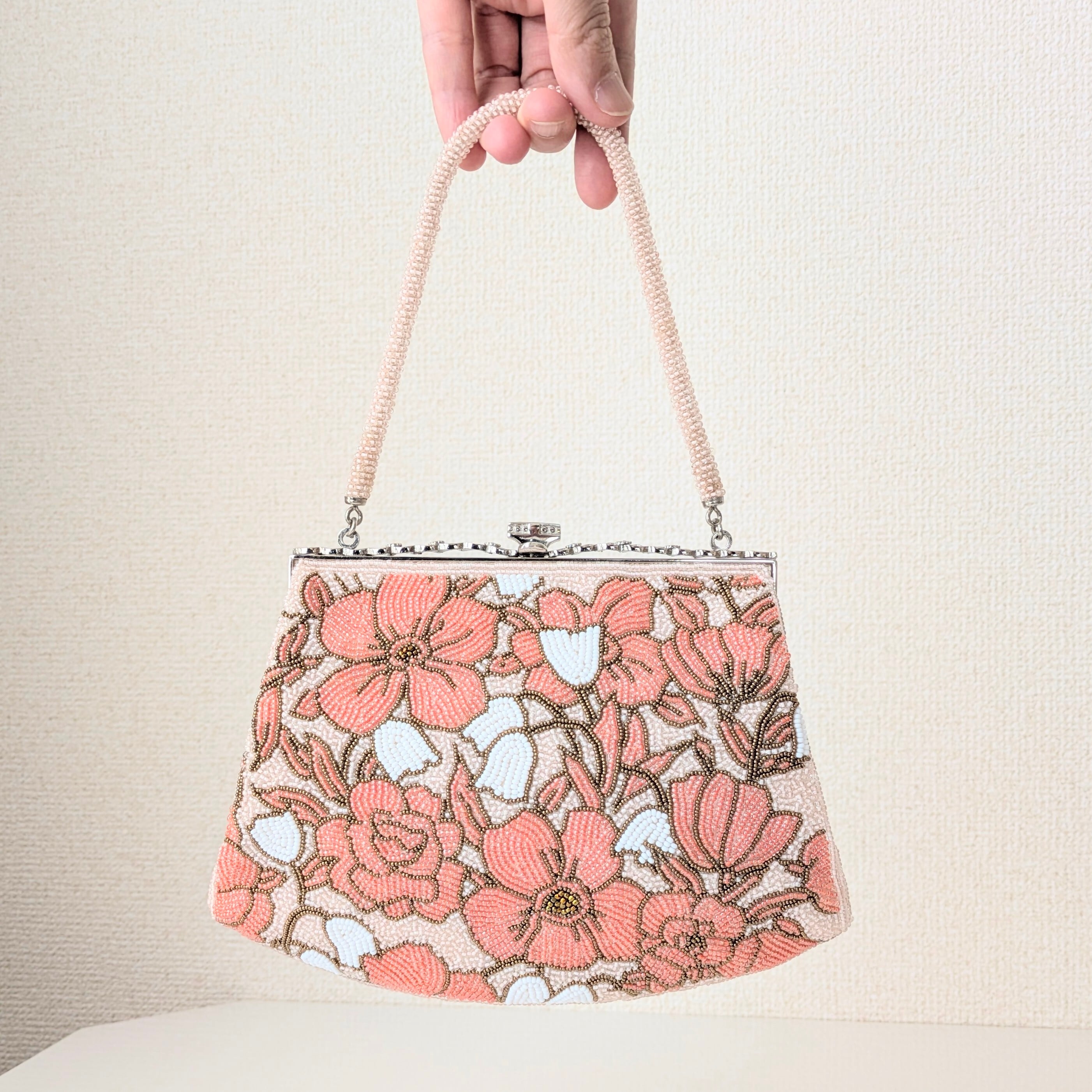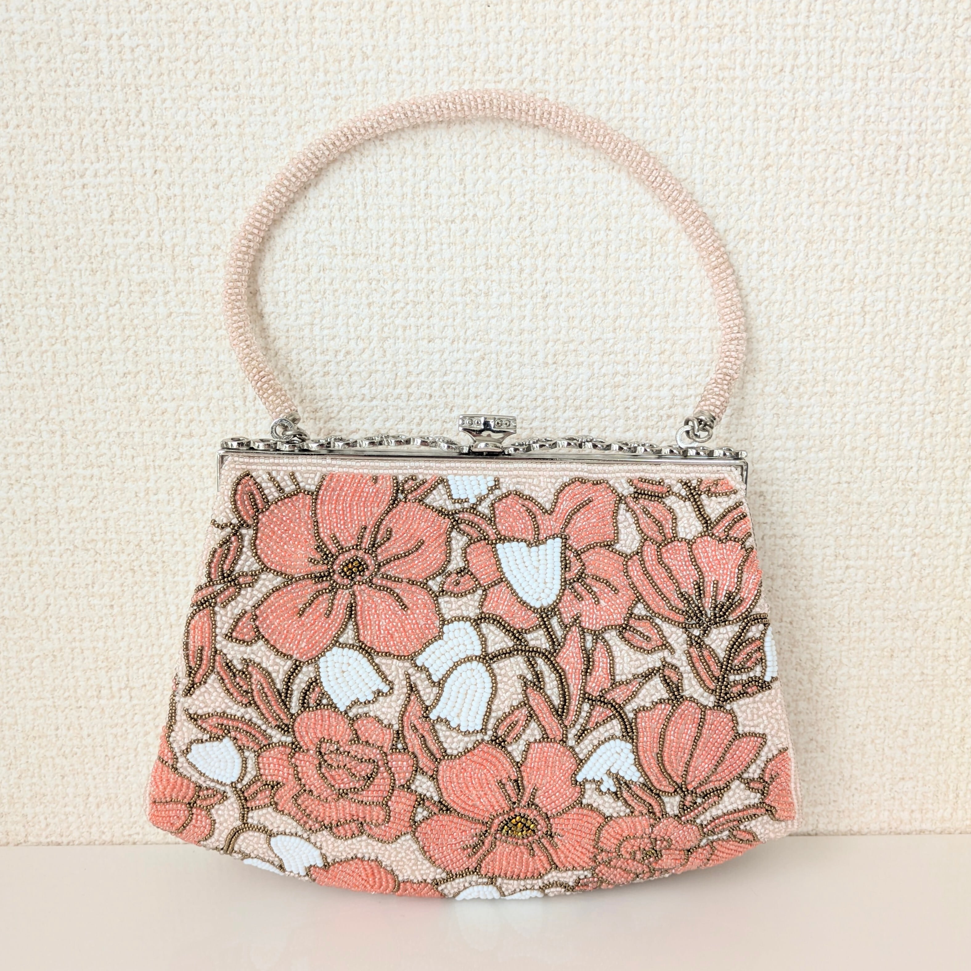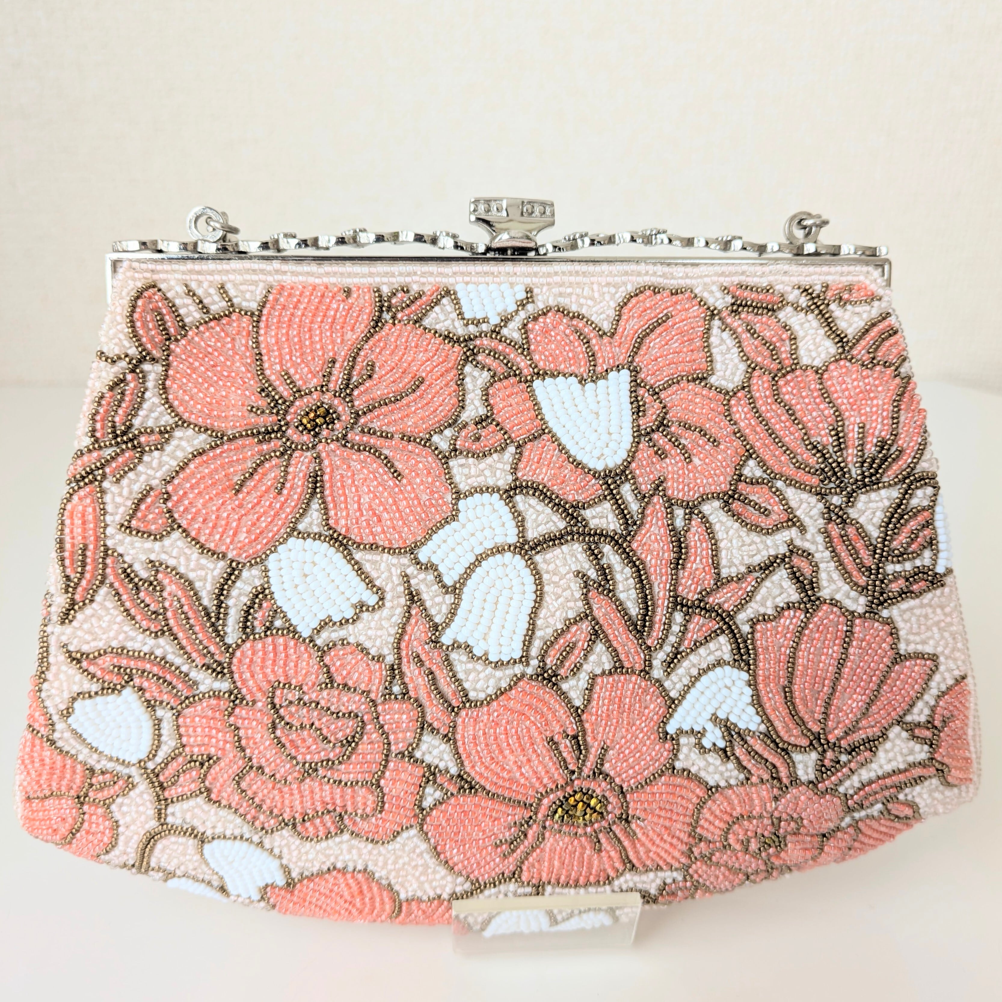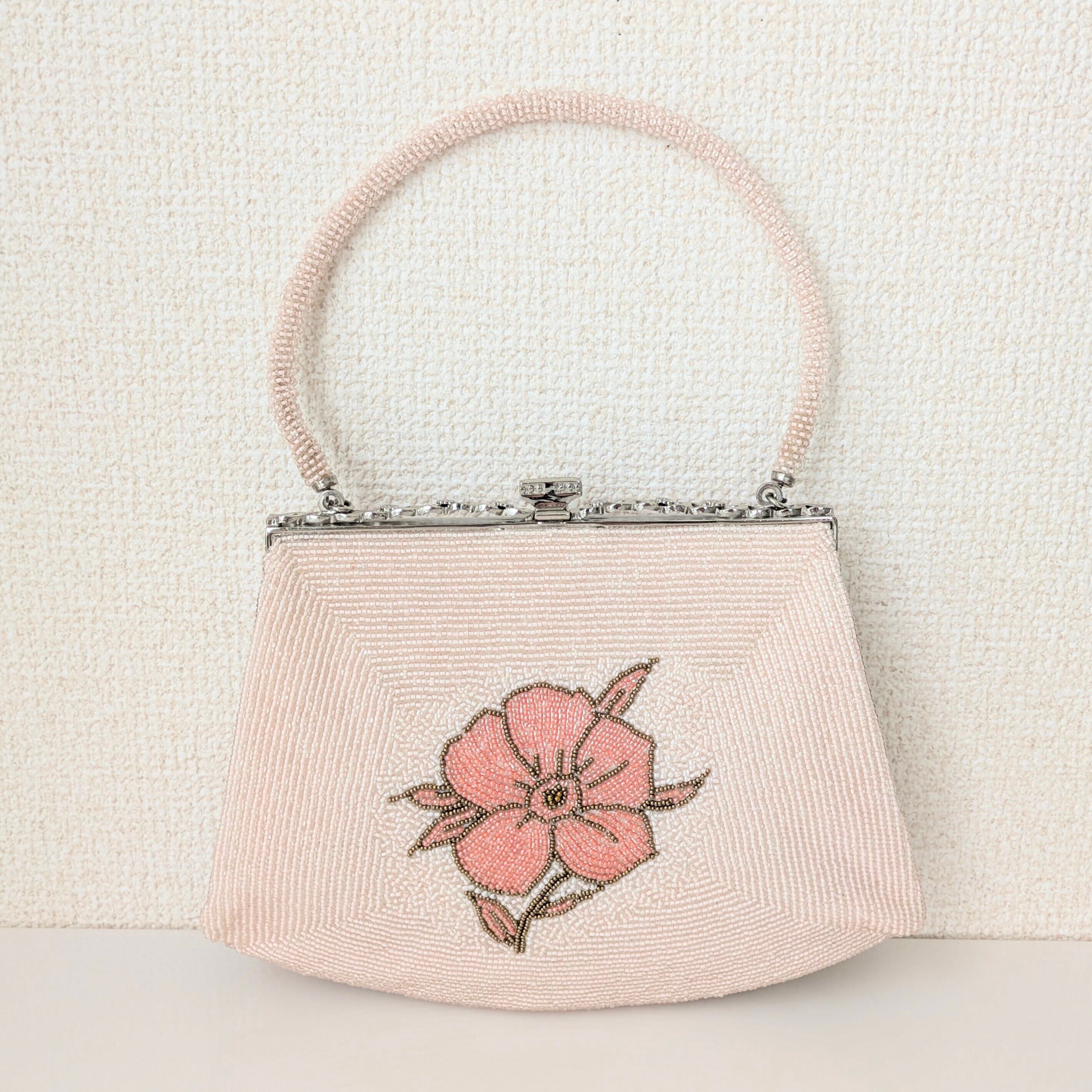 ピンクの花々が全体にあしらわれたビーズバッグです。ビーズ刺繍の花々が、生き生きとした躍動感あふれる印象です。