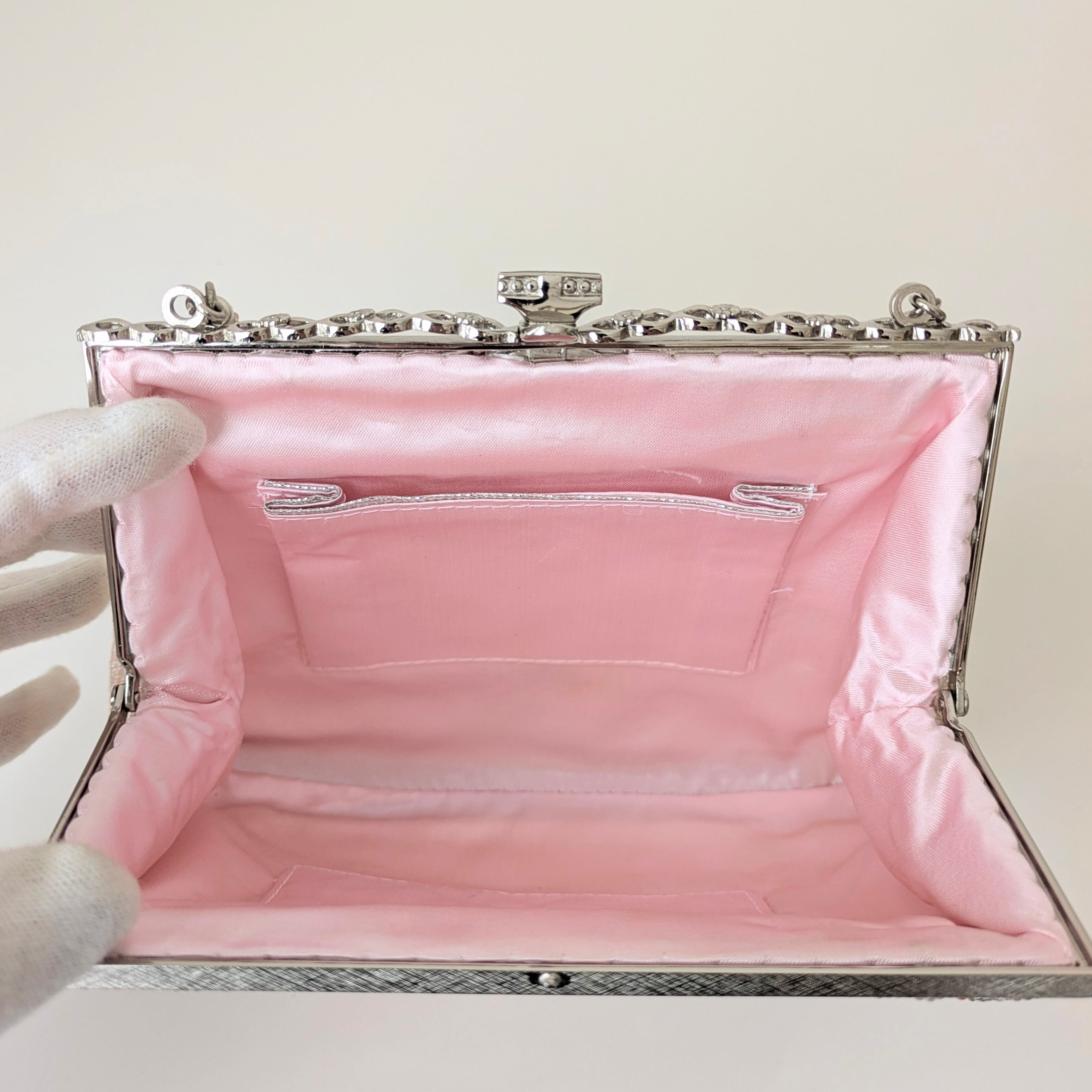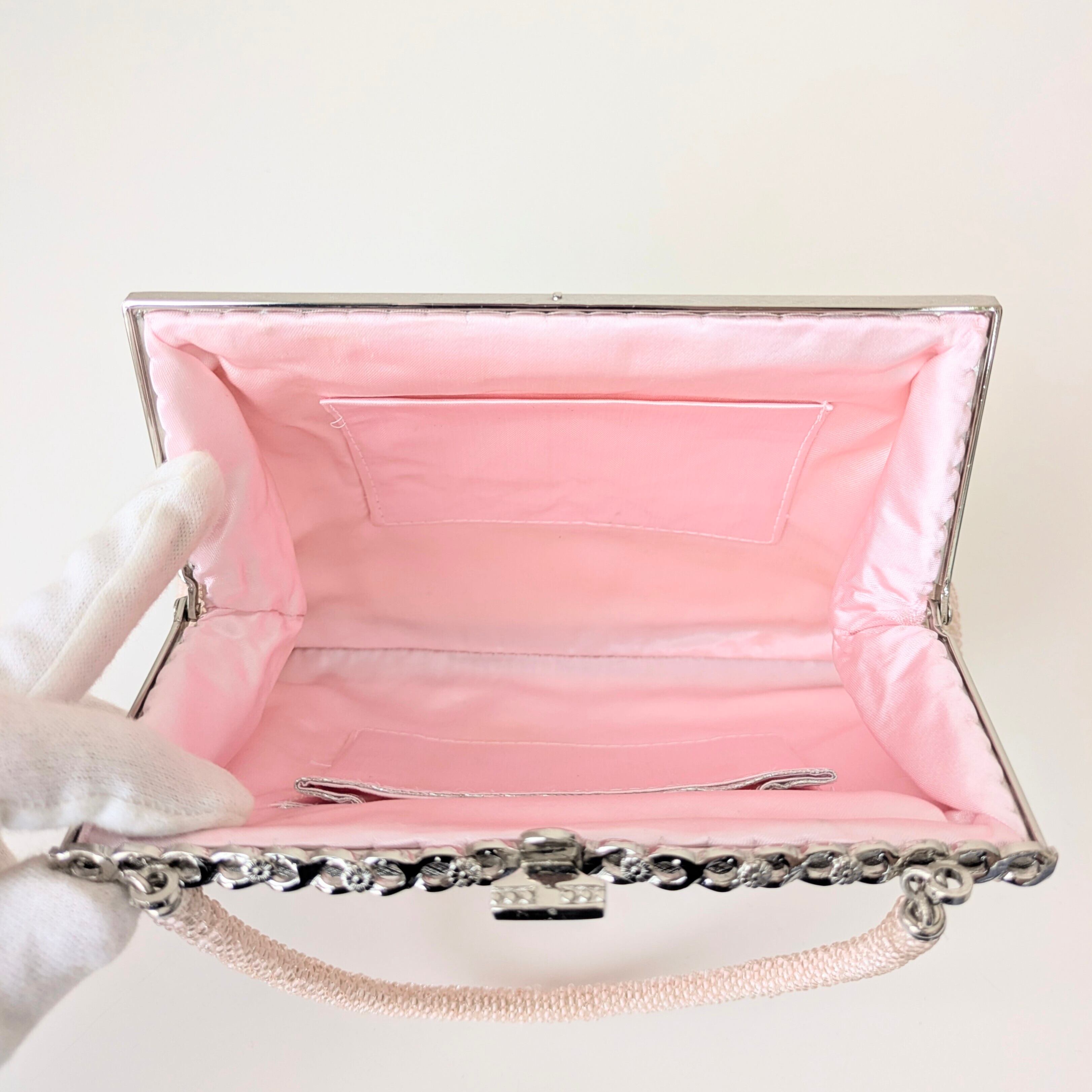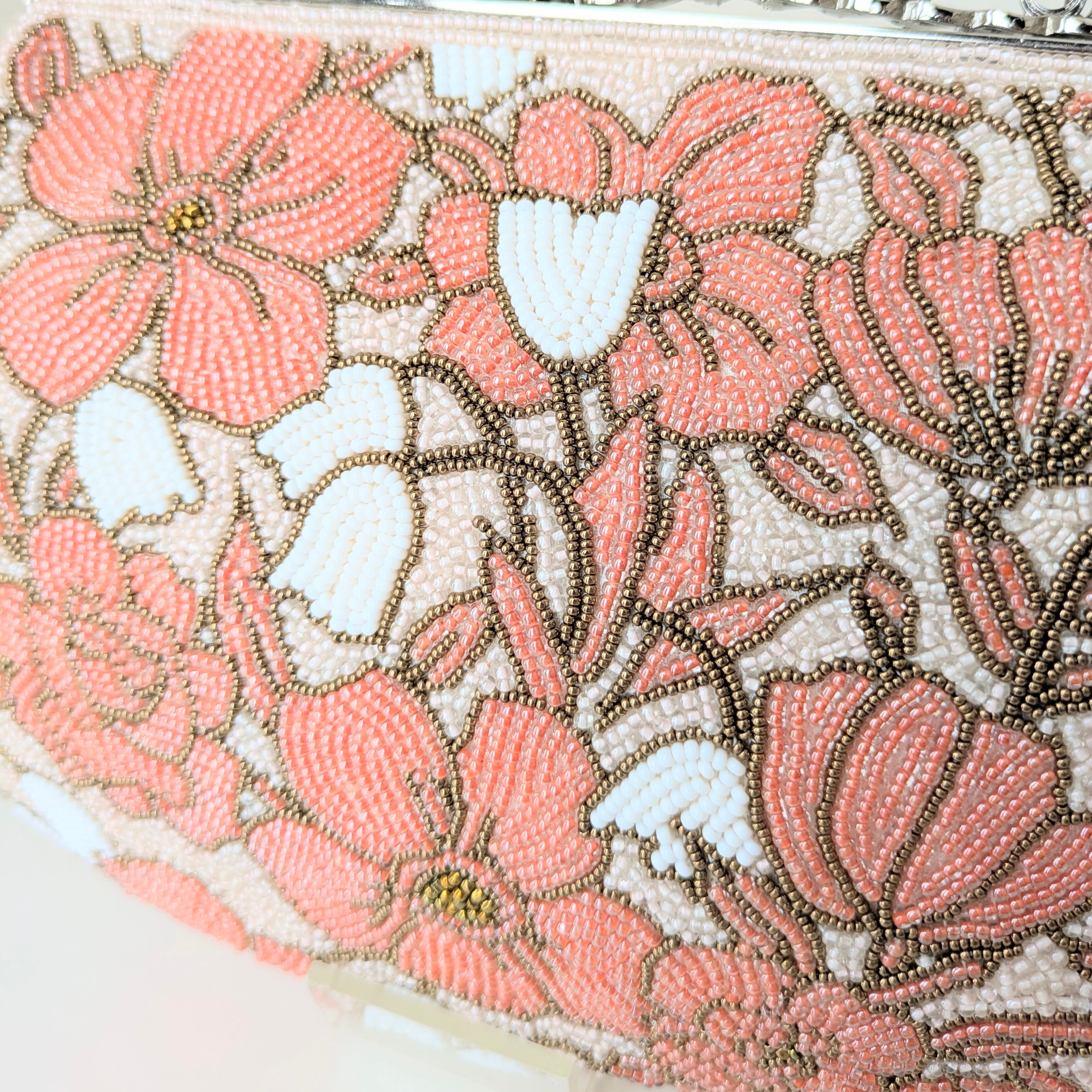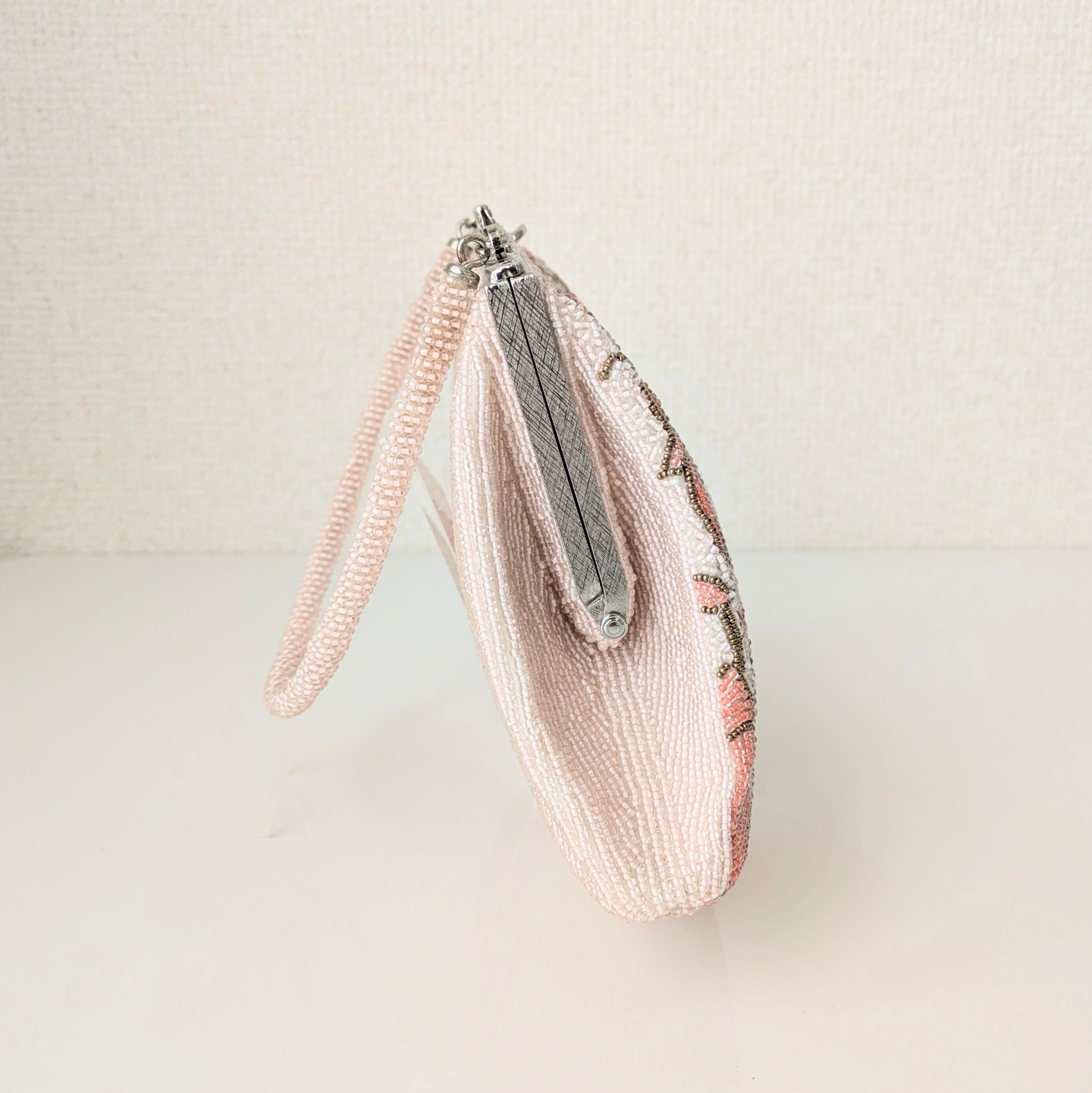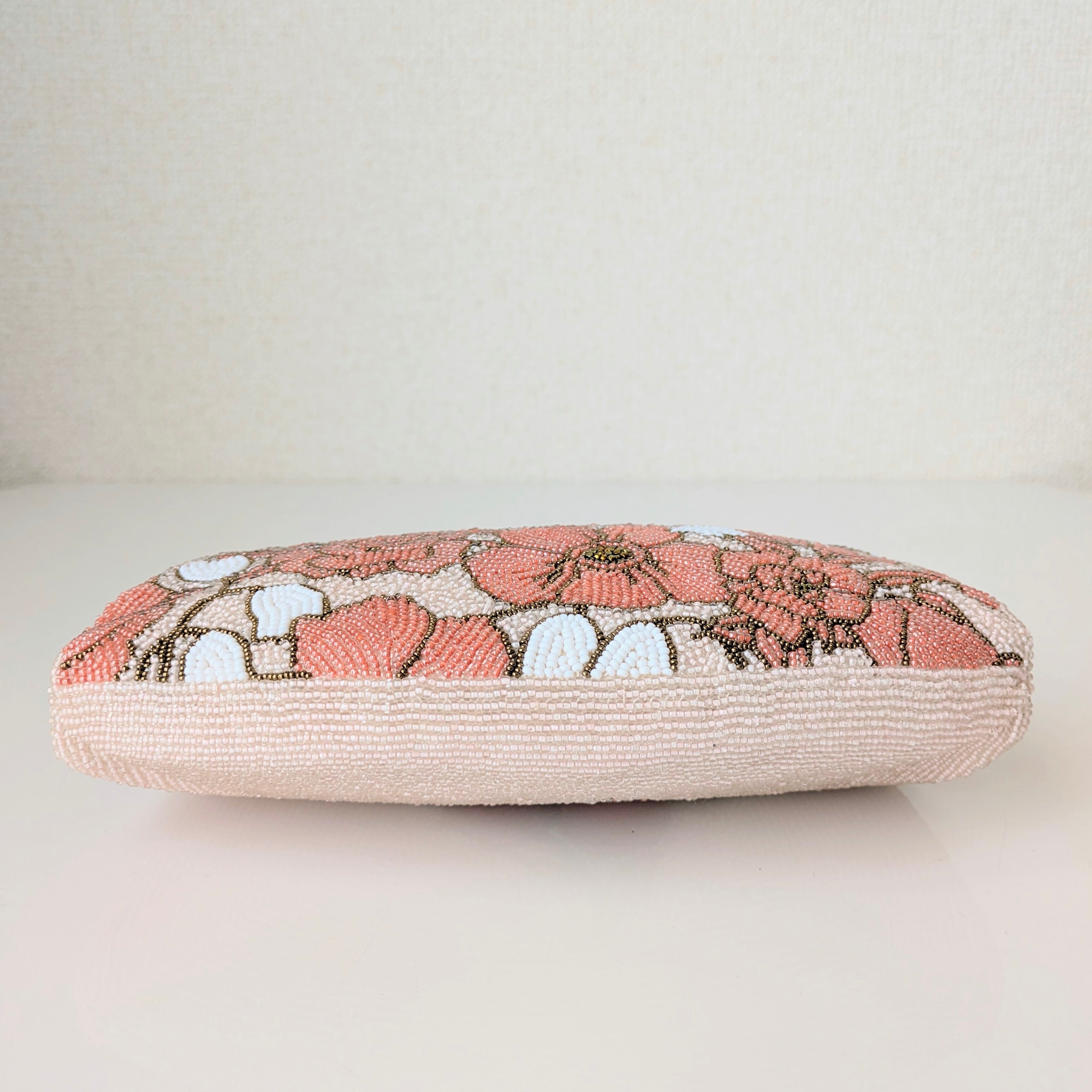 ピンクの花々が全体にあしらわれたビーズバッグです。ビーズ刺繍の花々が、生き生きとした躍動感あふれる印象です。