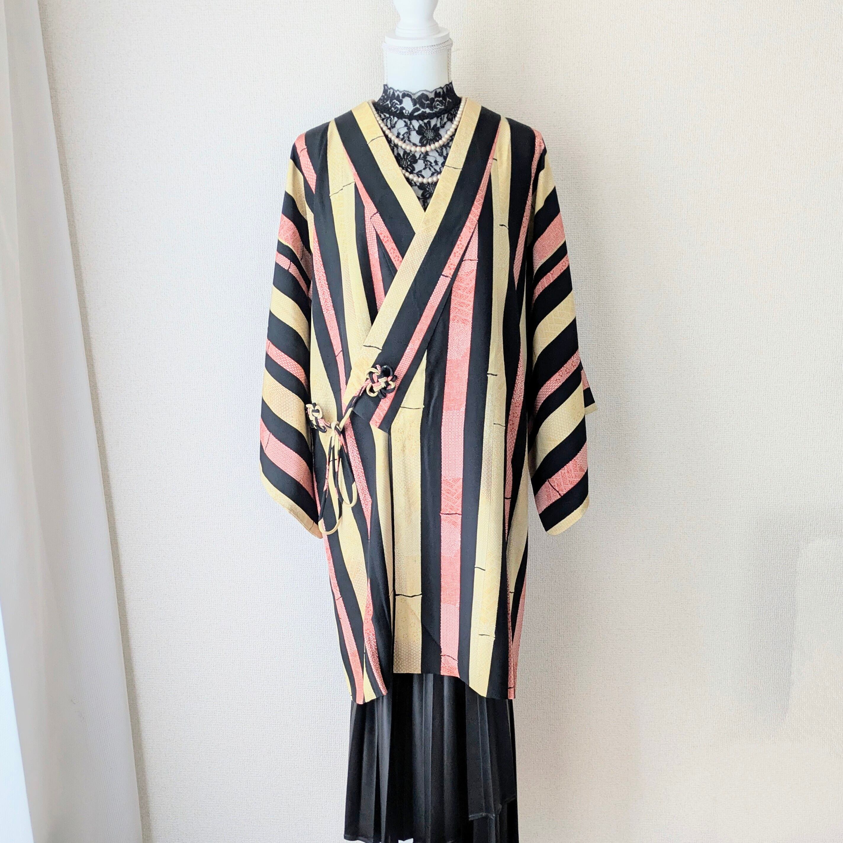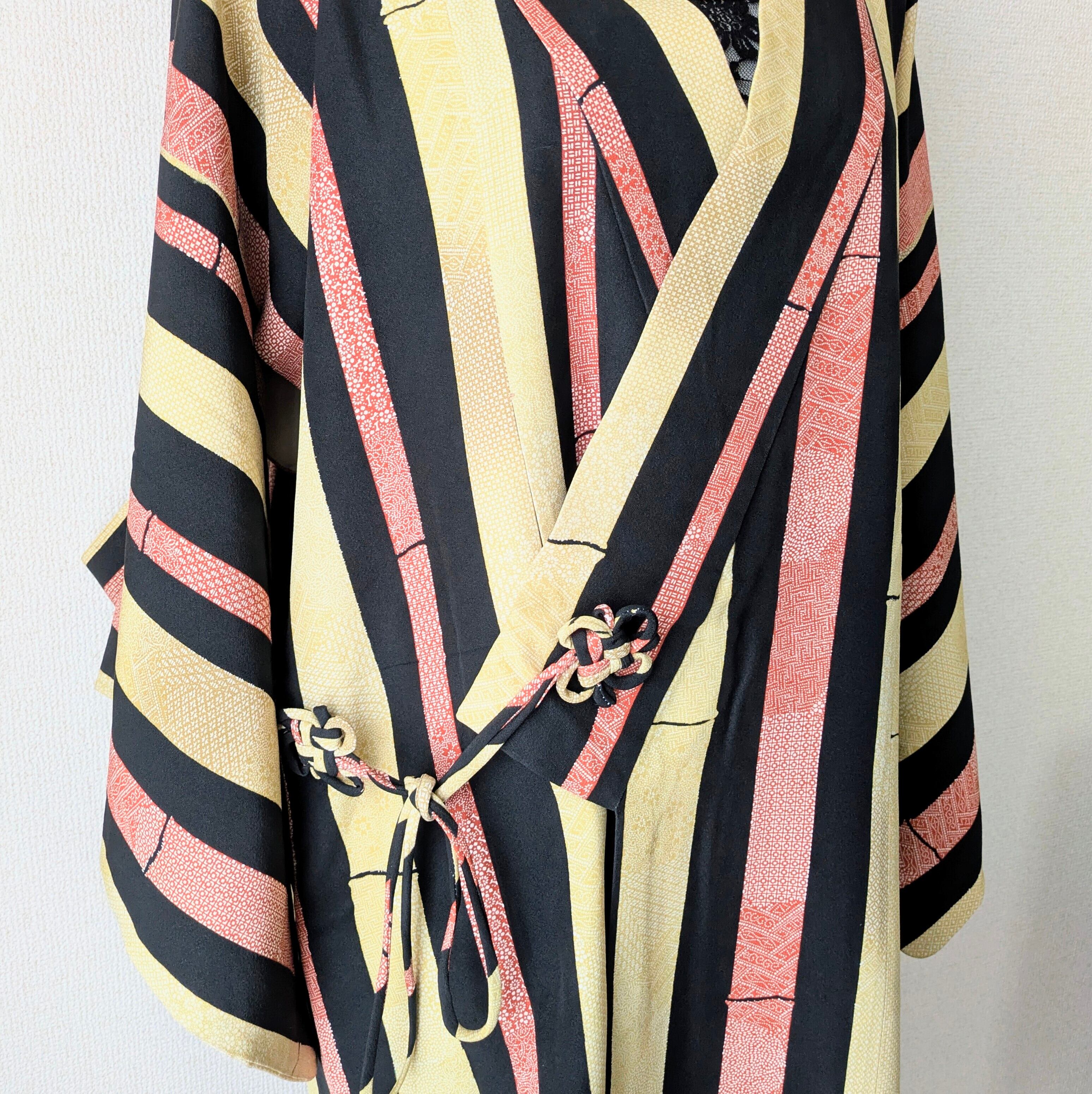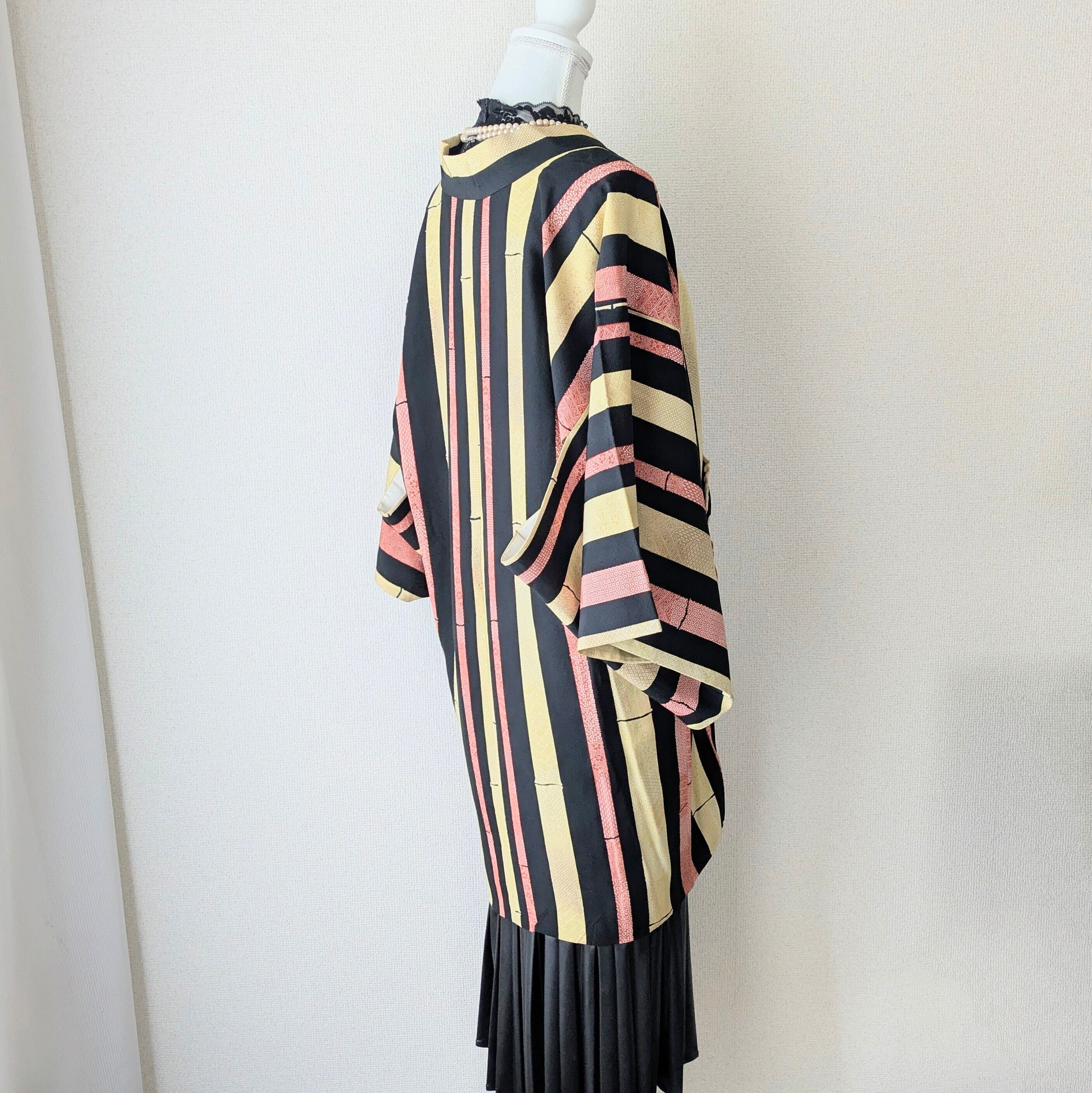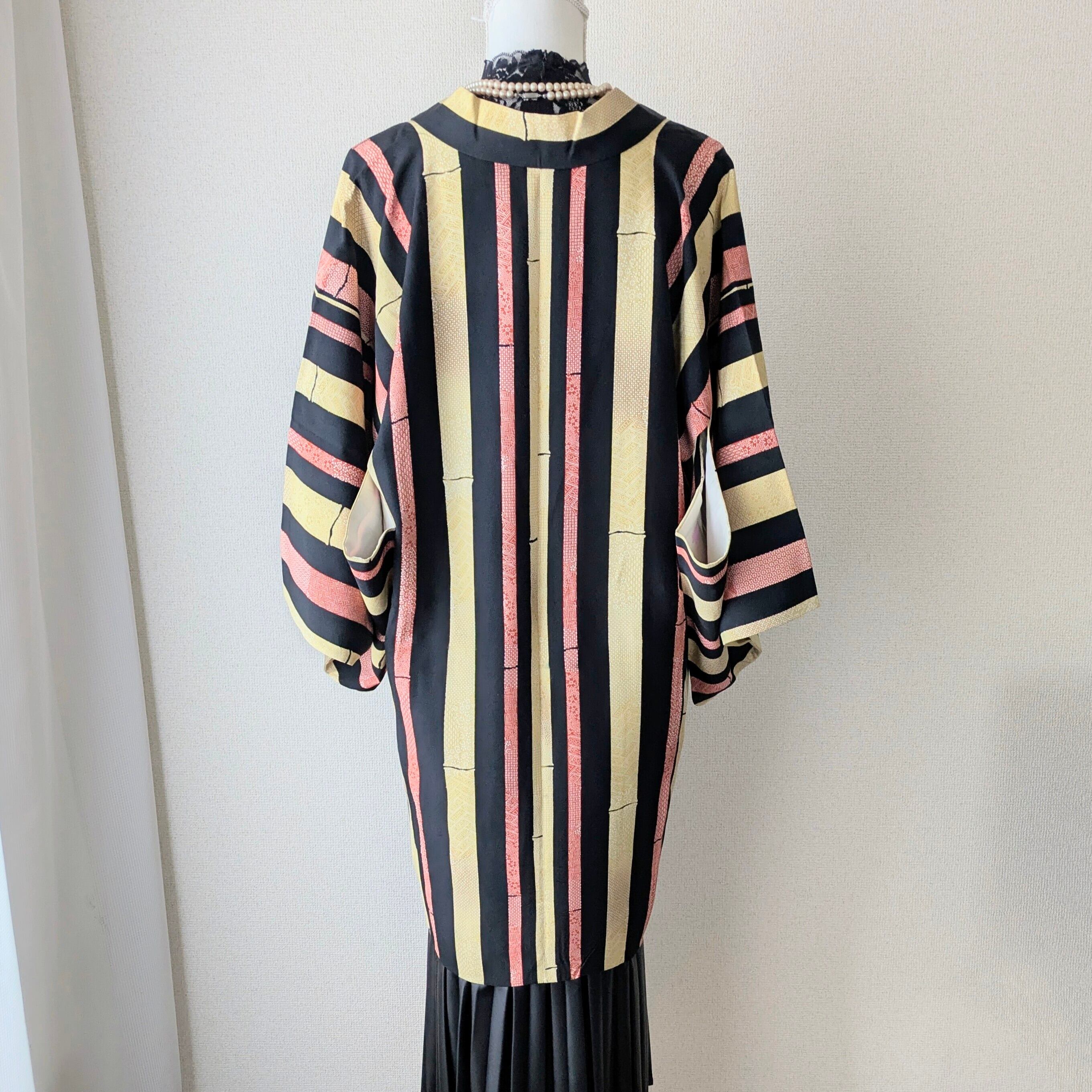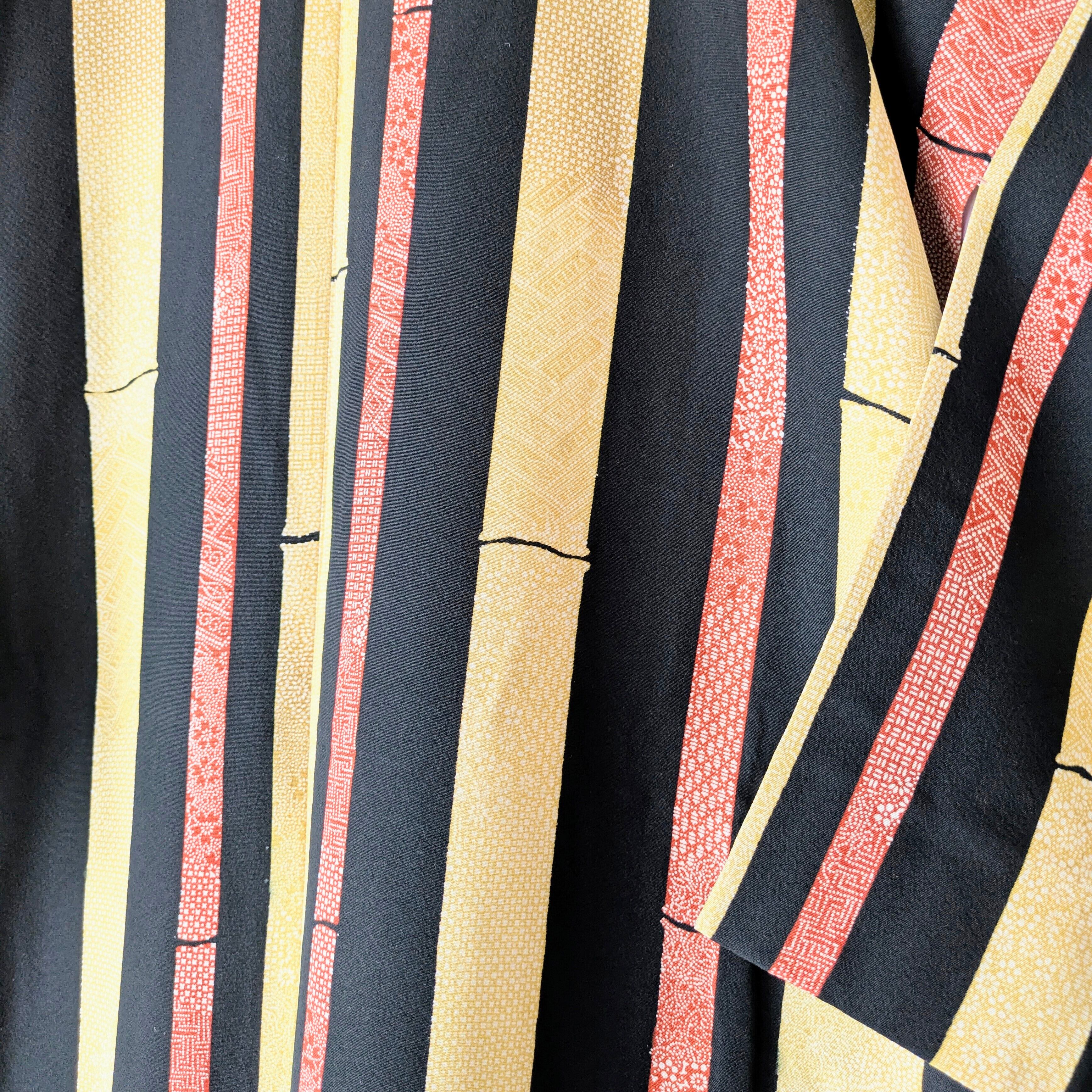 一見すると黒、黄、赤の縞模様ですが、よく見るとその縞は竹で描かれている、とてもユニークでモダンな、個性が光る道中着です。