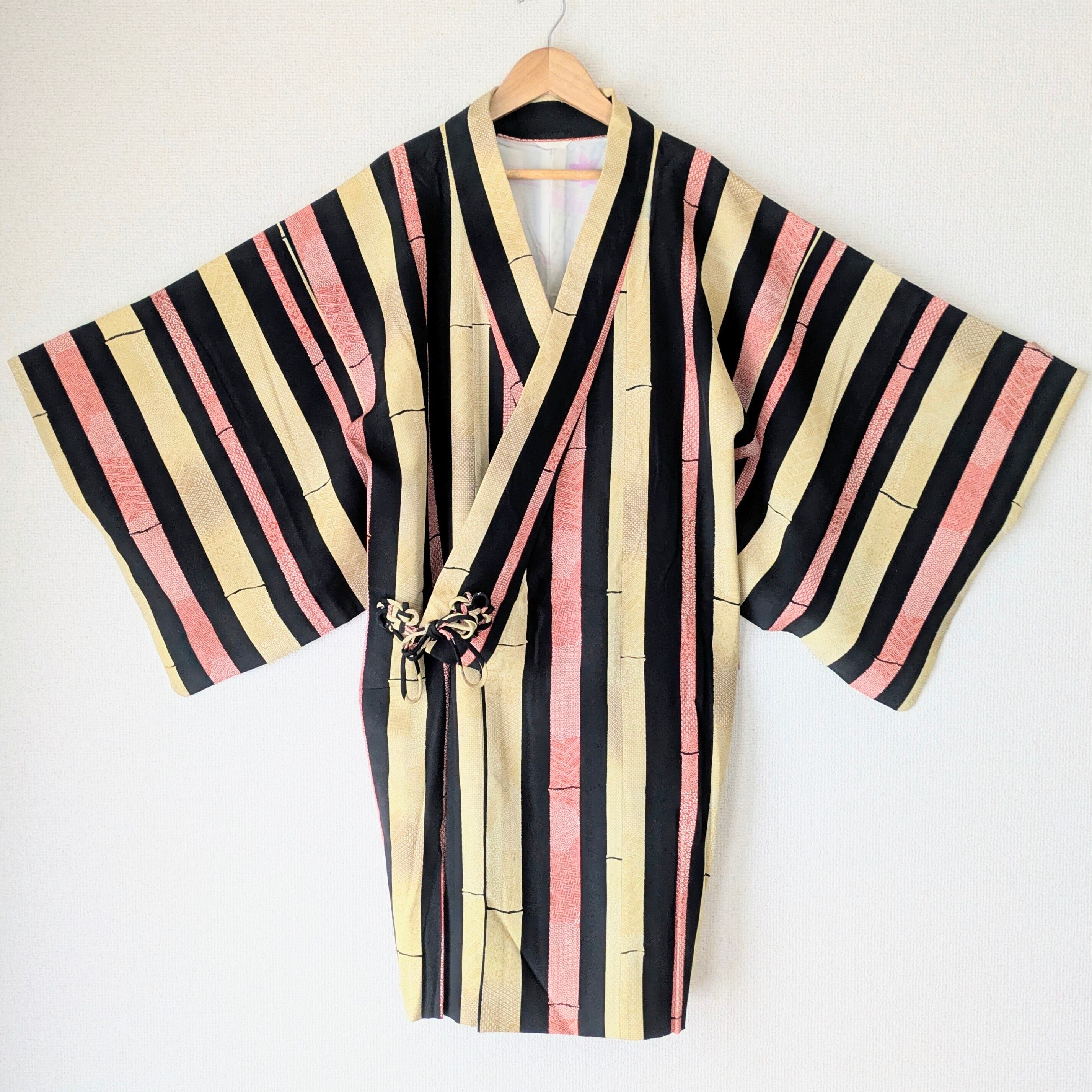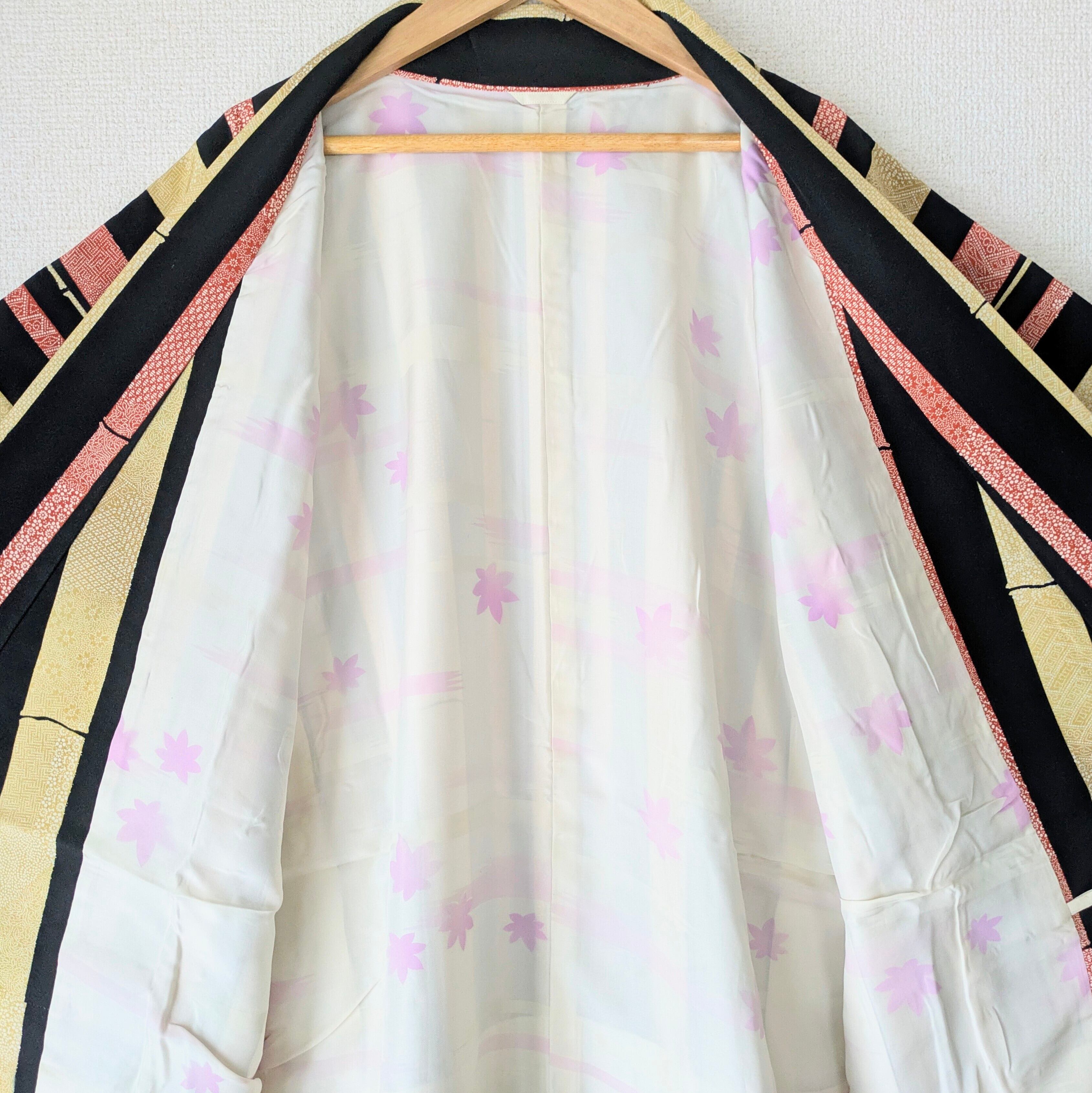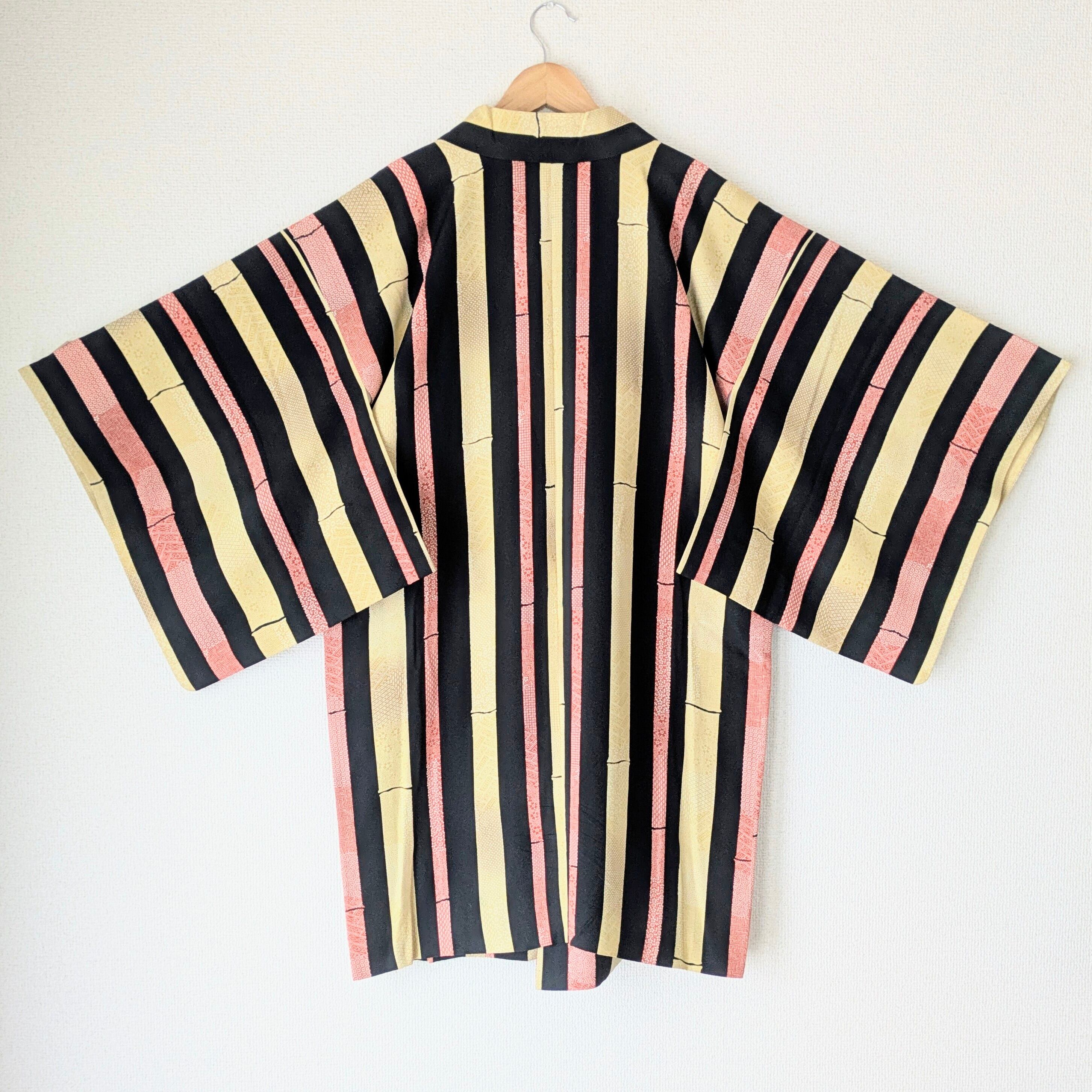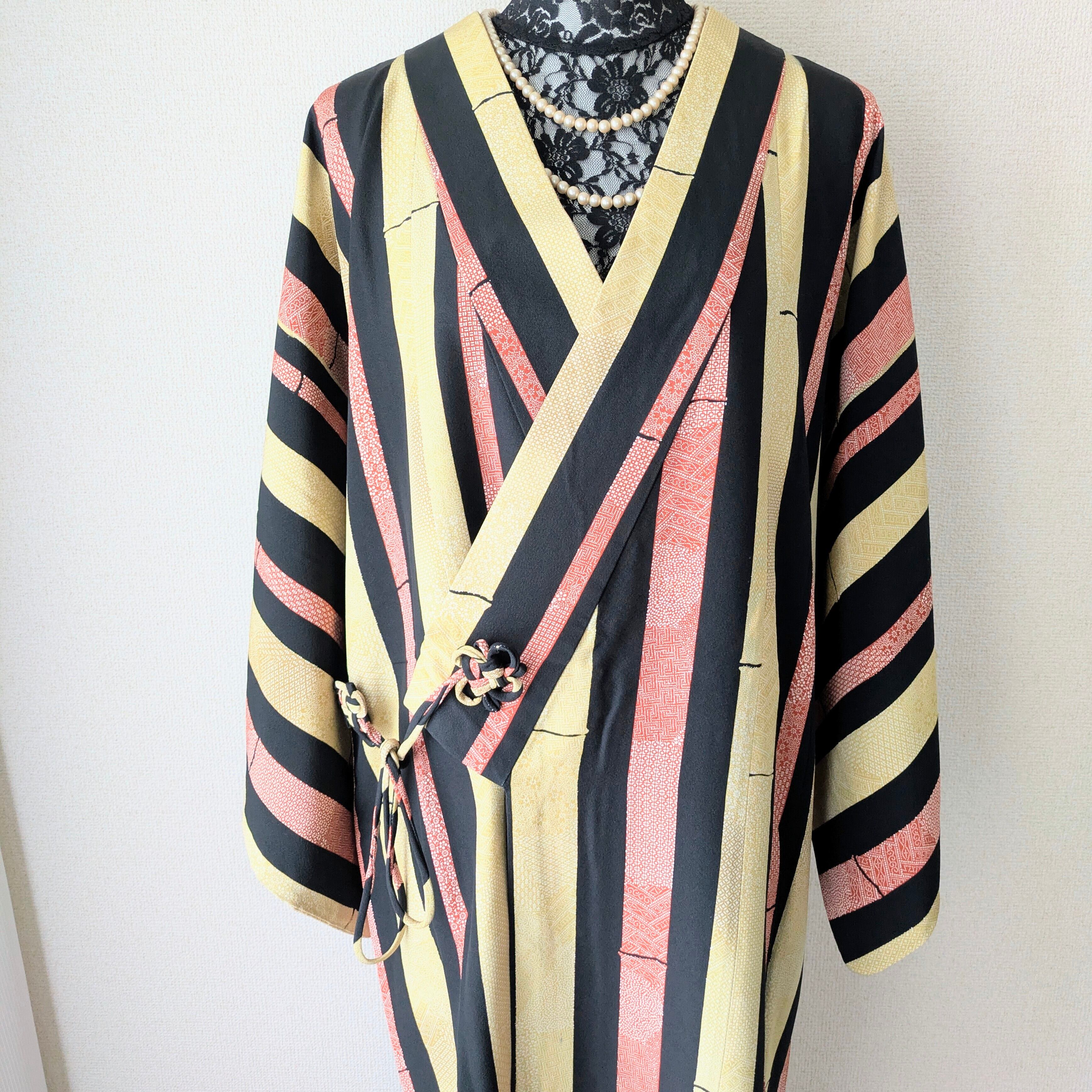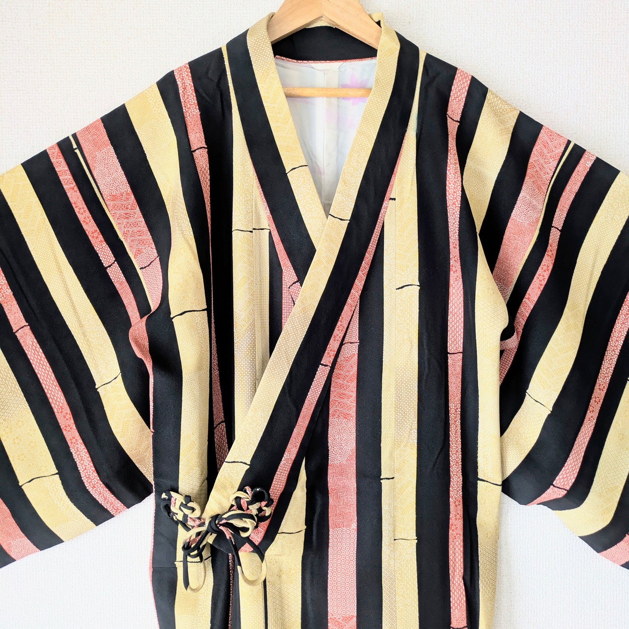 一見すると黒、黄、赤の縞模様ですが、よく見るとその縞は竹で描かれている、とてもユニークでモダンな、個性が光る道中着です。