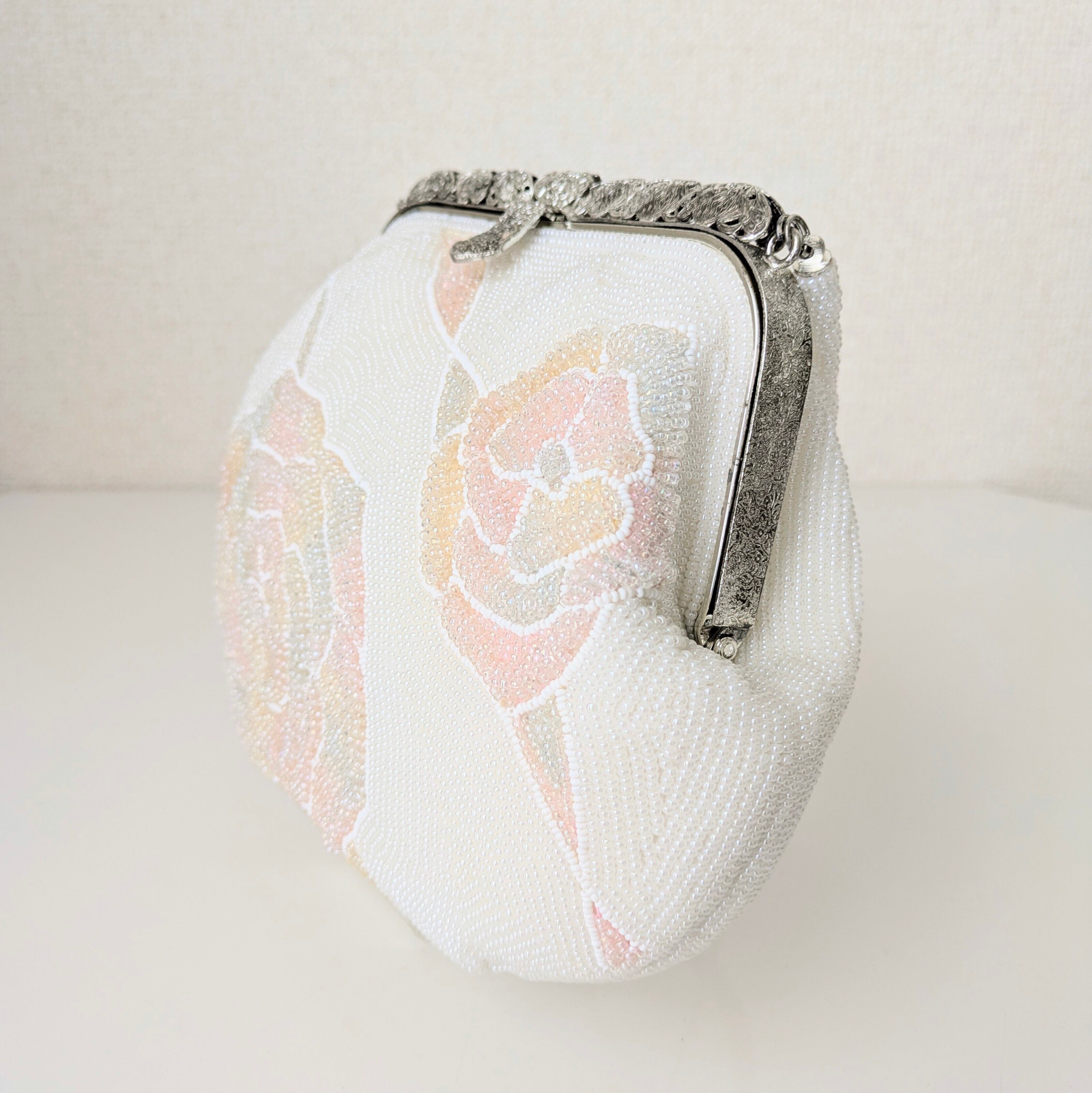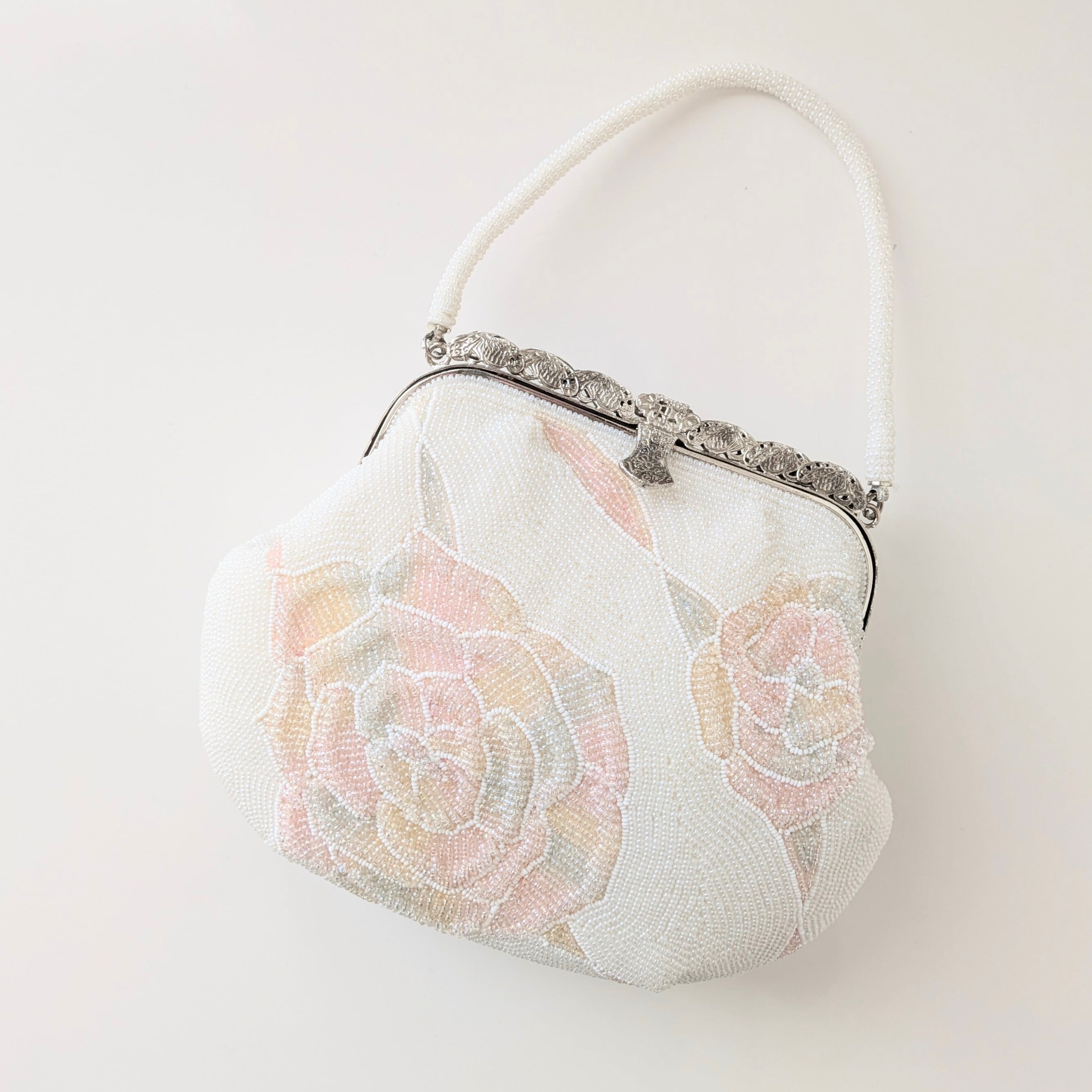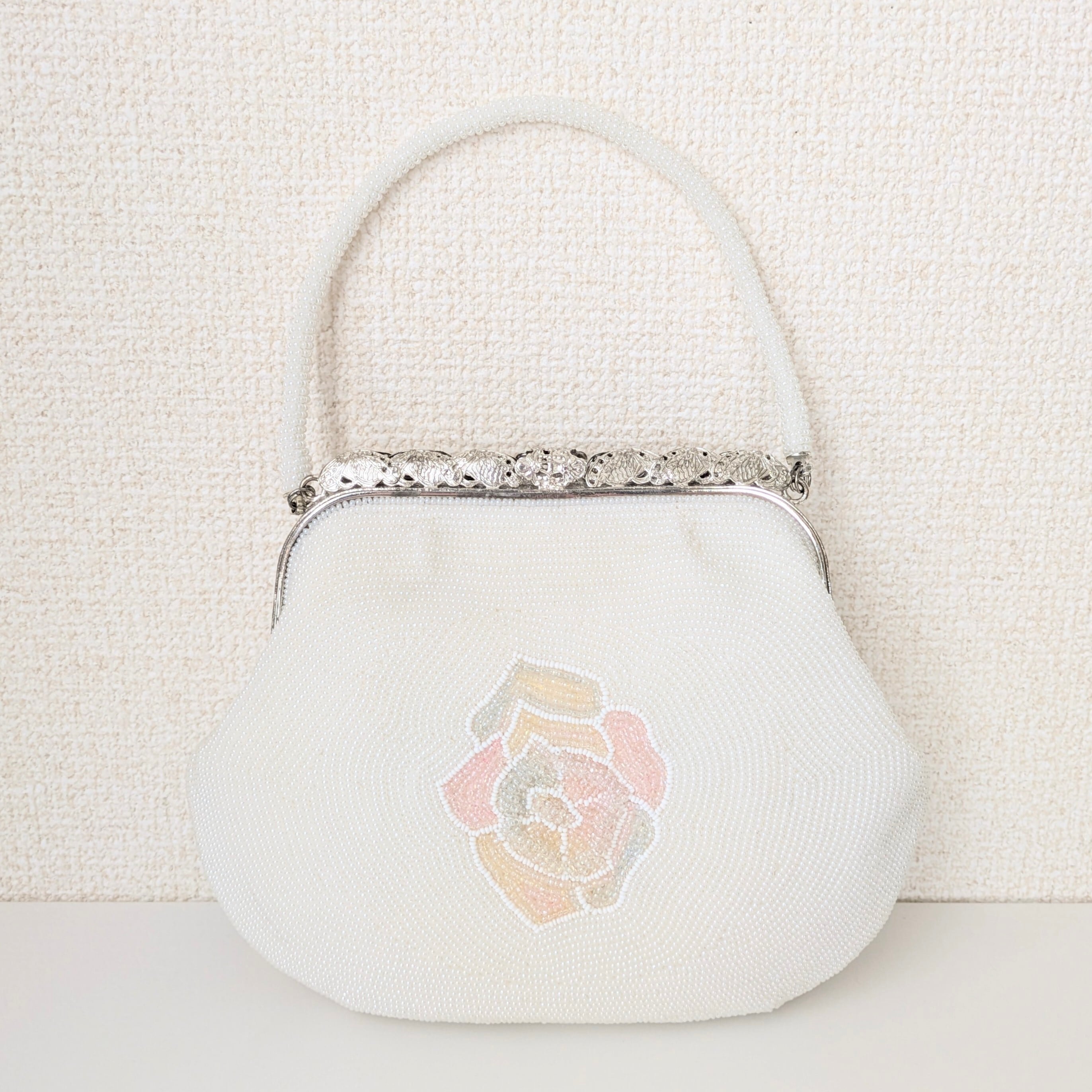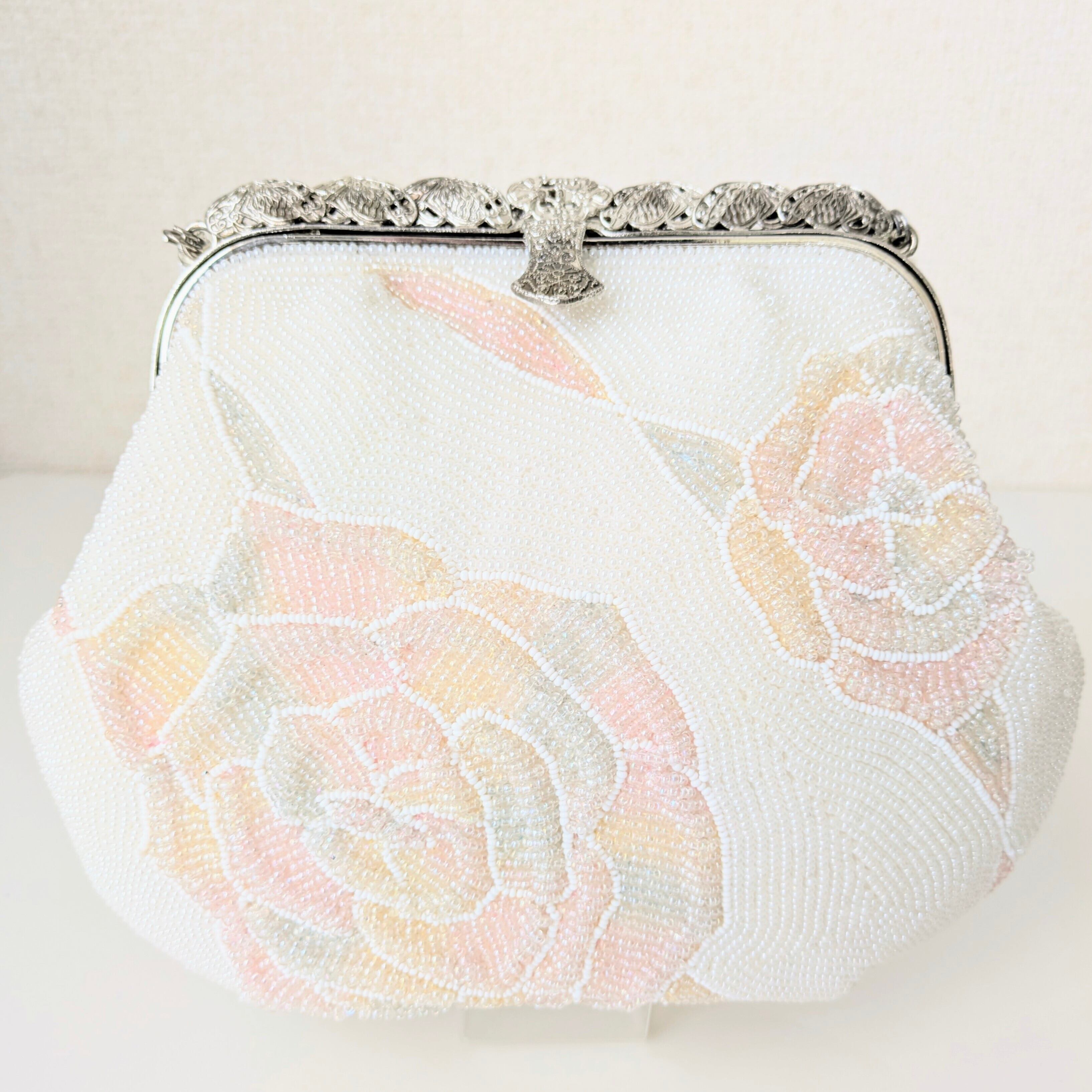 【Vintage】ビーズ刺繍バッグ 白 パステルピンク 薔薇 パーティーバッグ 昭和レトロ 大正浪漫 フォーマルバッグ