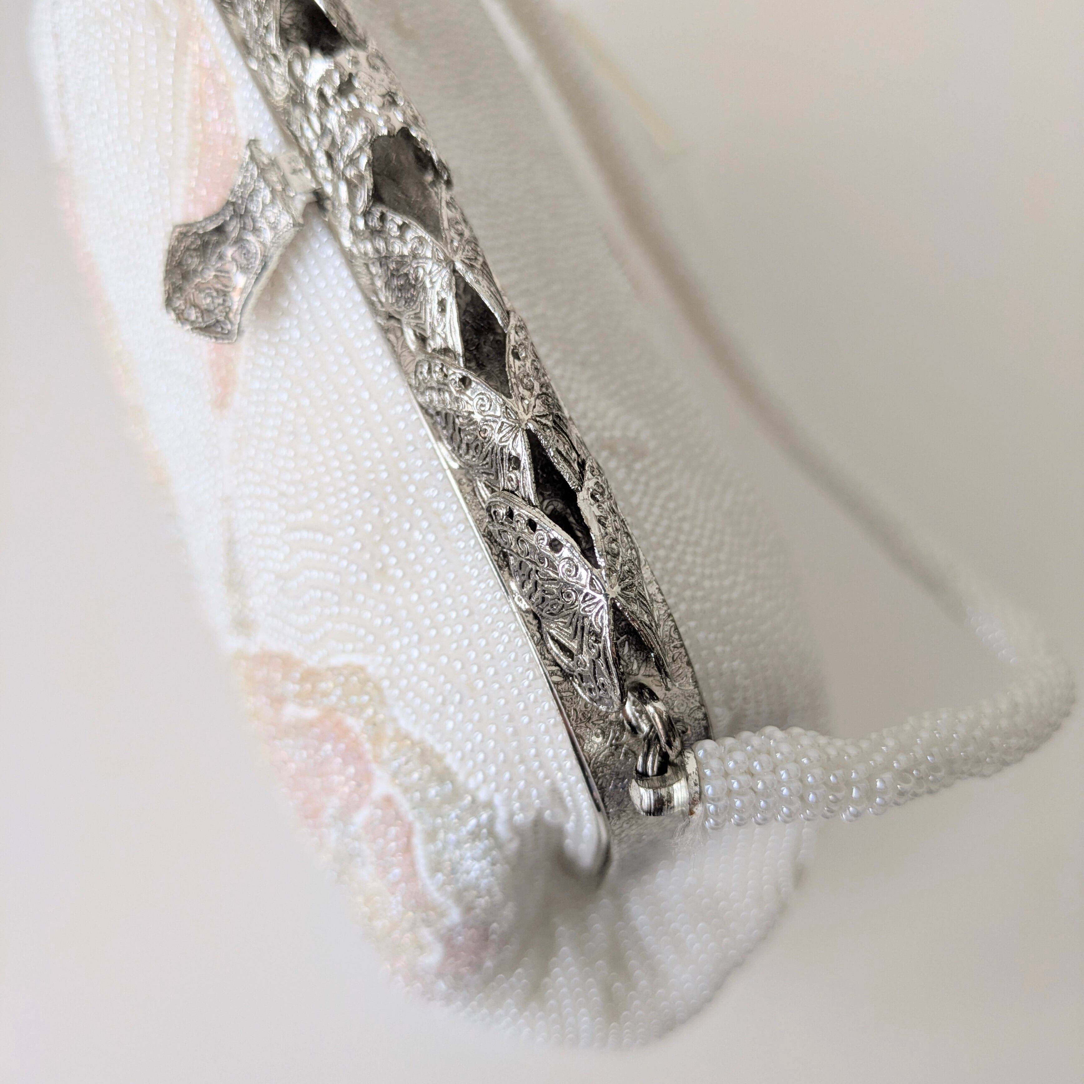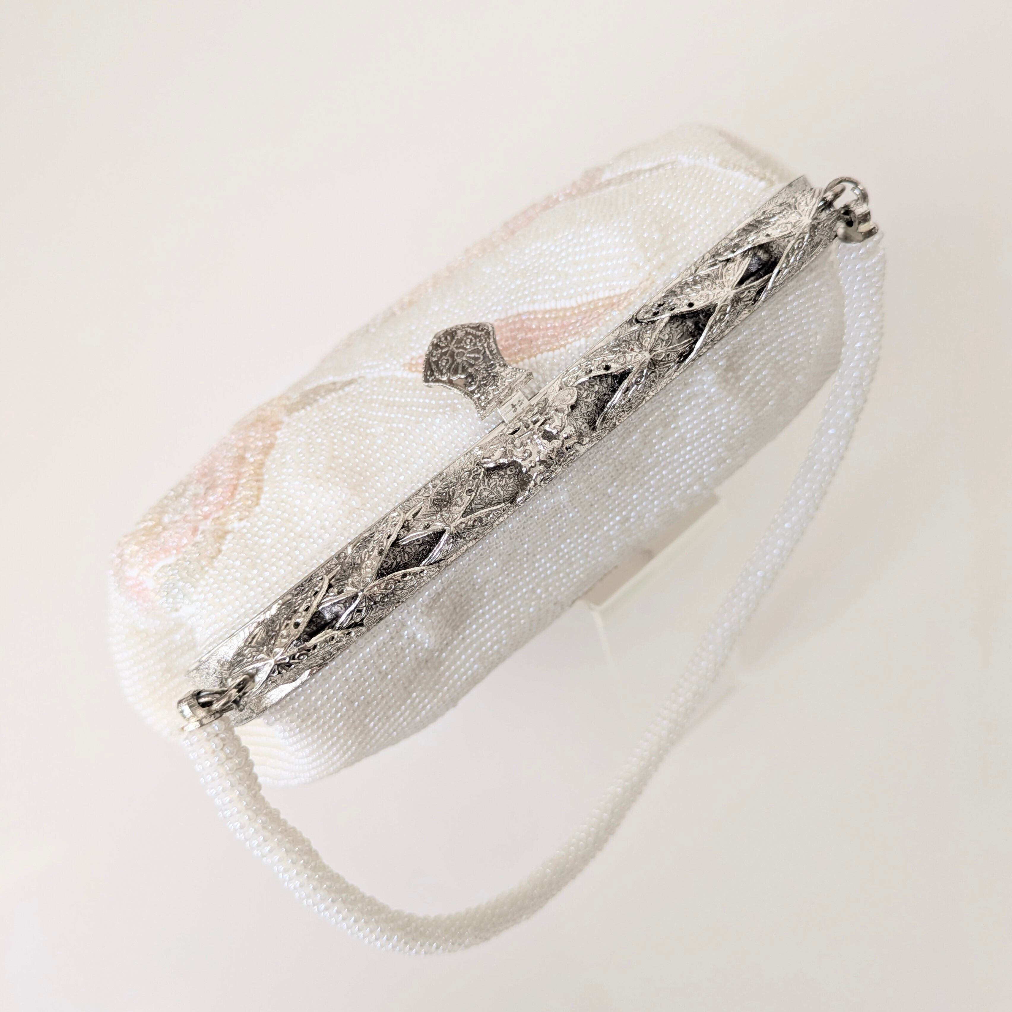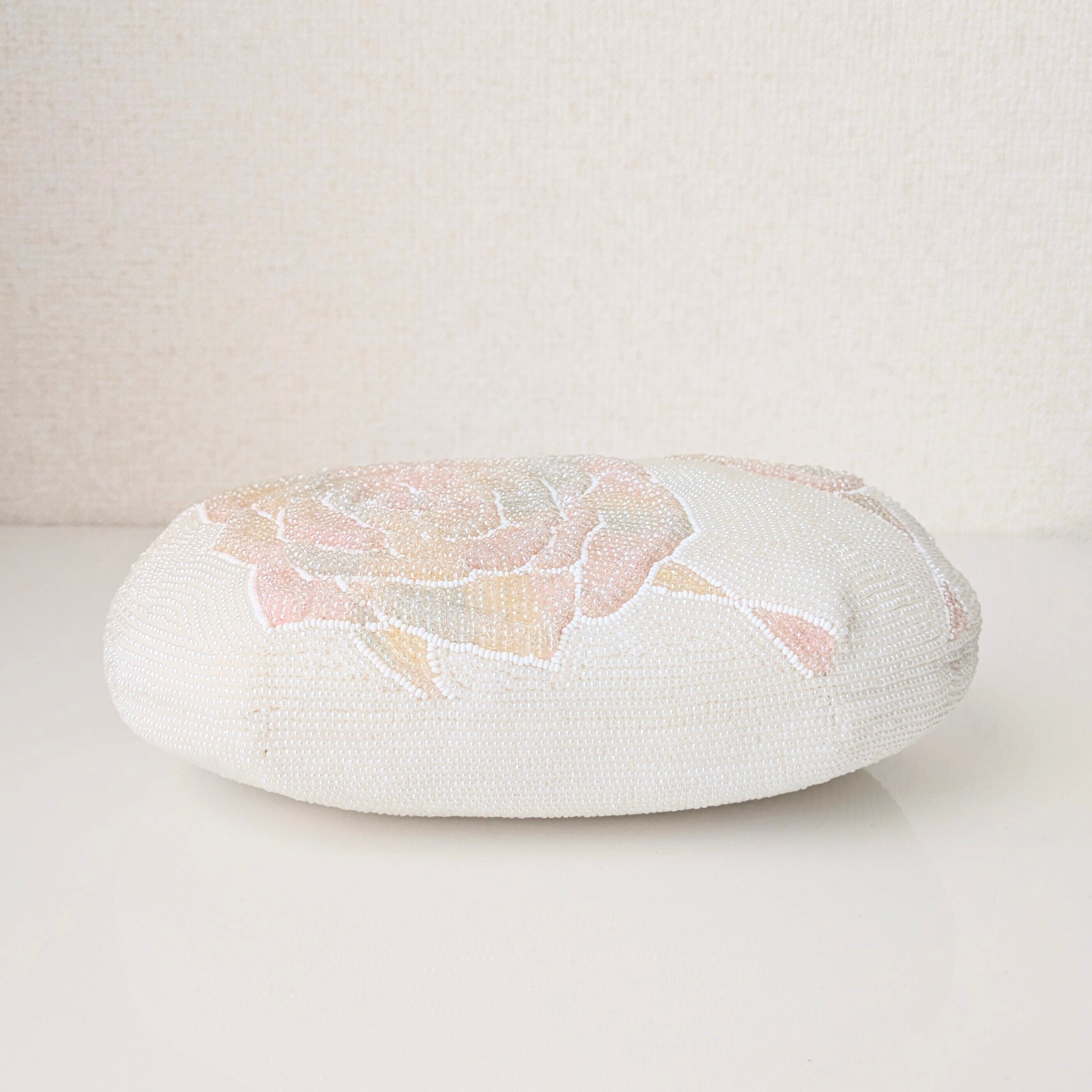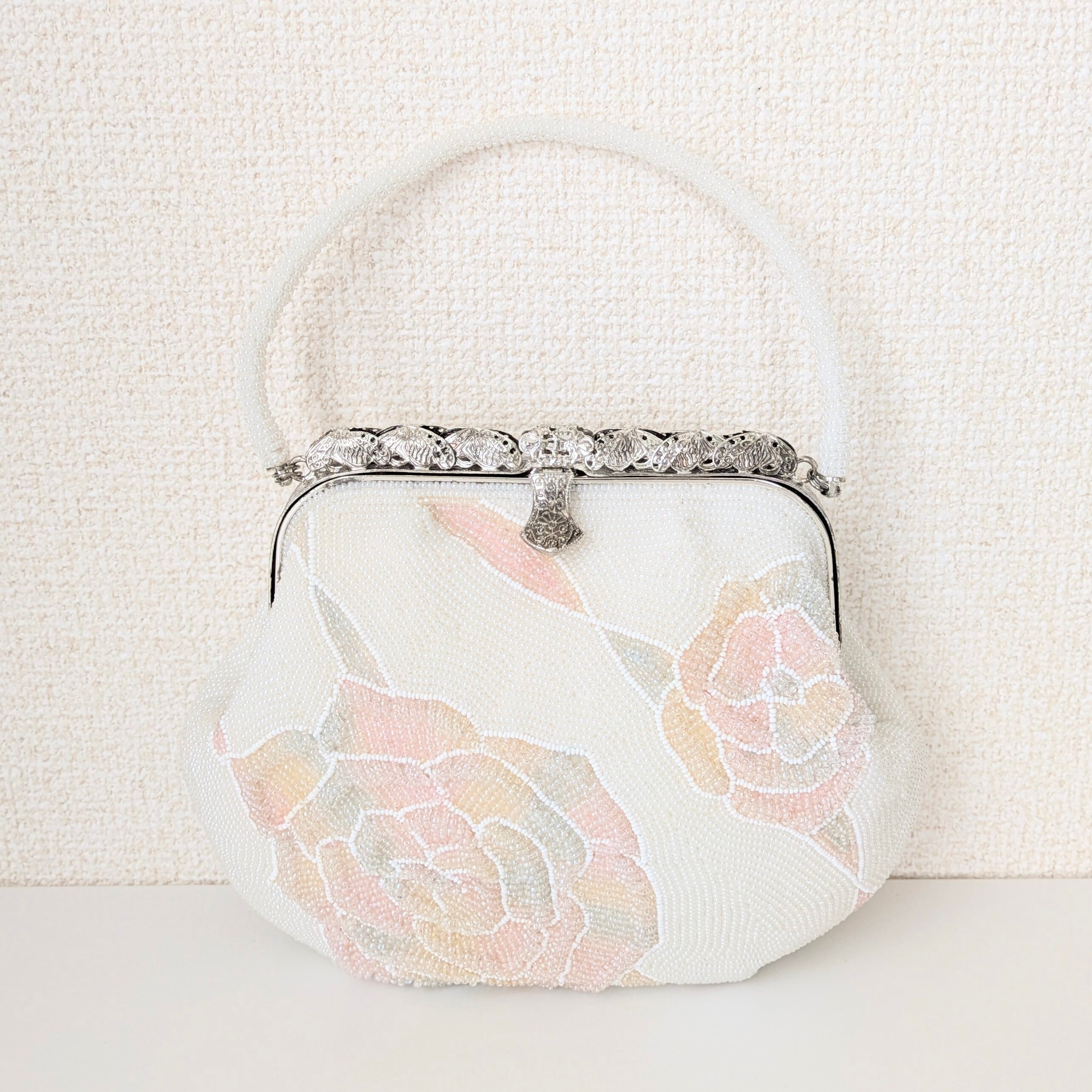 【Vintage】ビーズ刺繍バッグ 白 パステルピンク 薔薇 パーティーバッグ 昭和レトロ 大正浪漫 フォーマルバッグ