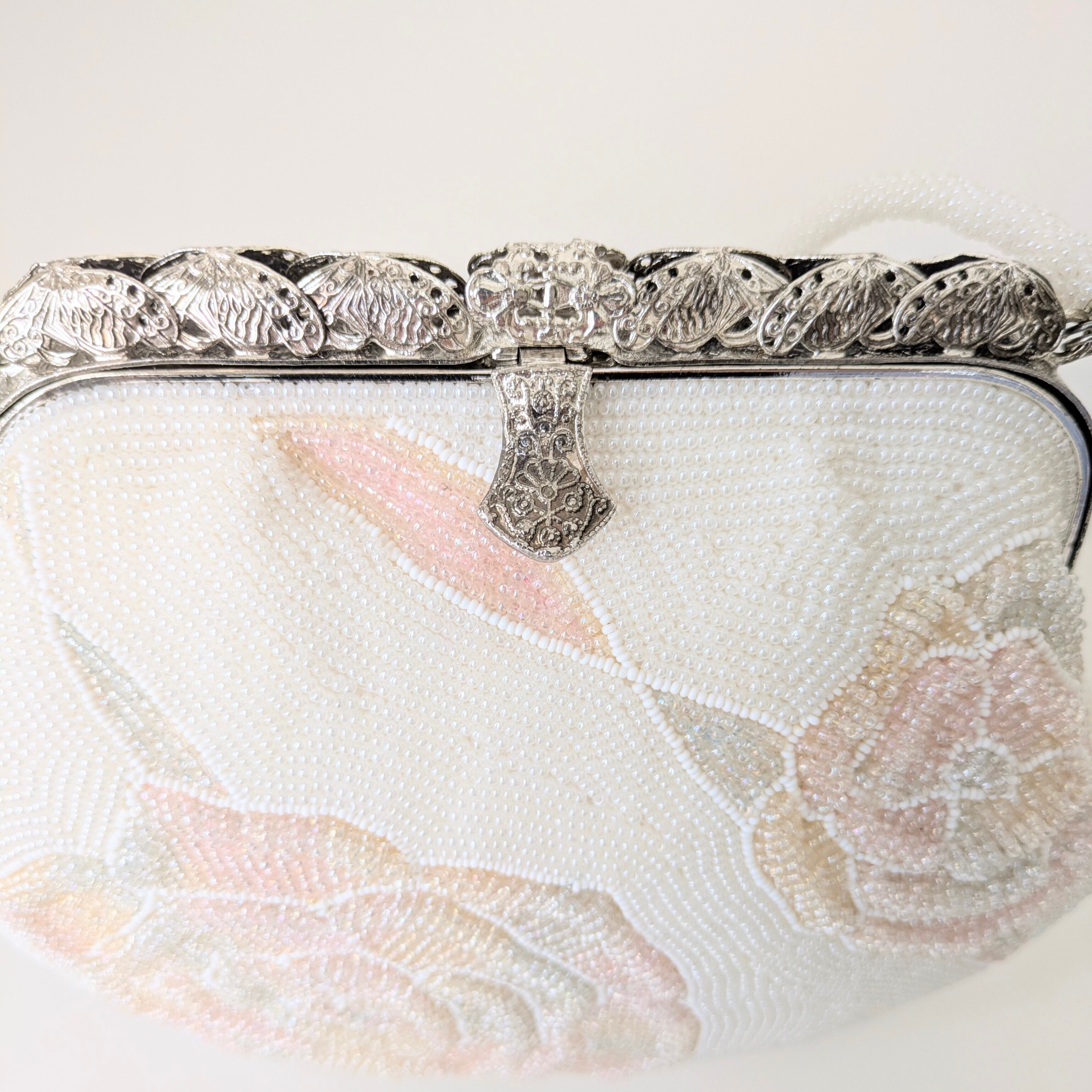 白地にパステル調の薔薇が描かれたビーズバッグ。柔らかな色合いが美しいお品です。バッグのクラッチ部分には珍しい蝶の装飾があしらわれており、細やかな細工に魅入ってしまいます。