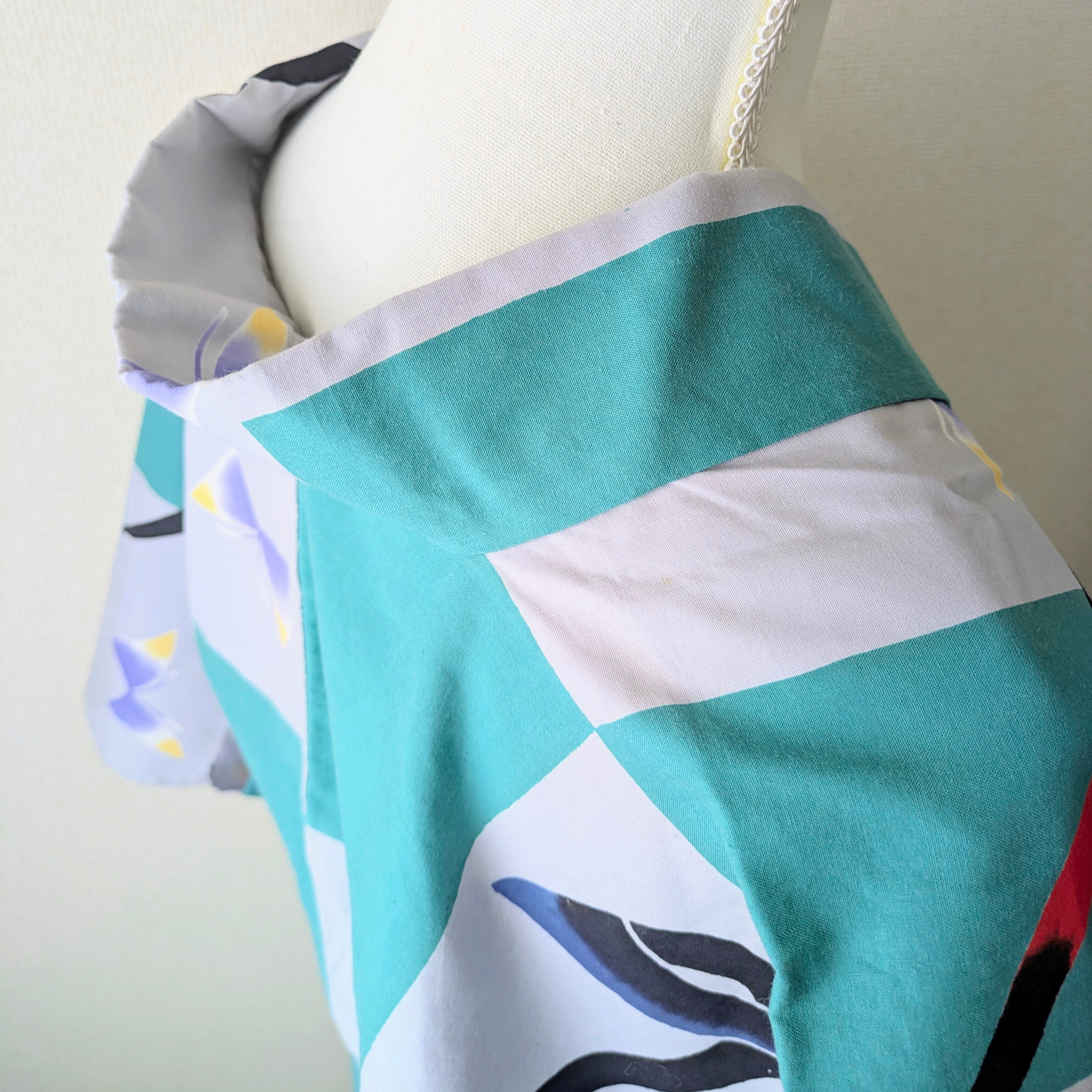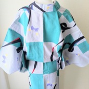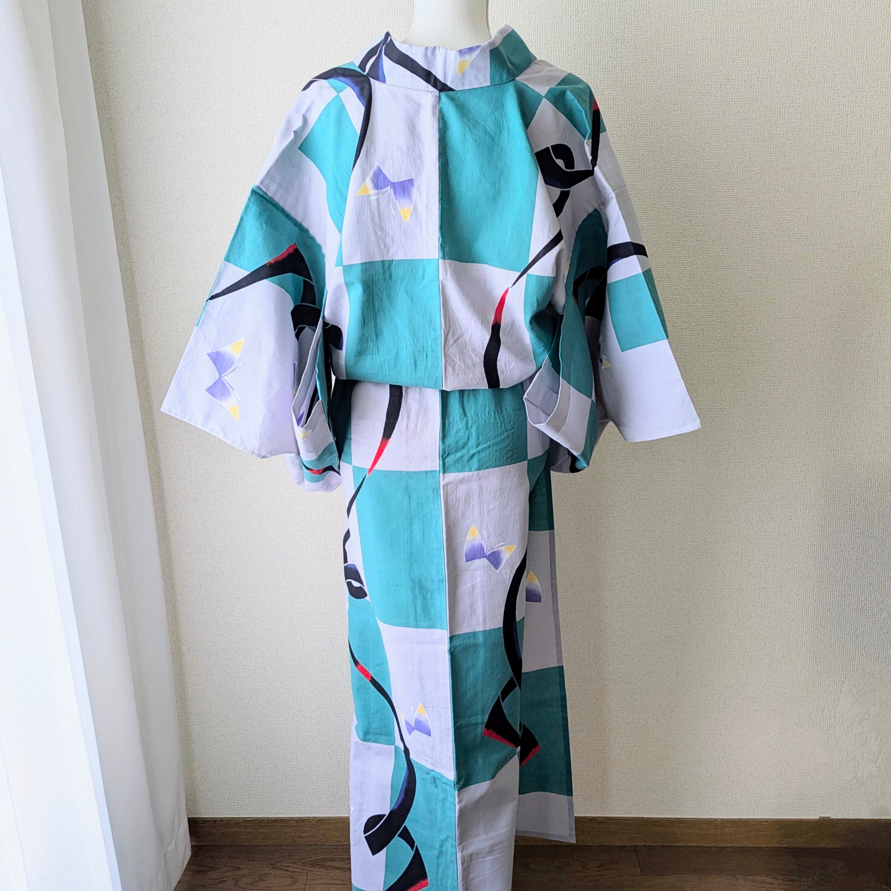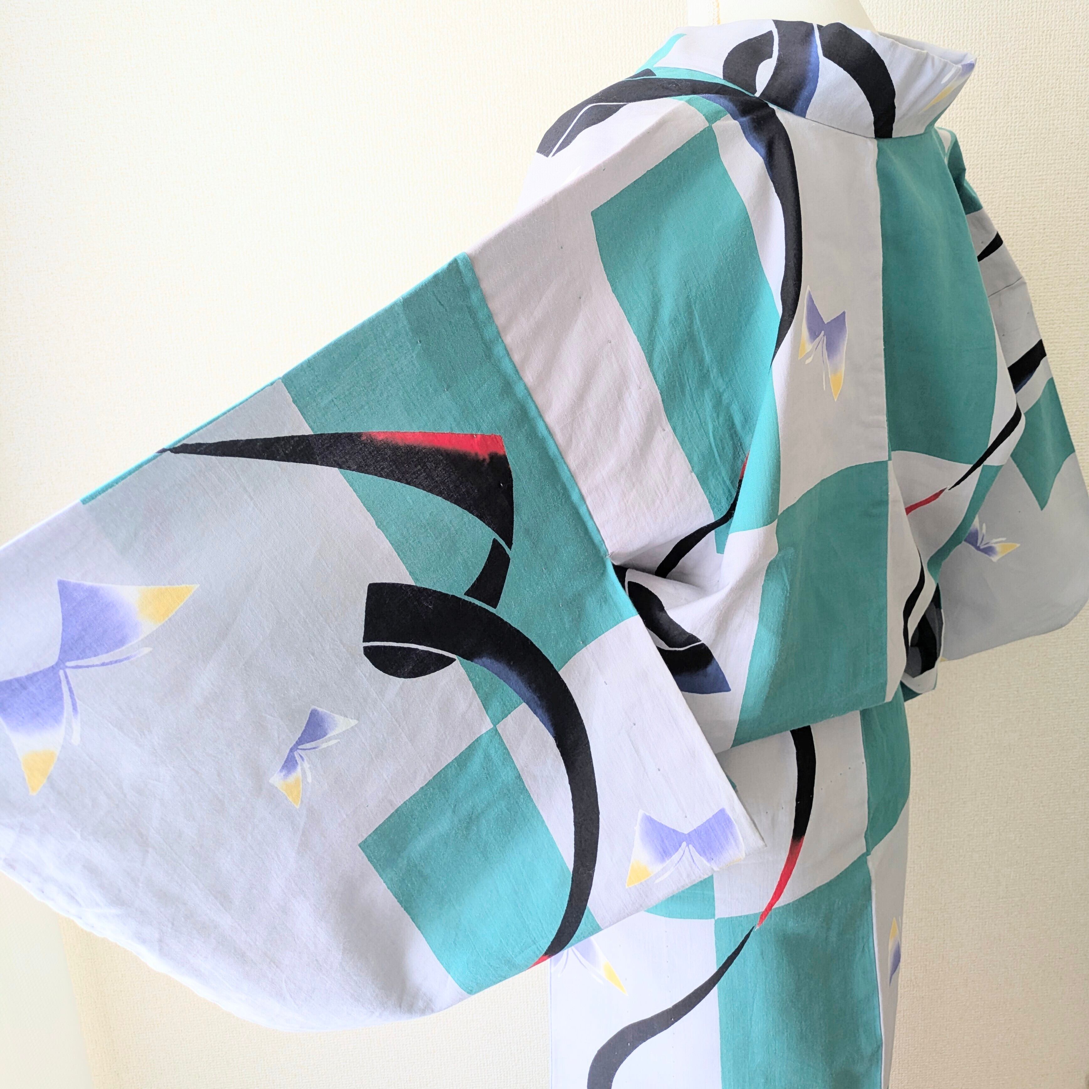 グレー×ペパーミントグリーンの市松柄にほんのりグラデーションの可愛らしい蝶が舞うモダンテイストな注染の浴衣です。