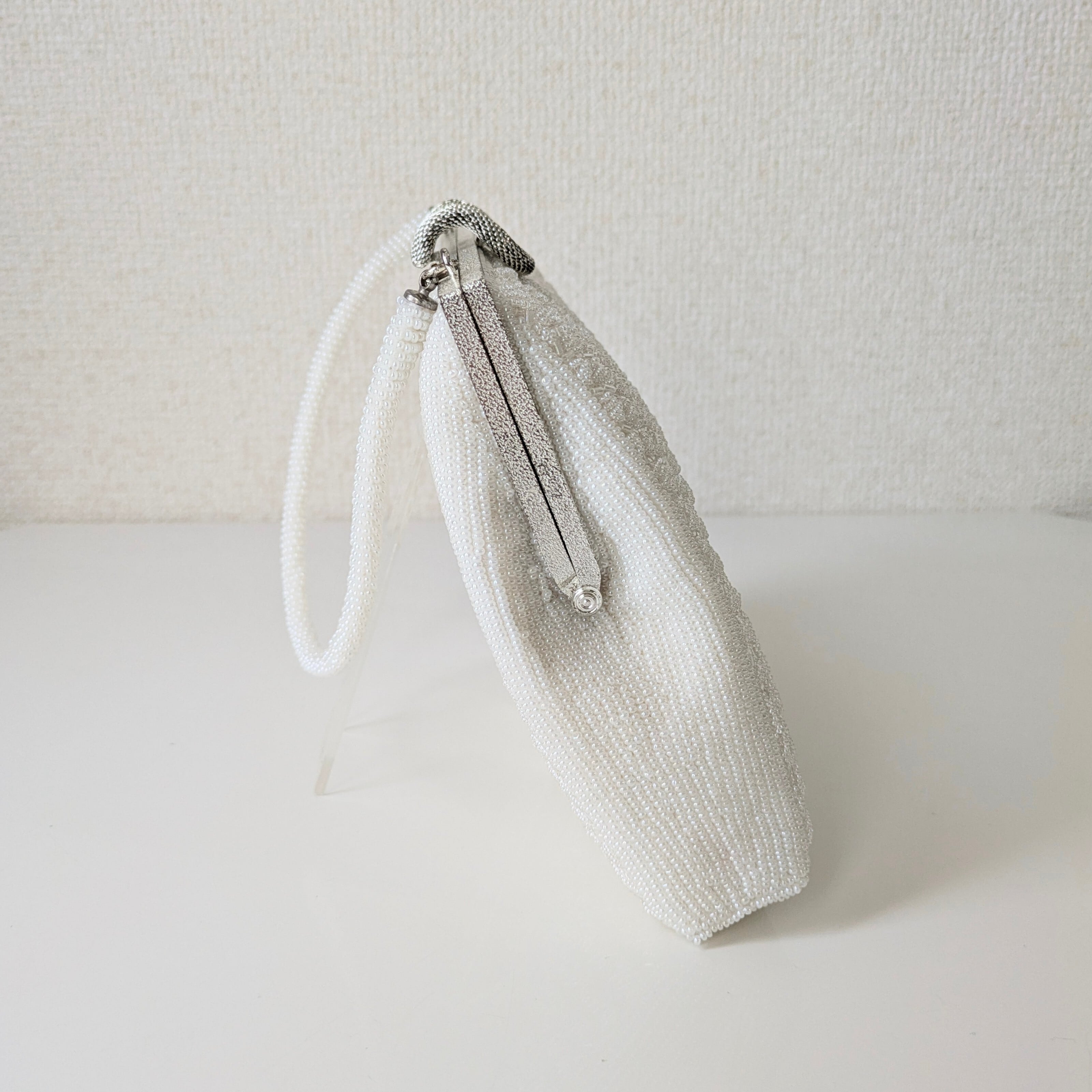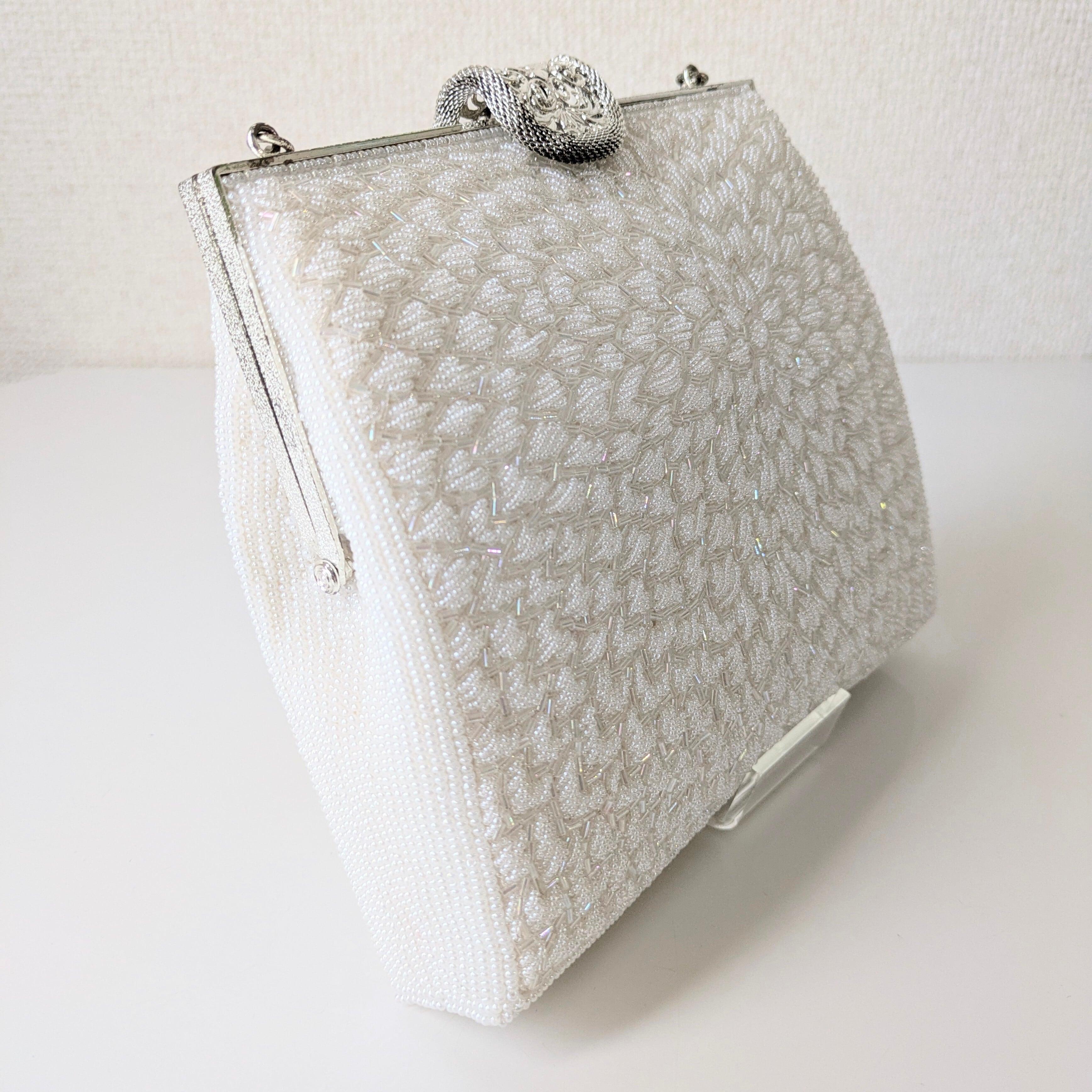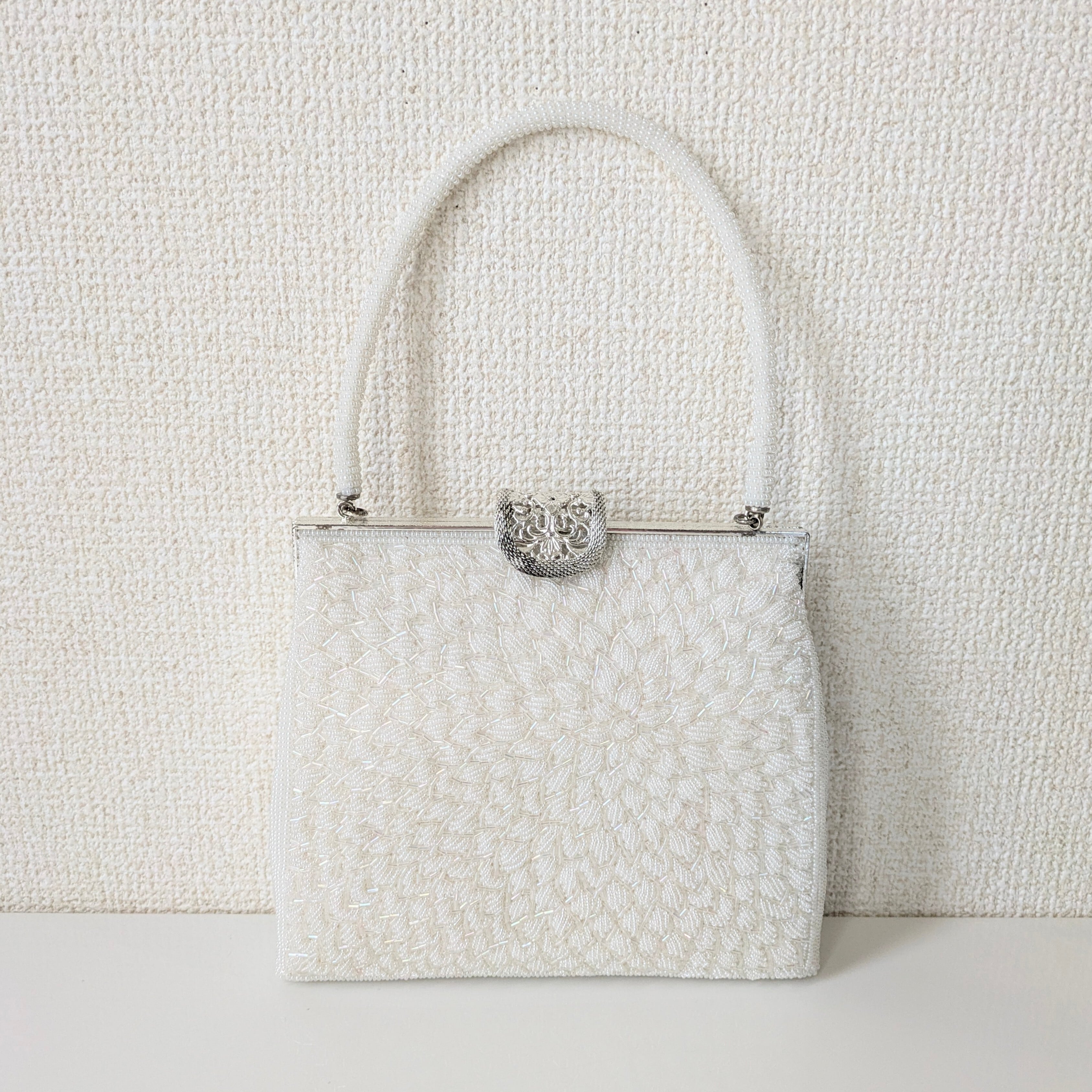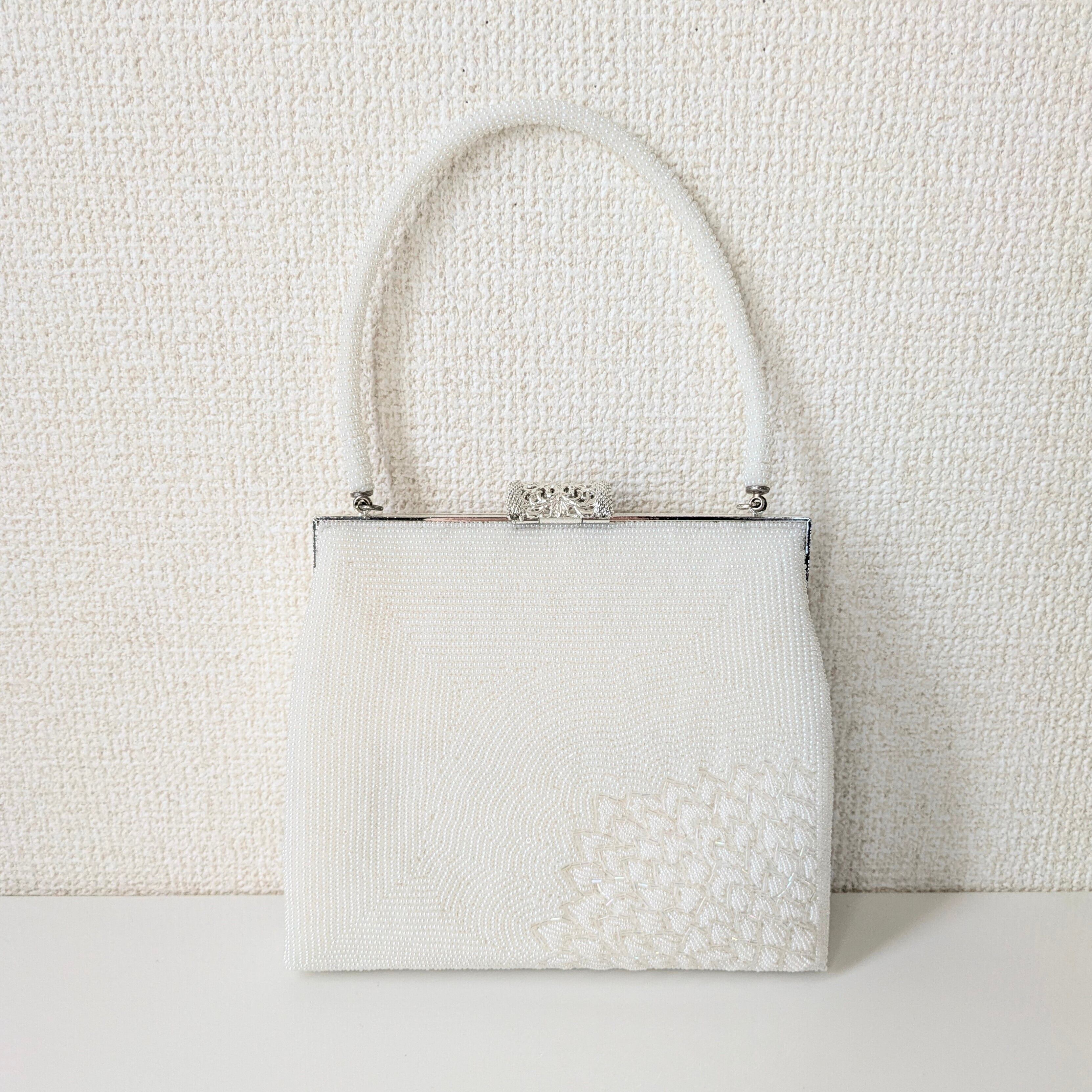 白一色の、シンプルながらも豪華な菊の花模様がバッグ全面に表現された小ぶりなサイズのビーズバッグです。