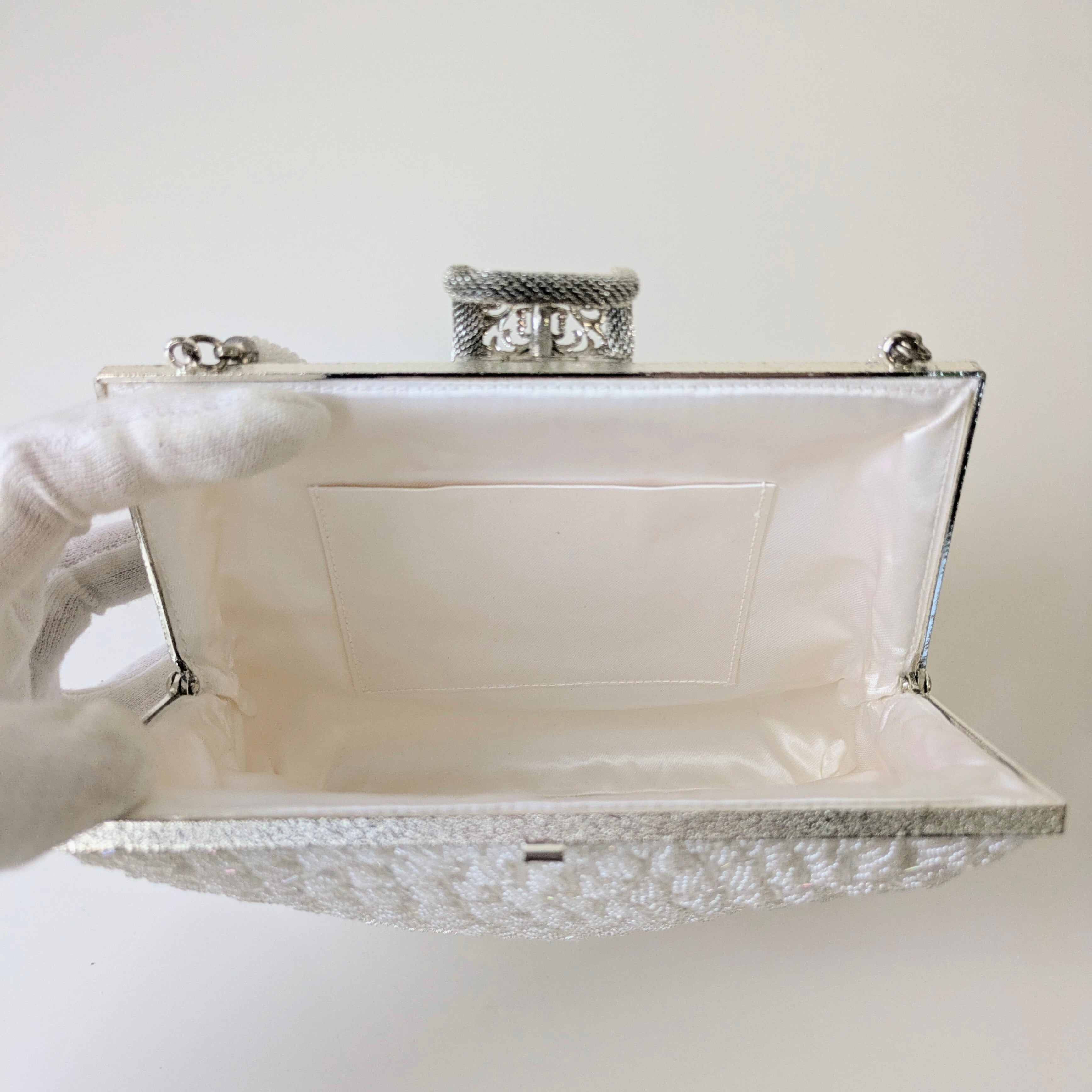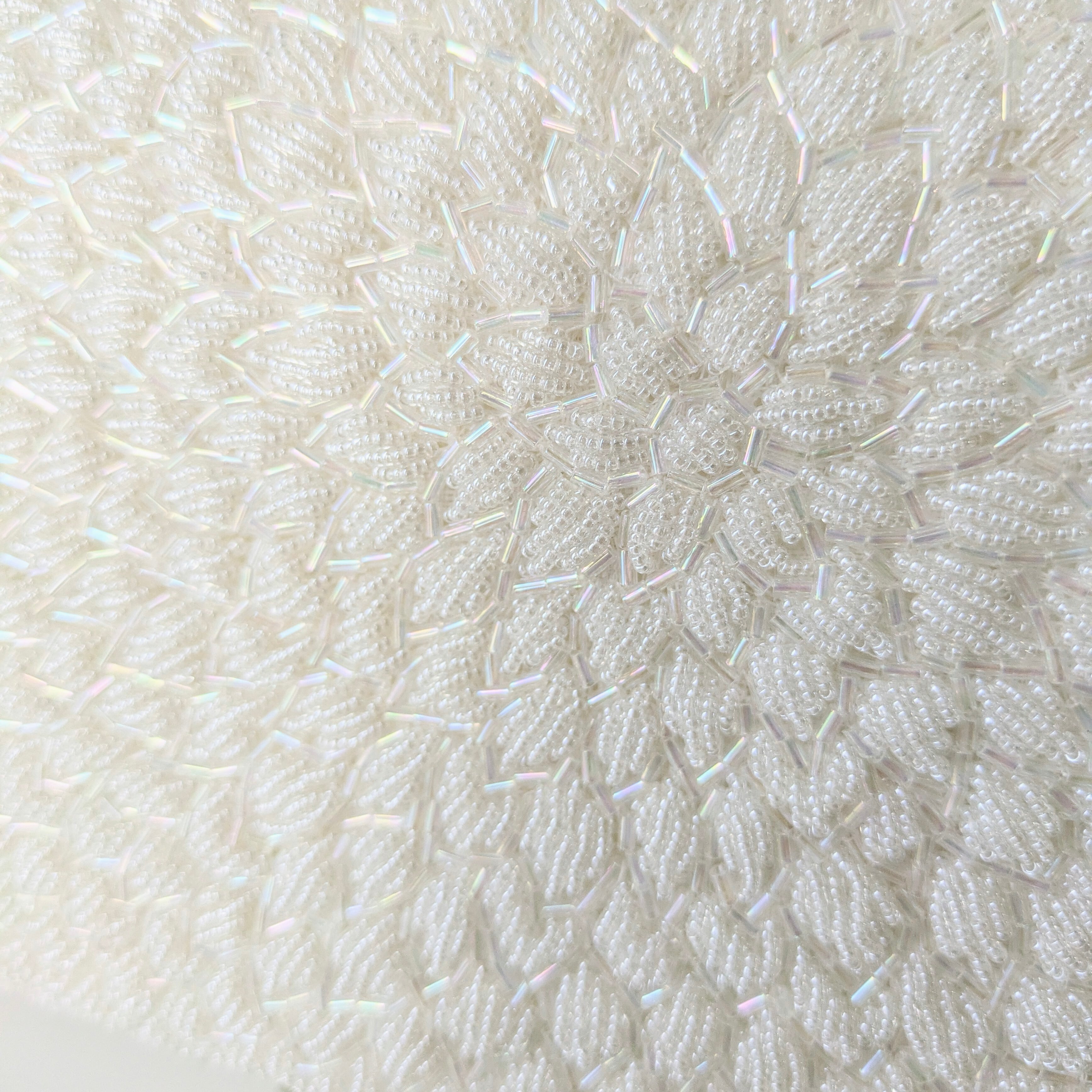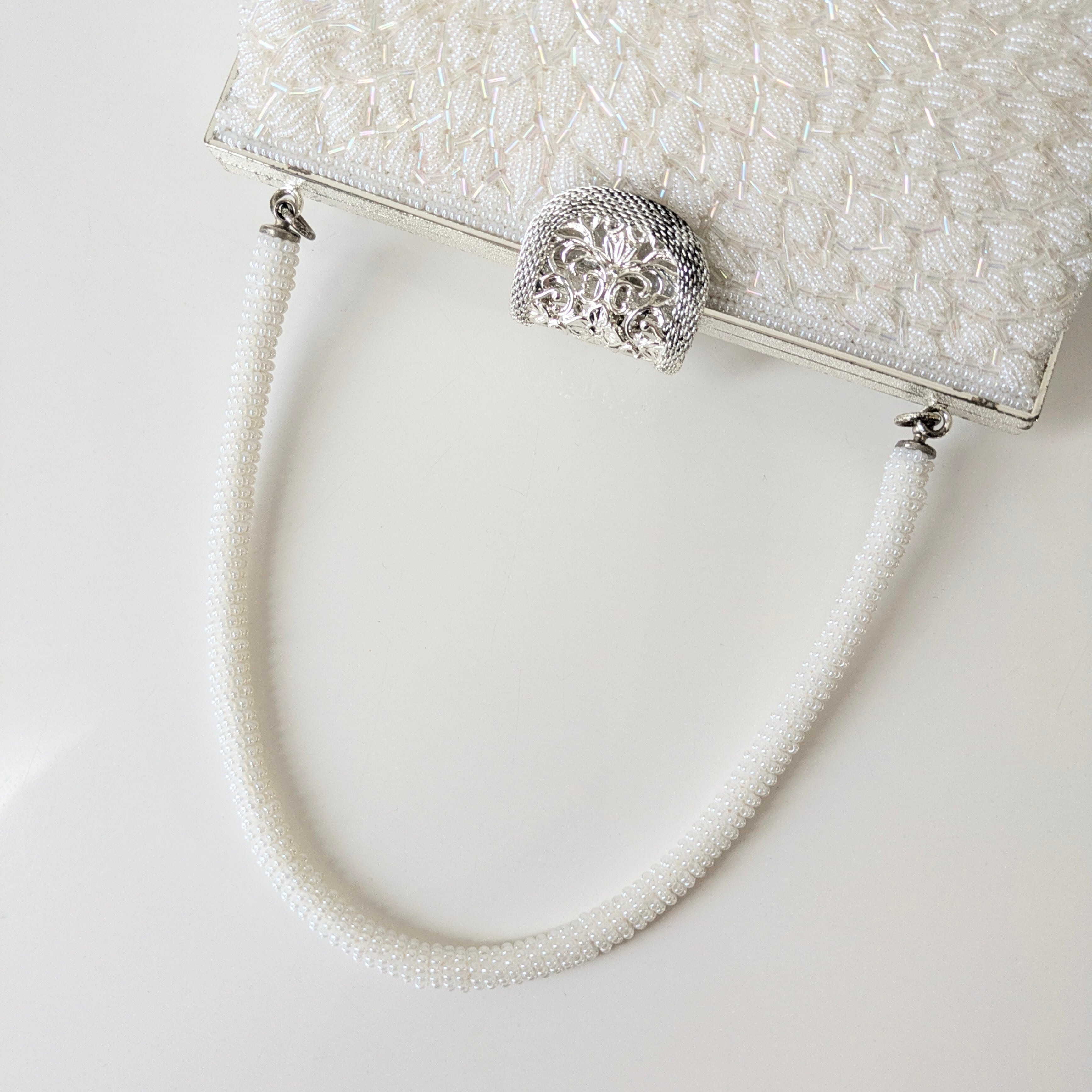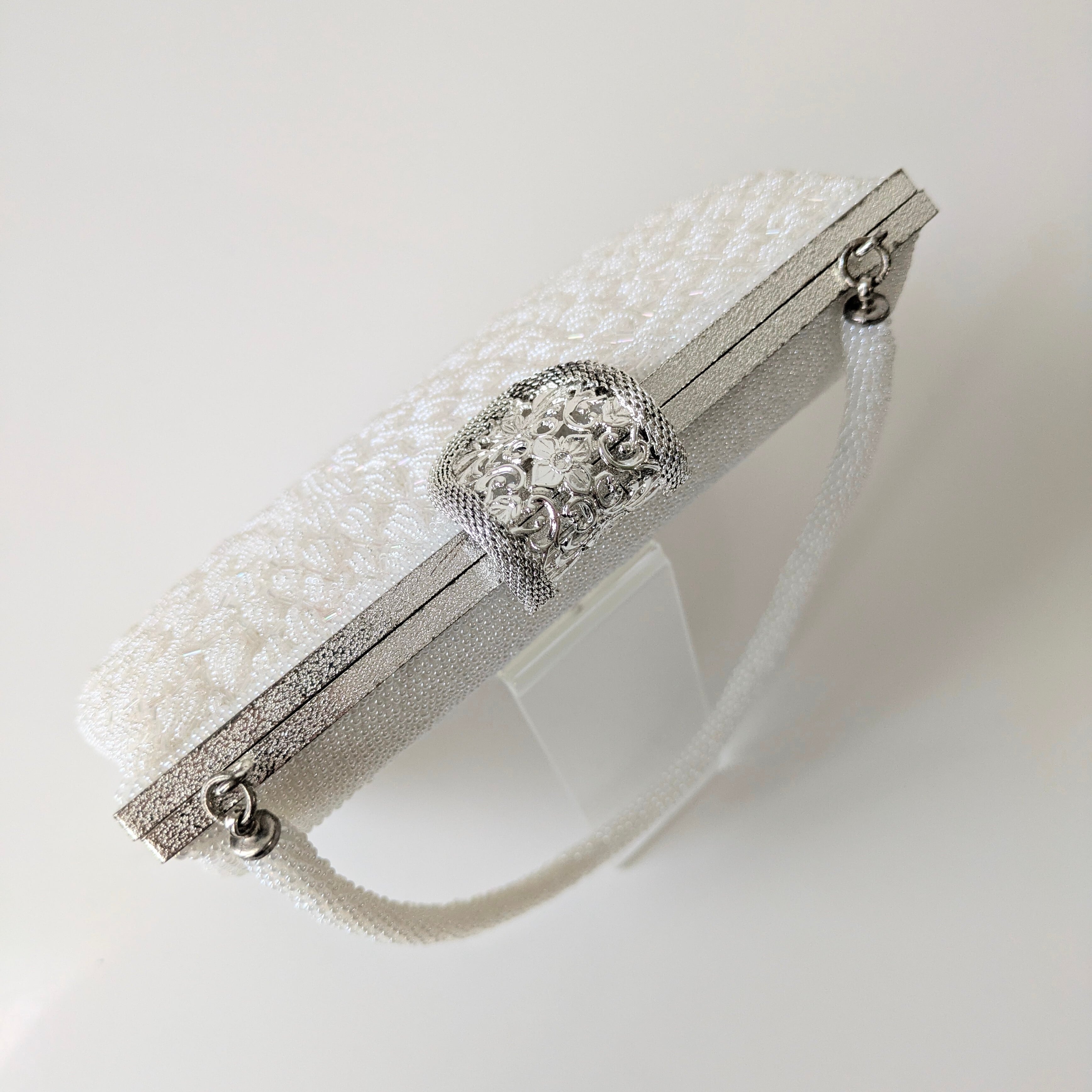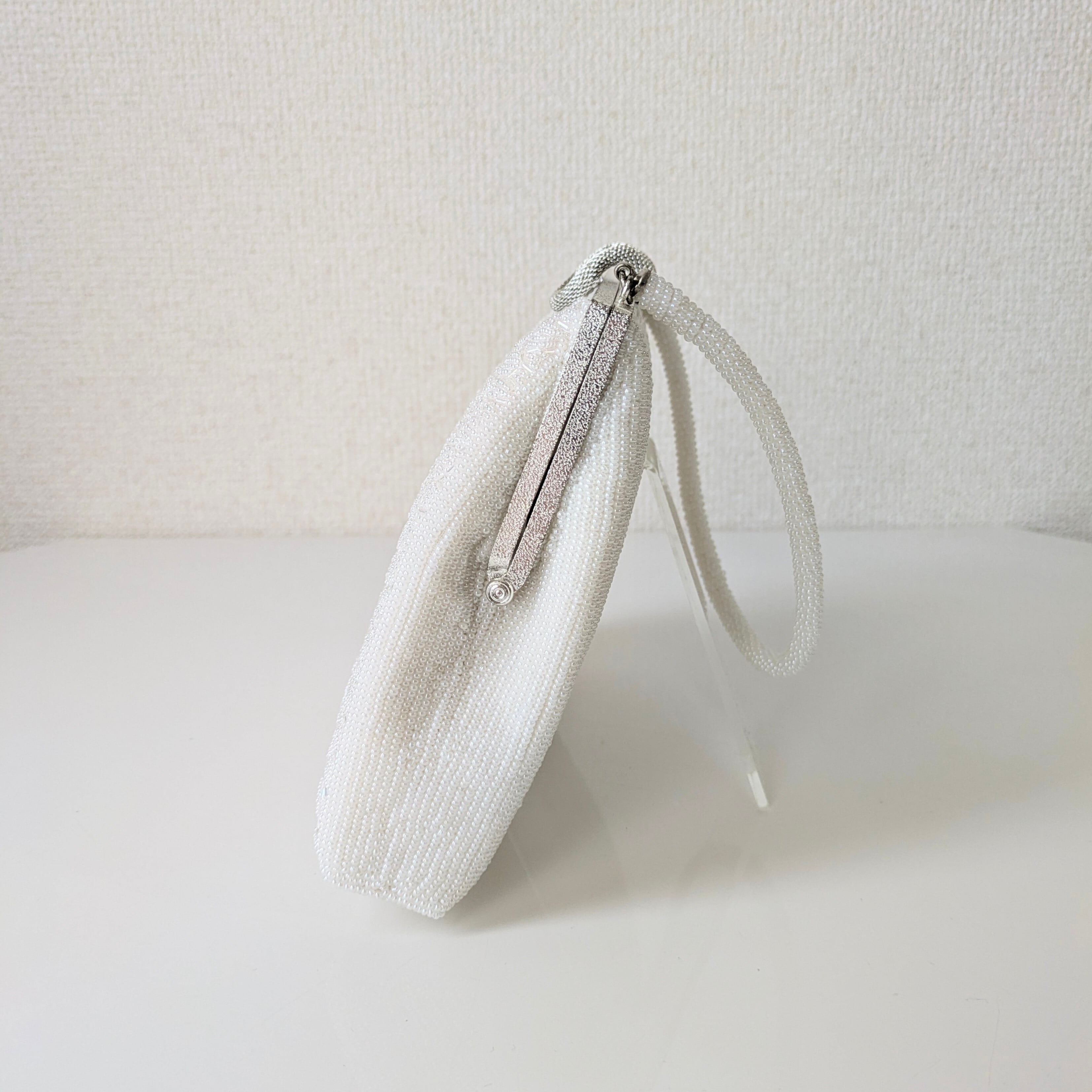 白一色の、シンプルながらも豪華な菊の花模様がバッグ全面に表現された小ぶりなサイズのビーズバッグです。