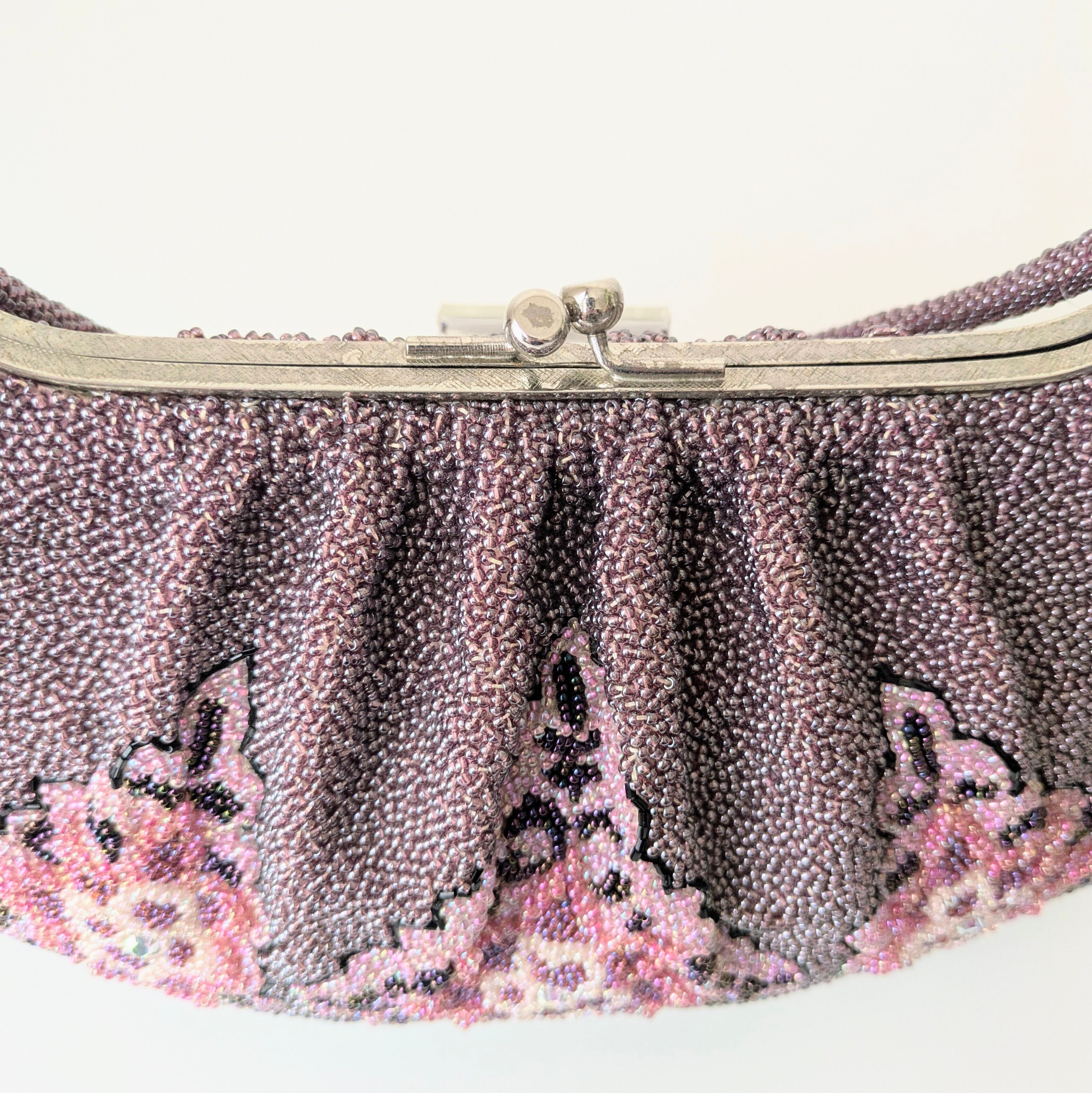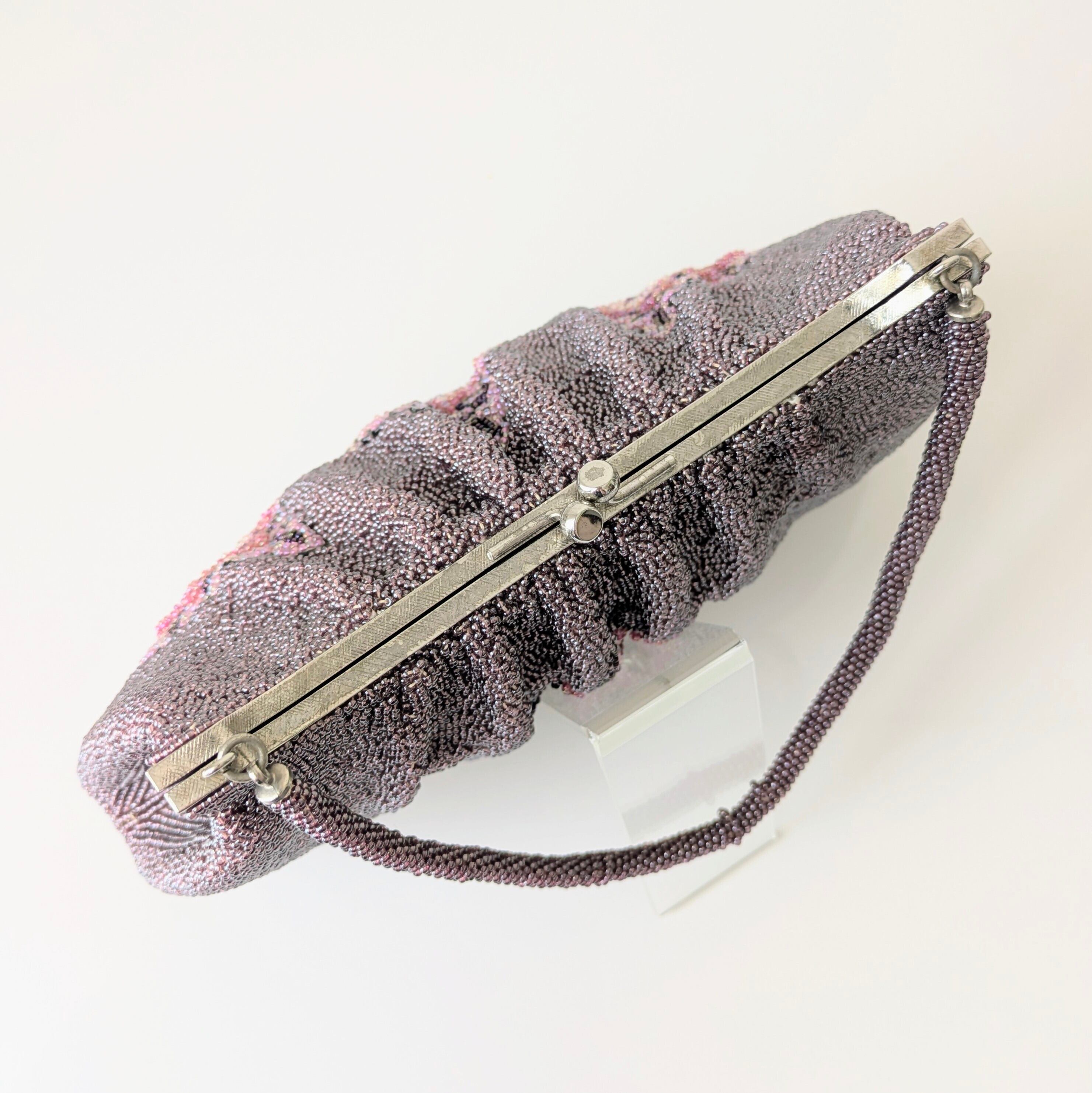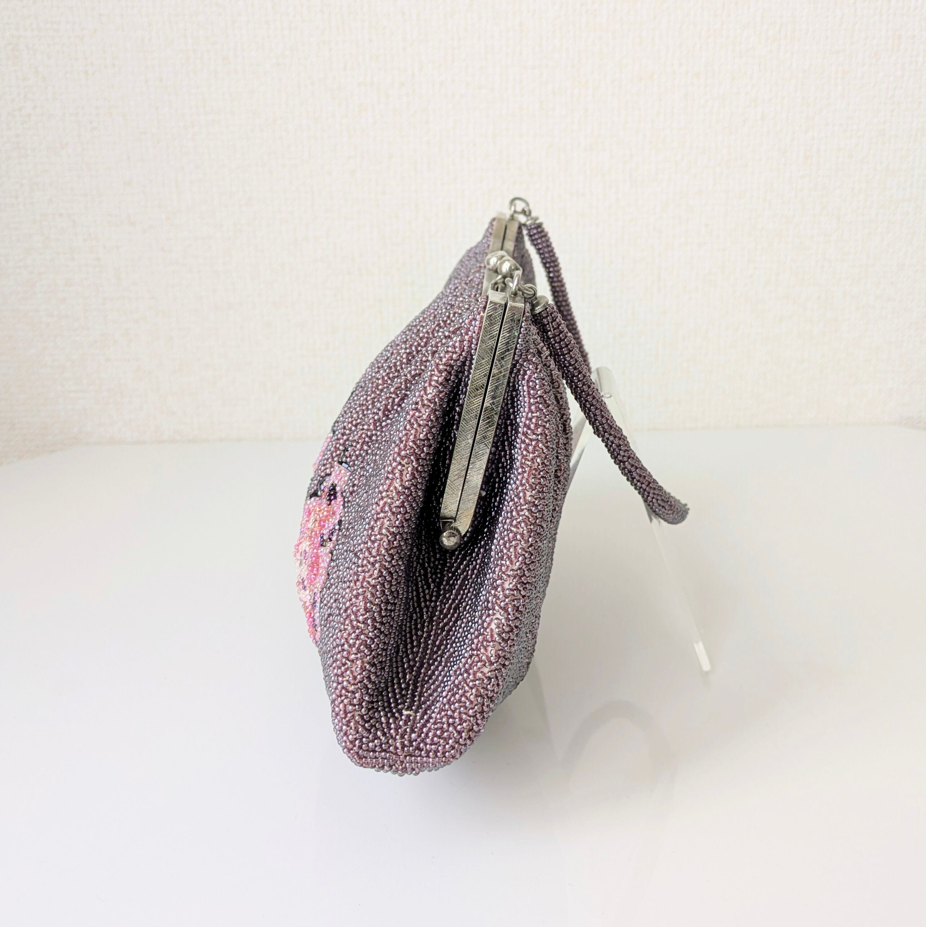 薄紫色にゴシックテイストな抽象柄が描かれたビーズバッグです。古い時代のもので持ち手に若干のビーズの緩みがありますが、使用には問題ありません。その他は特筆すべきダメージはなく、状態は良好です。