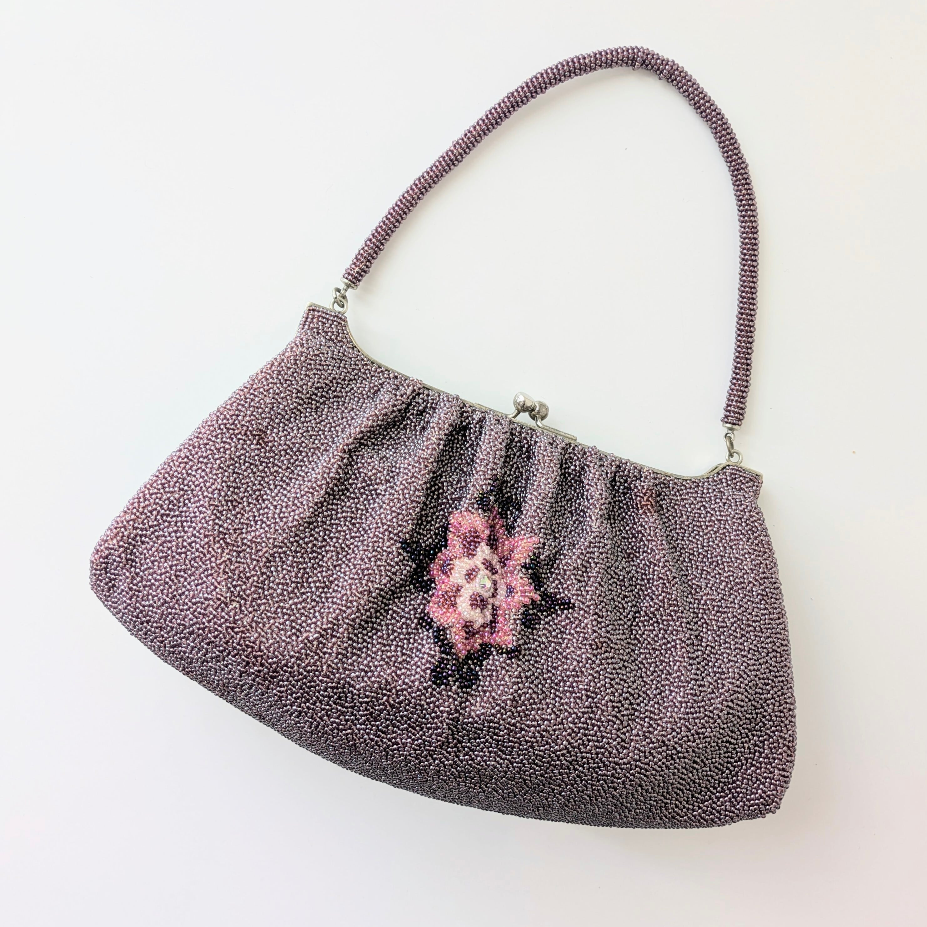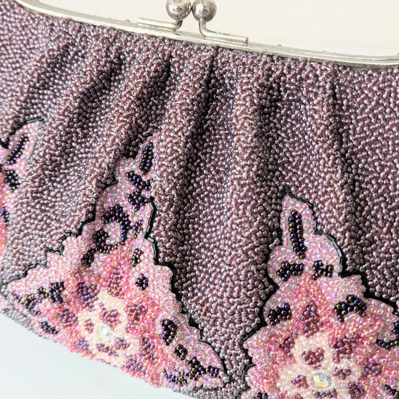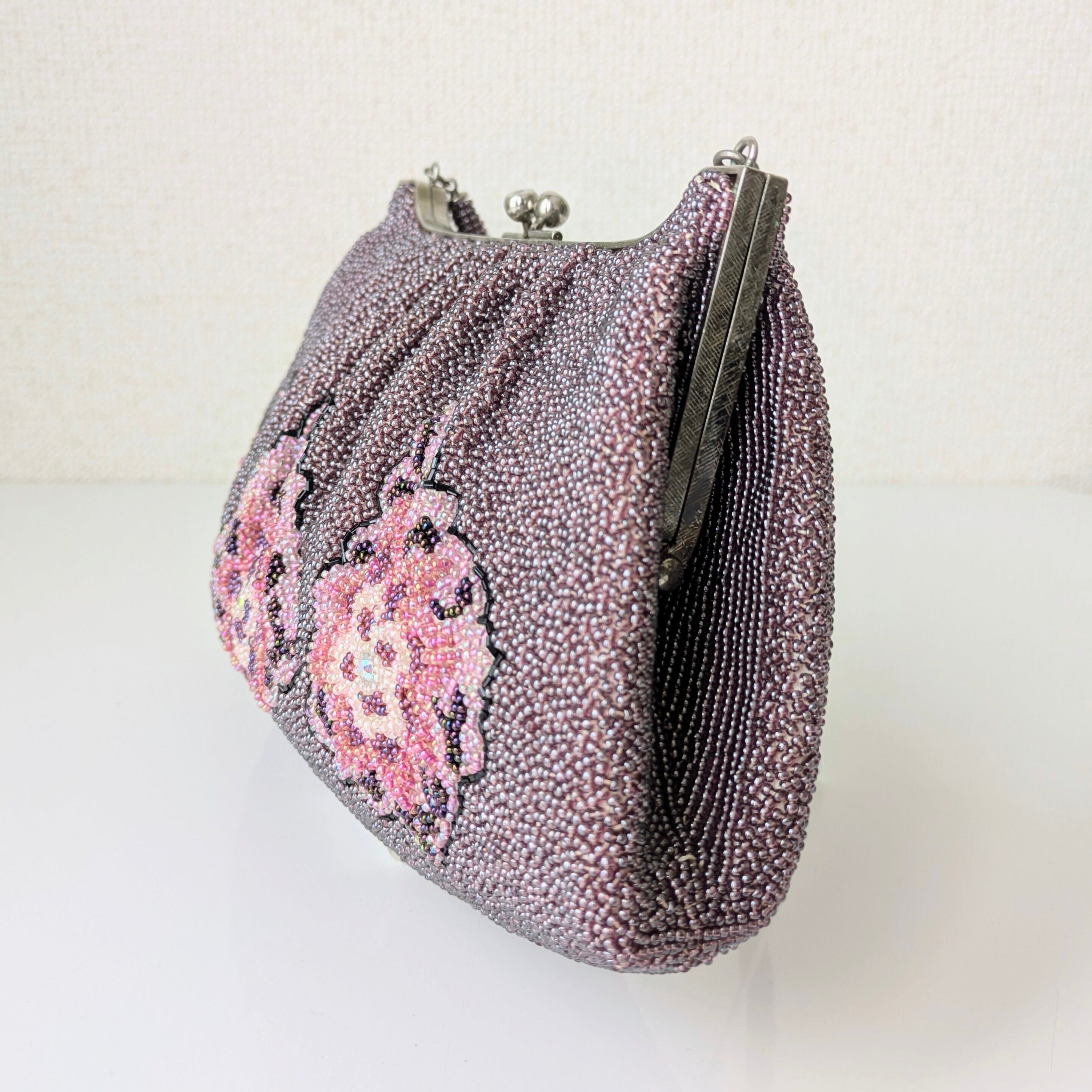 光を受けて美しく輝くヴィンテージビーズバッグ。