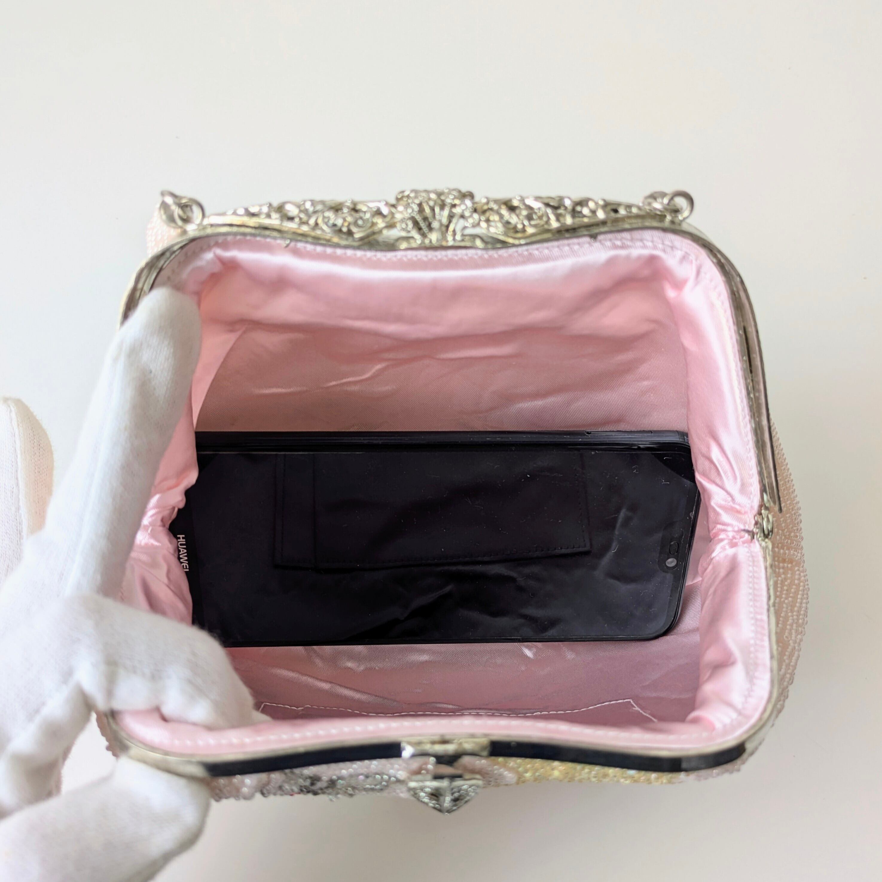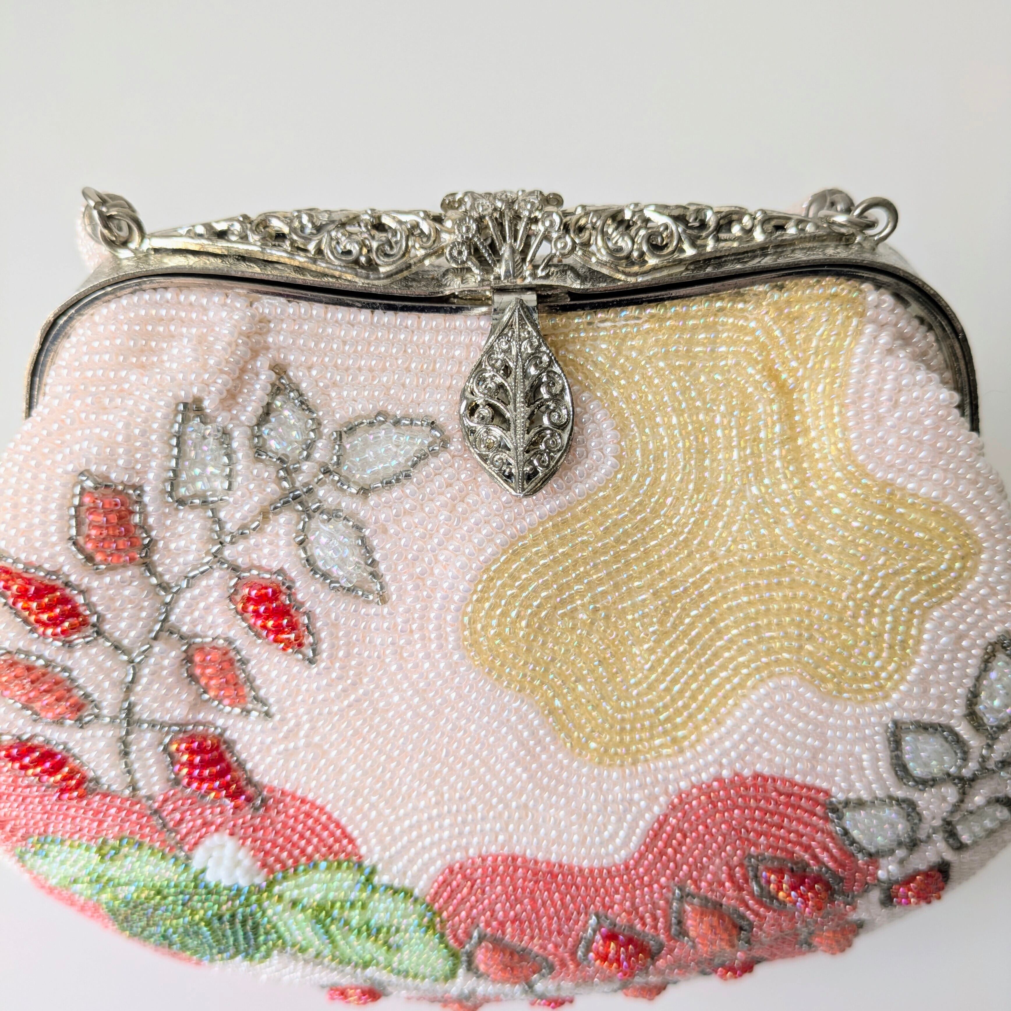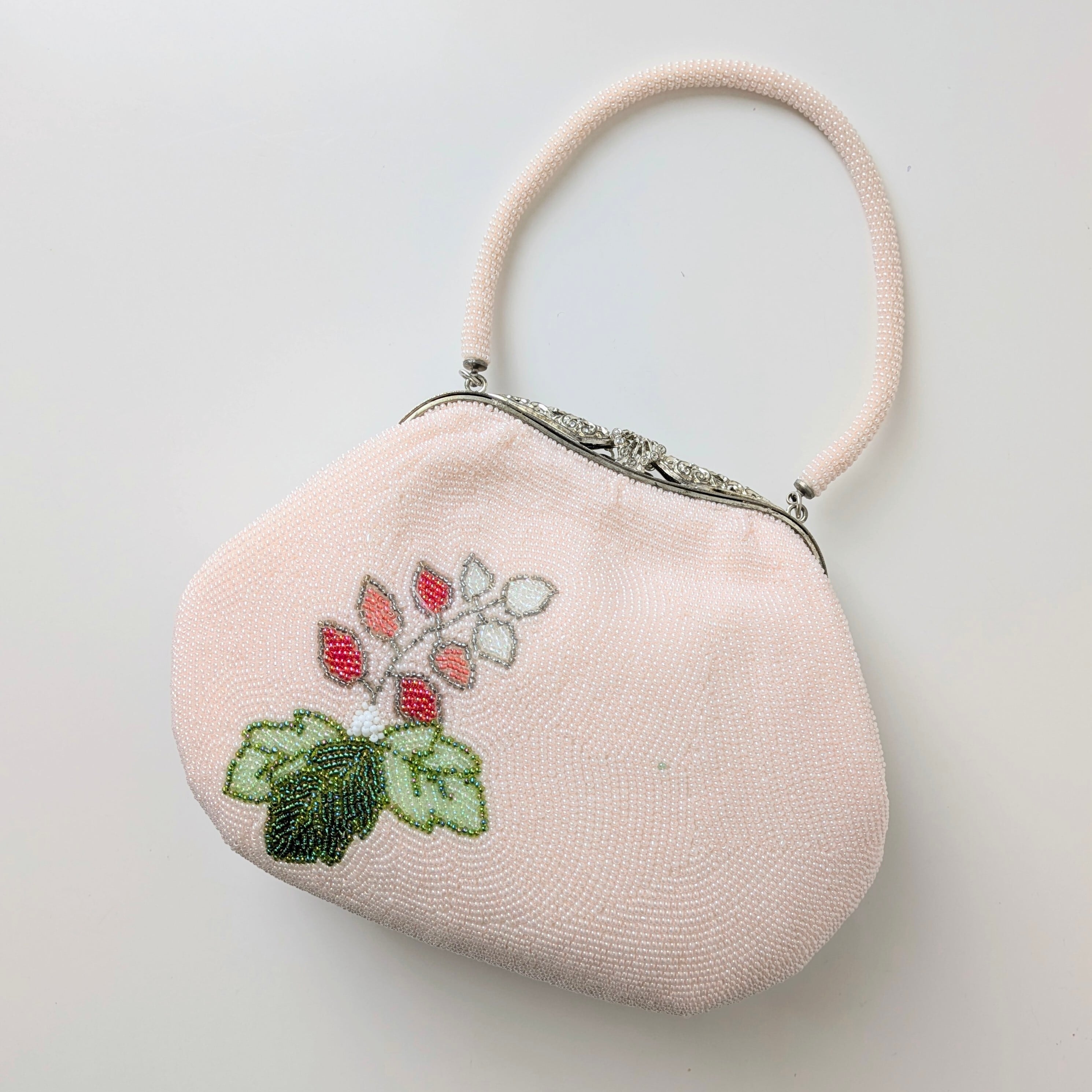 光を受けて美しく輝くヴィンテージビーズバッグ。