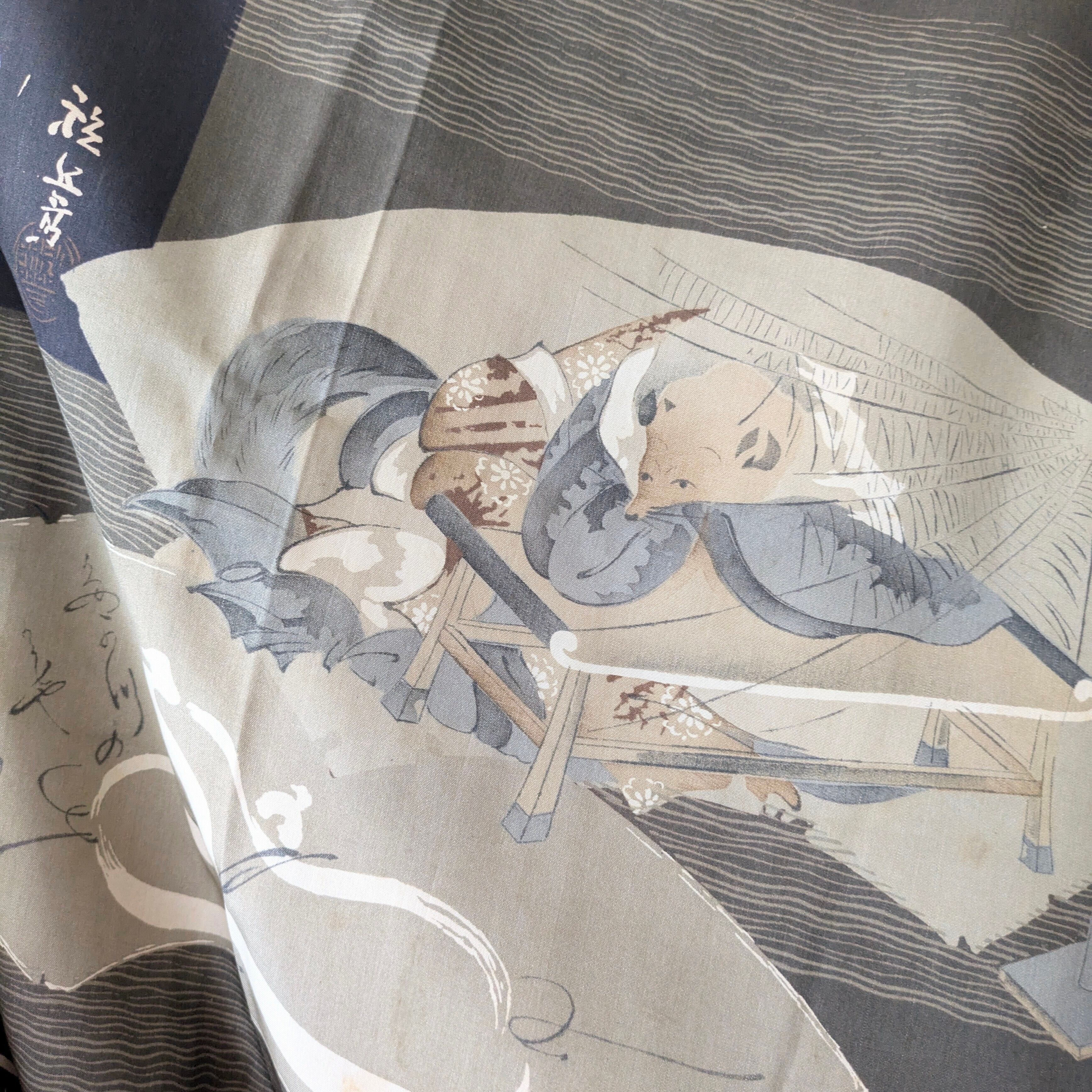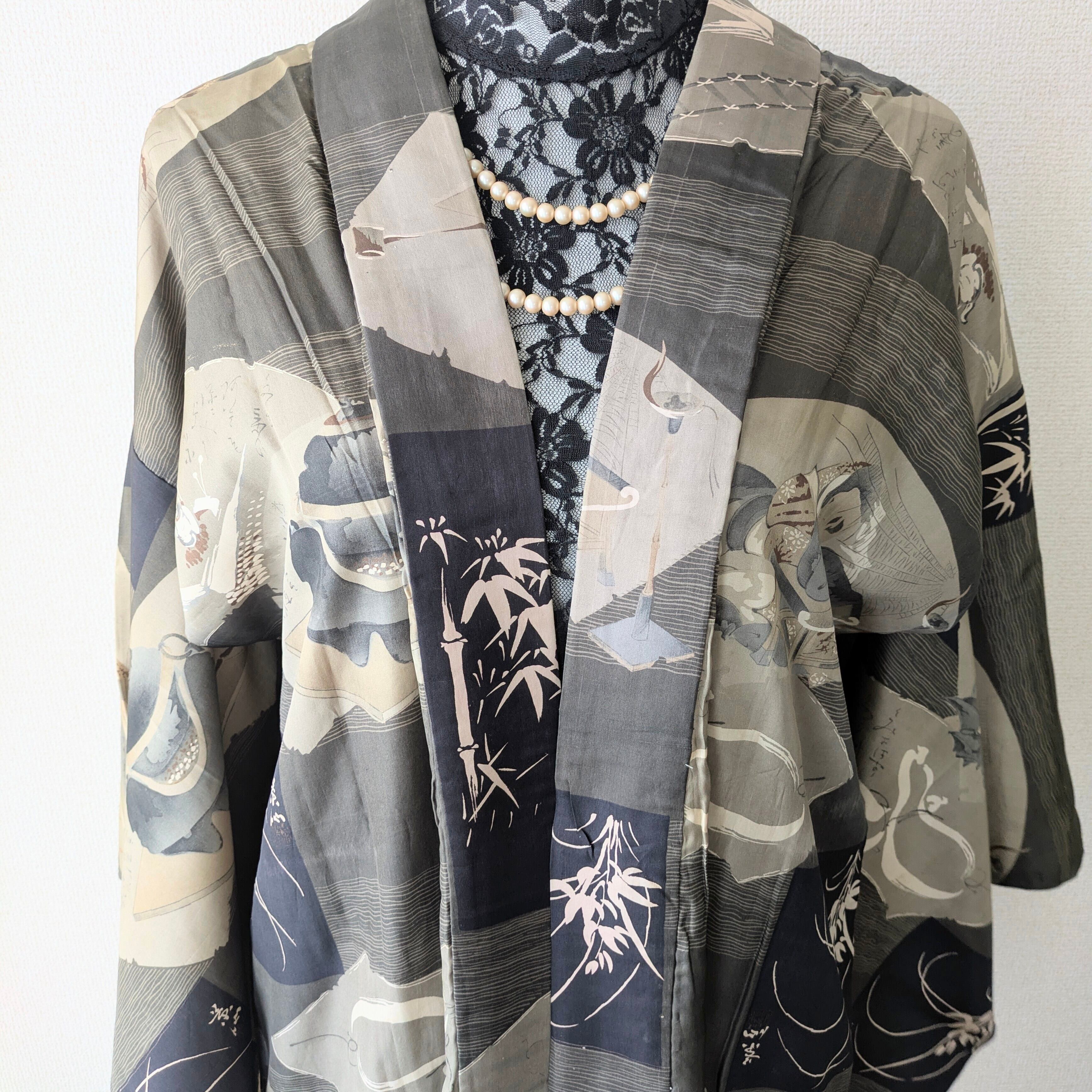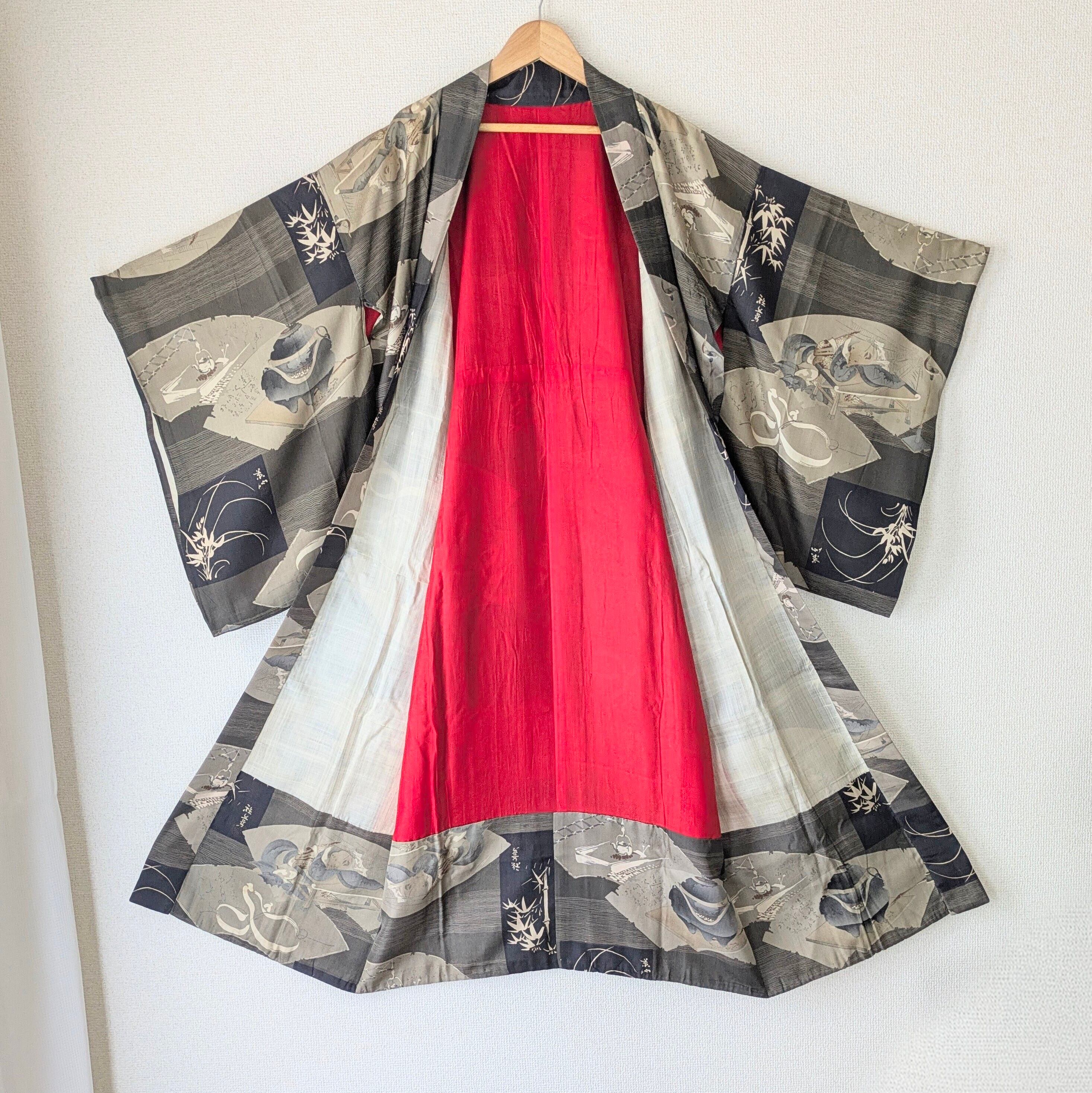 【Vintage】HAORI 長羽織 羽織 正絹 分福茶釜柄 昔話 大正浪漫 古布 時代布 和洋折衷