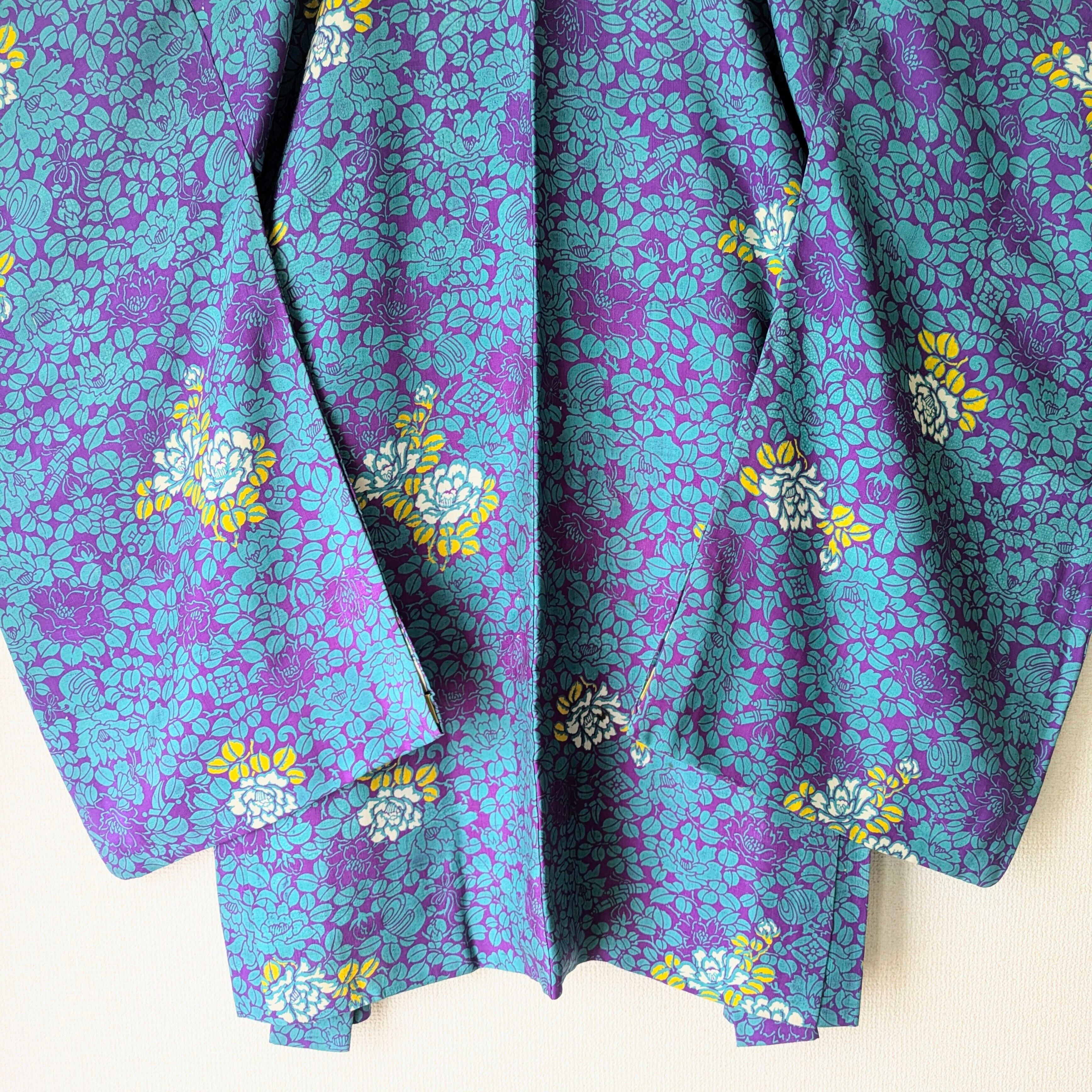 紫地に緑の椿柄が羽織一面に描かれた型染の長羽織。黄色のアクセントが効いています。
