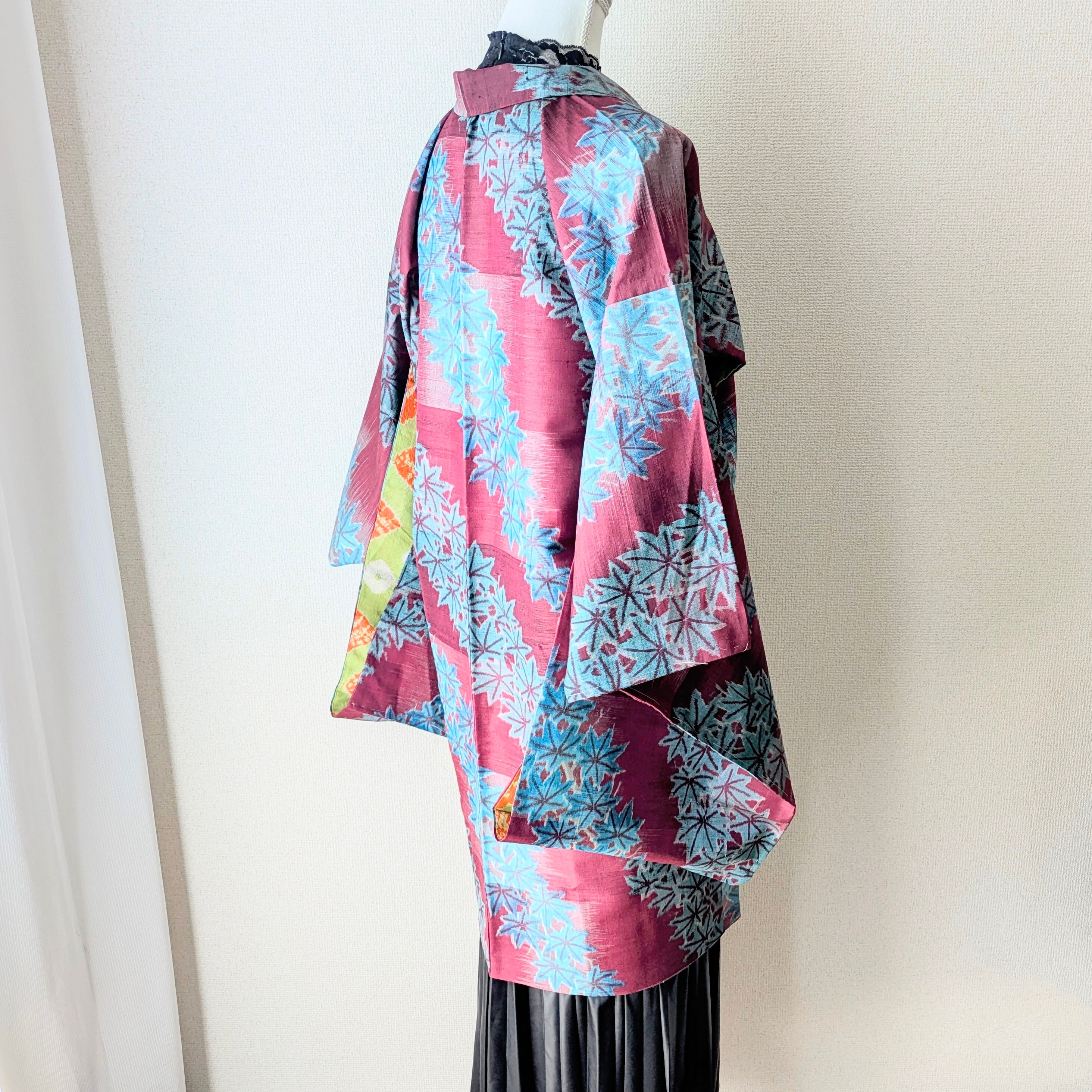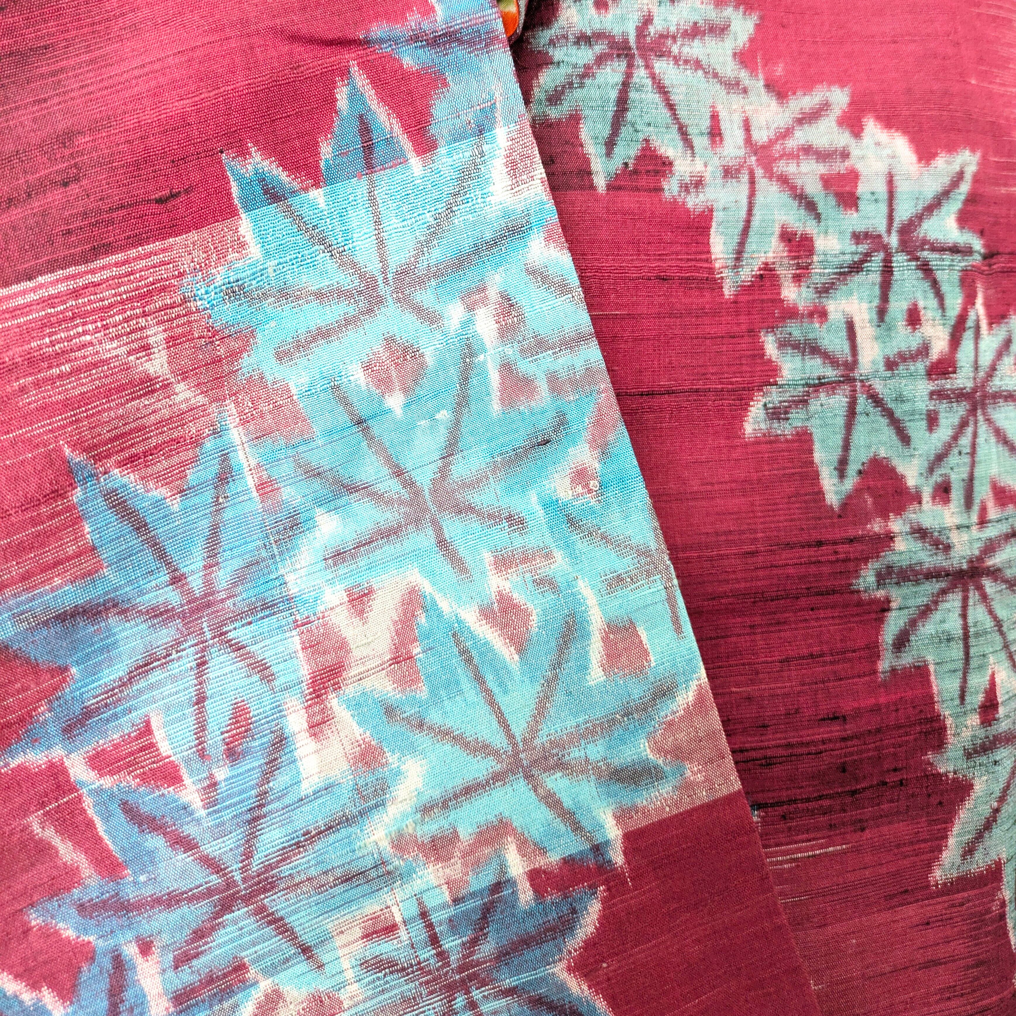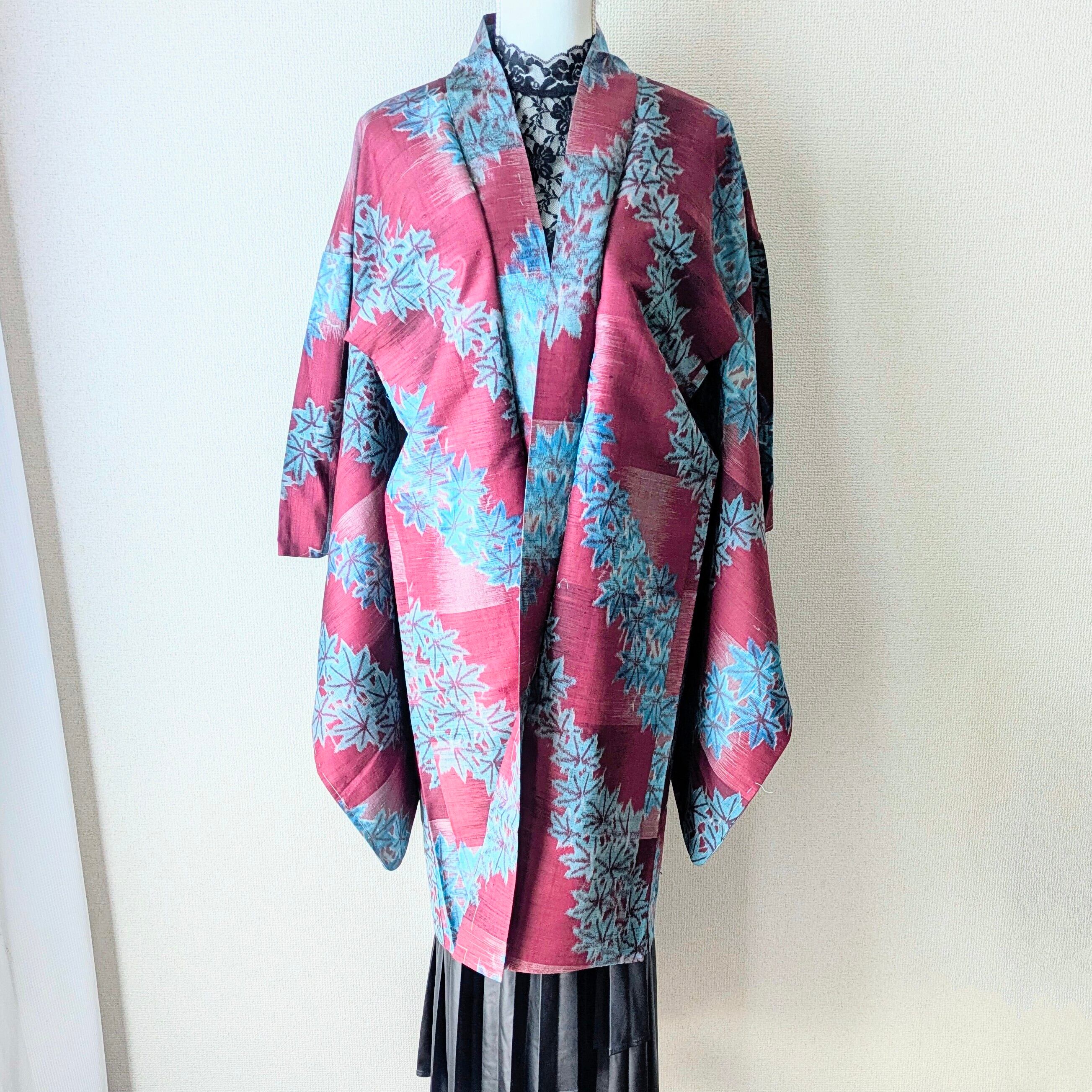 美しい光沢の銘仙の長羽織です。落ち着いた絣の赤色に、青のグラデーションの楓柄がリズミカルに描かれています。仕付け糸付きで目立つようなダメージもなく状態の大変良好な逸品です。