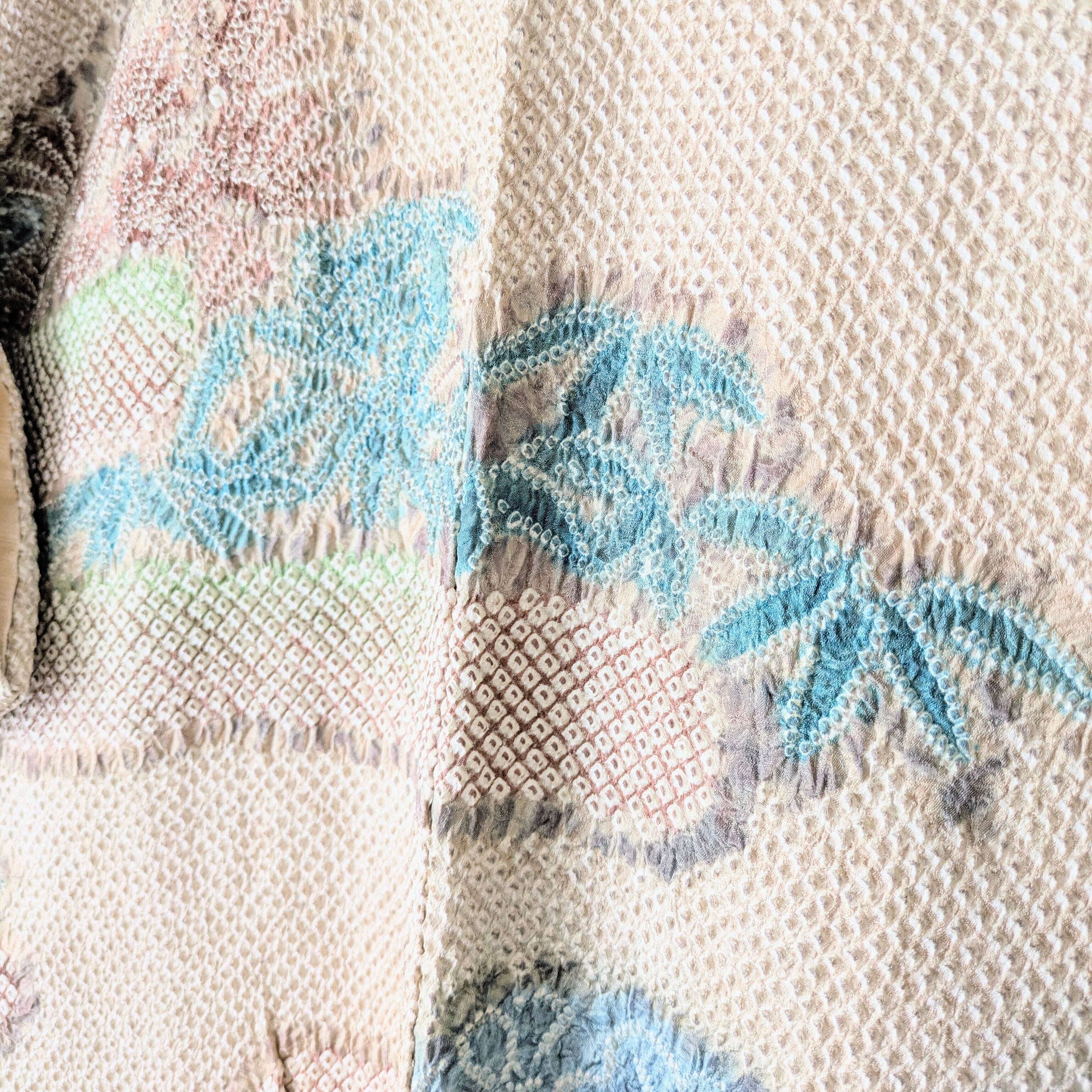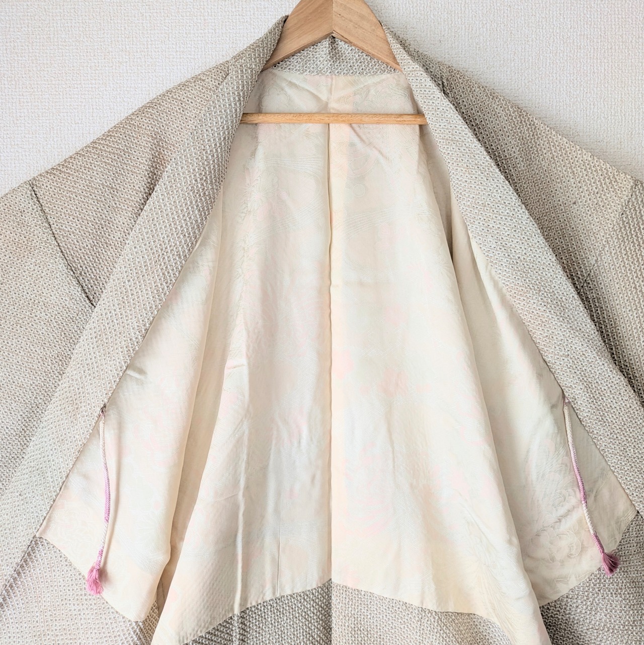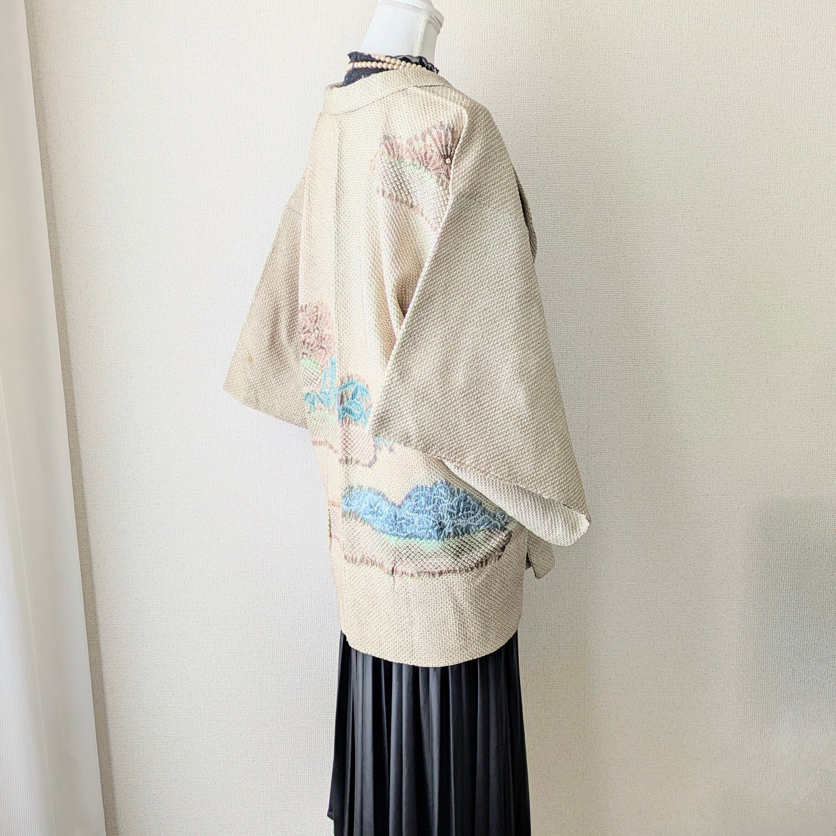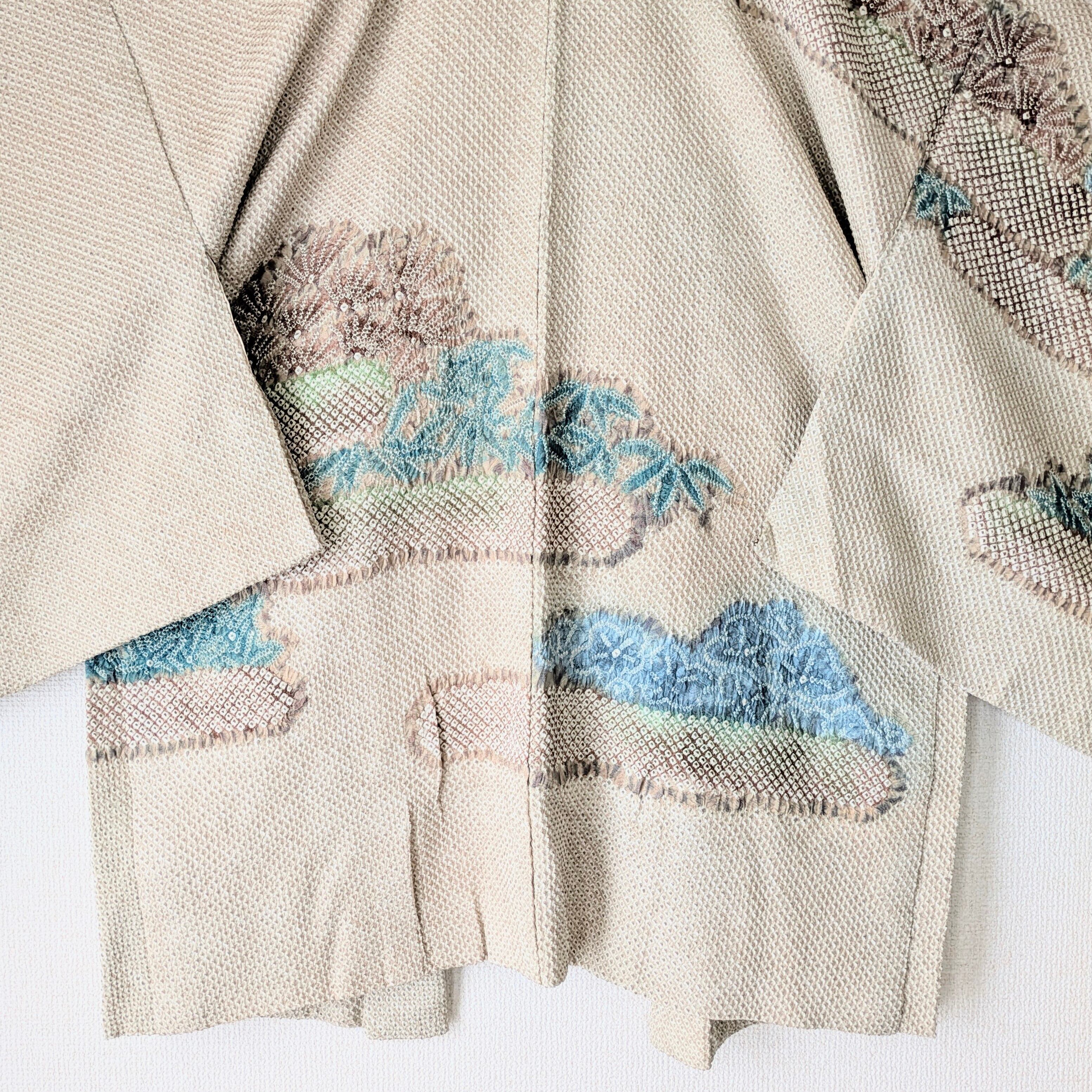 菊や笹などの草花が描かれた、ベージュの総絞りの羽織です。絞りの状態も良く、ワッフル生地のようなふんわりとした手触りです。袖の一部にシミがありますが、その他には目立つようなダメージのない良好なコンディションです。