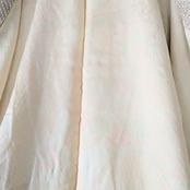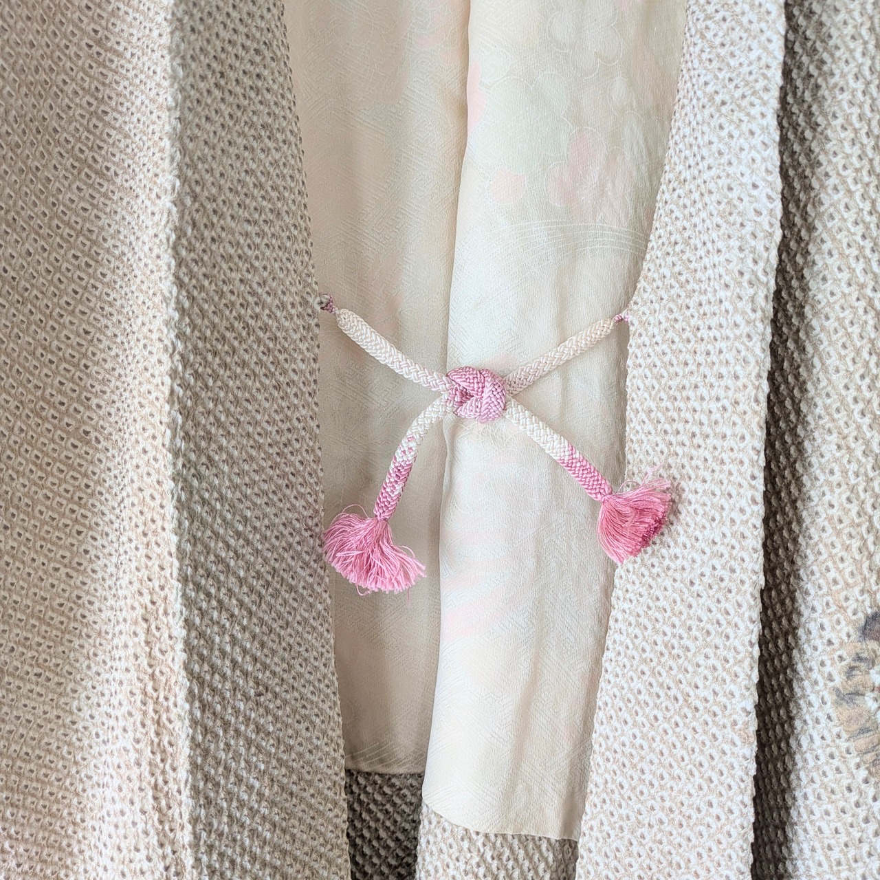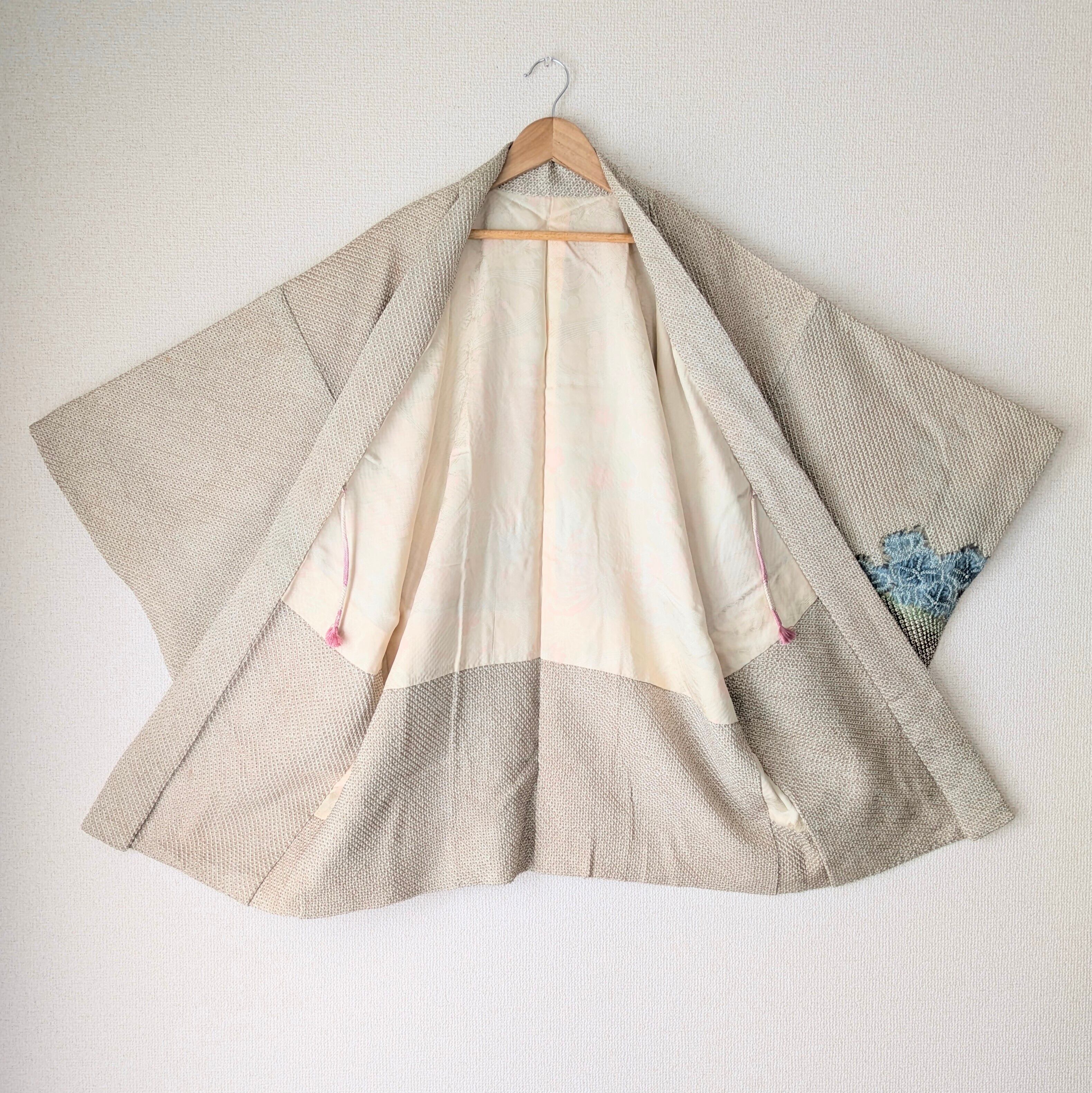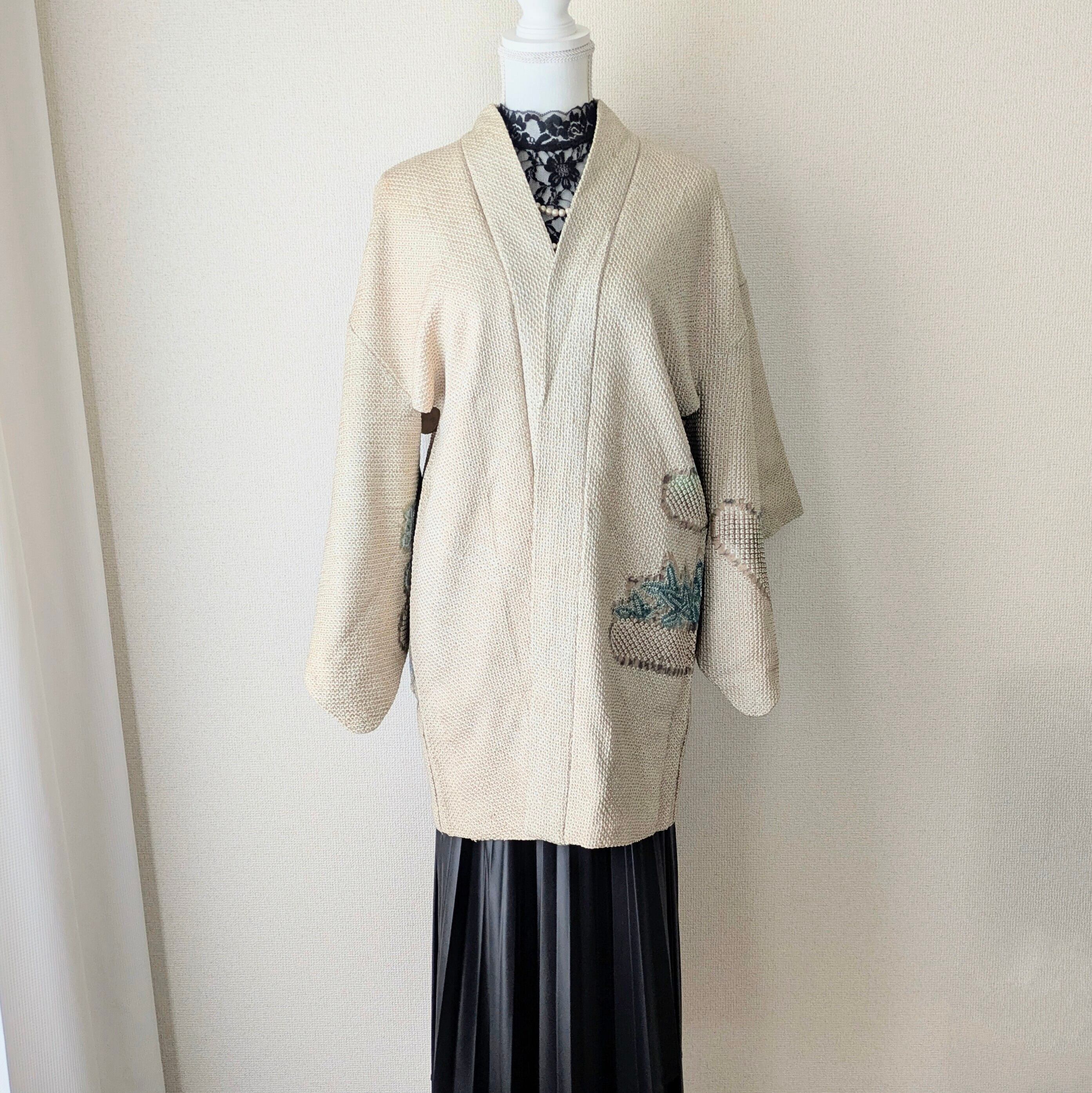 菊や笹などの草花が描かれた、ベージュの総絞りの羽織です。絞りの状態も良く、ワッフル生地のようなふんわりとした手触りです。袖の一部にシミがありますが、その他には目立つようなダメージのない良好なコンディションです。