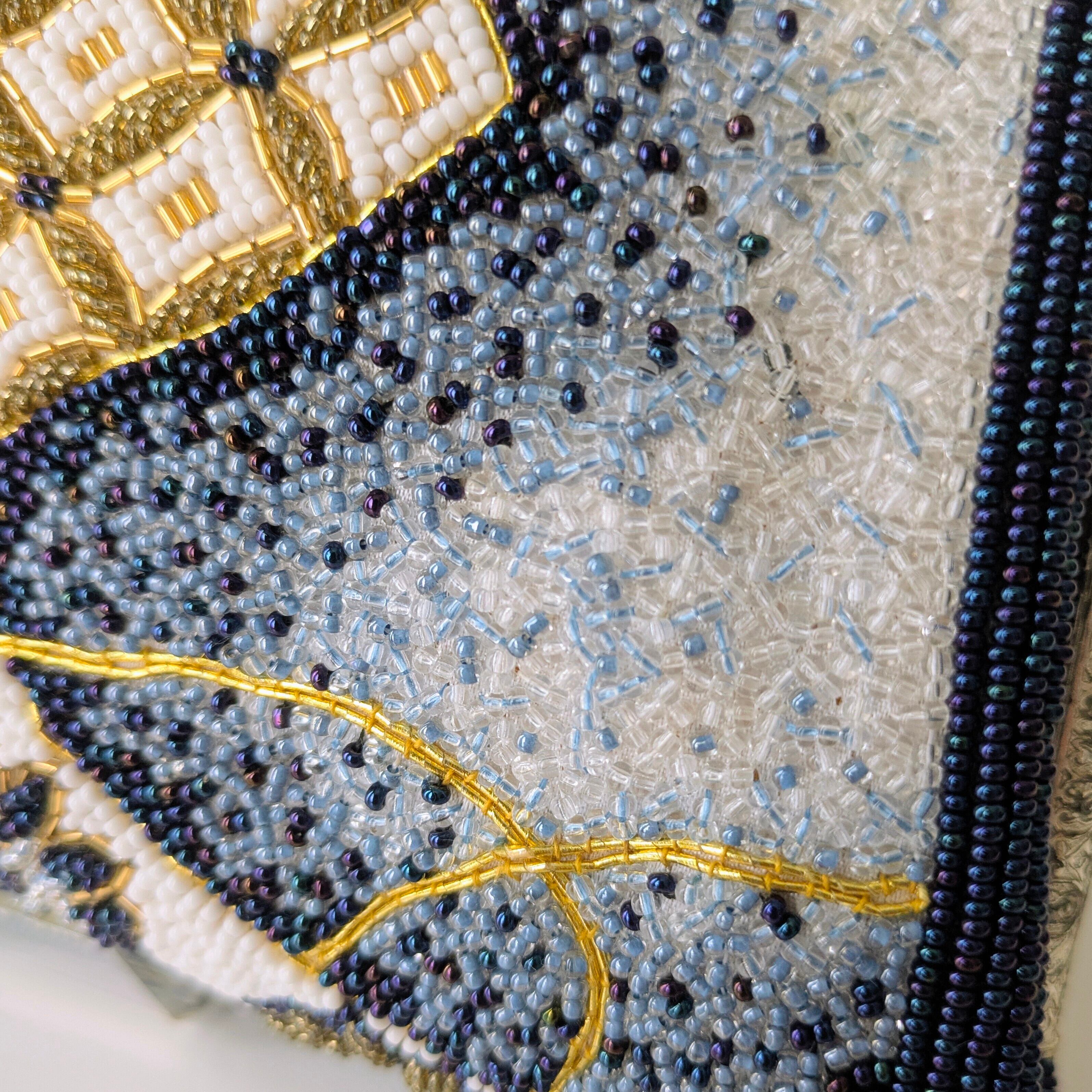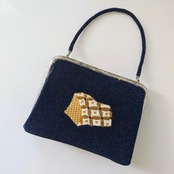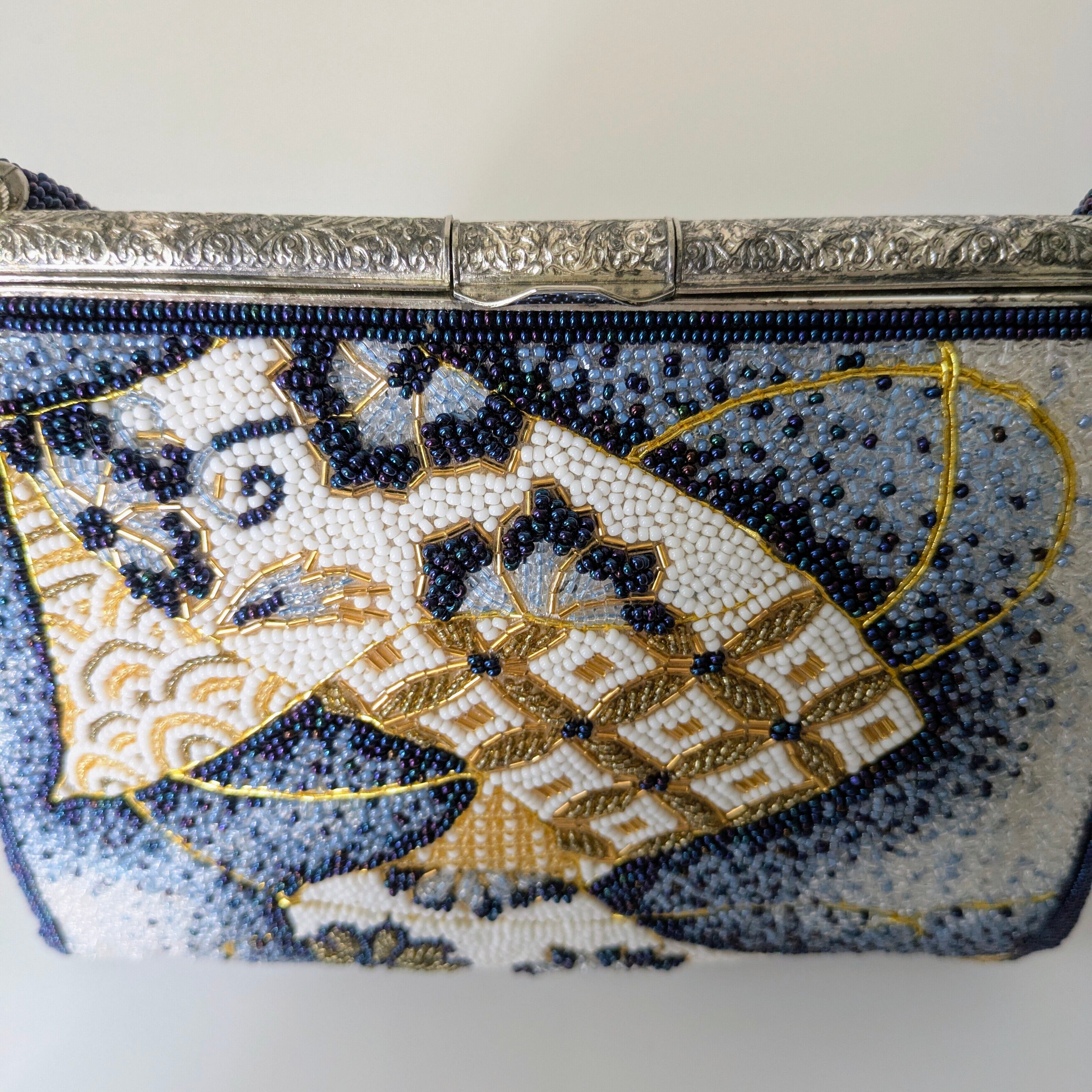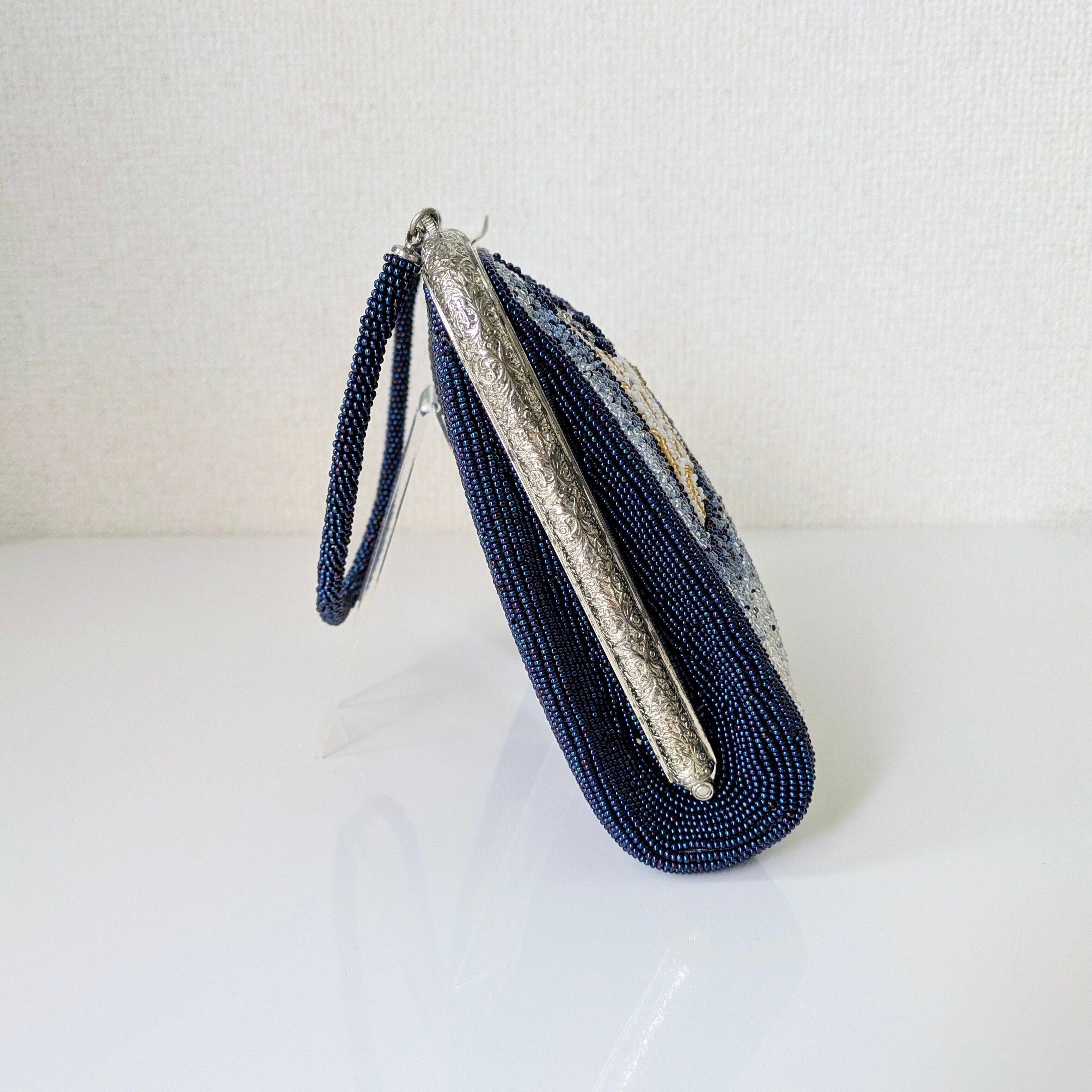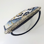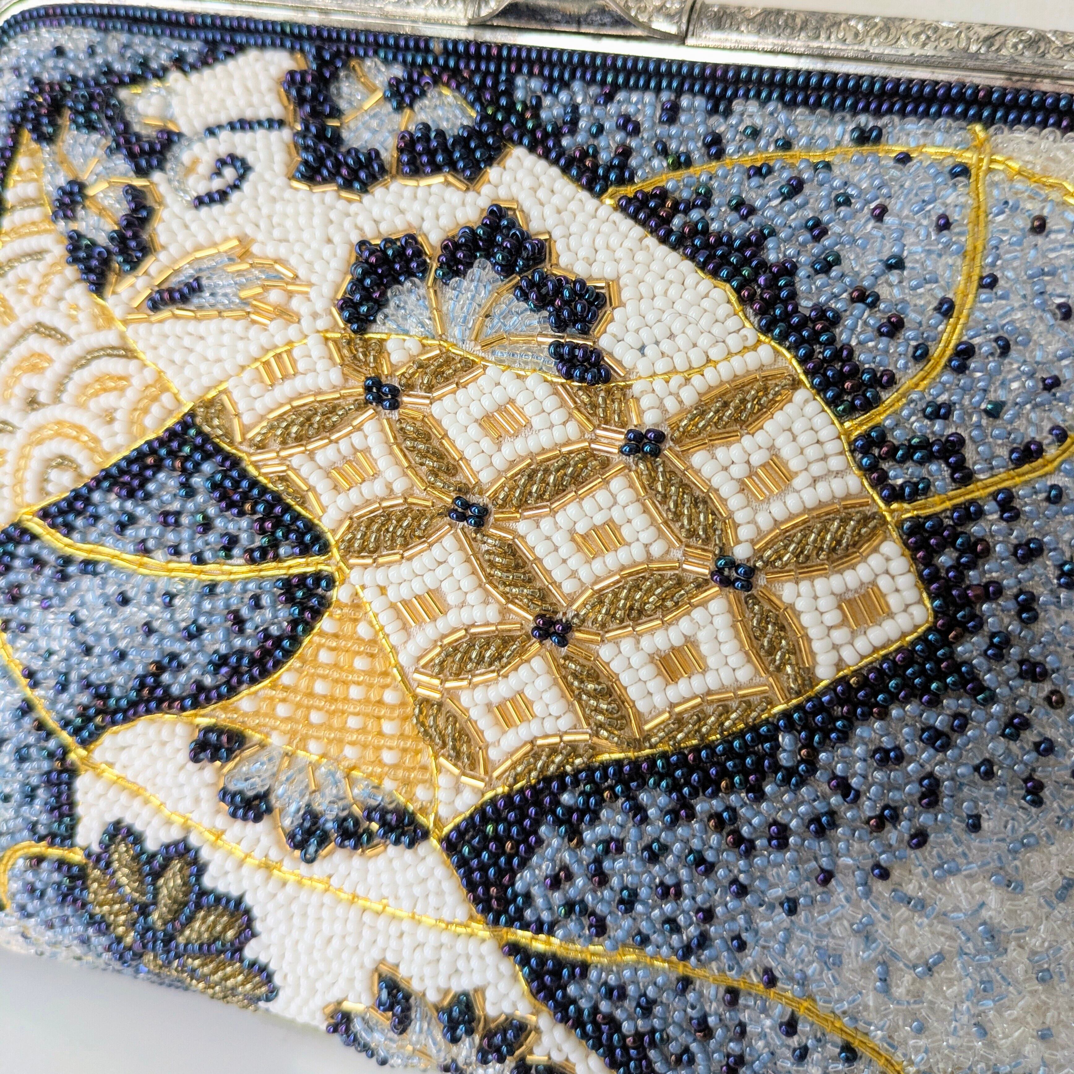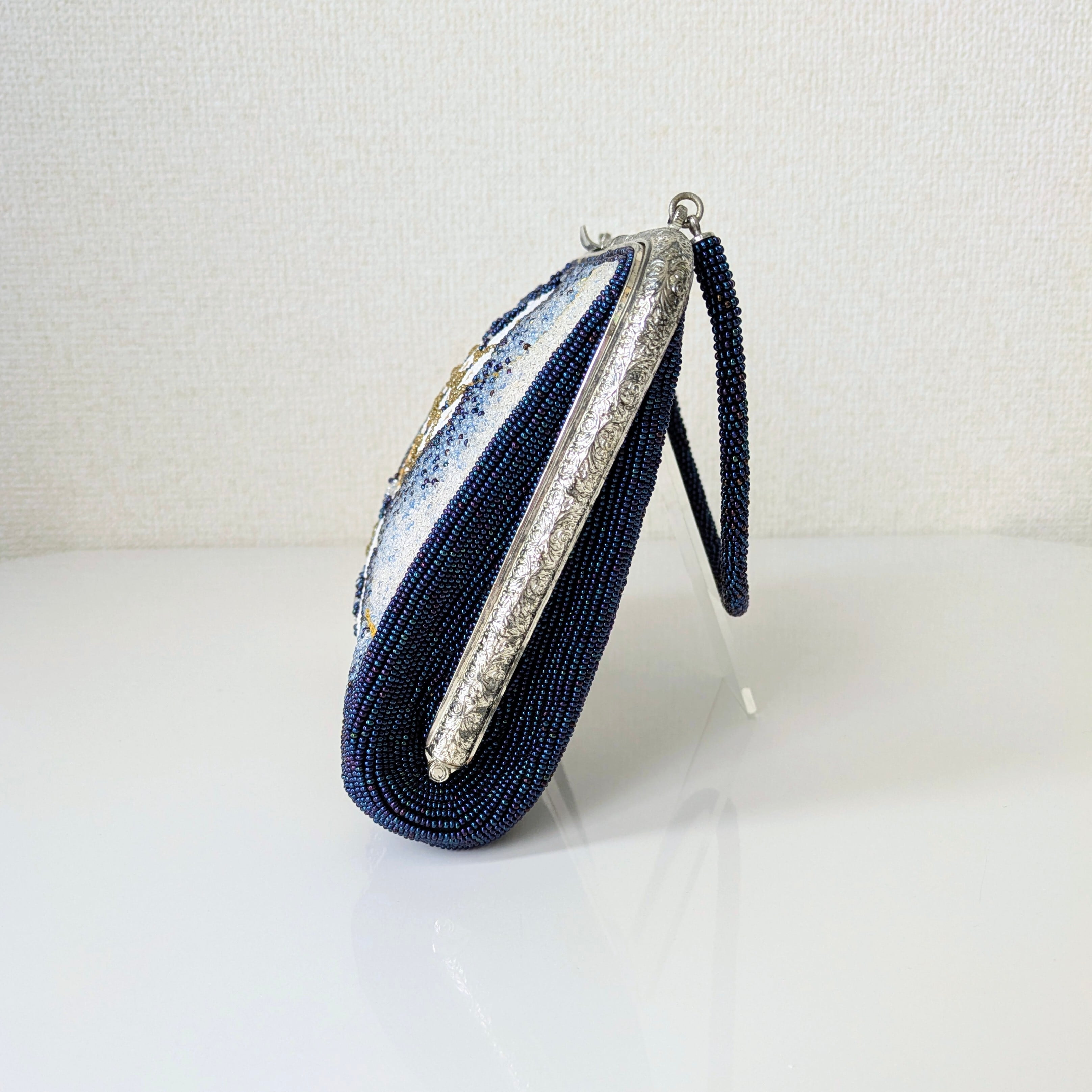 帯をモチーフにしたブルーのグラデーションが美しいビーズバッグです。ゴールドのビーズが随所に使われ、華やかな印象です。