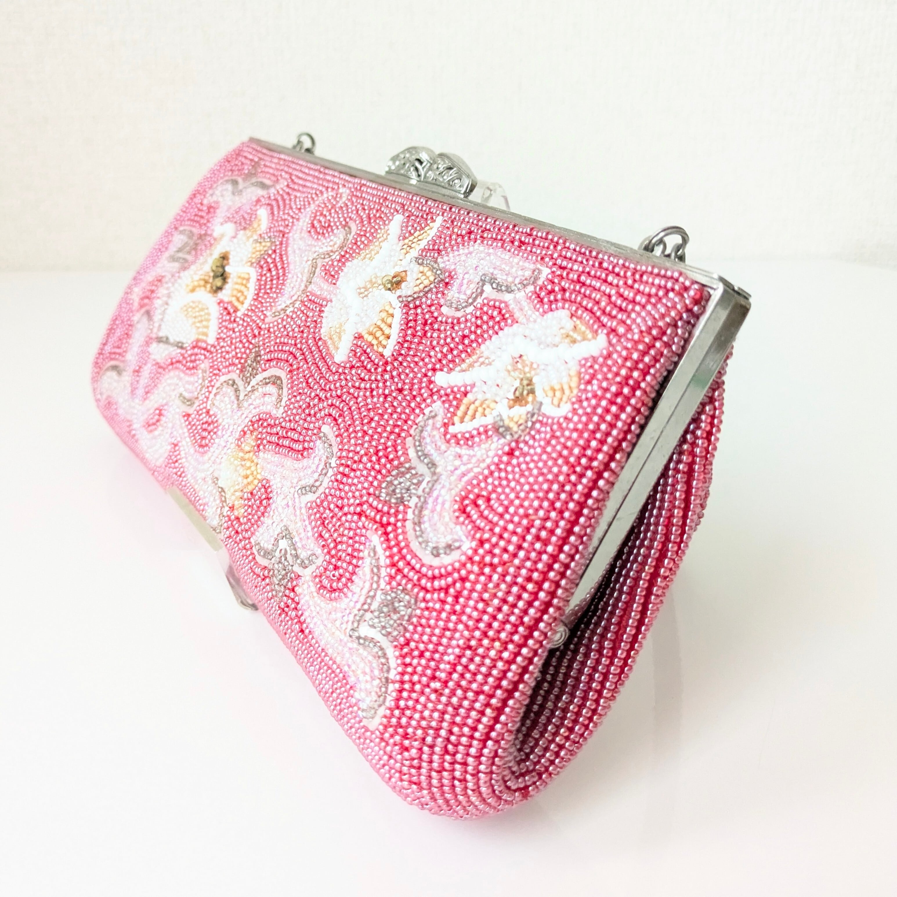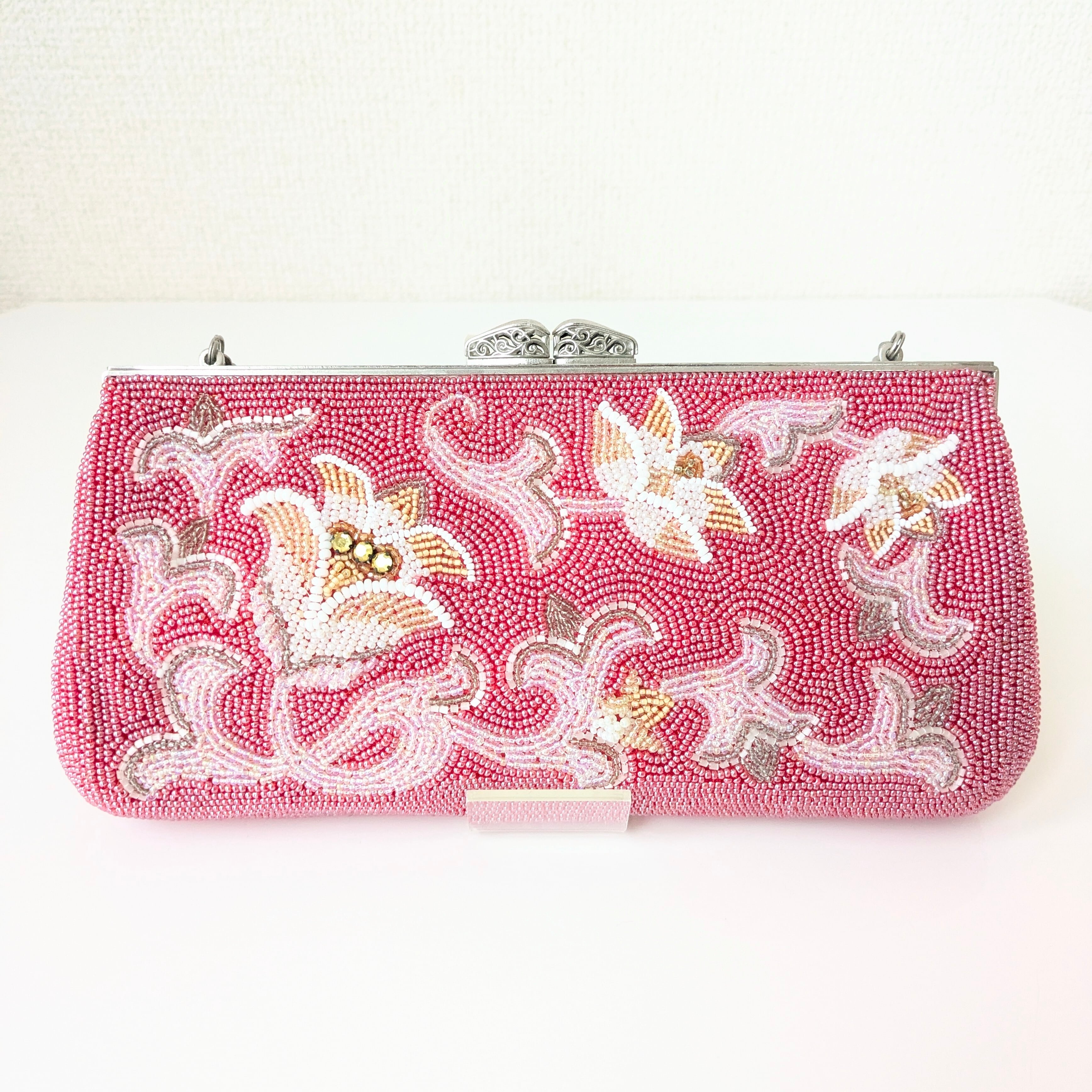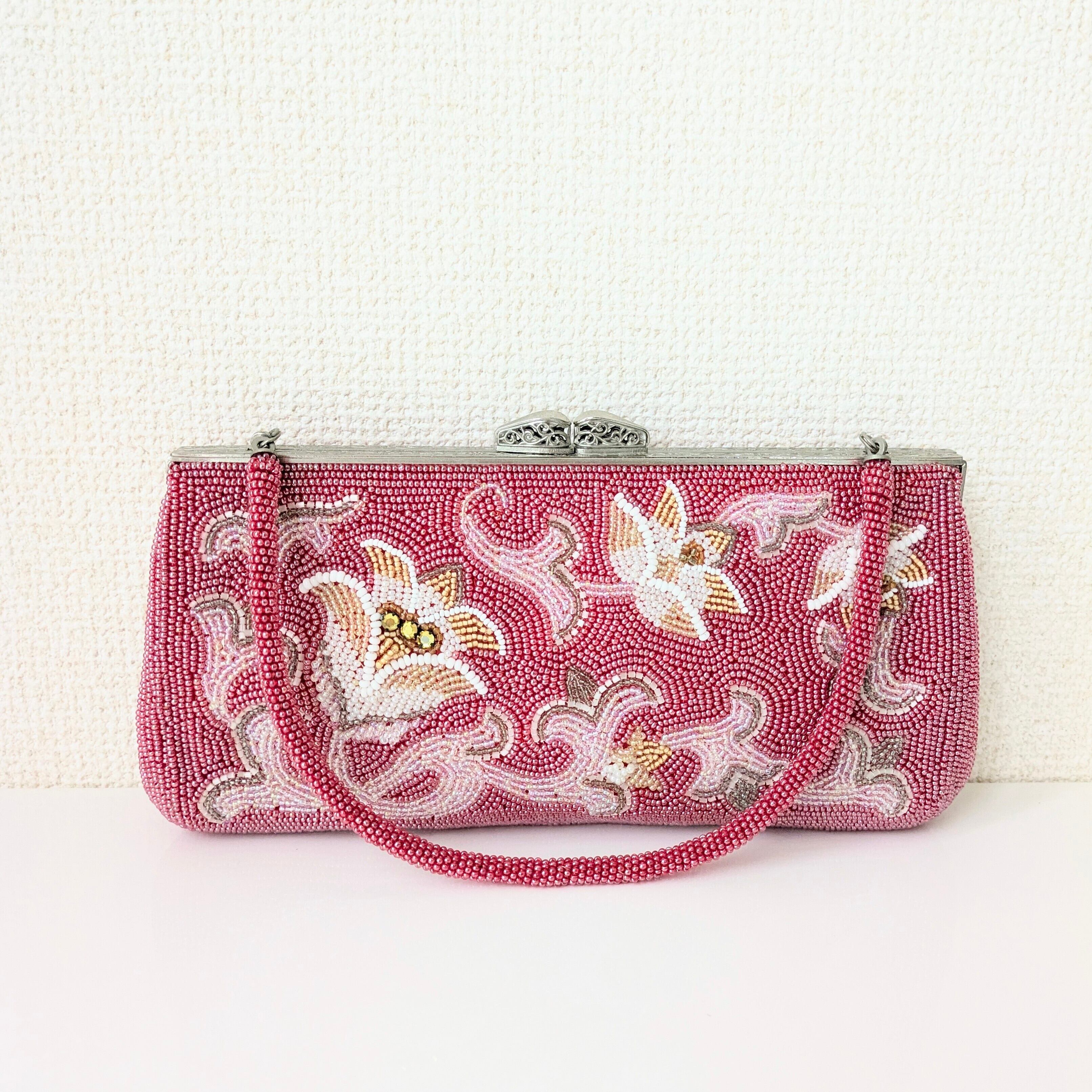 オリエンタルな花柄があしらわれた濃いめピンクのビーズバッグ。横長サイズです。