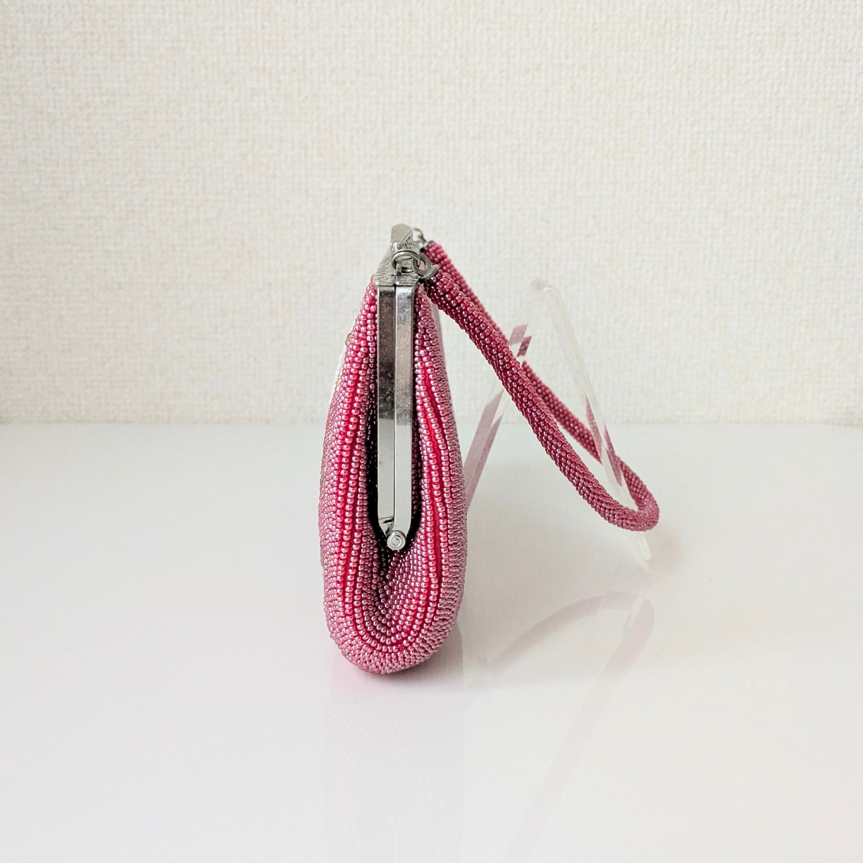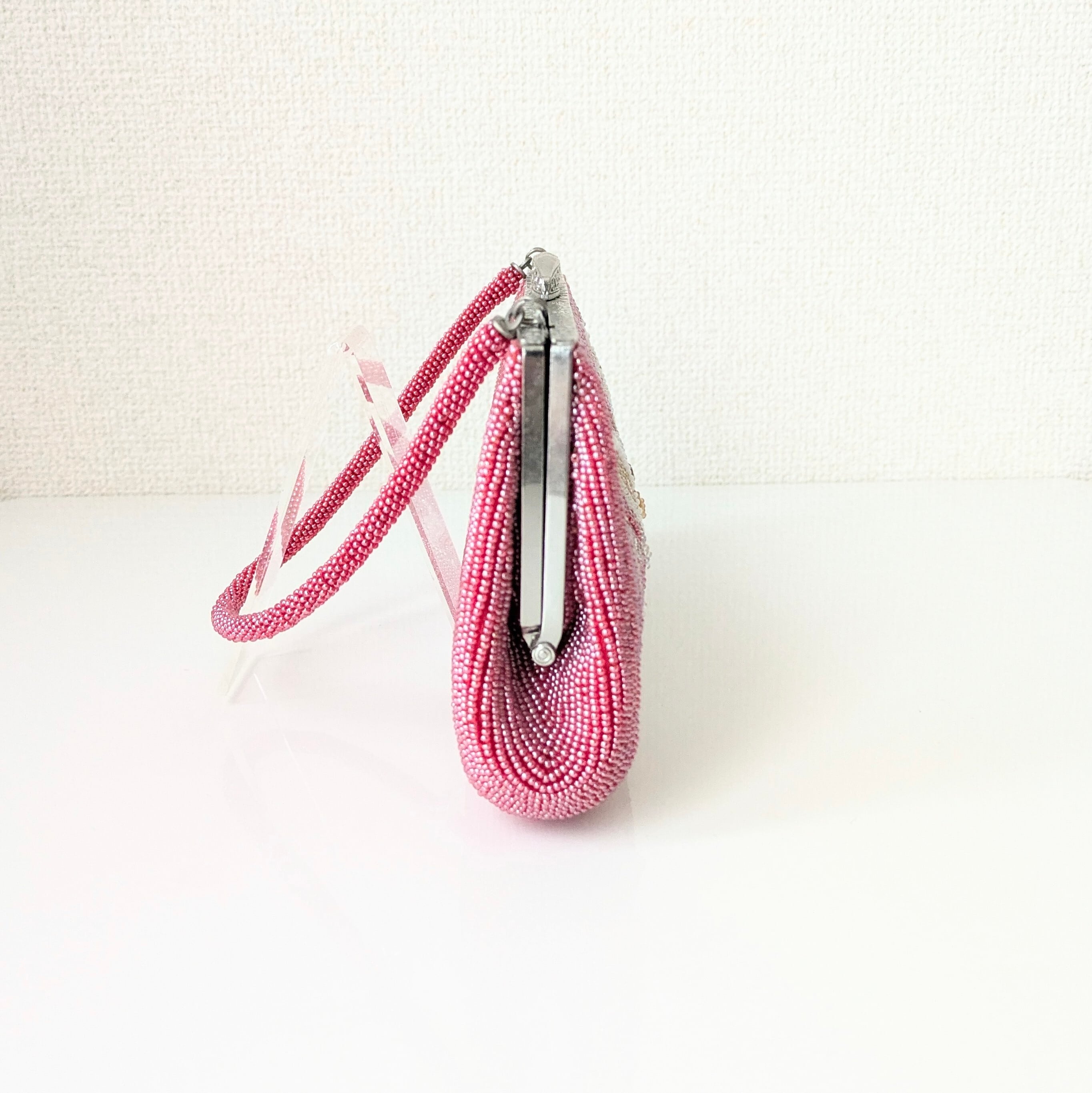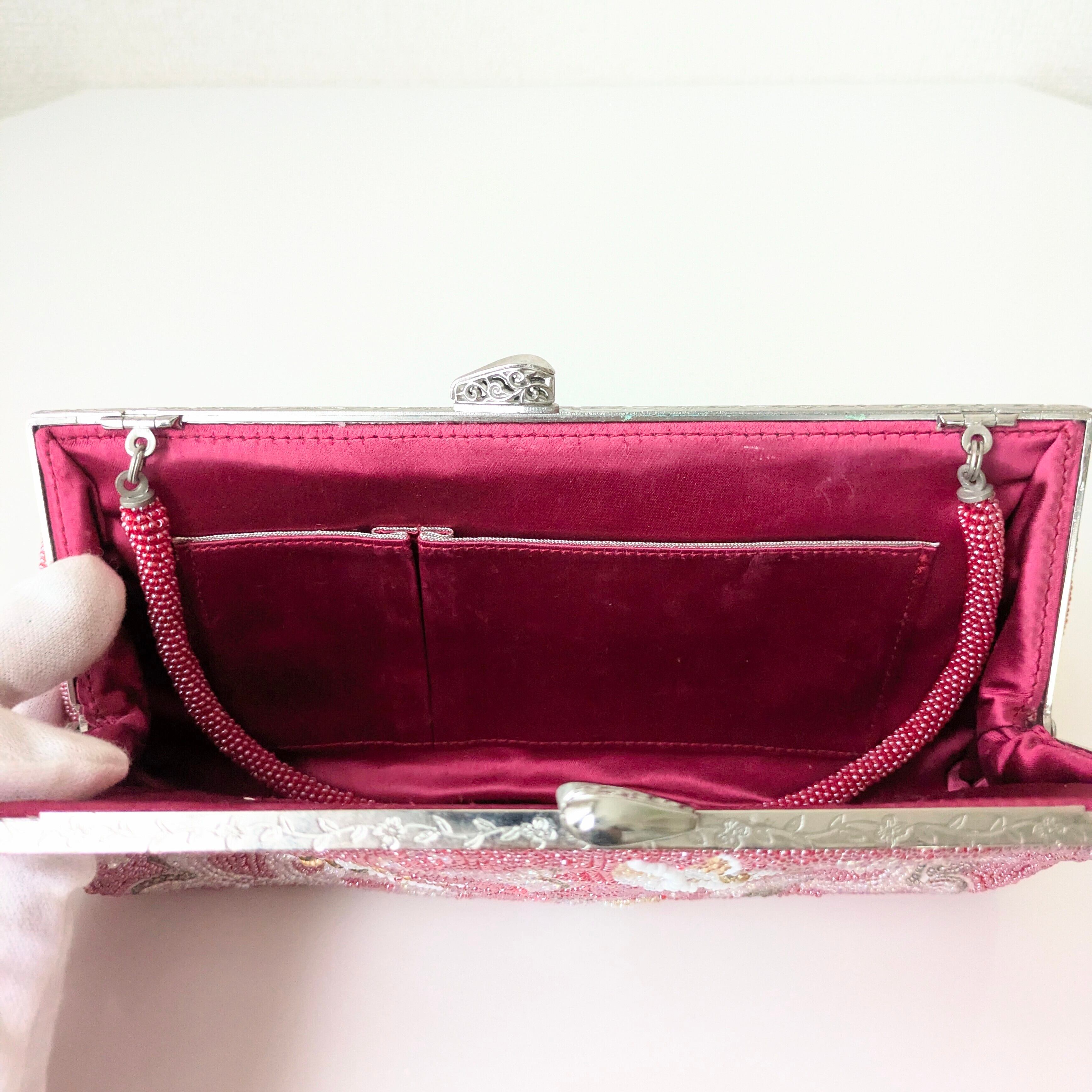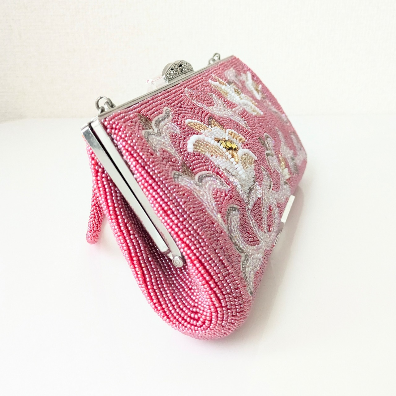 オリエンタルな花柄があしらわれた濃いめピンクのビーズバッグ。横長サイズです。