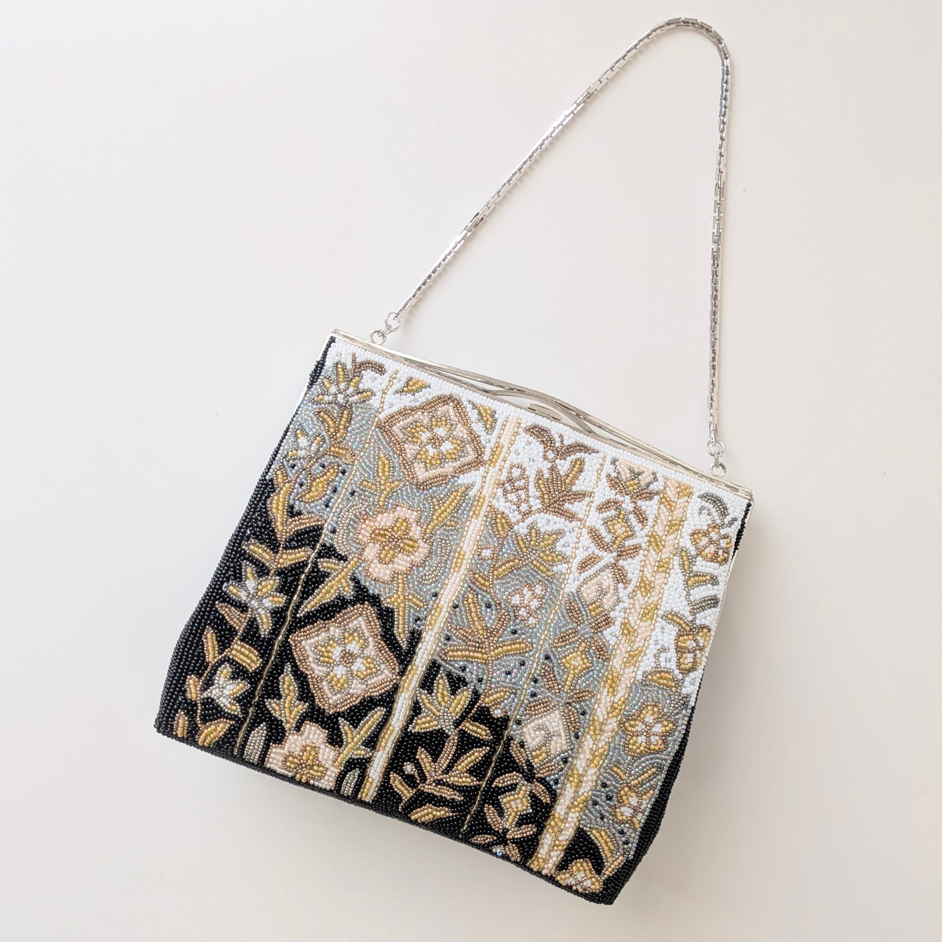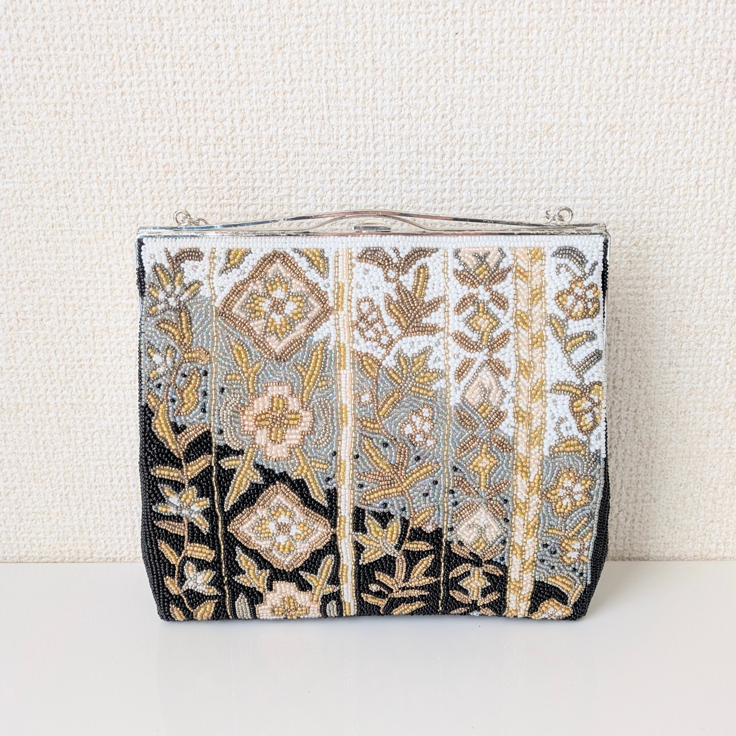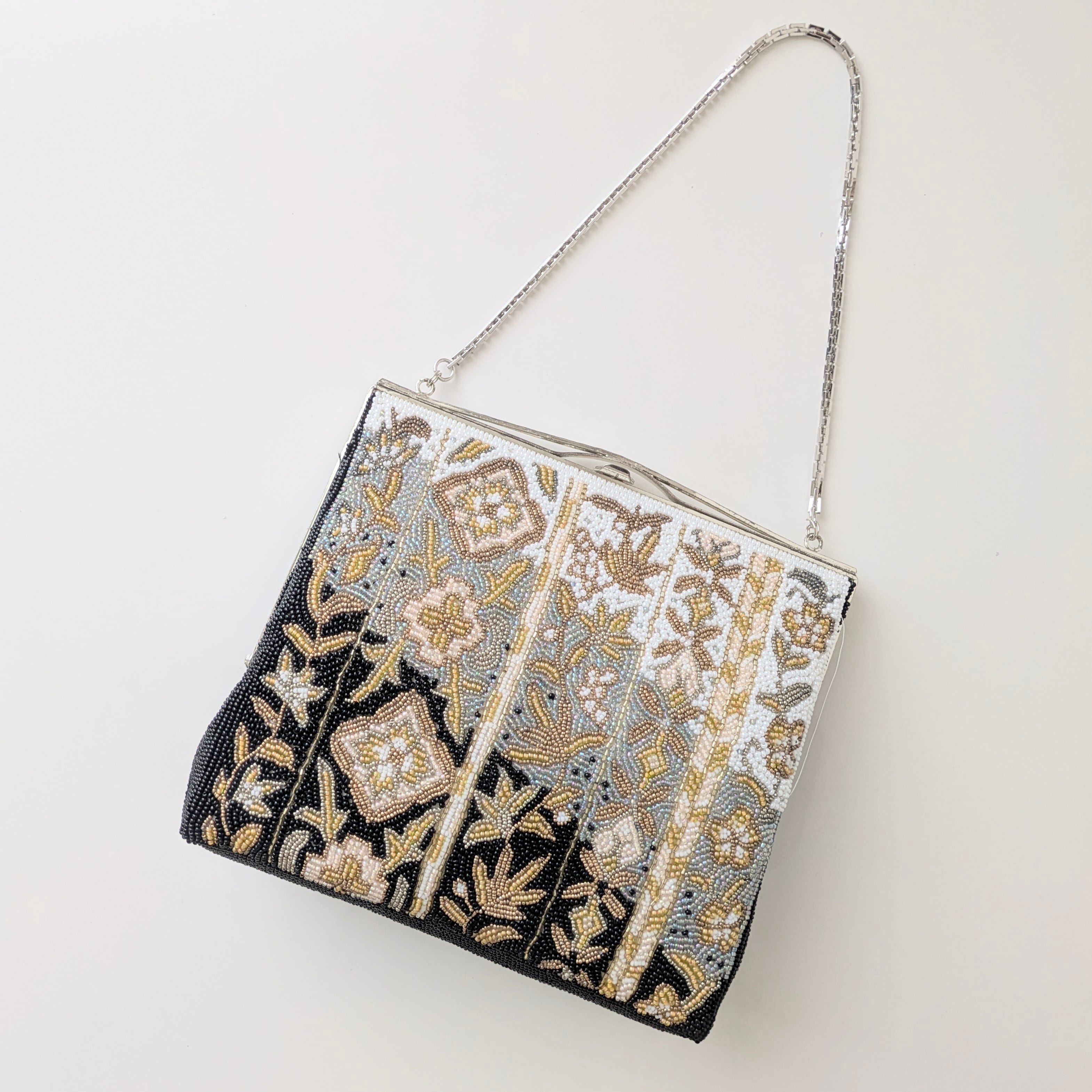 黒、ブルーグレイ、白の3色を背景に金色のビーズで唐草模様があしらわれたビーズバッグです。