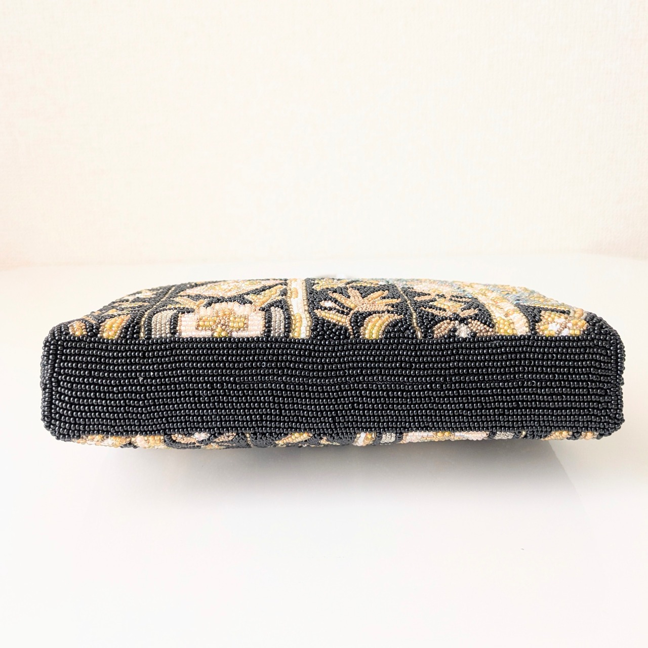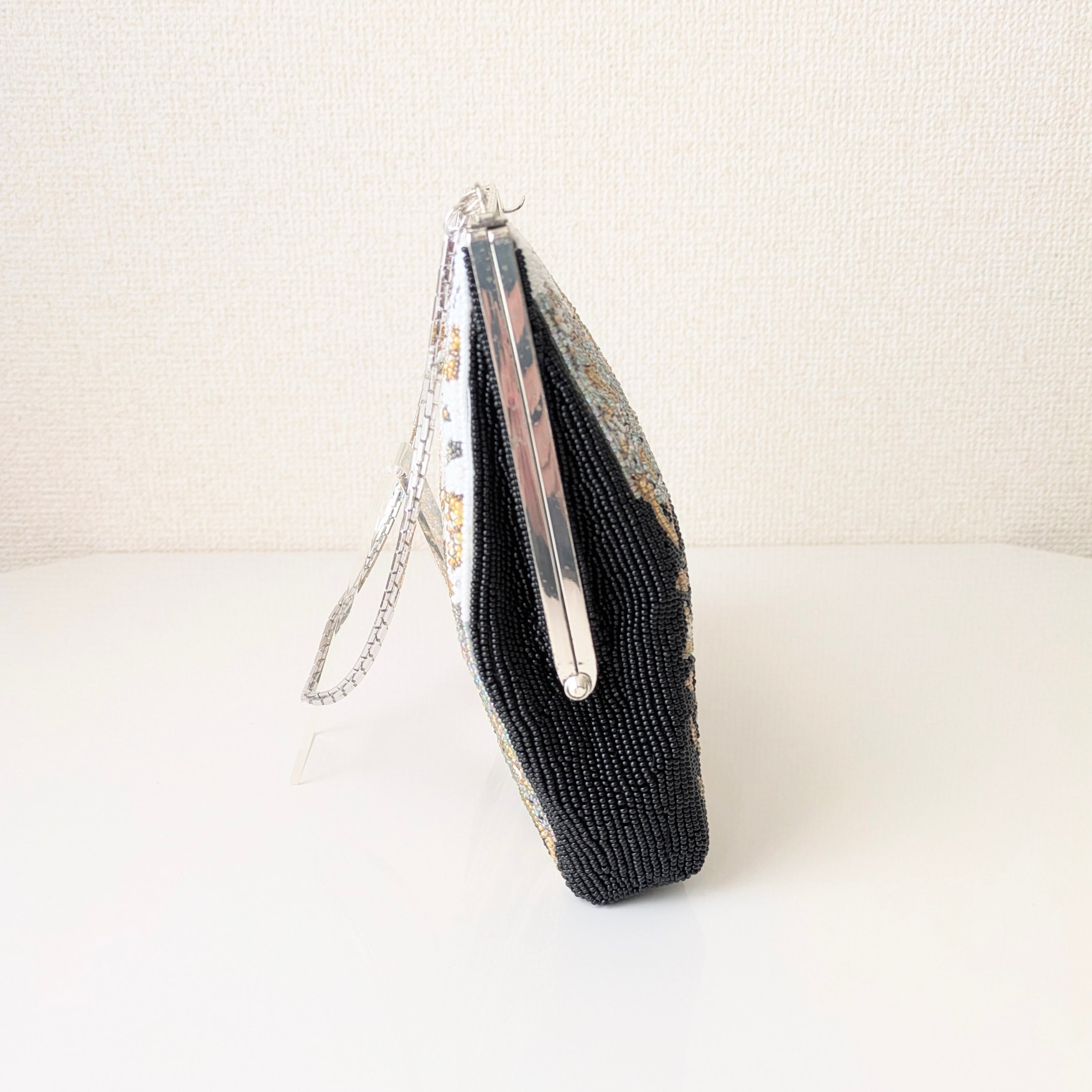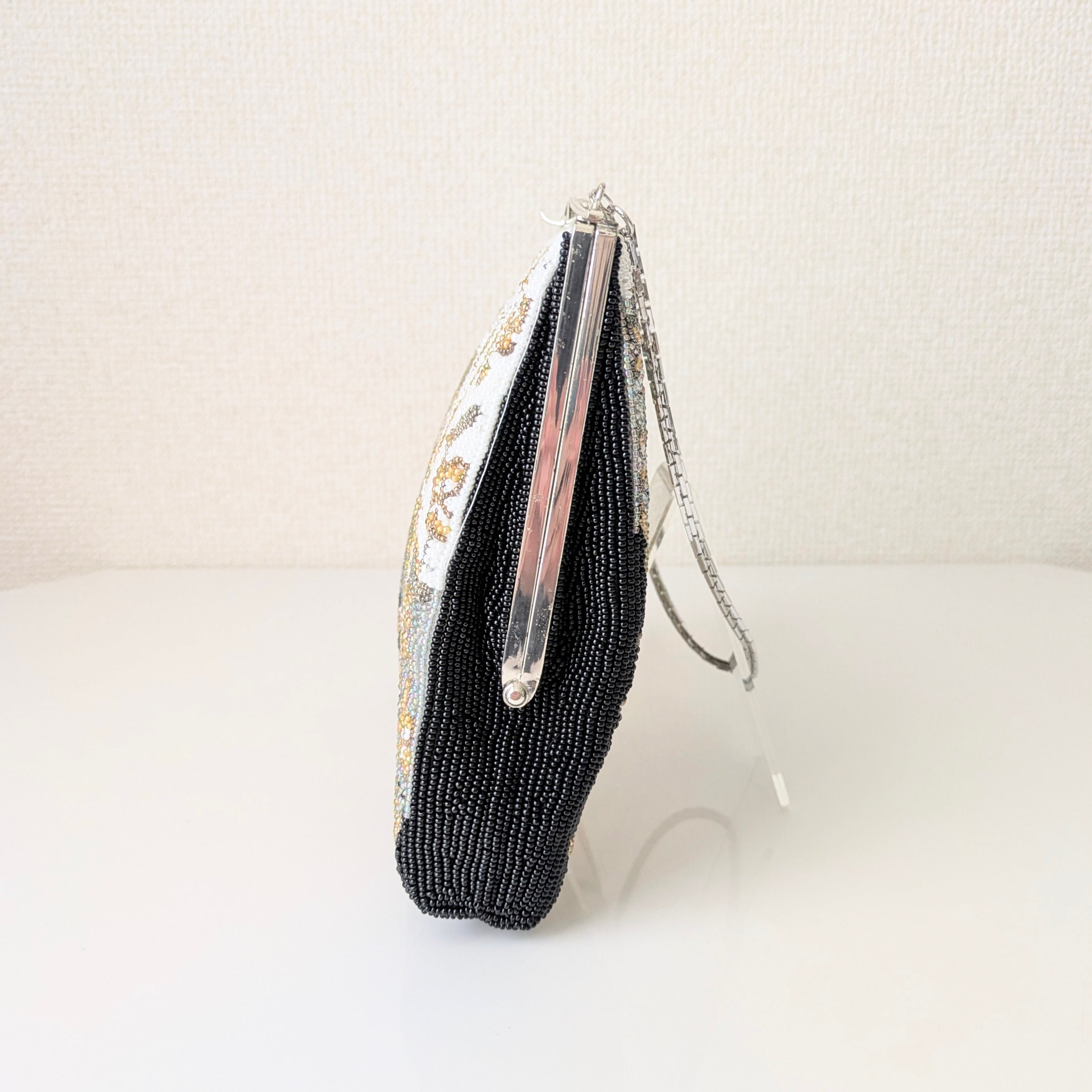 黒、ブルーグレイ、白の3色を背景に金色のビーズで唐草模様があしらわれたビーズバッグです。