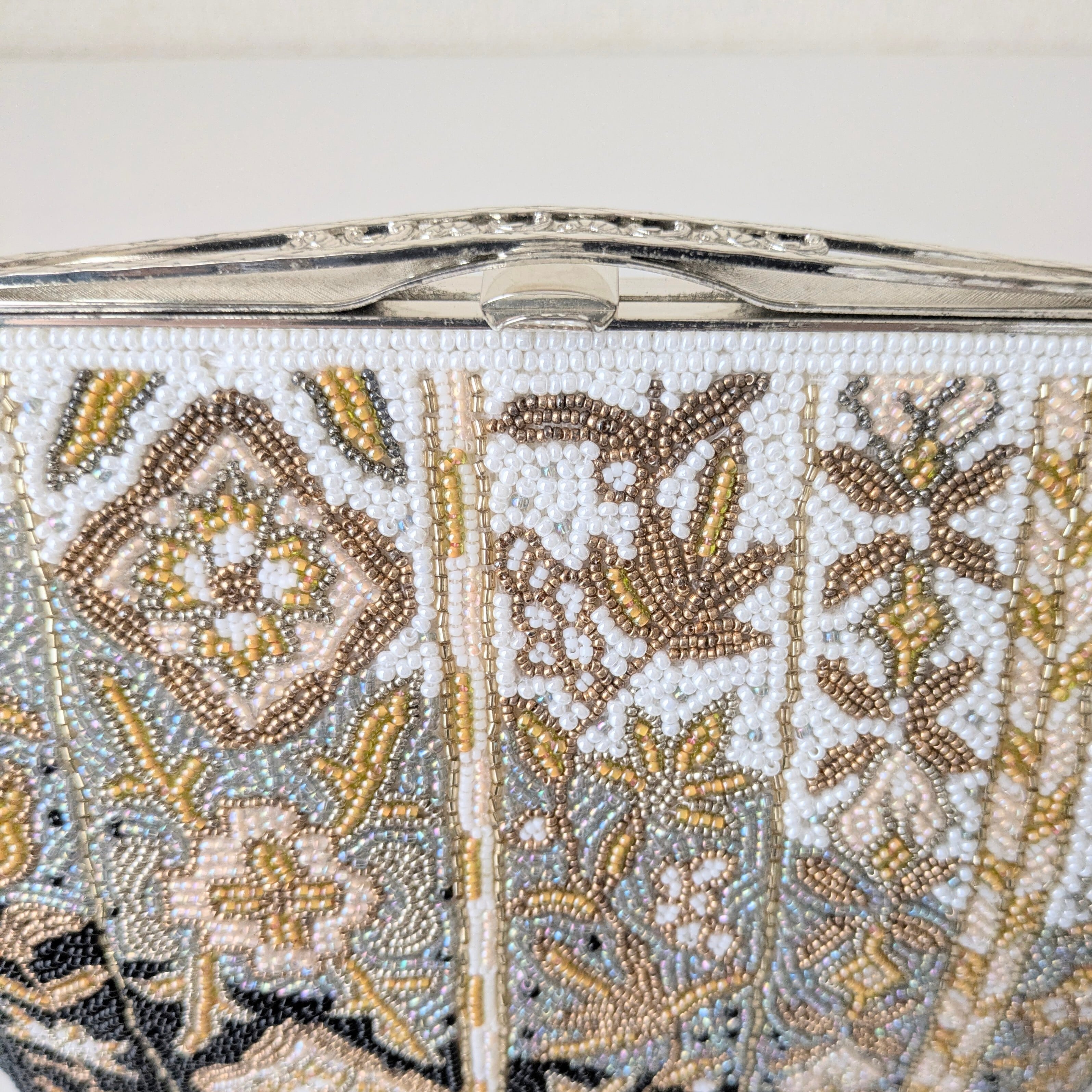 光を受けて美しく輝くヴィンテージビーズバッグ。