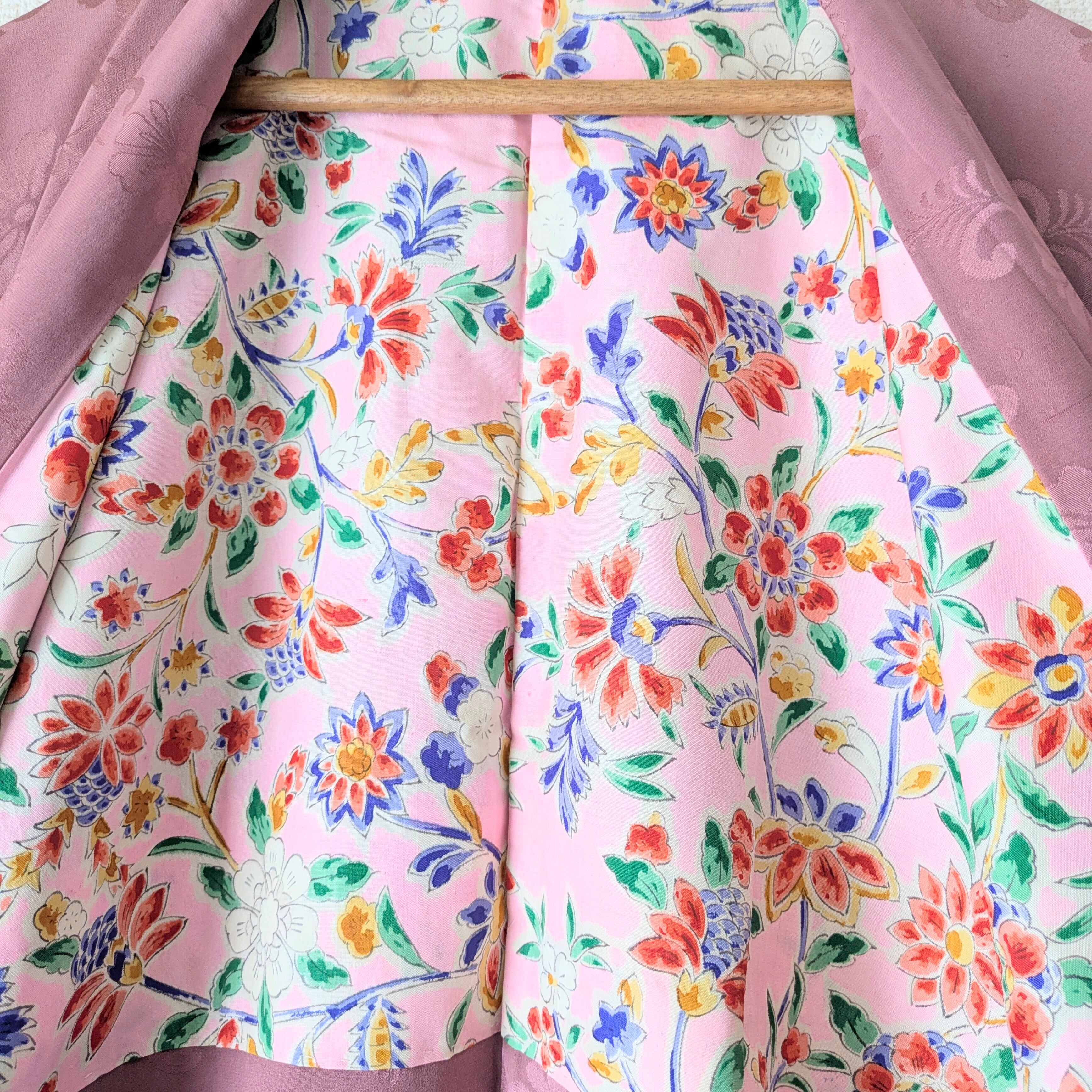 花唐草の模様が繻子織りによって浮き出て見えます。裏地は鮮やかな花柄。