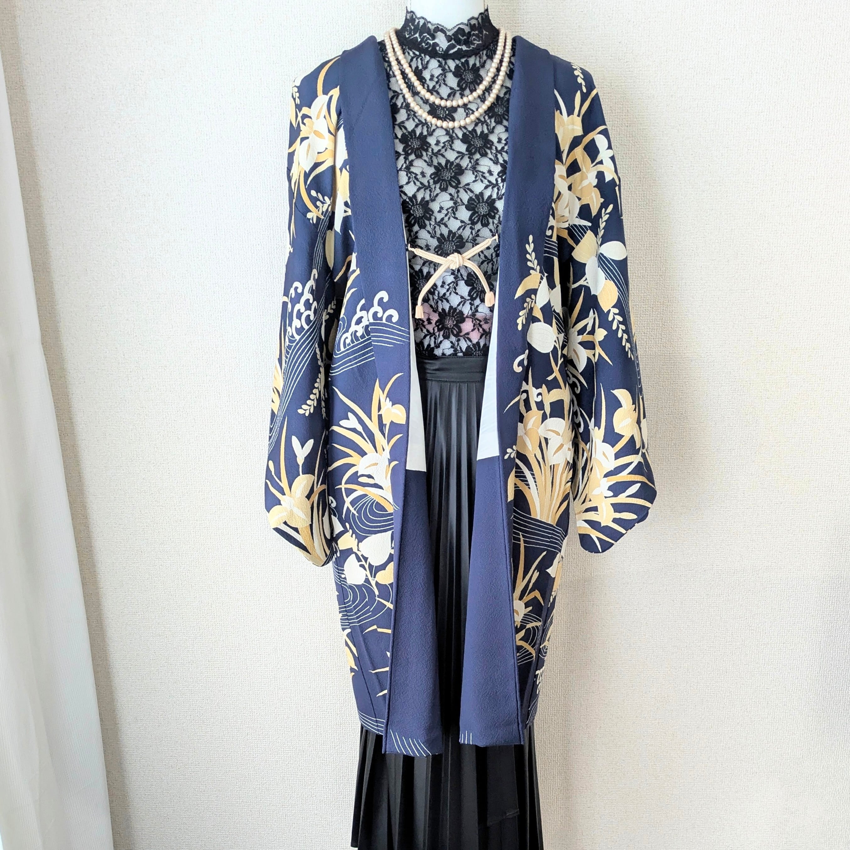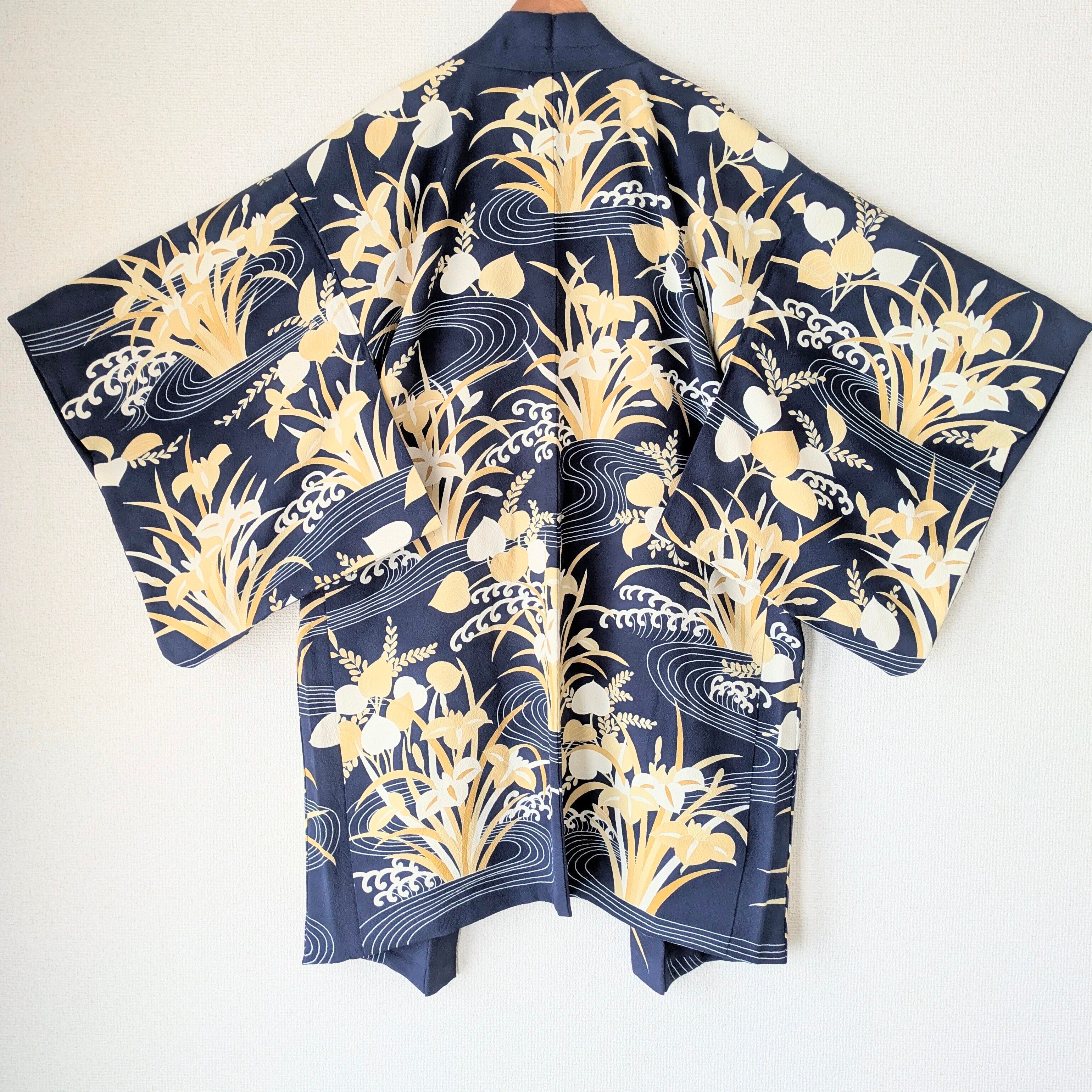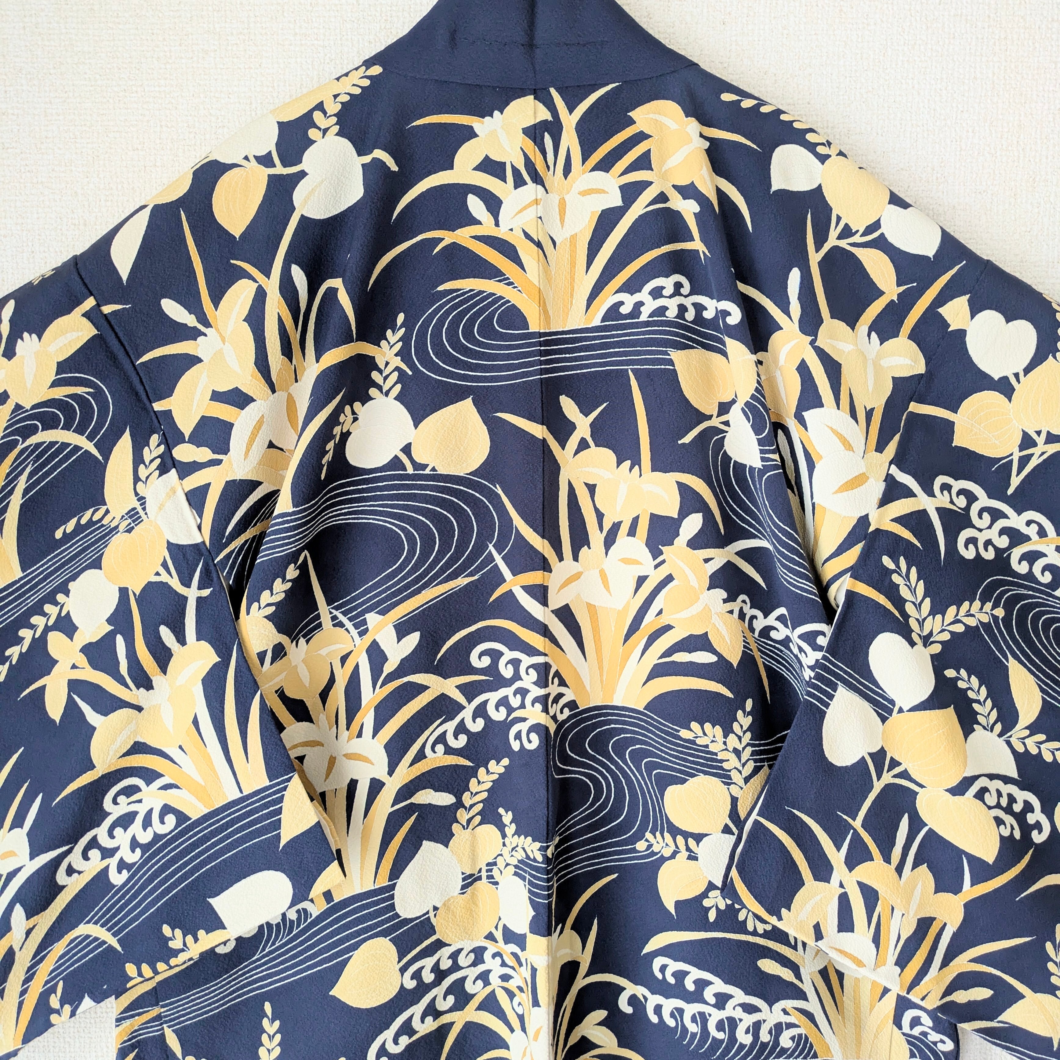 濃紺に水辺に咲く杜若(カキツバタ)が描かれた長羽織です。