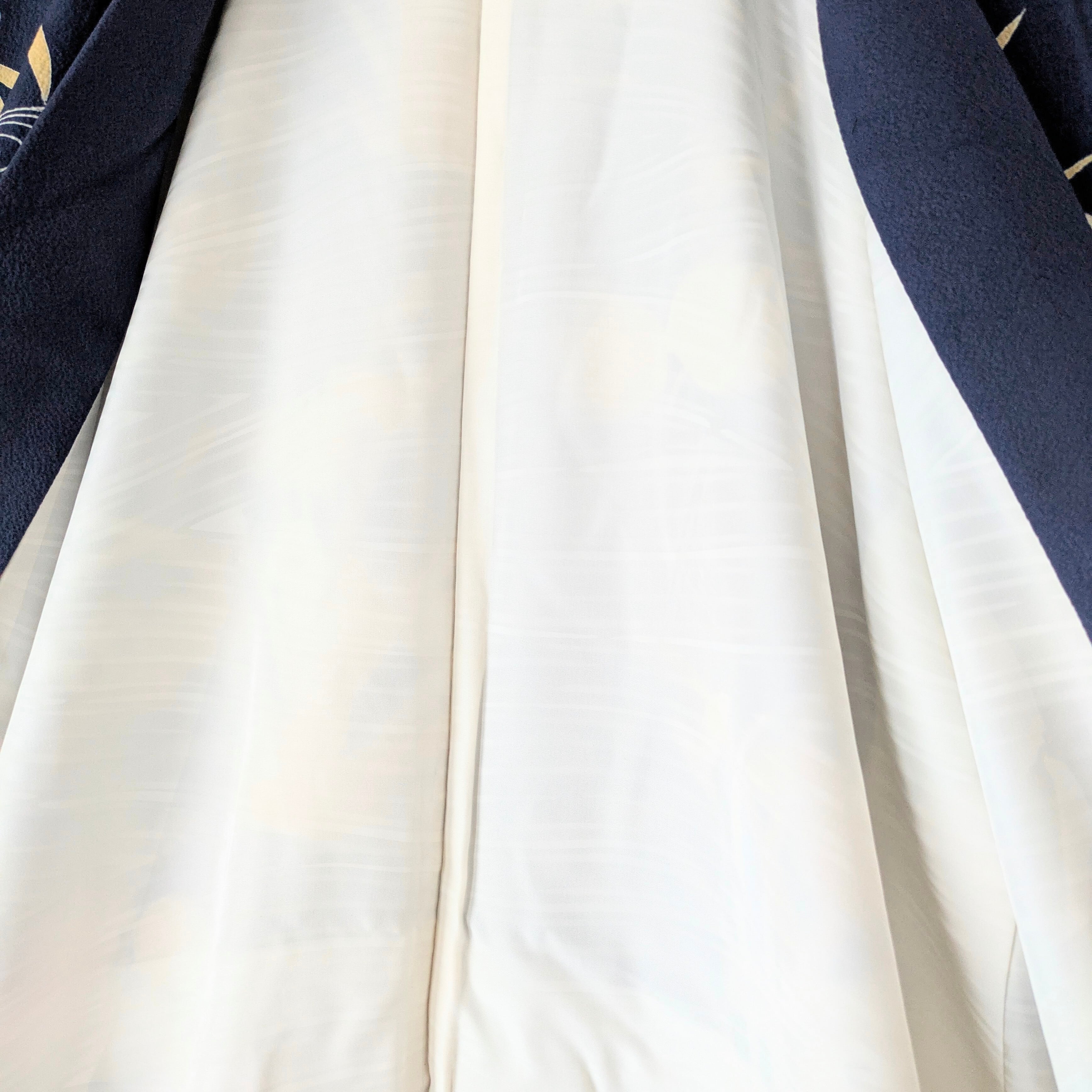 濃紺の深みのある地色とゴールドベージュの杜若の色合いが惹きあって、優雅な風情を感じさせます。