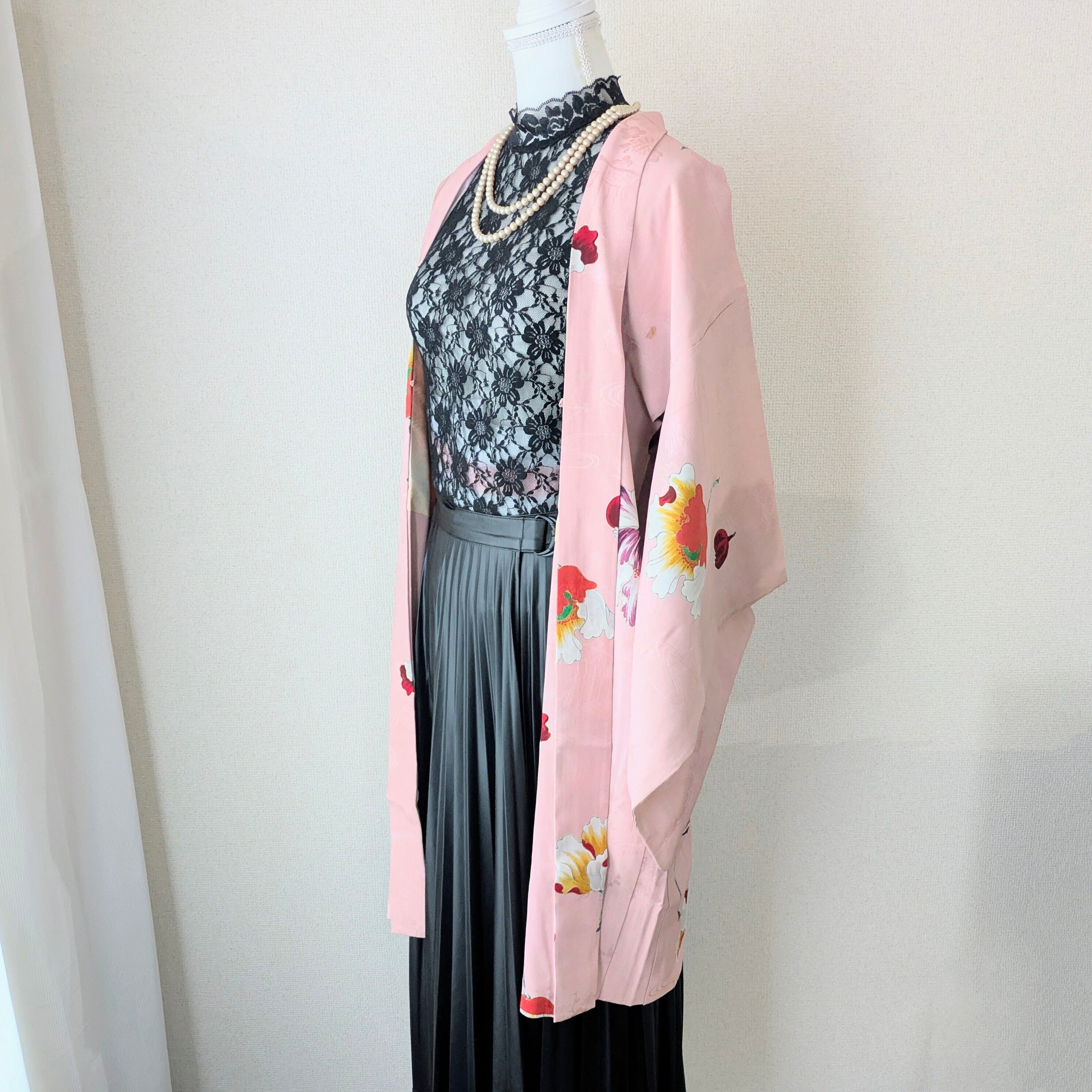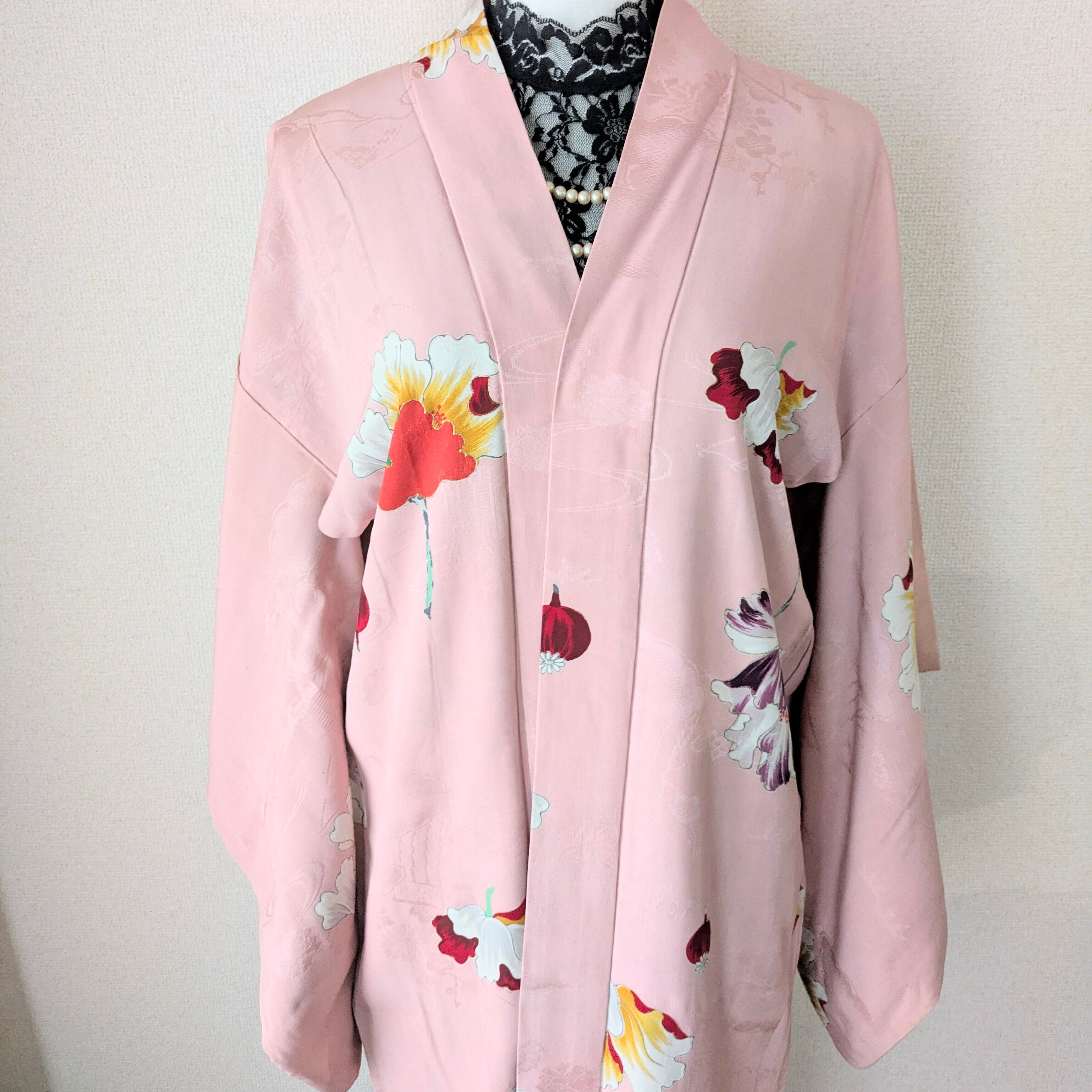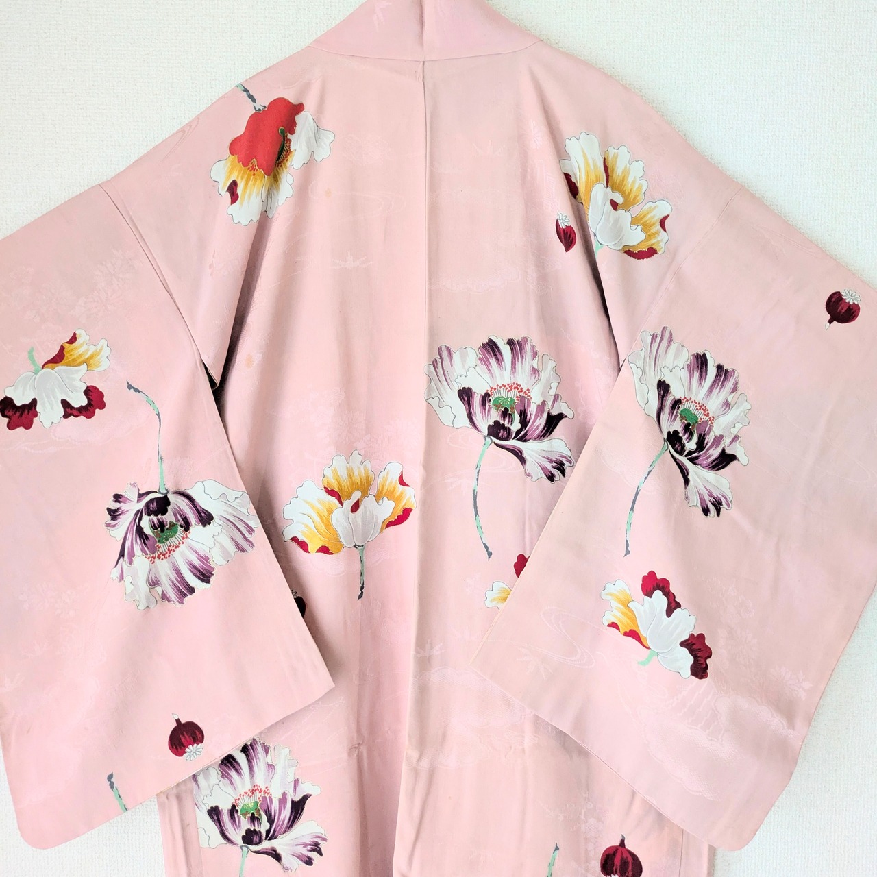 やや青みがかったピンク色に鮮やかなケシの花があしらわれた長羽織です。
