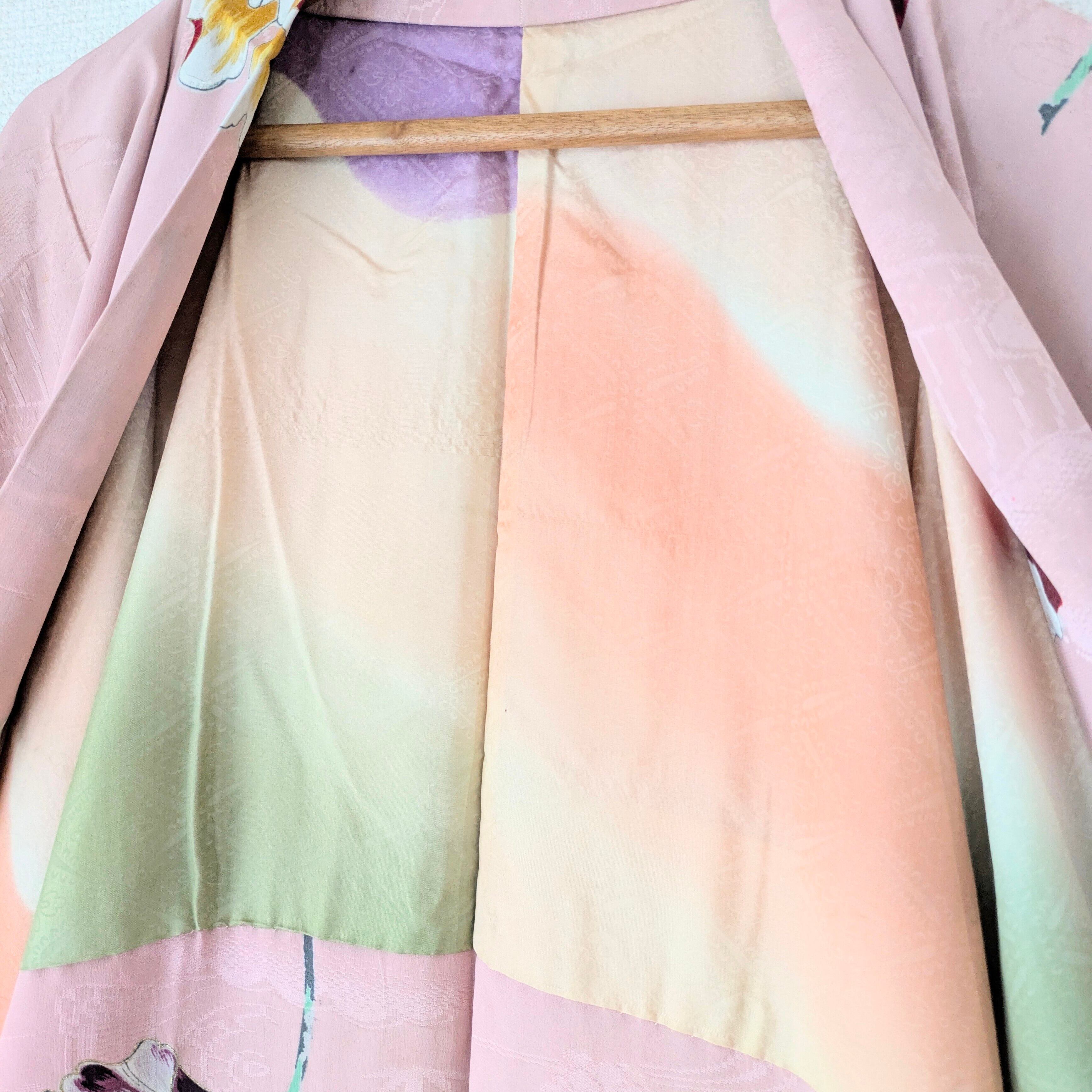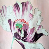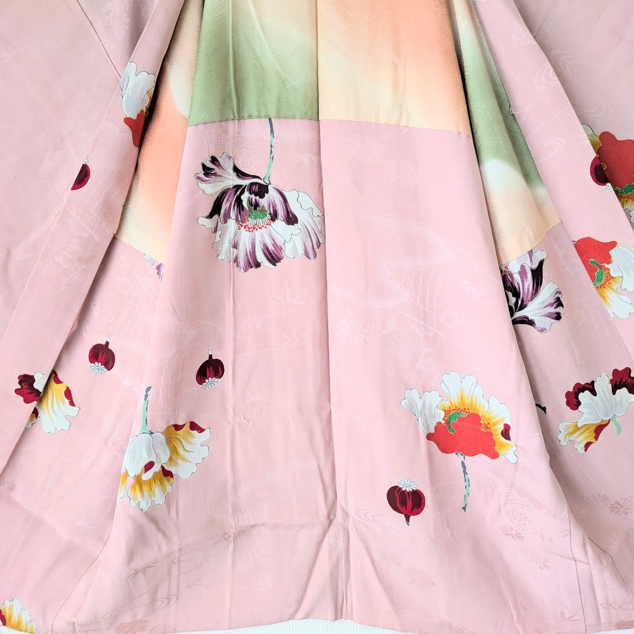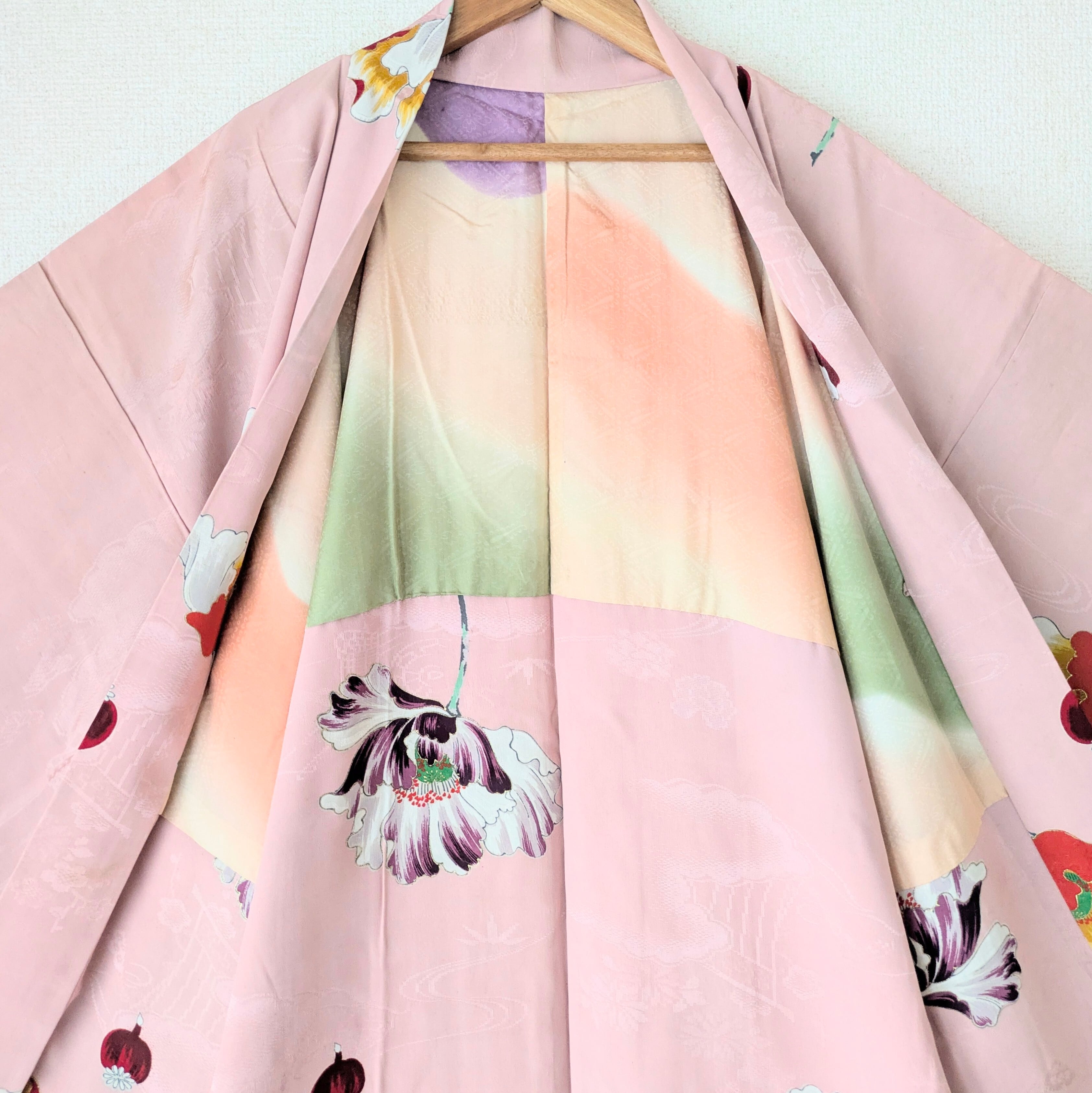 やや青みがかったピンク色に鮮やかなケシの花があしらわれた長羽織です。