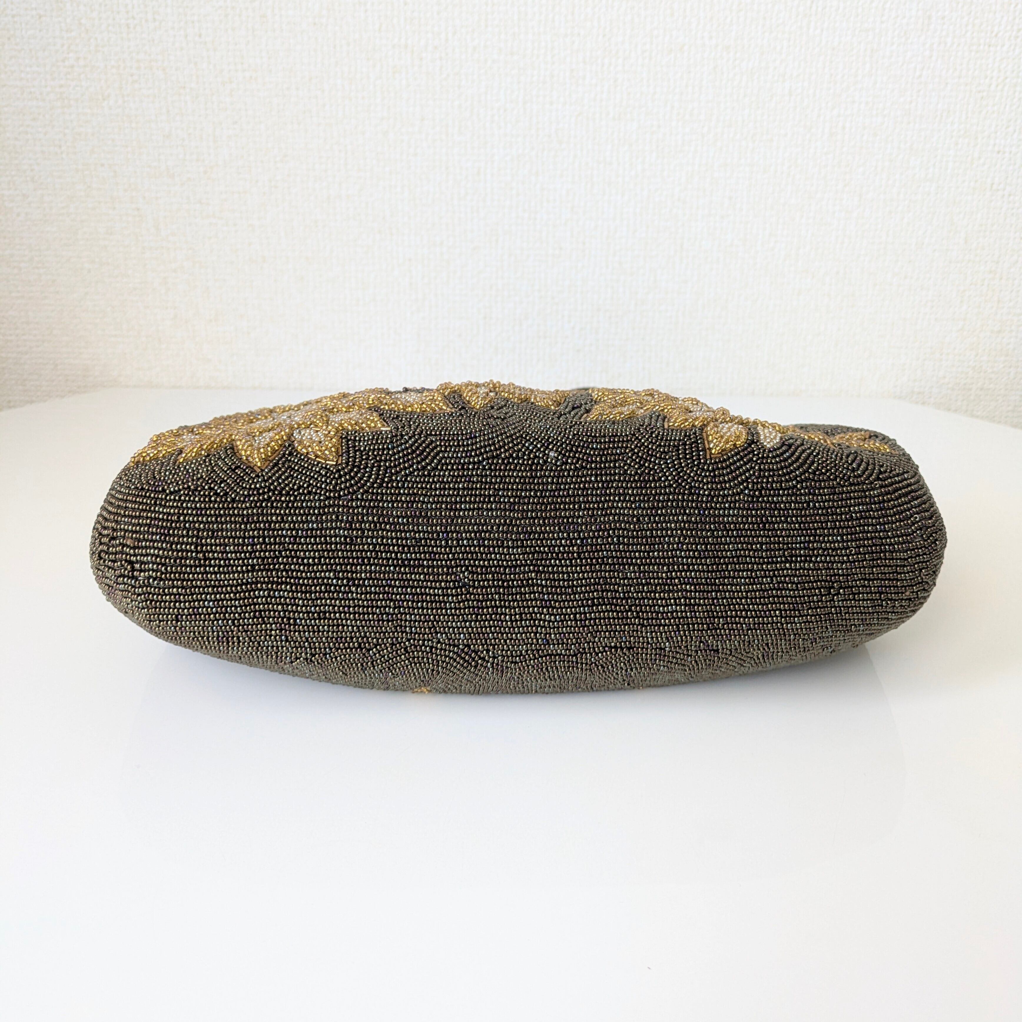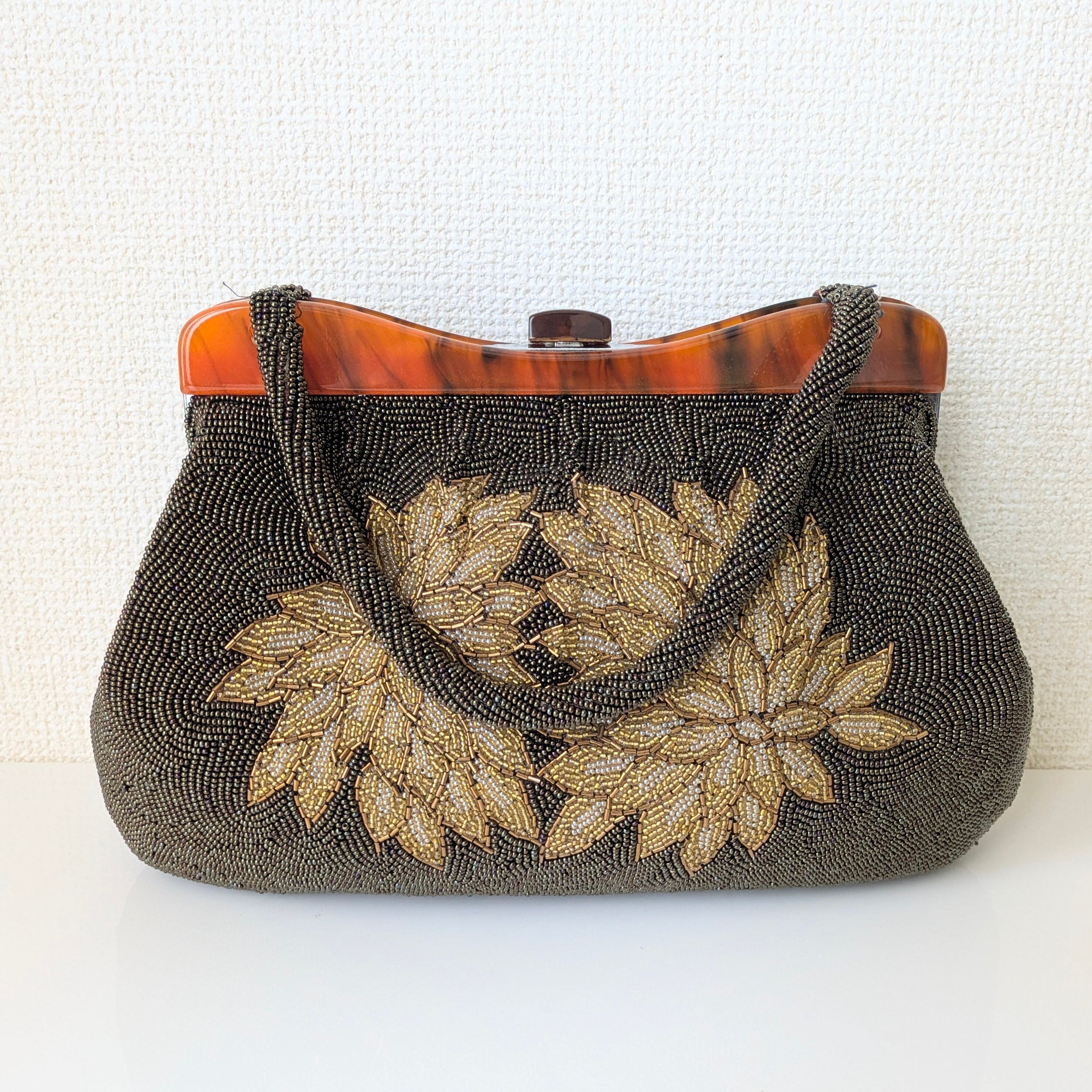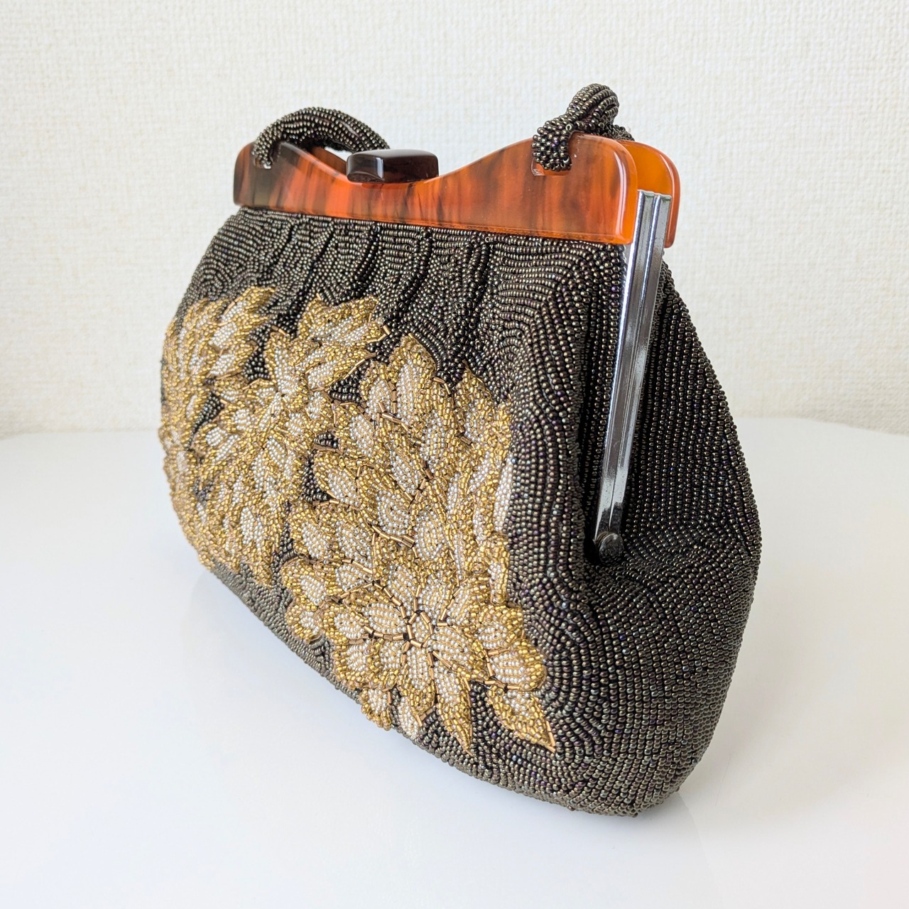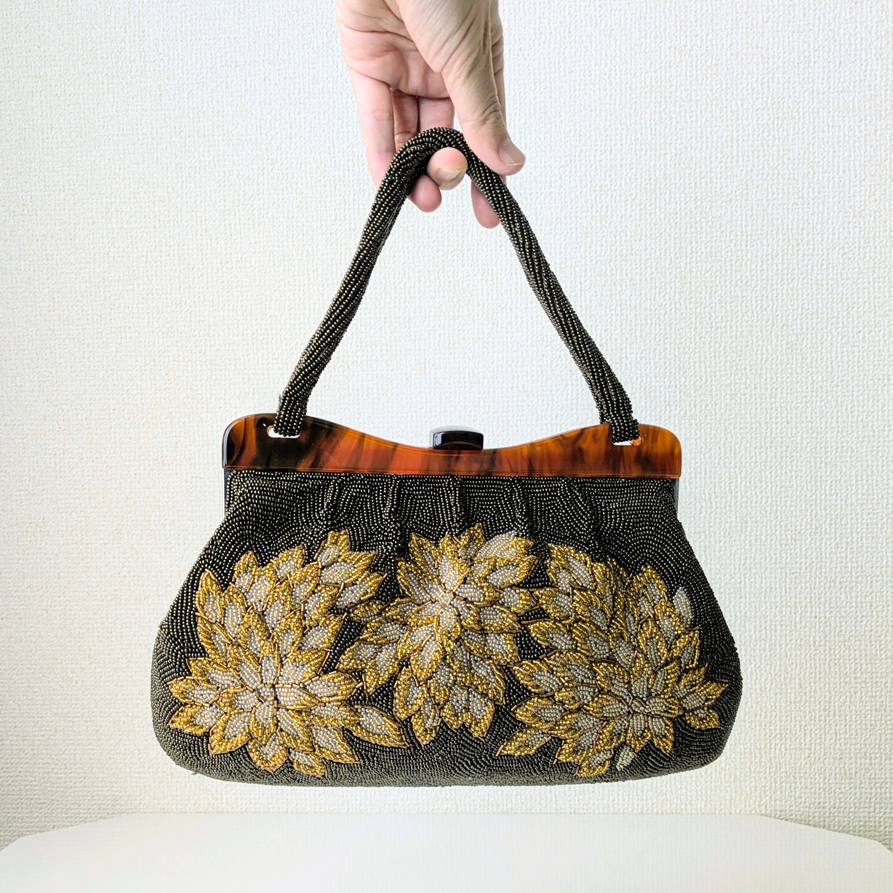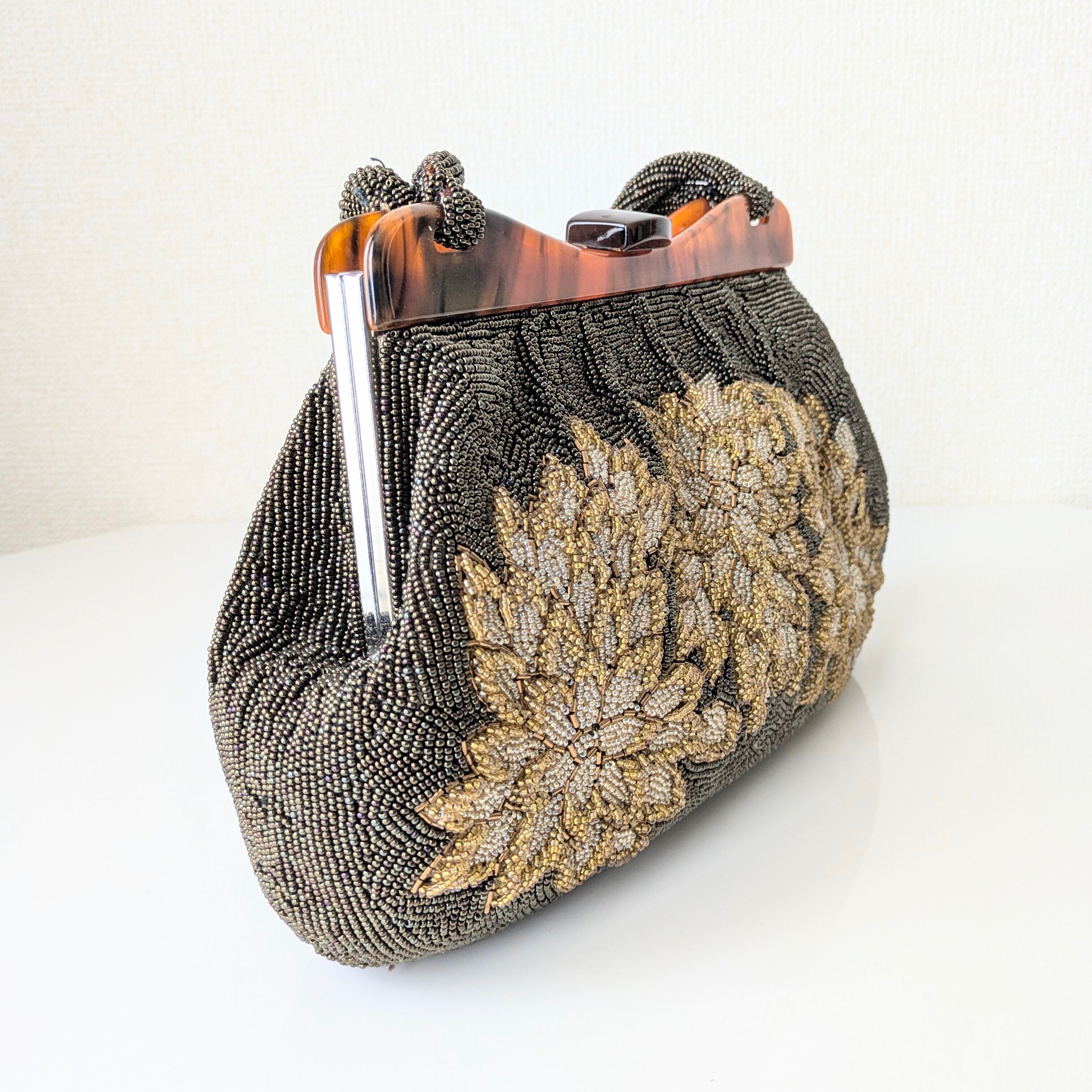 ダークブラウンベースにベージュゴールドの菊模様が施されたビーズバッグです。