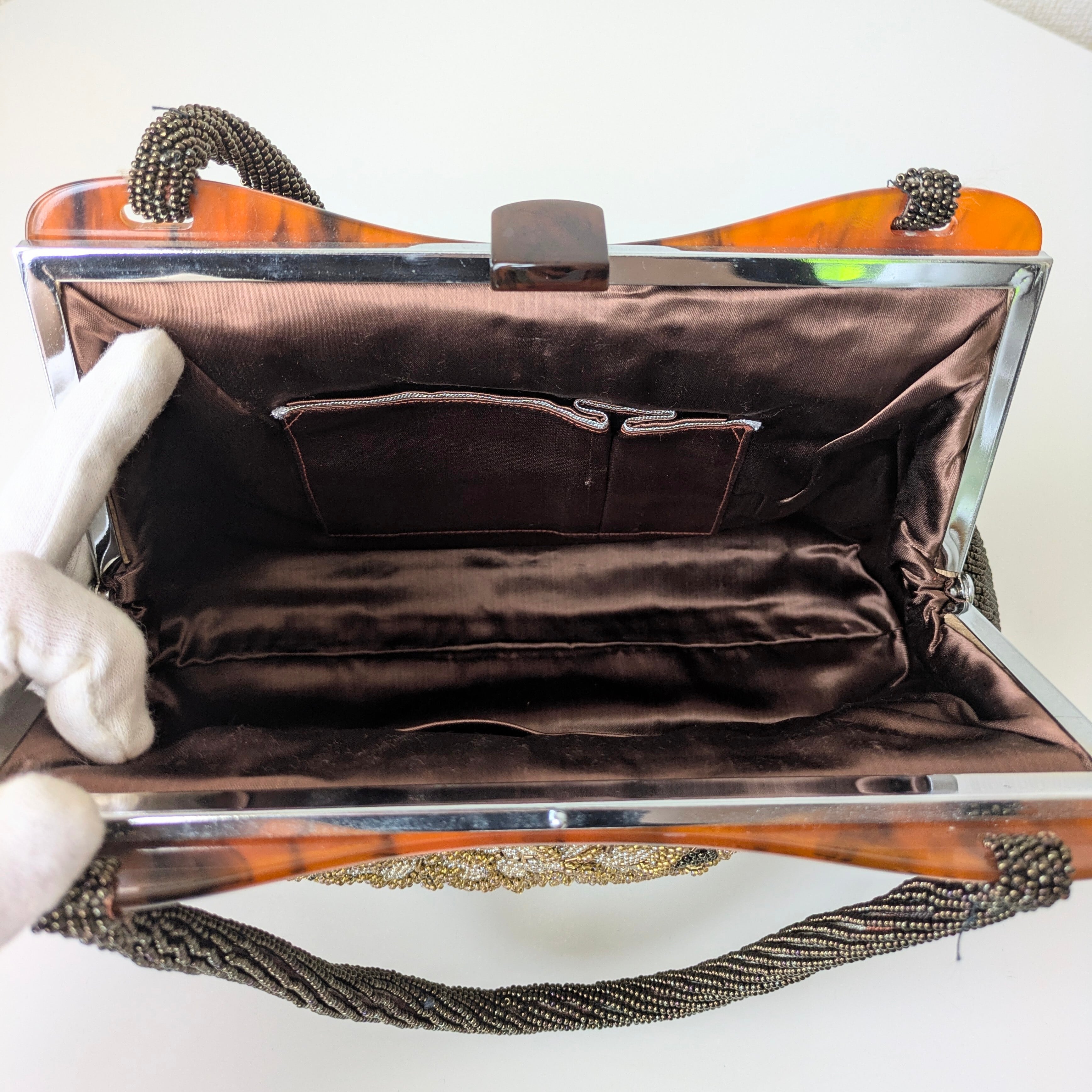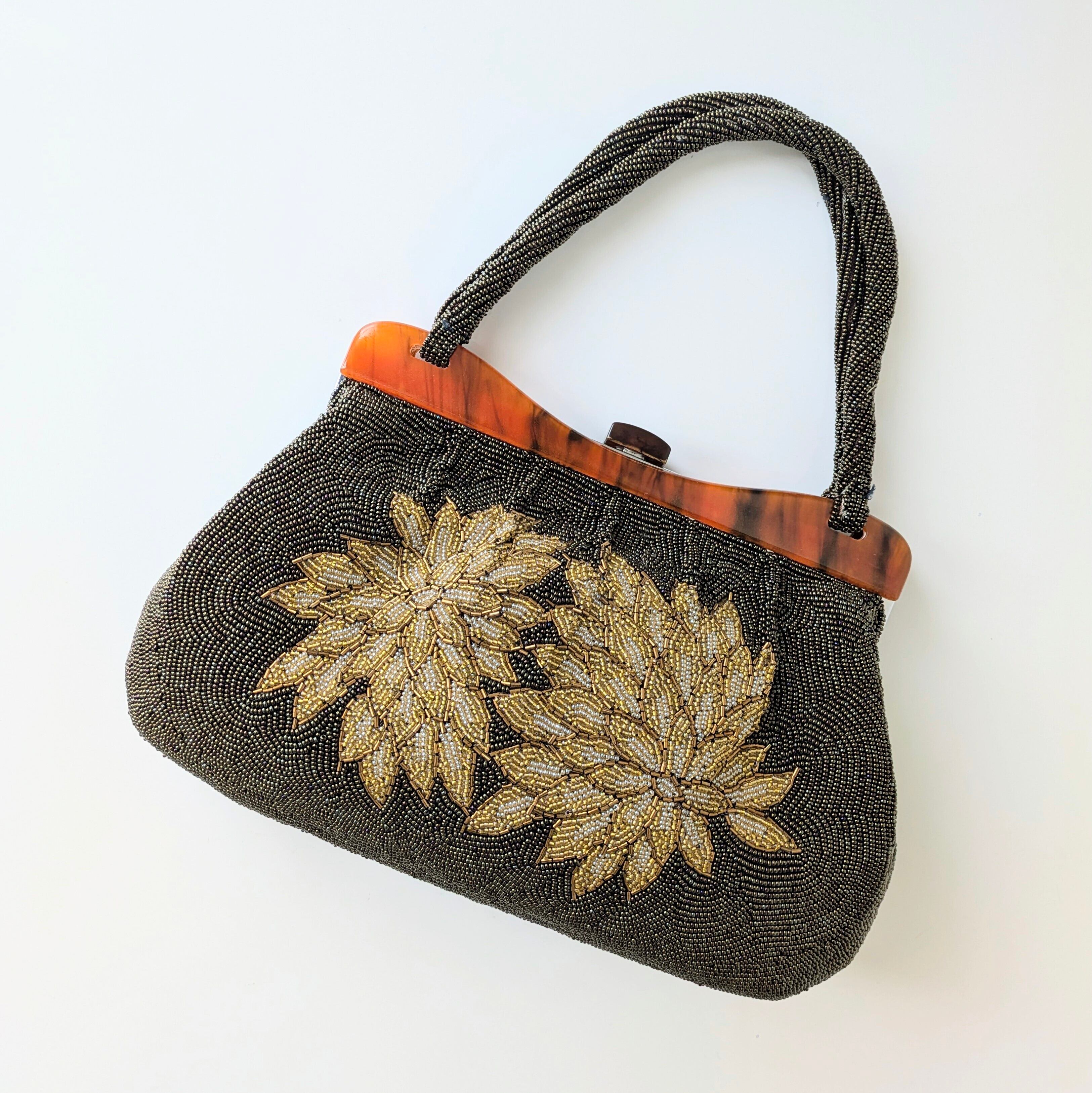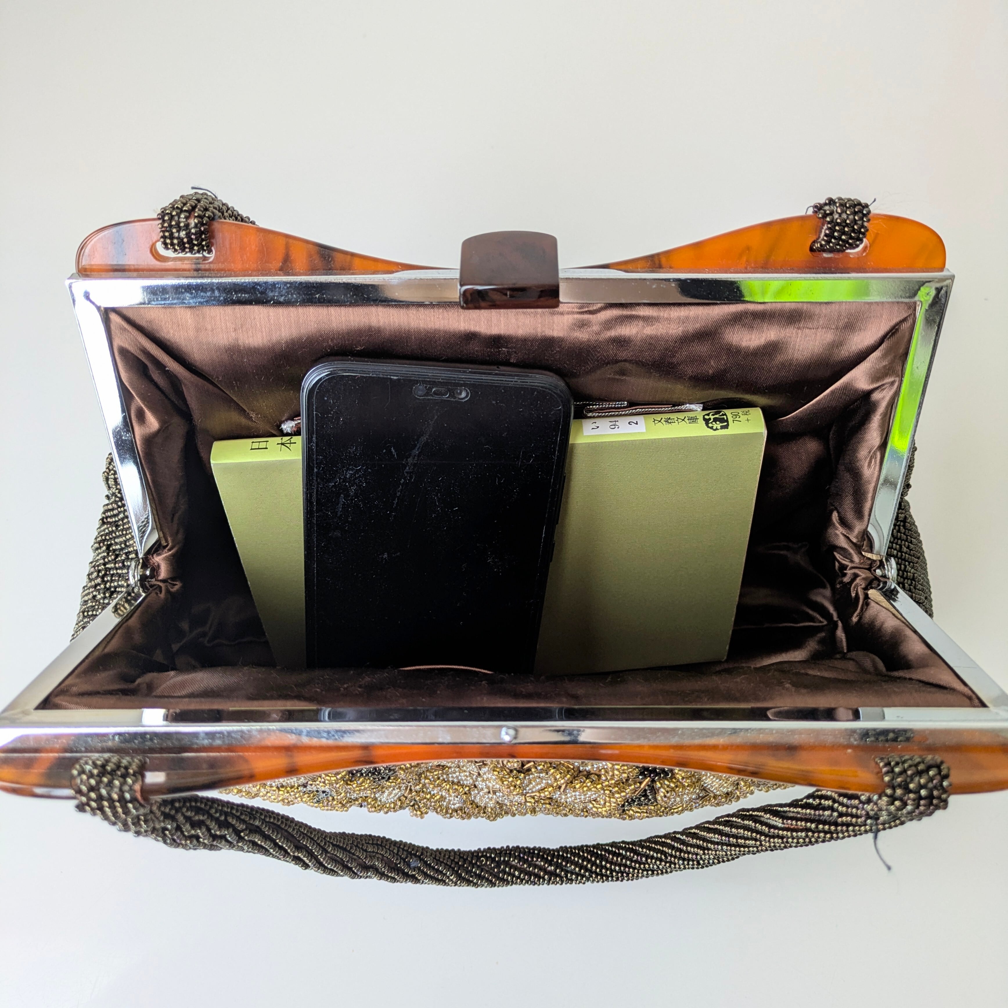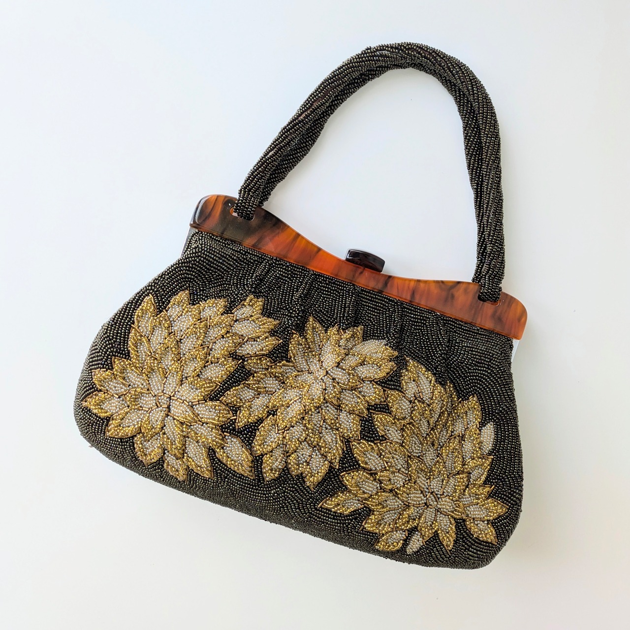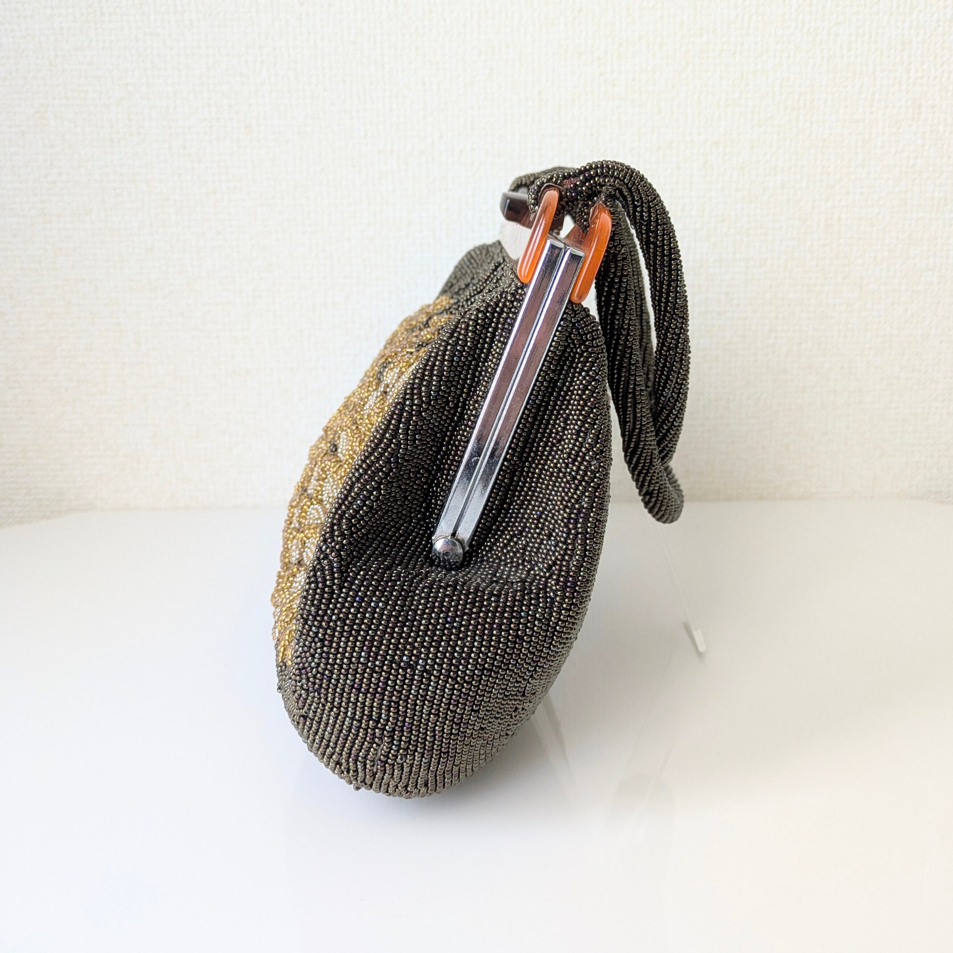 ダークブラウンベースにベージュゴールドの菊模様が施されたビーズバッグです。