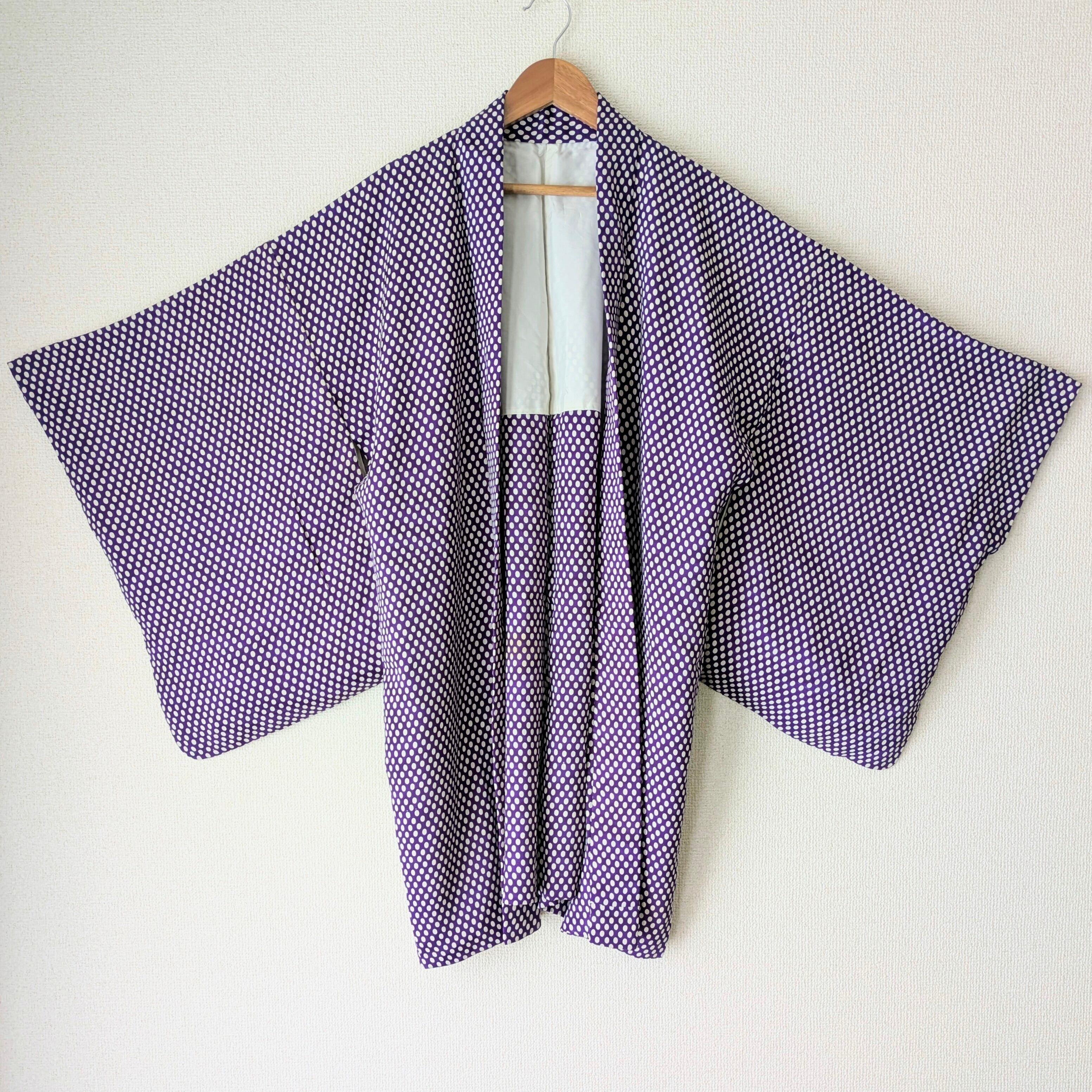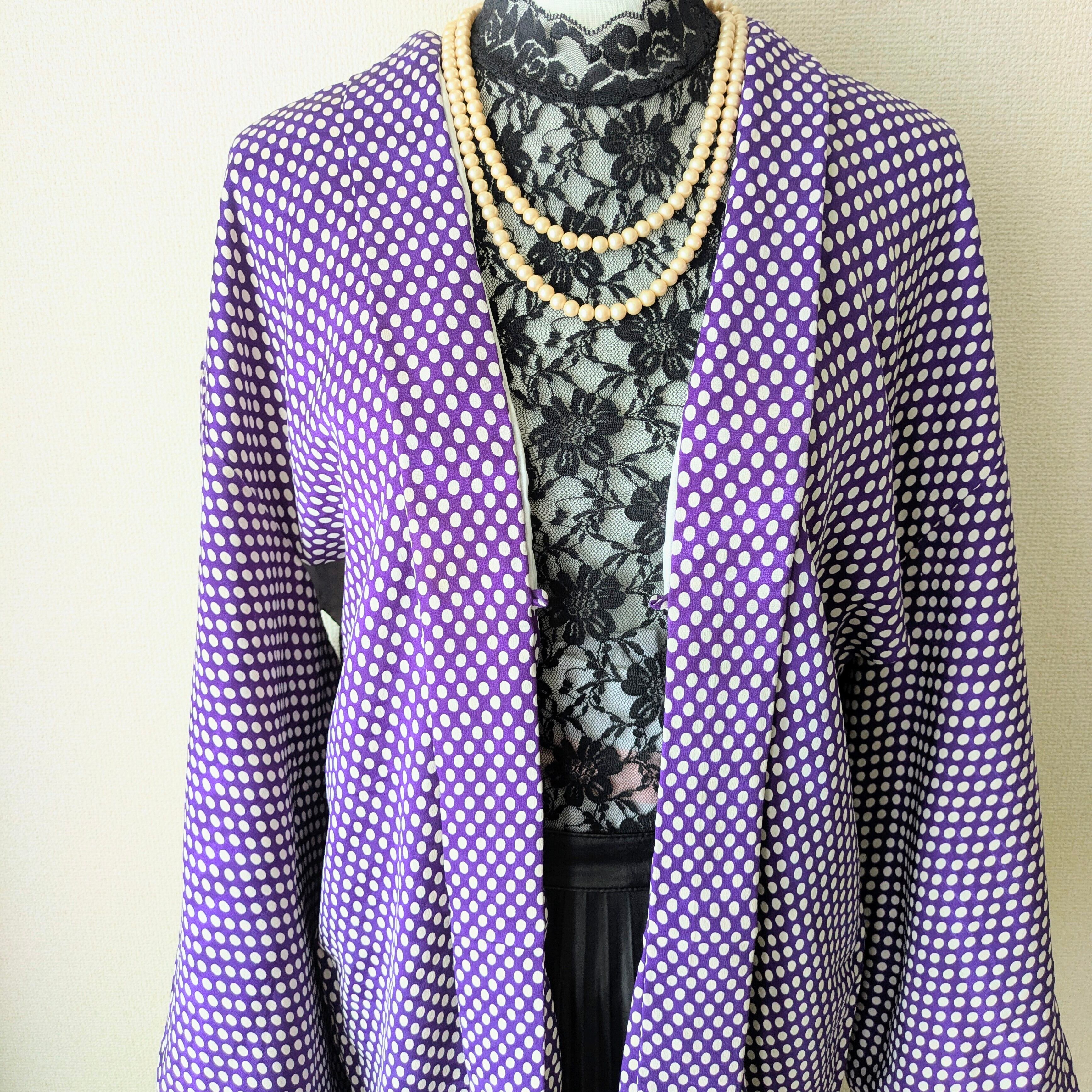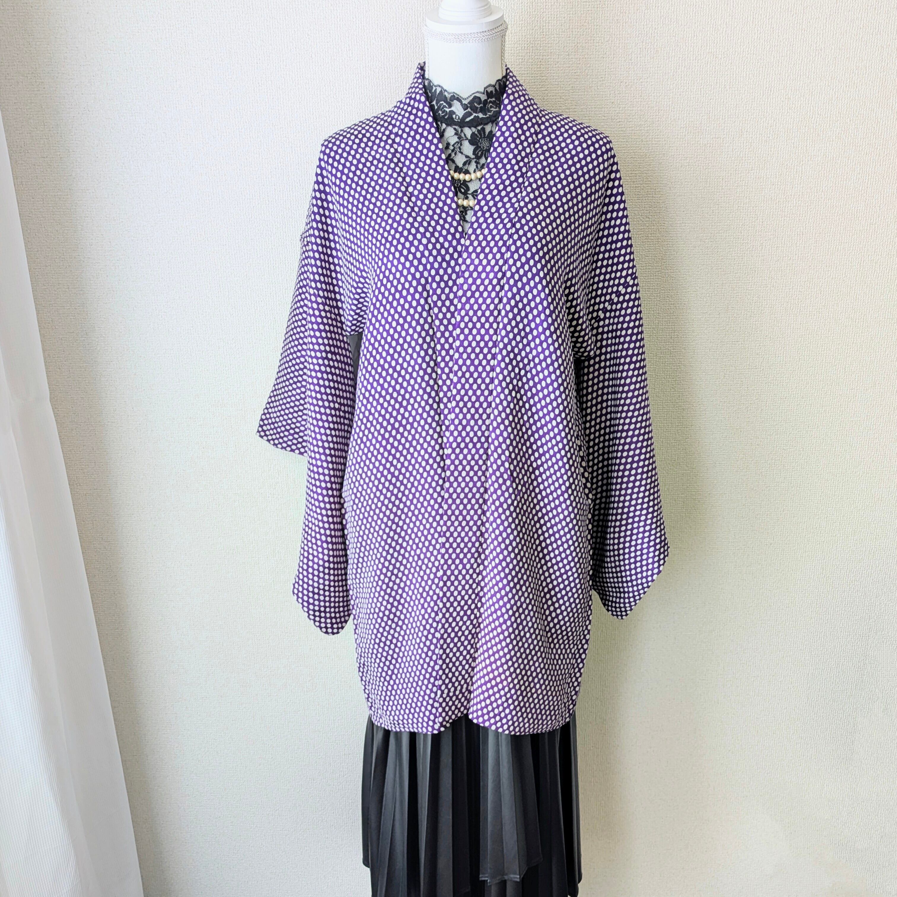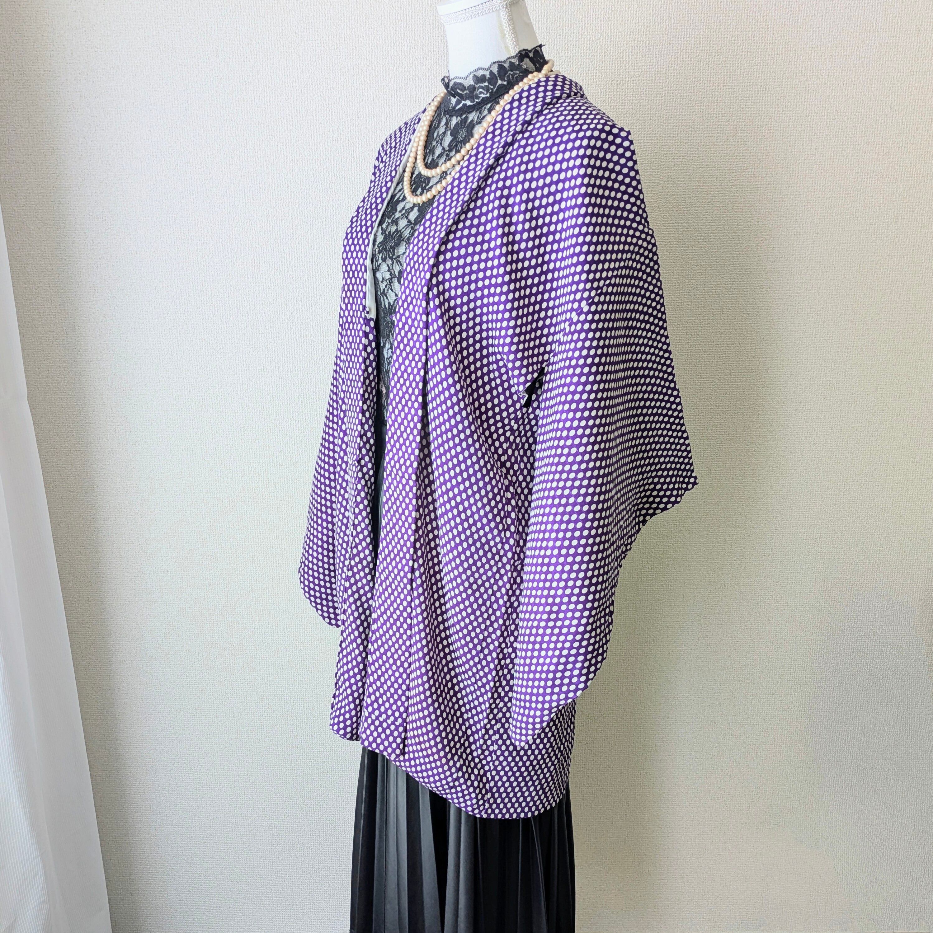紫地に白の水玉模様があしらわれた羽織です。