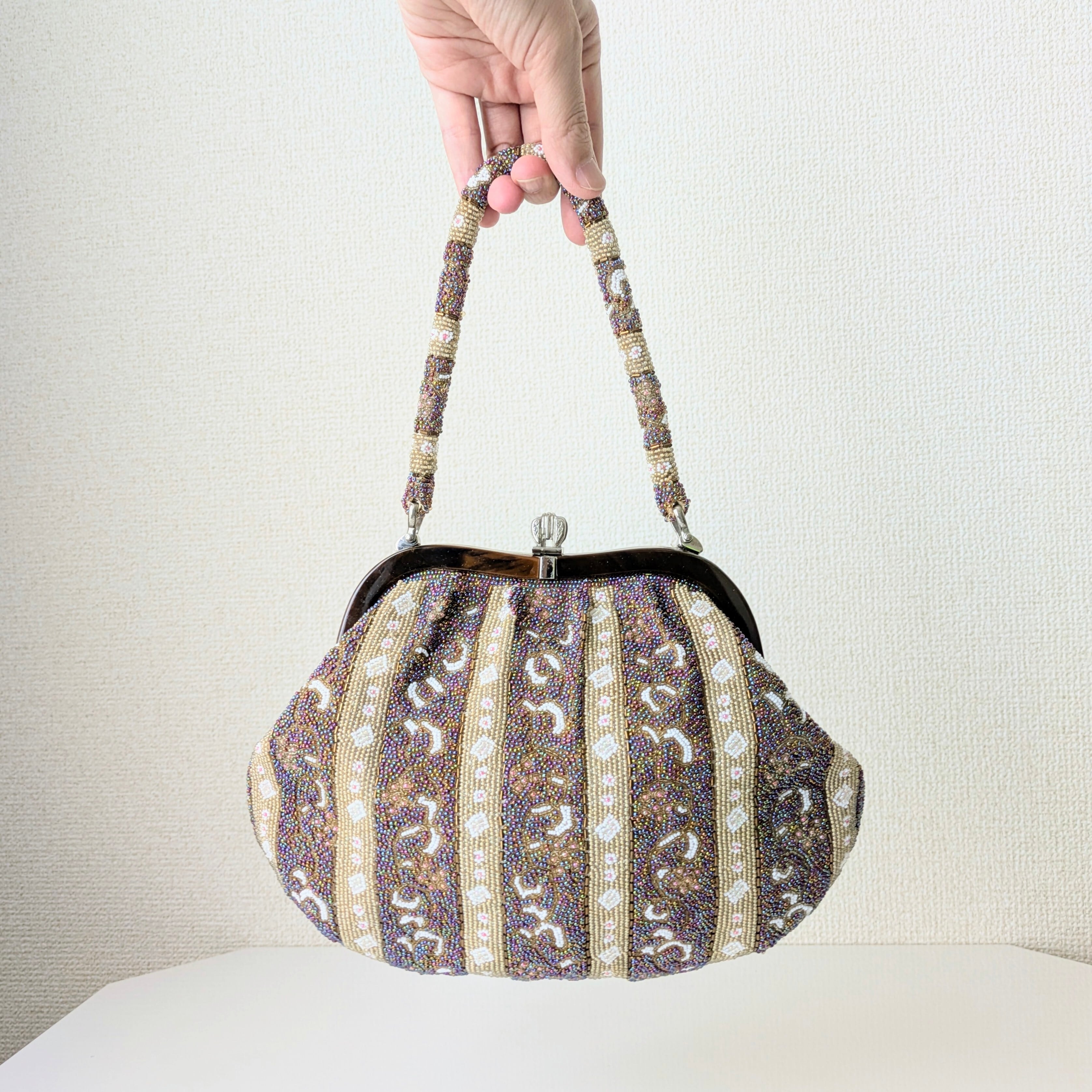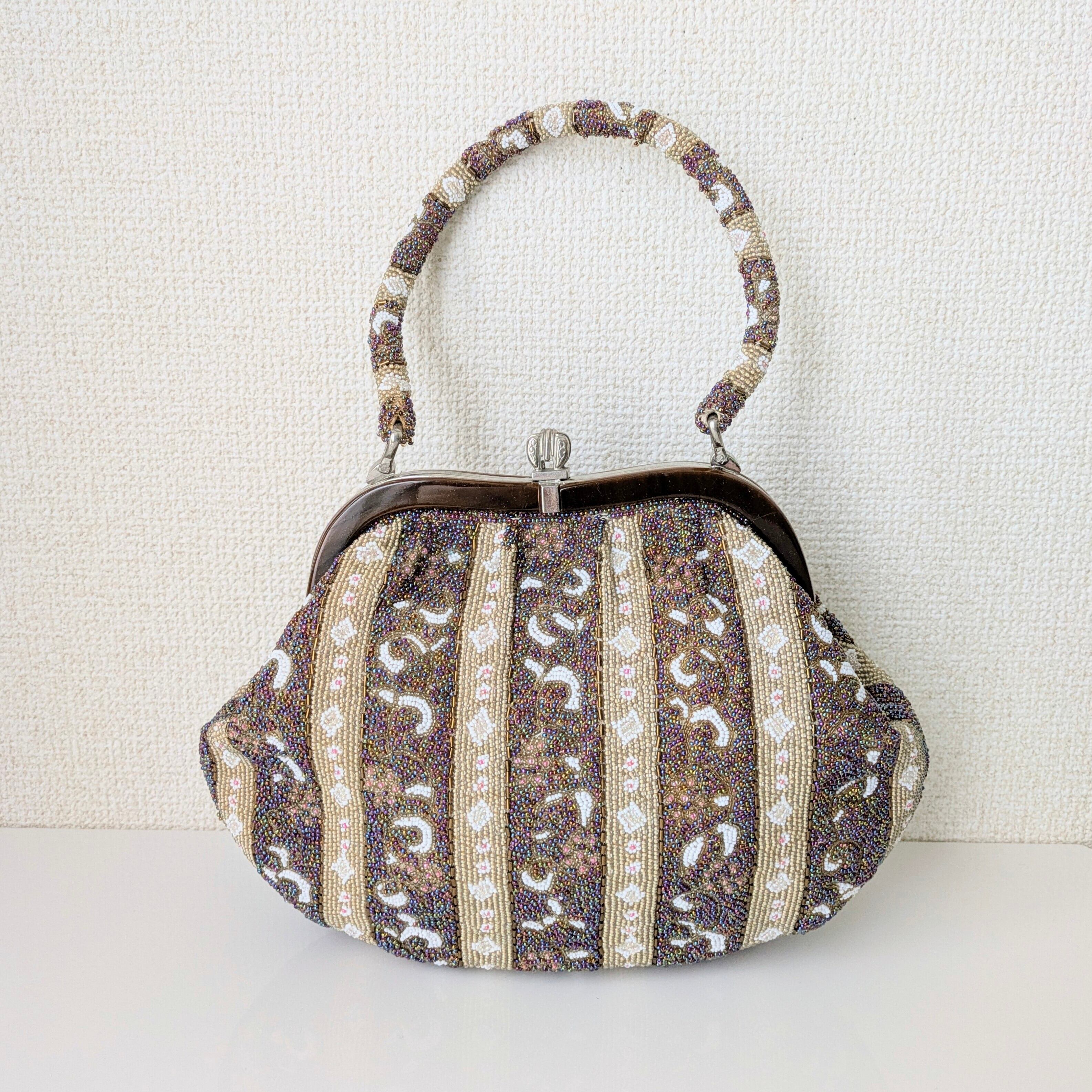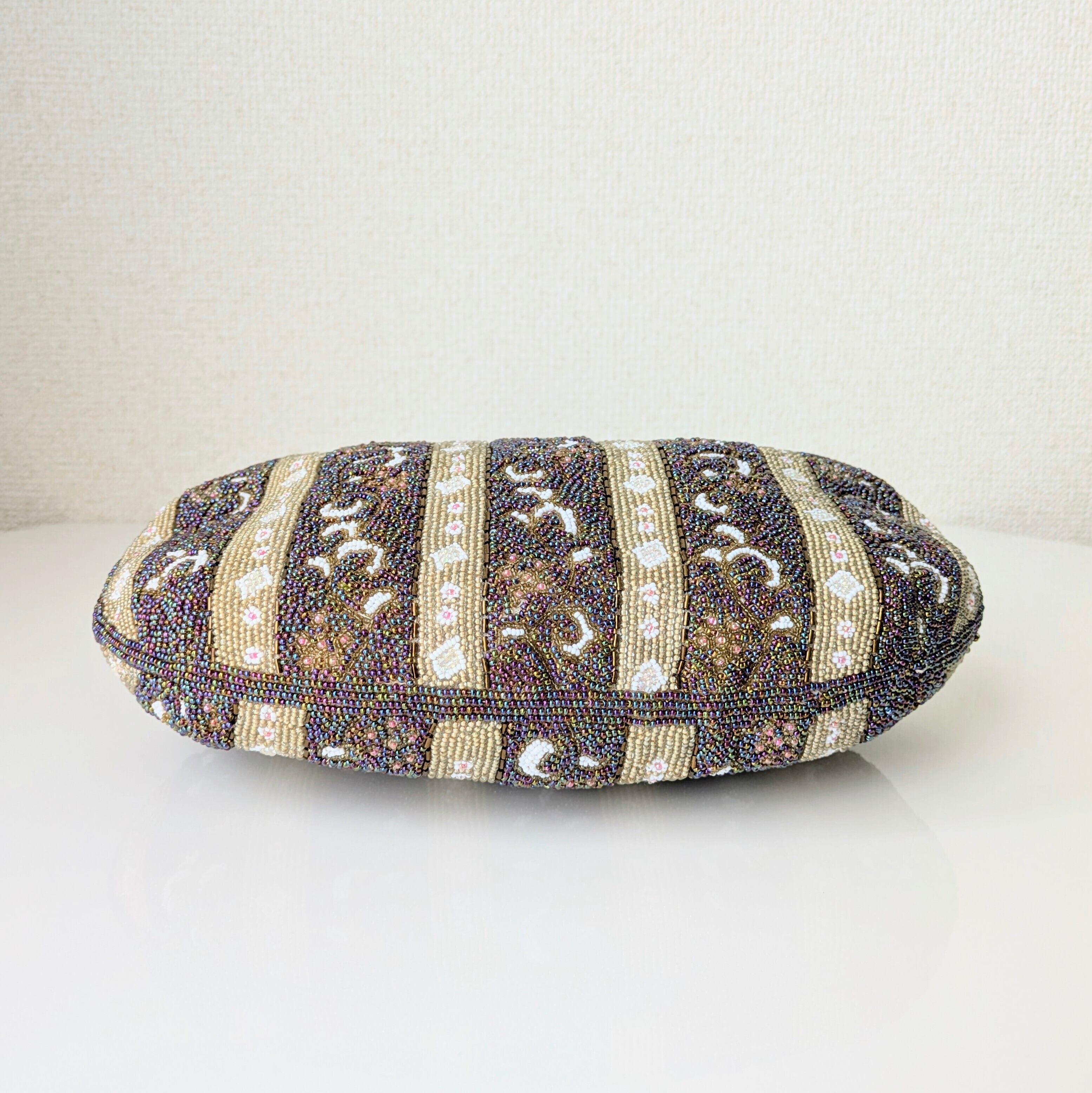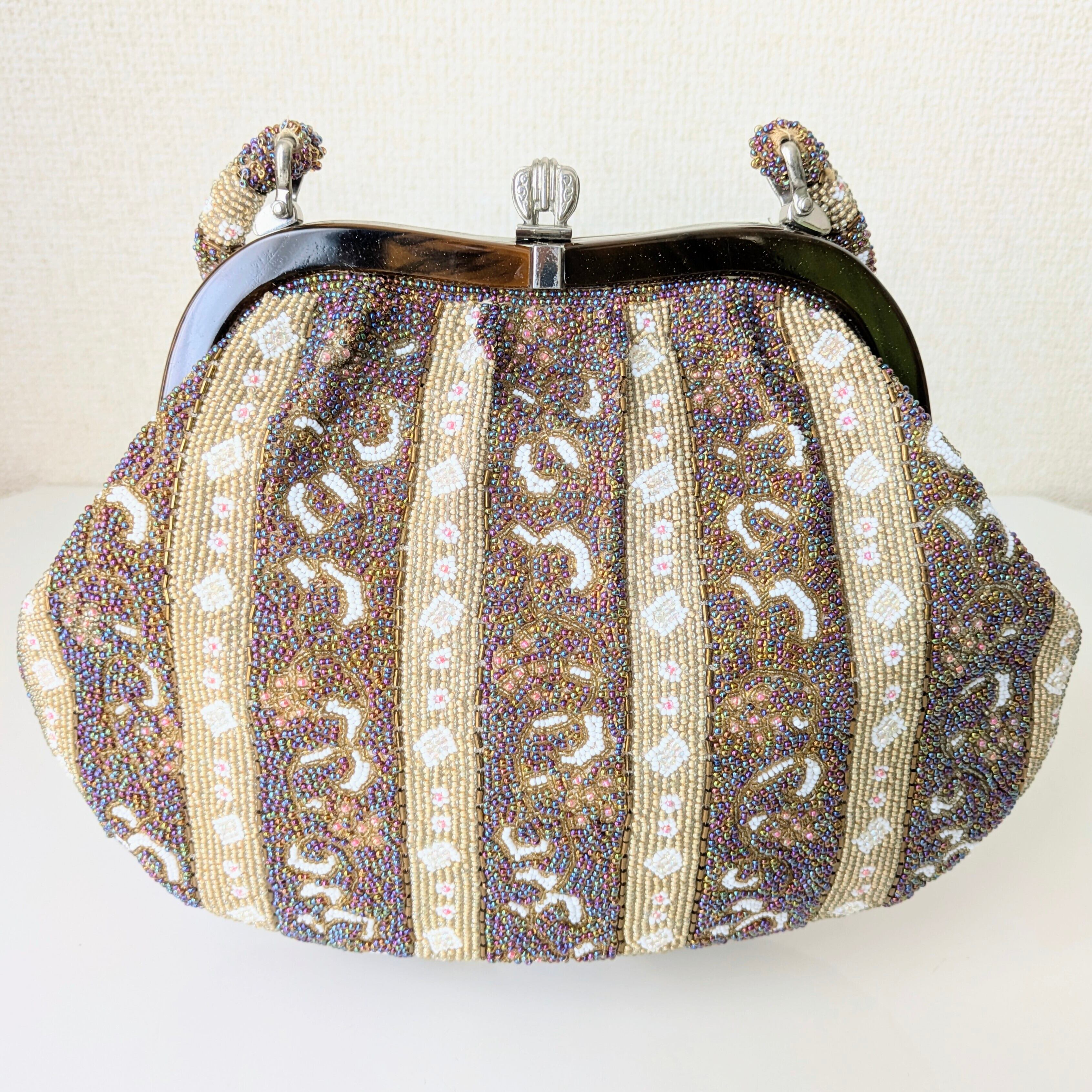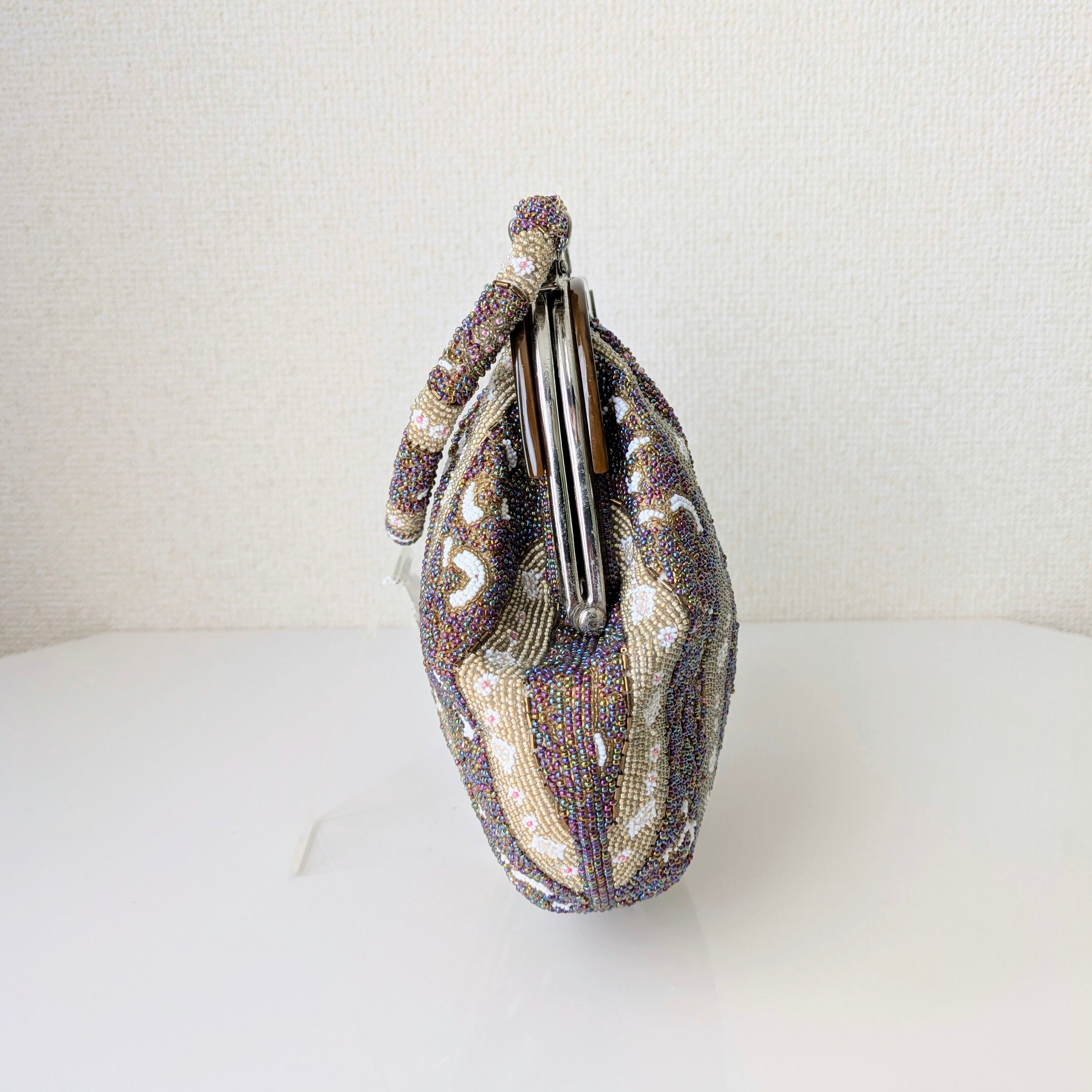 光を受けて美しく輝くヴィンテージビーズバッグ。