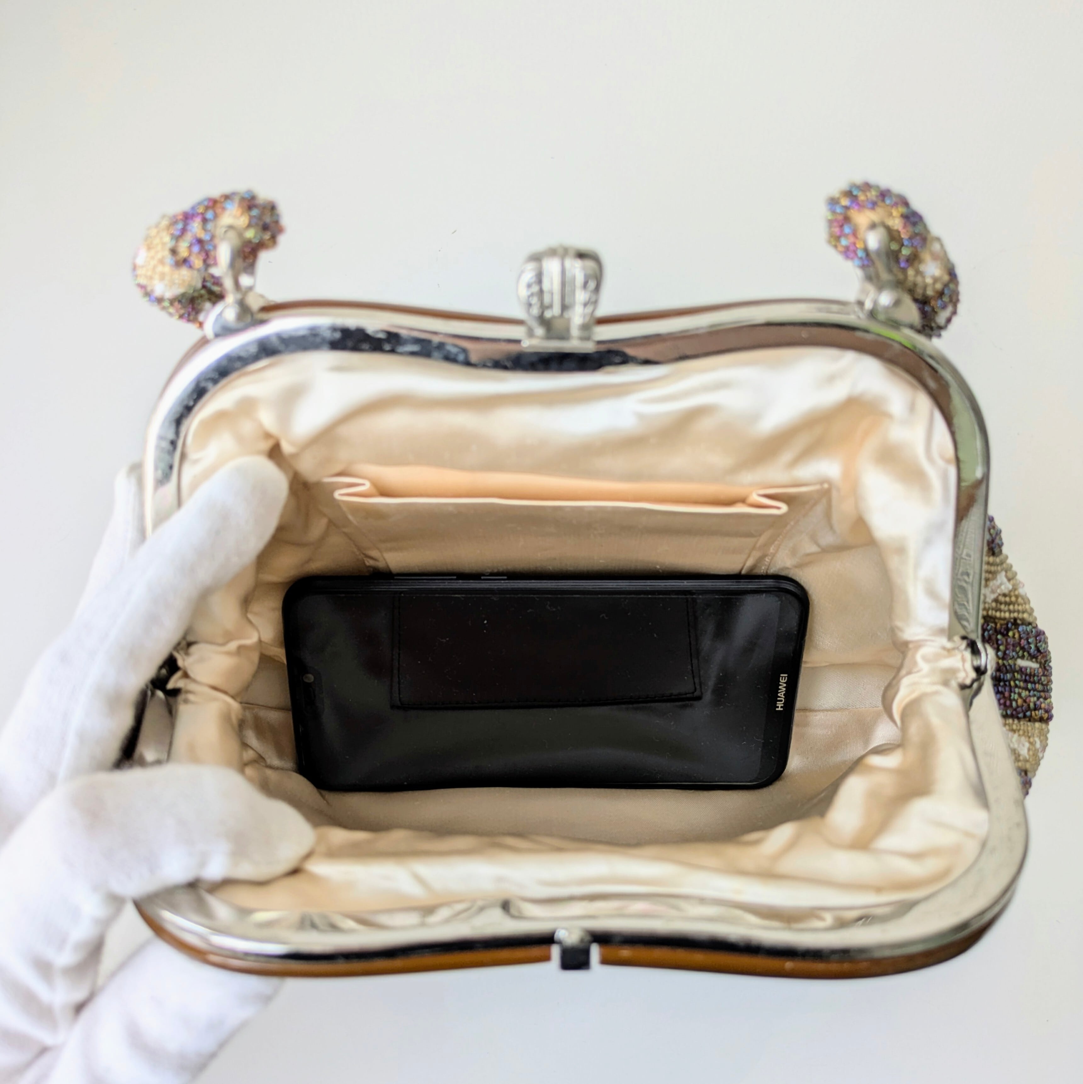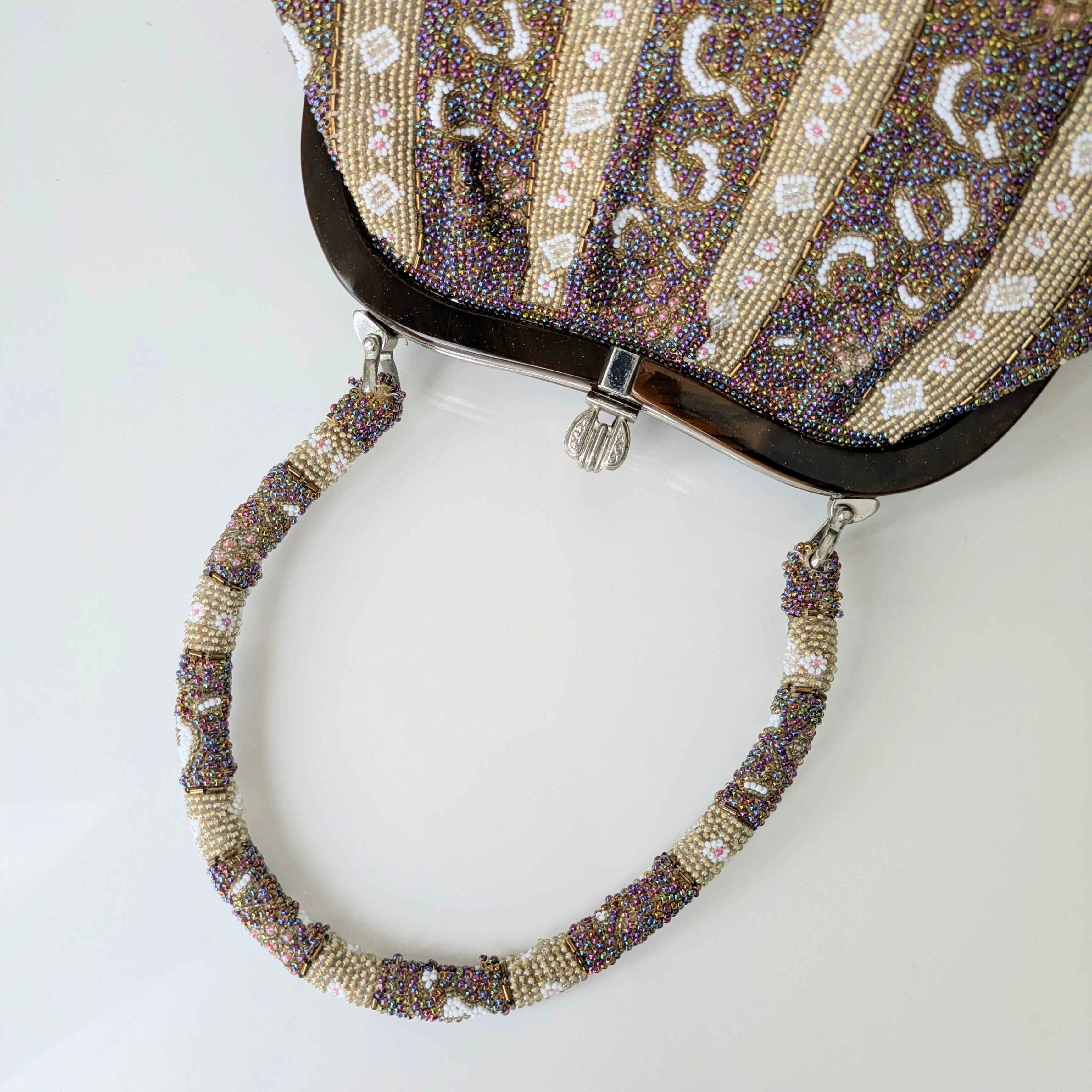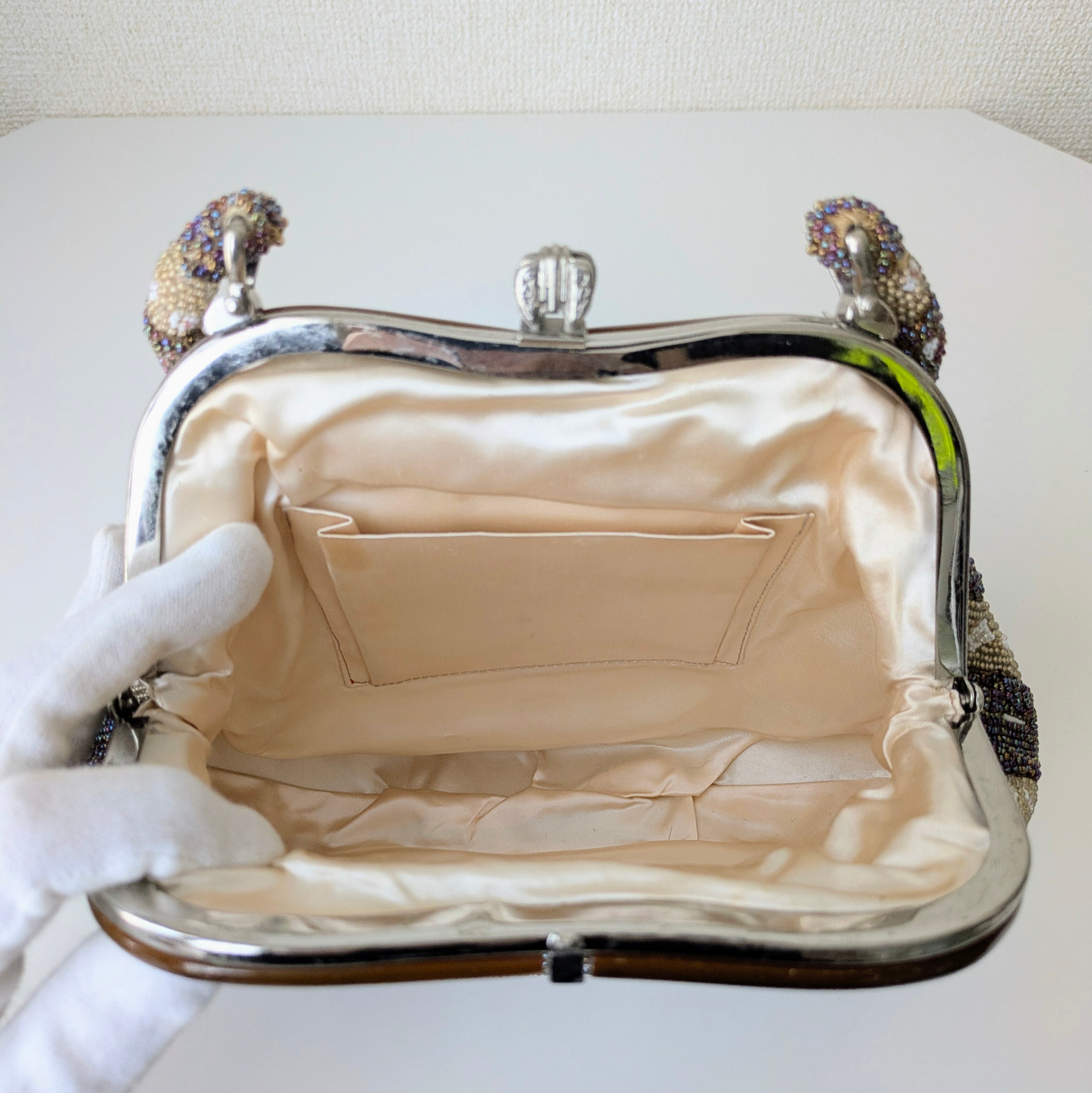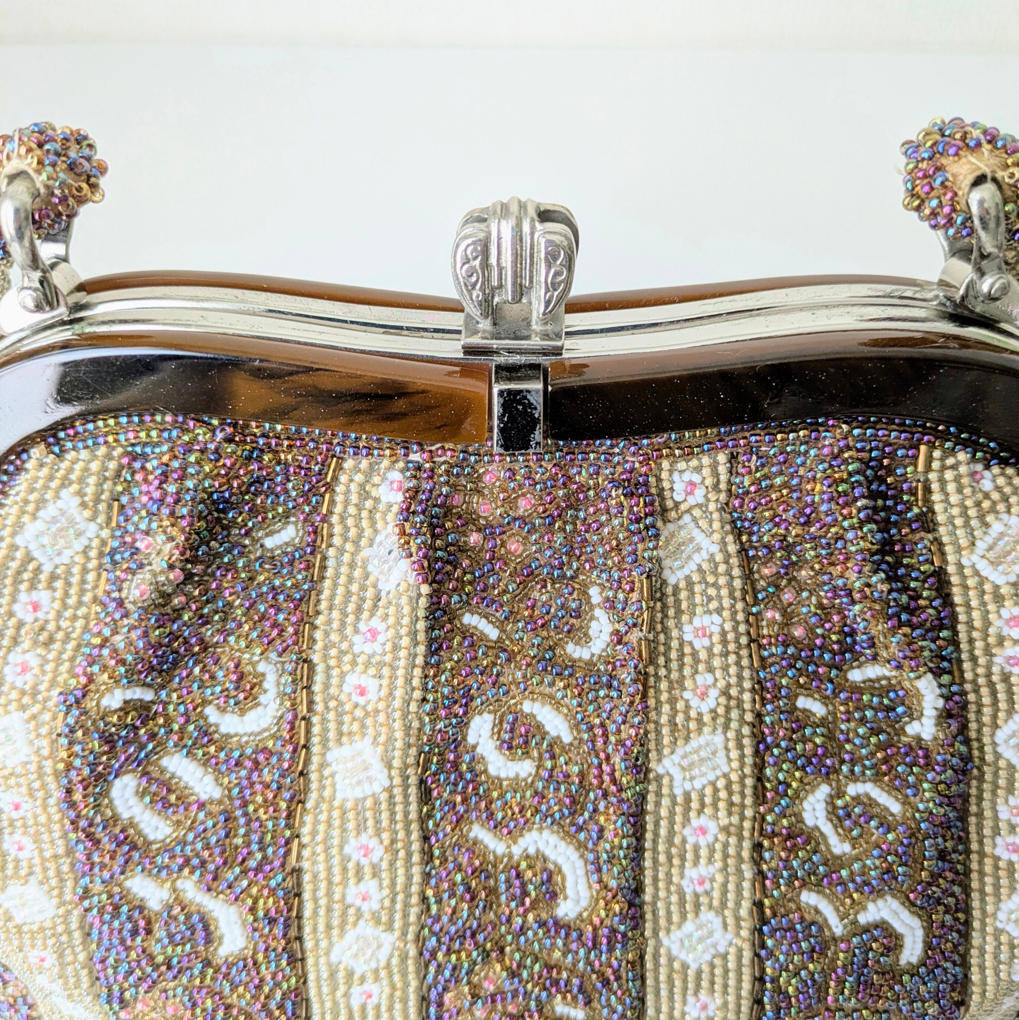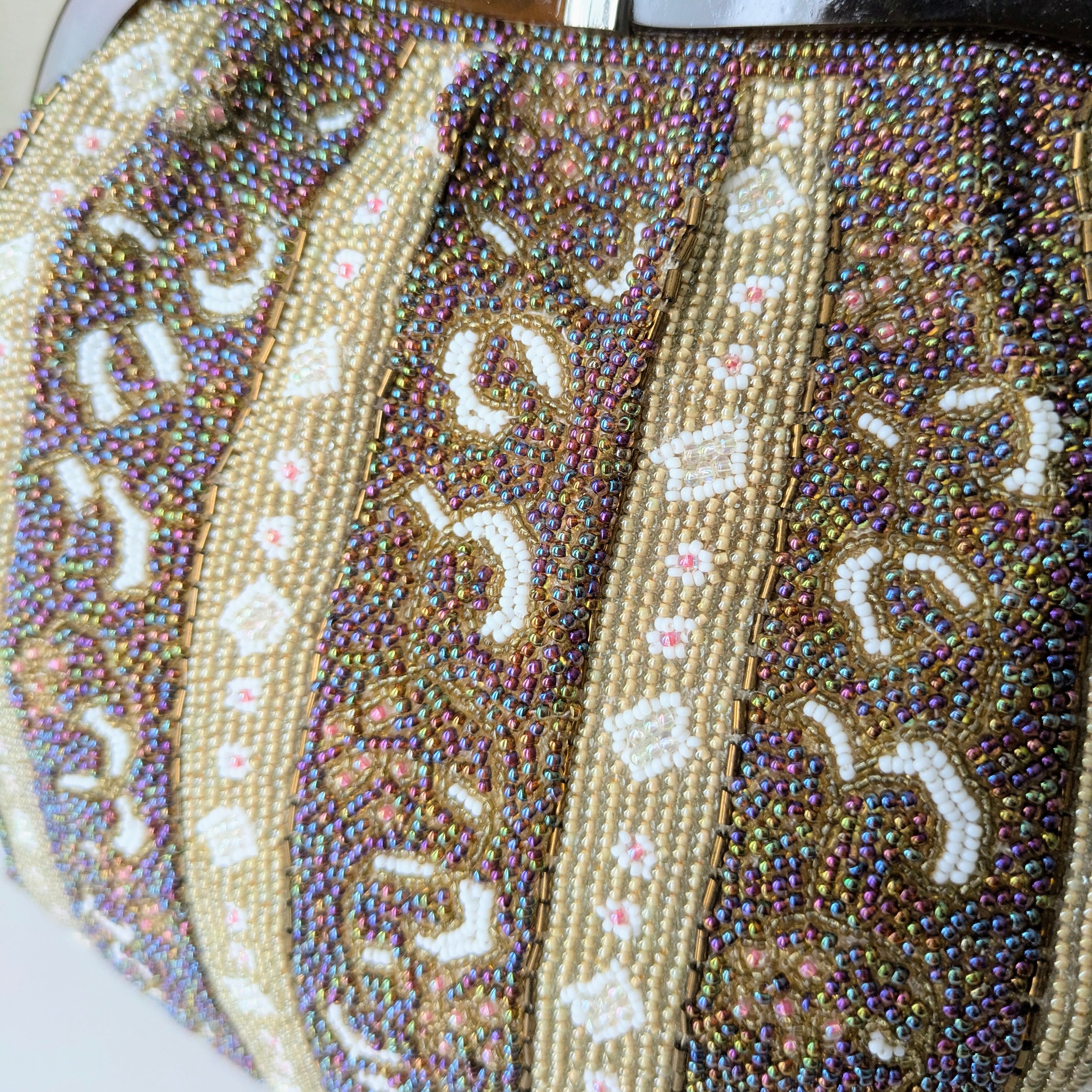 光を受けて美しく輝くヴィンテージビーズバッグ。