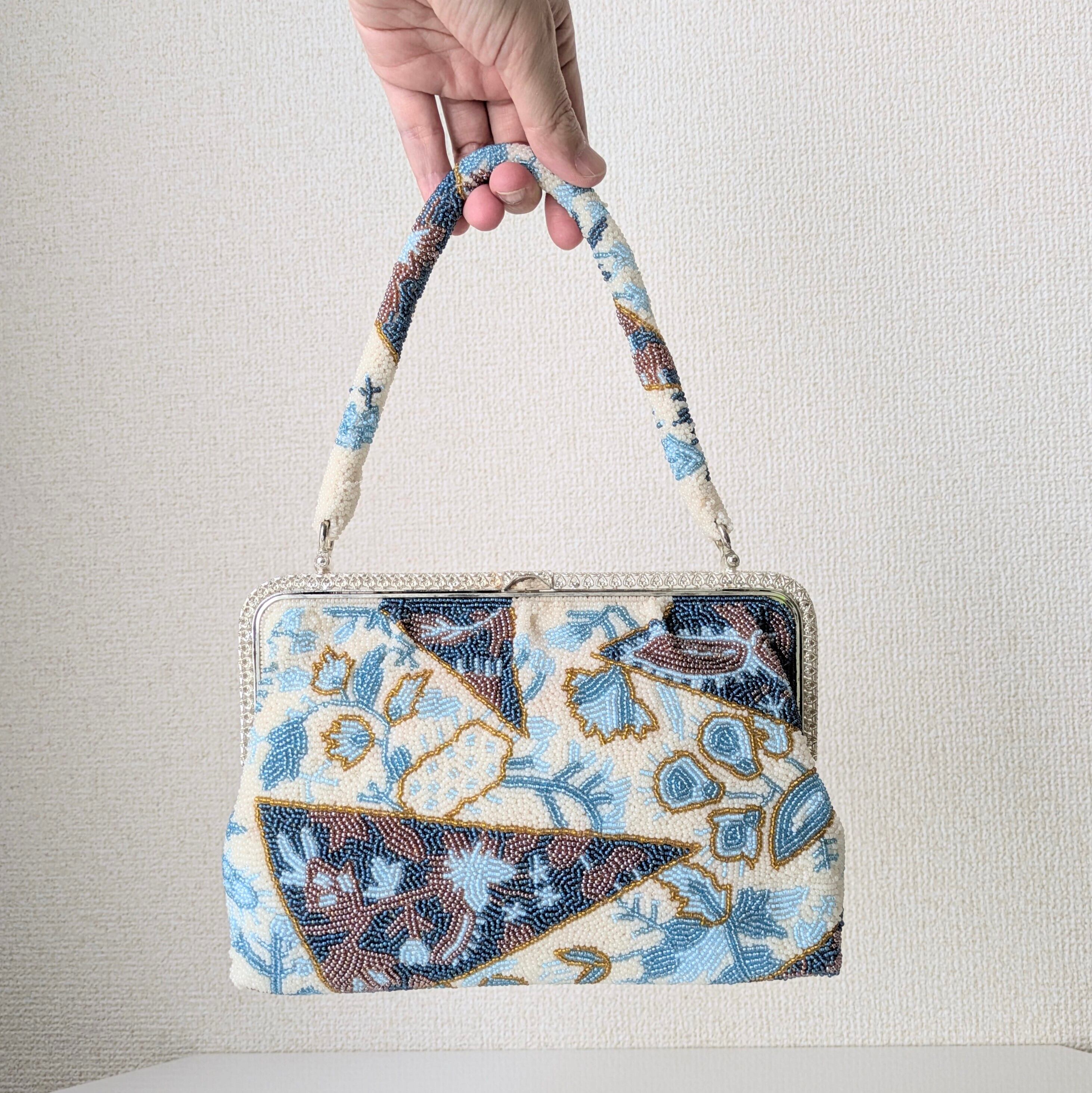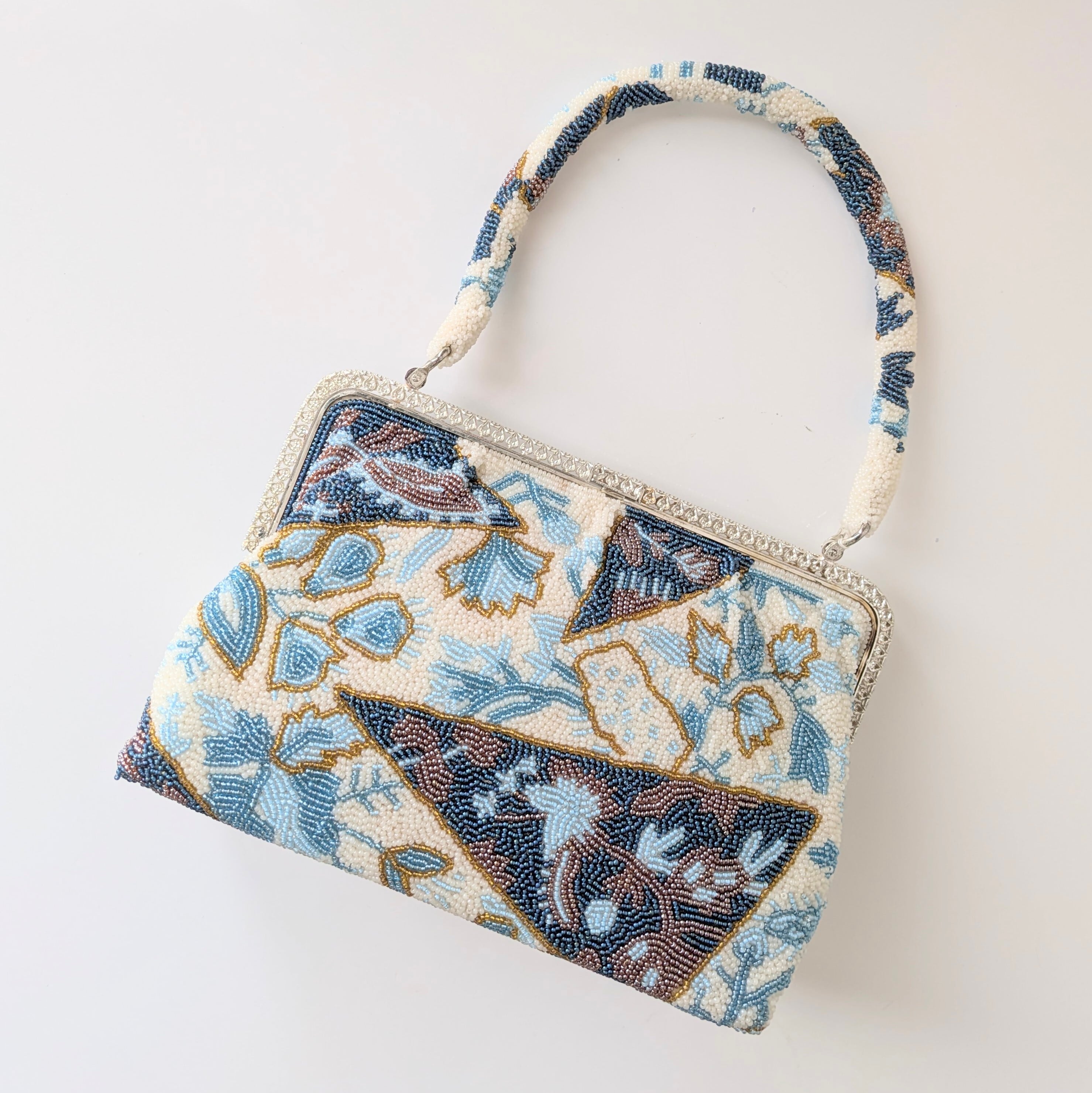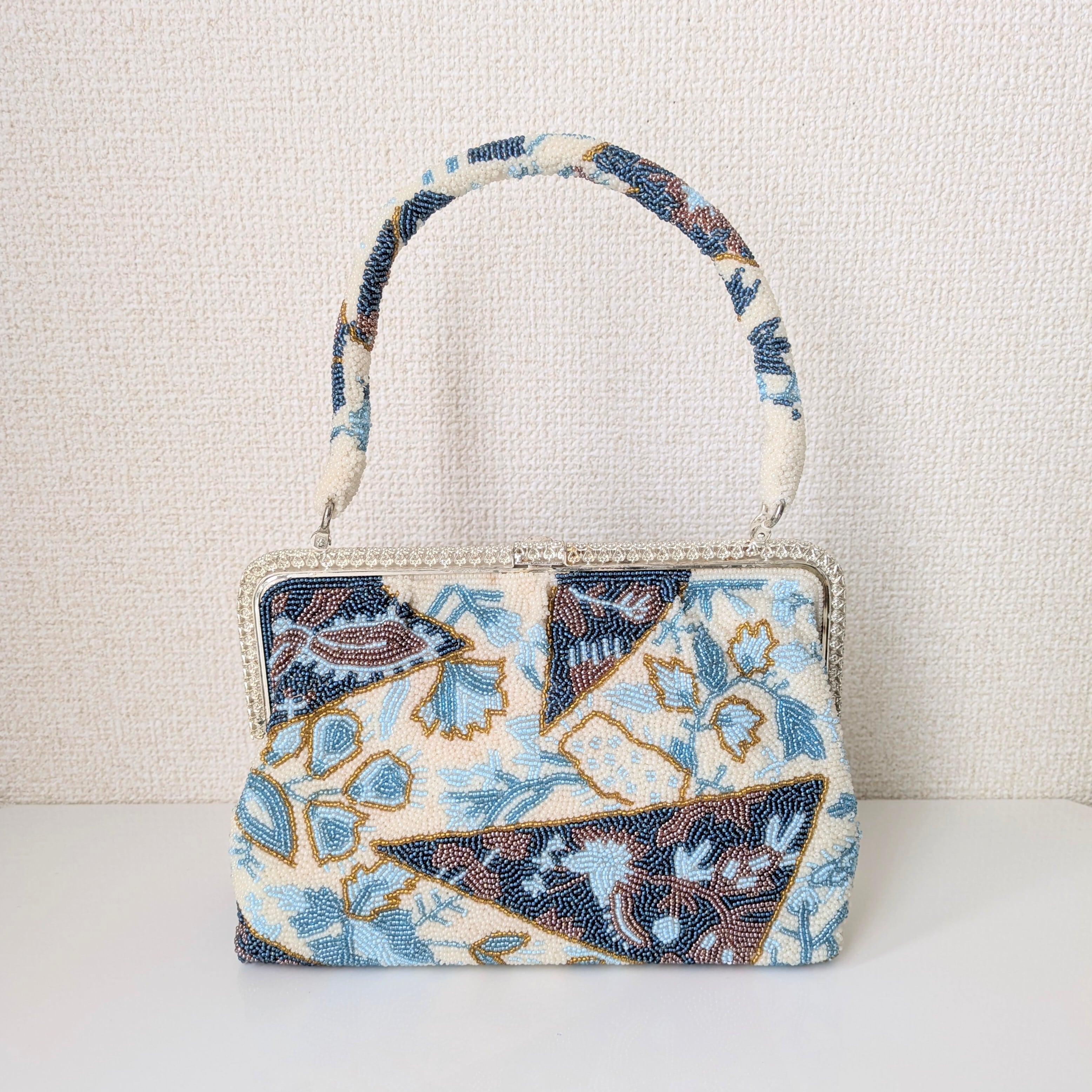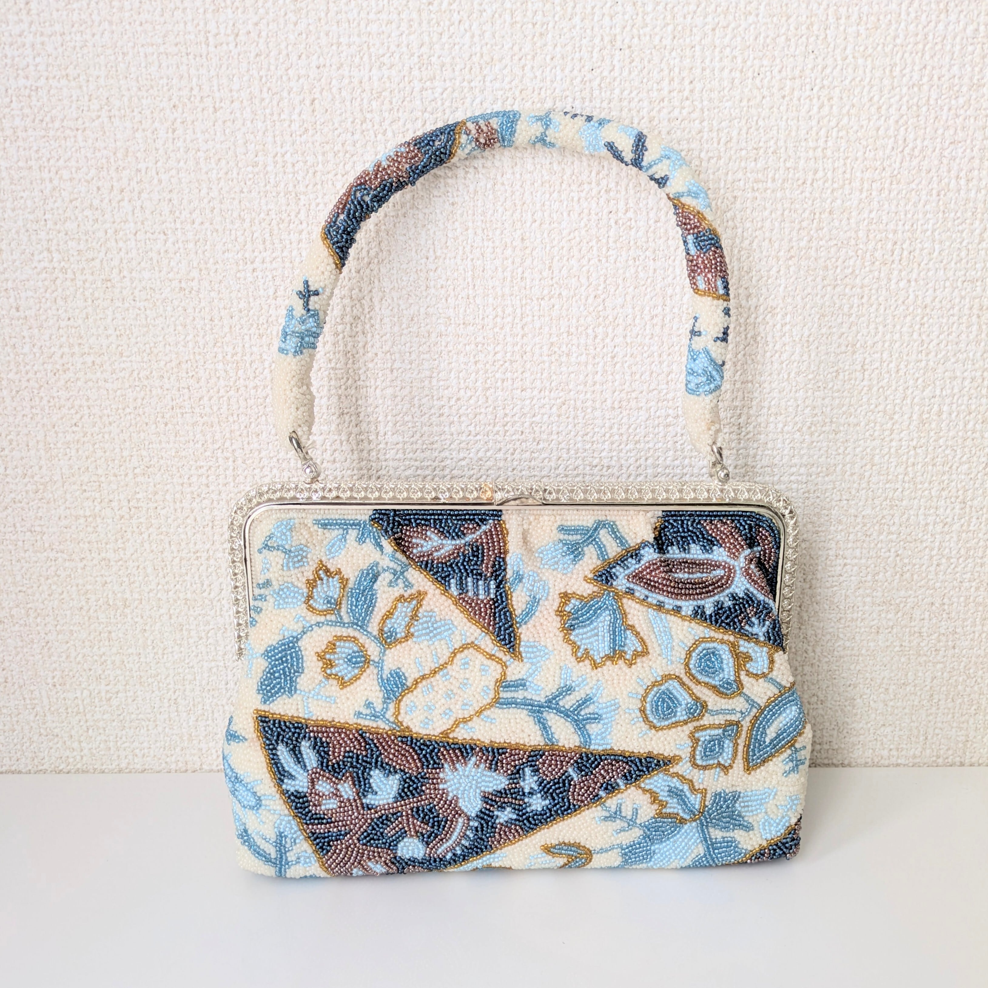オフホワイトにブルーで描かれた抽象的な花柄がポップで可愛らしい雰囲気を醸し出しているビーズバッグ。