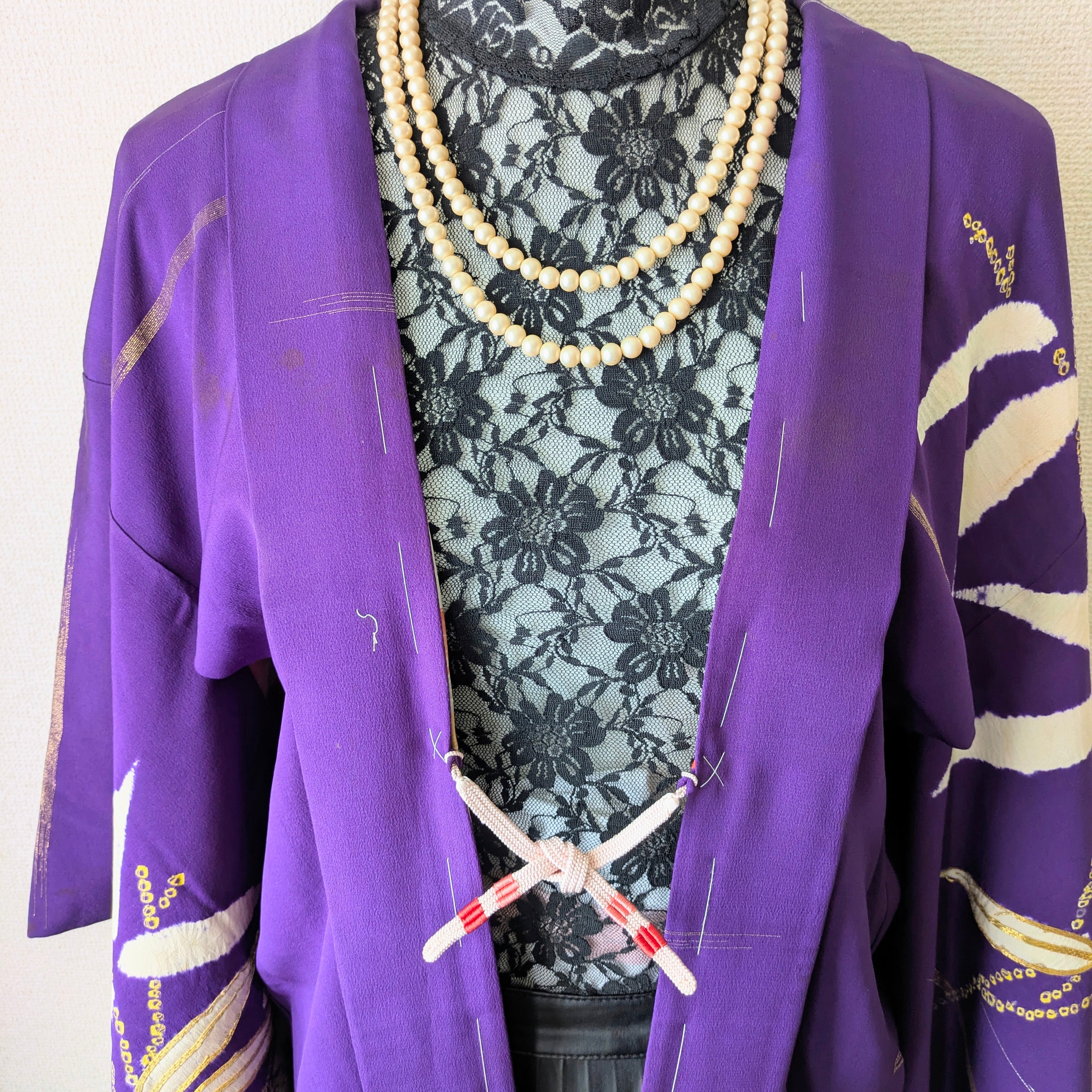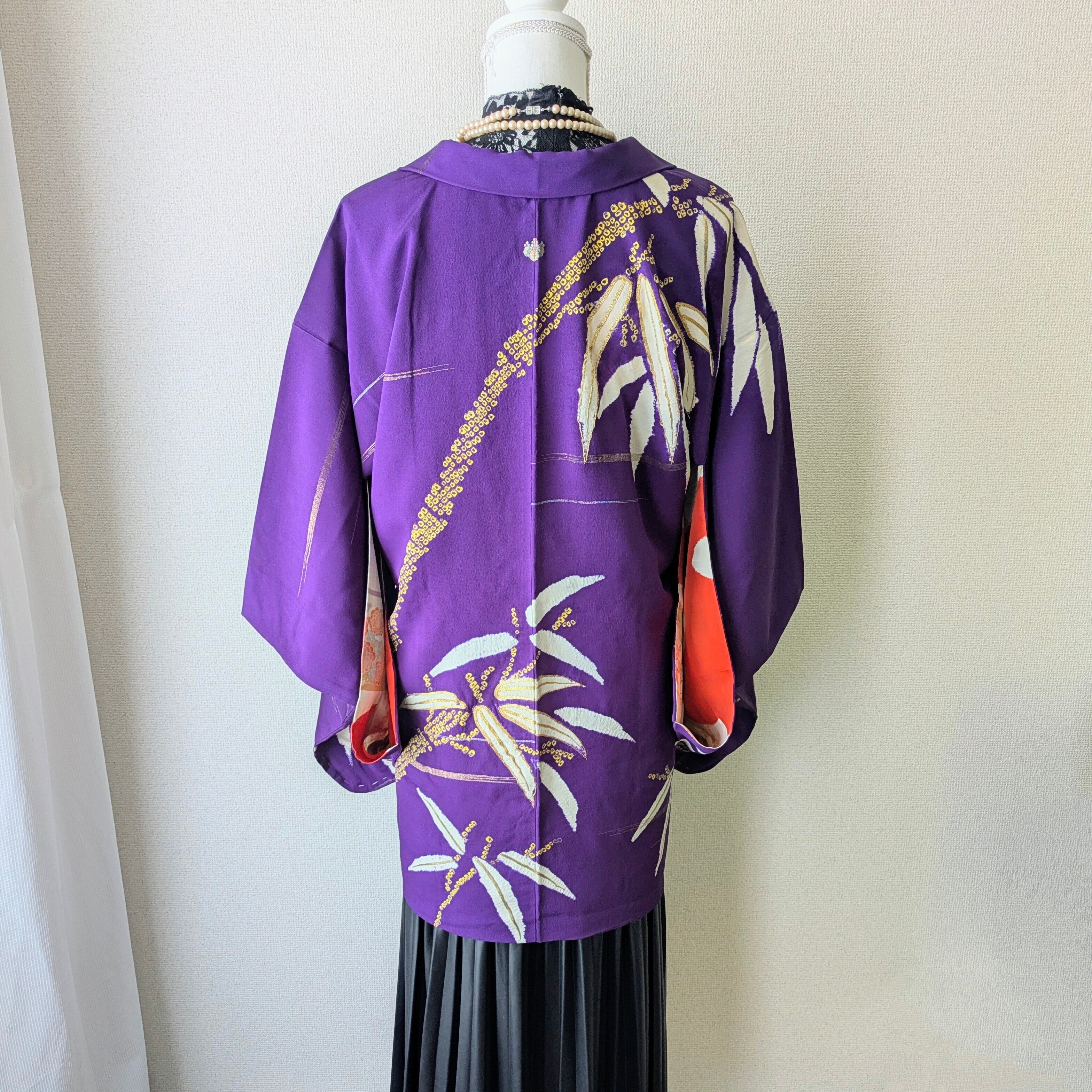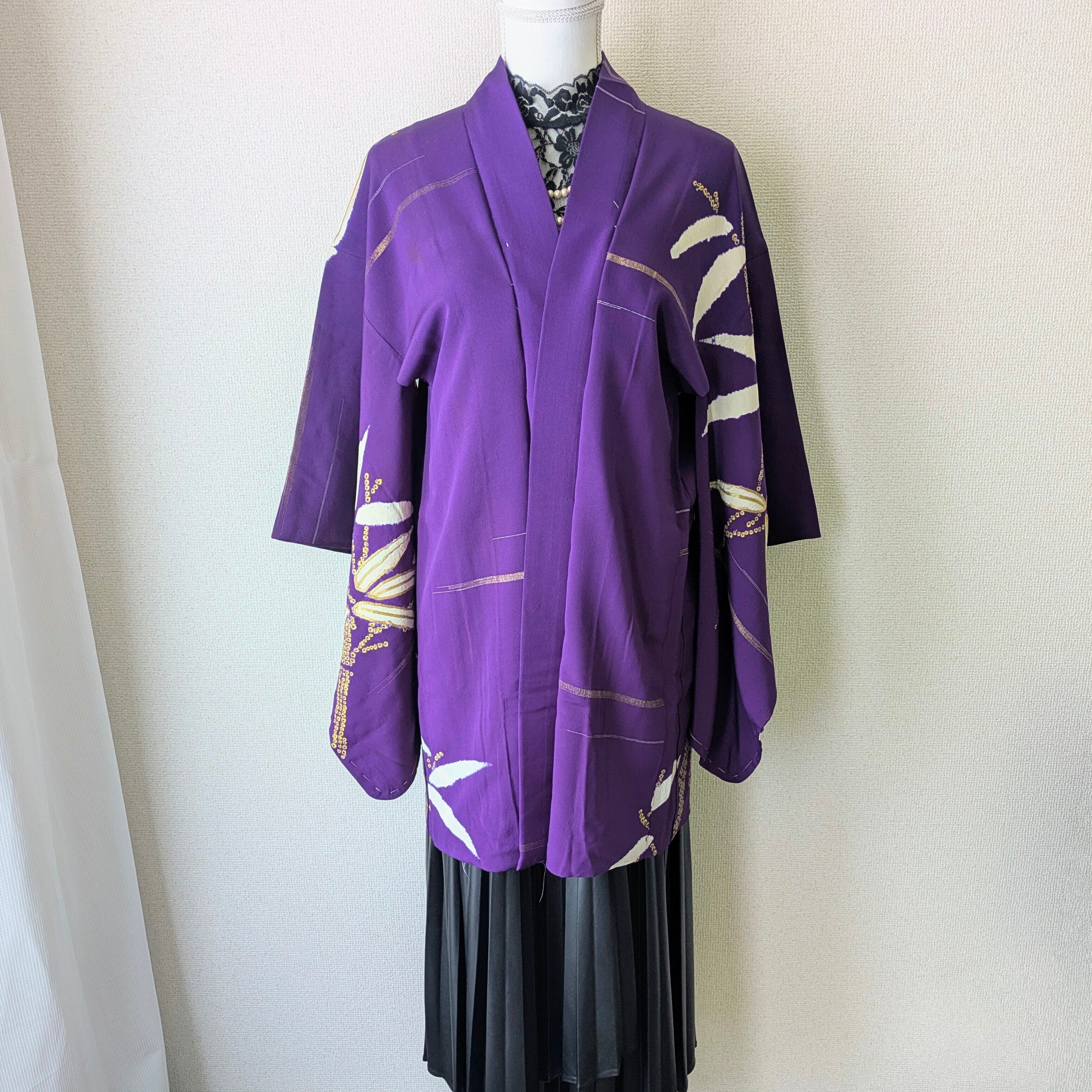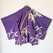 紫地に竹の模様が大胆に描かれた羽織です。紋は縫い紋になっており、笹の葉部分には金糸があしらわれています。