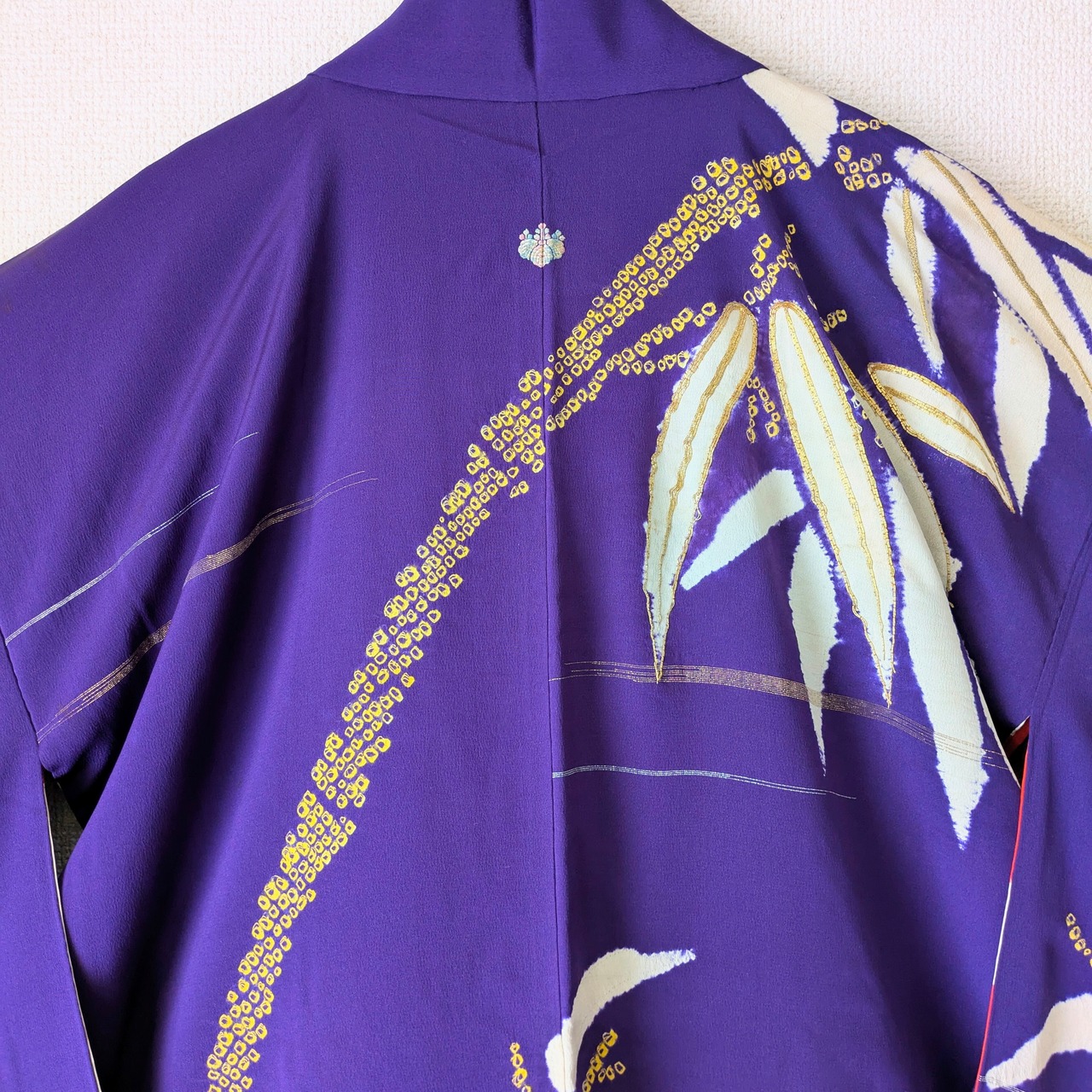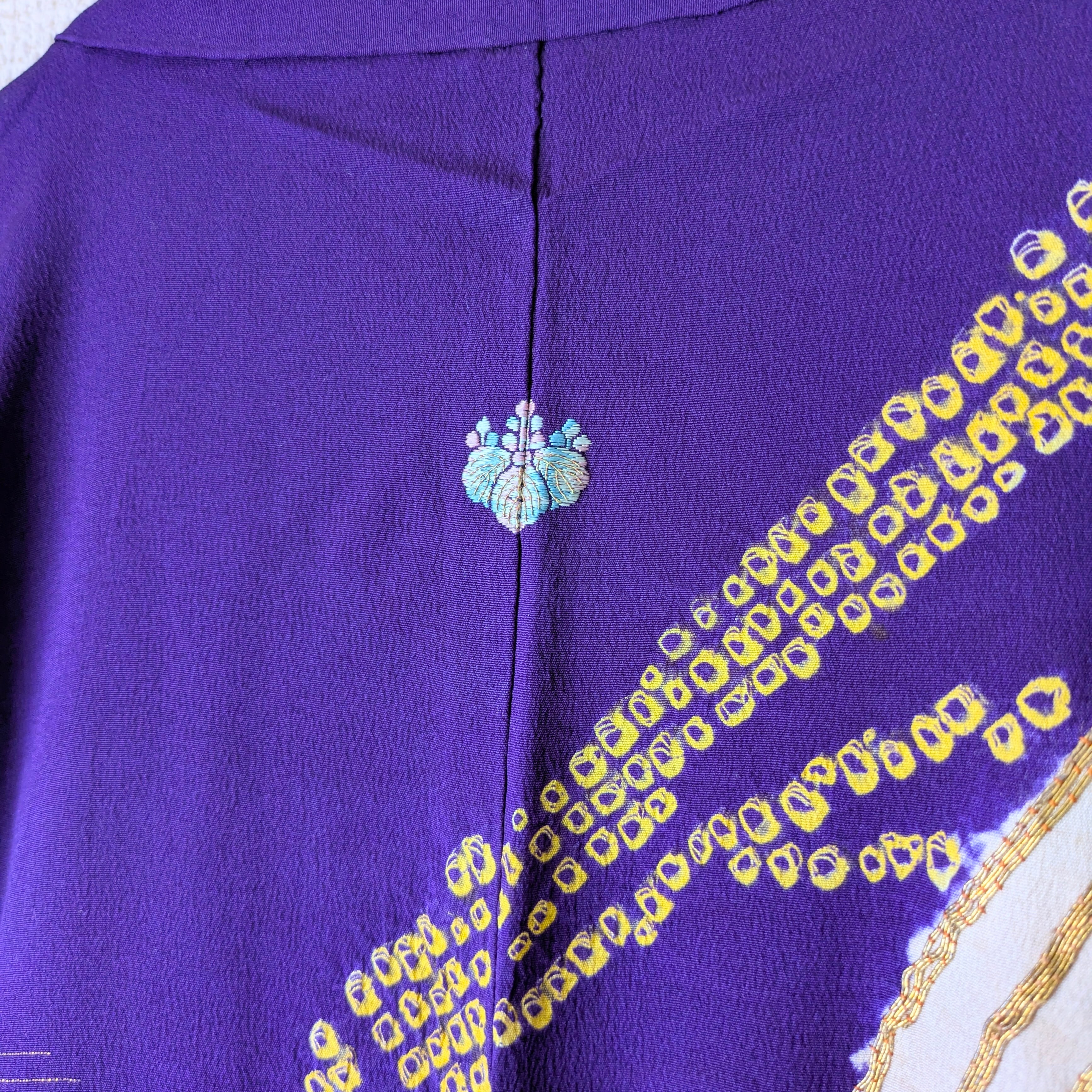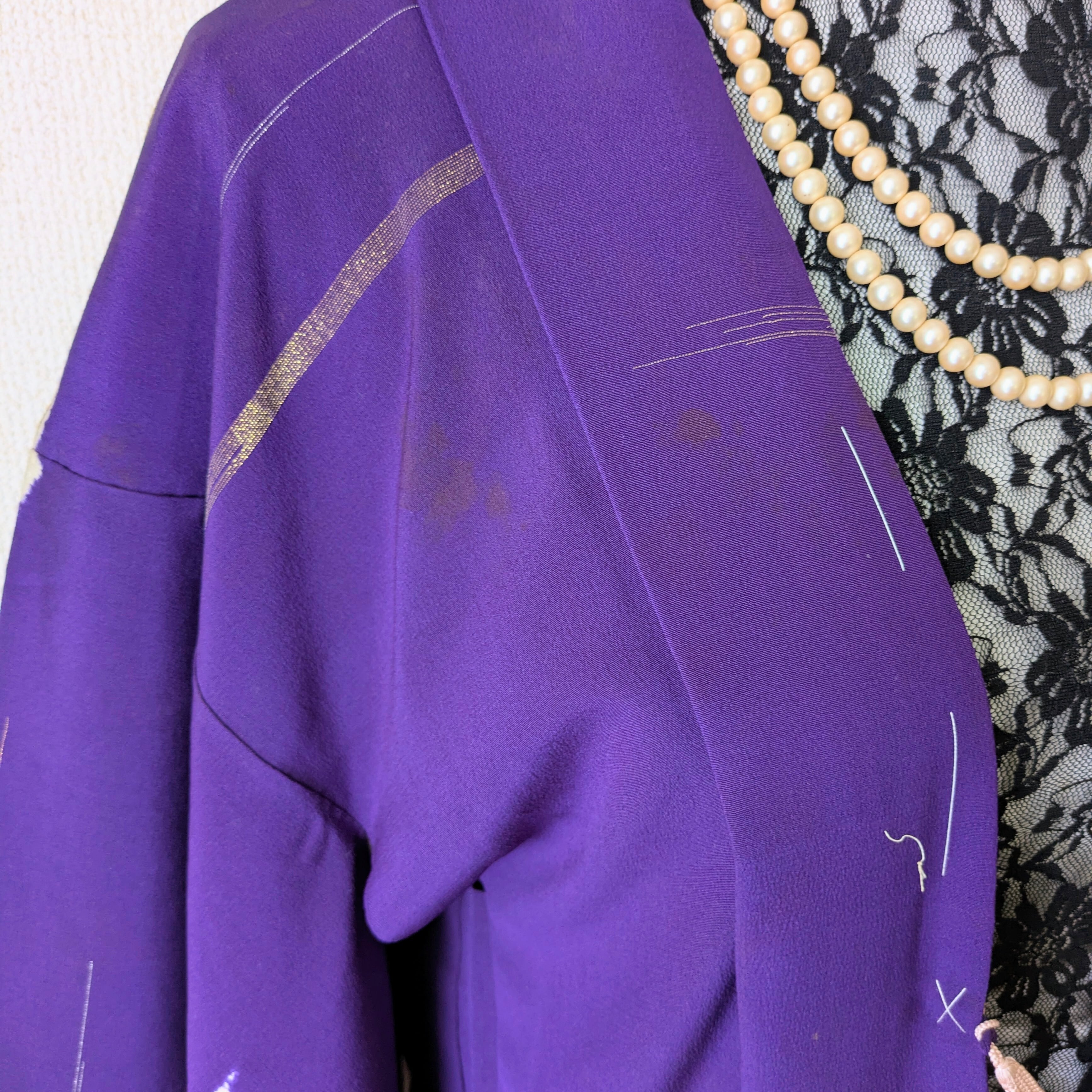 紫地に竹の模様が大胆に描かれた羽織です。紋は縫い紋になっており、笹の葉部分には金糸があしらわれています。