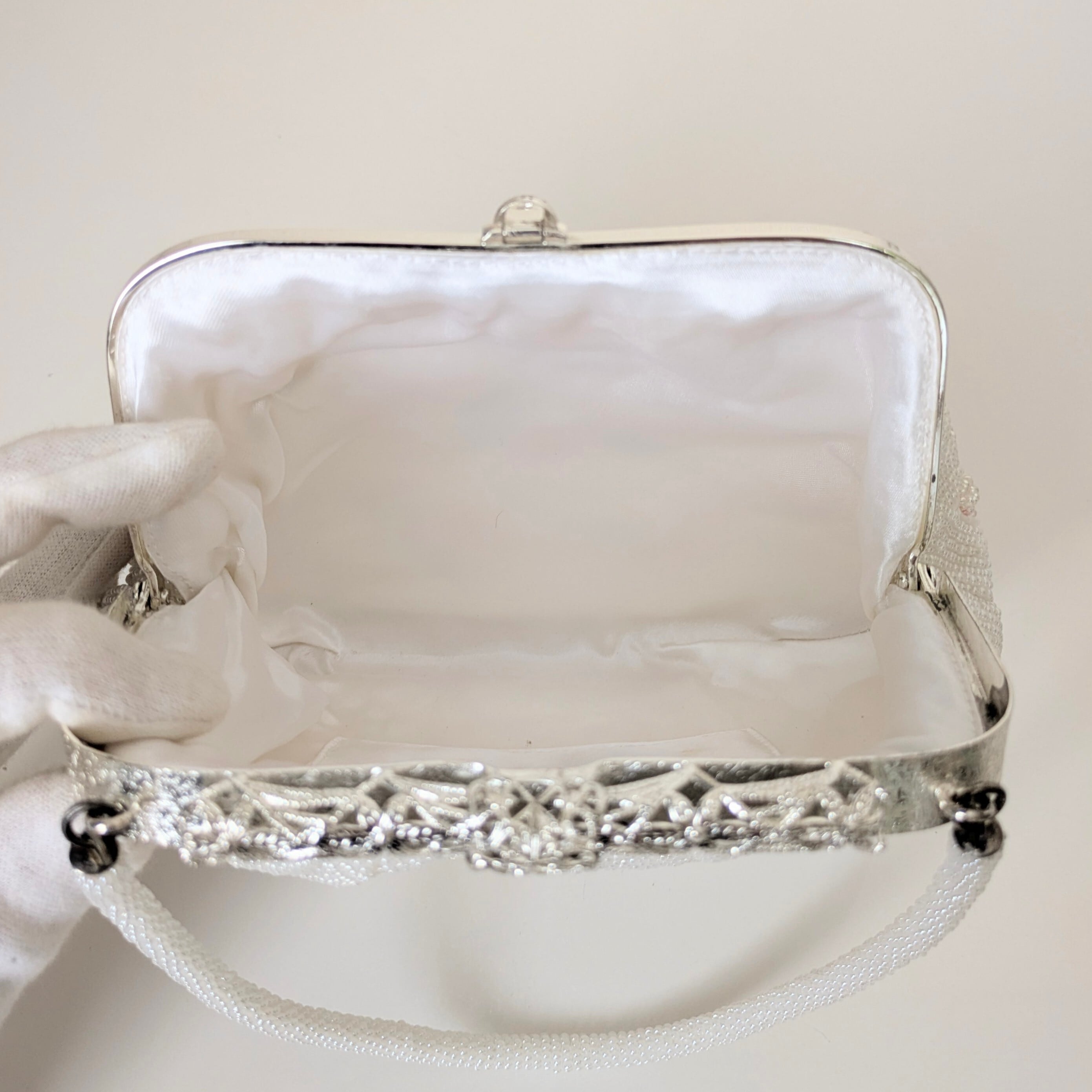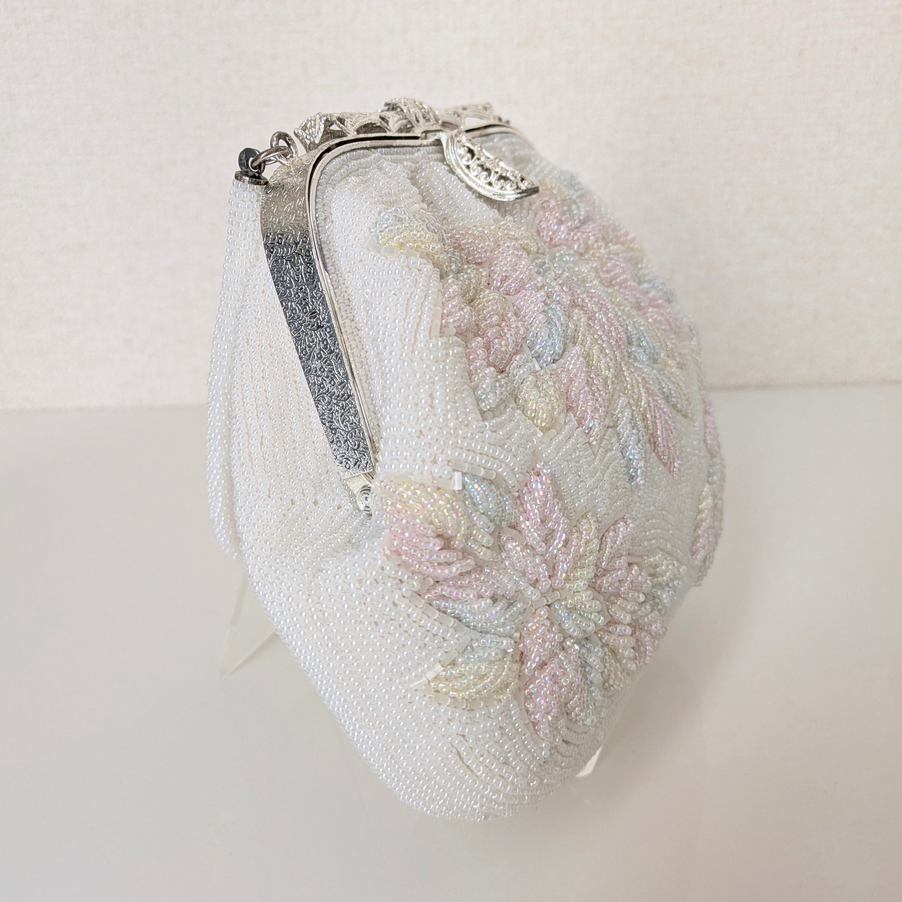 光を受けて美しく輝くヴィンテージビーズバッグ。