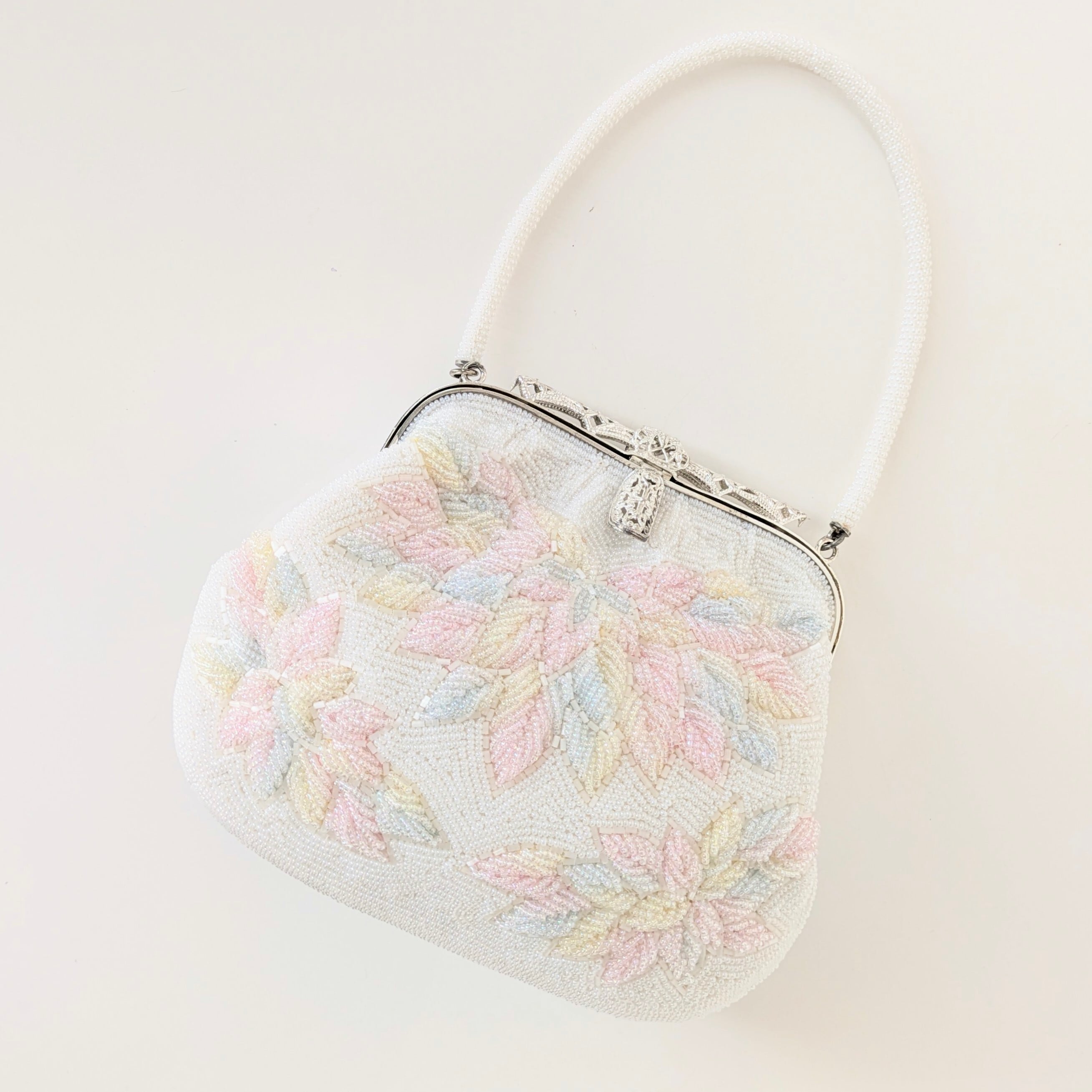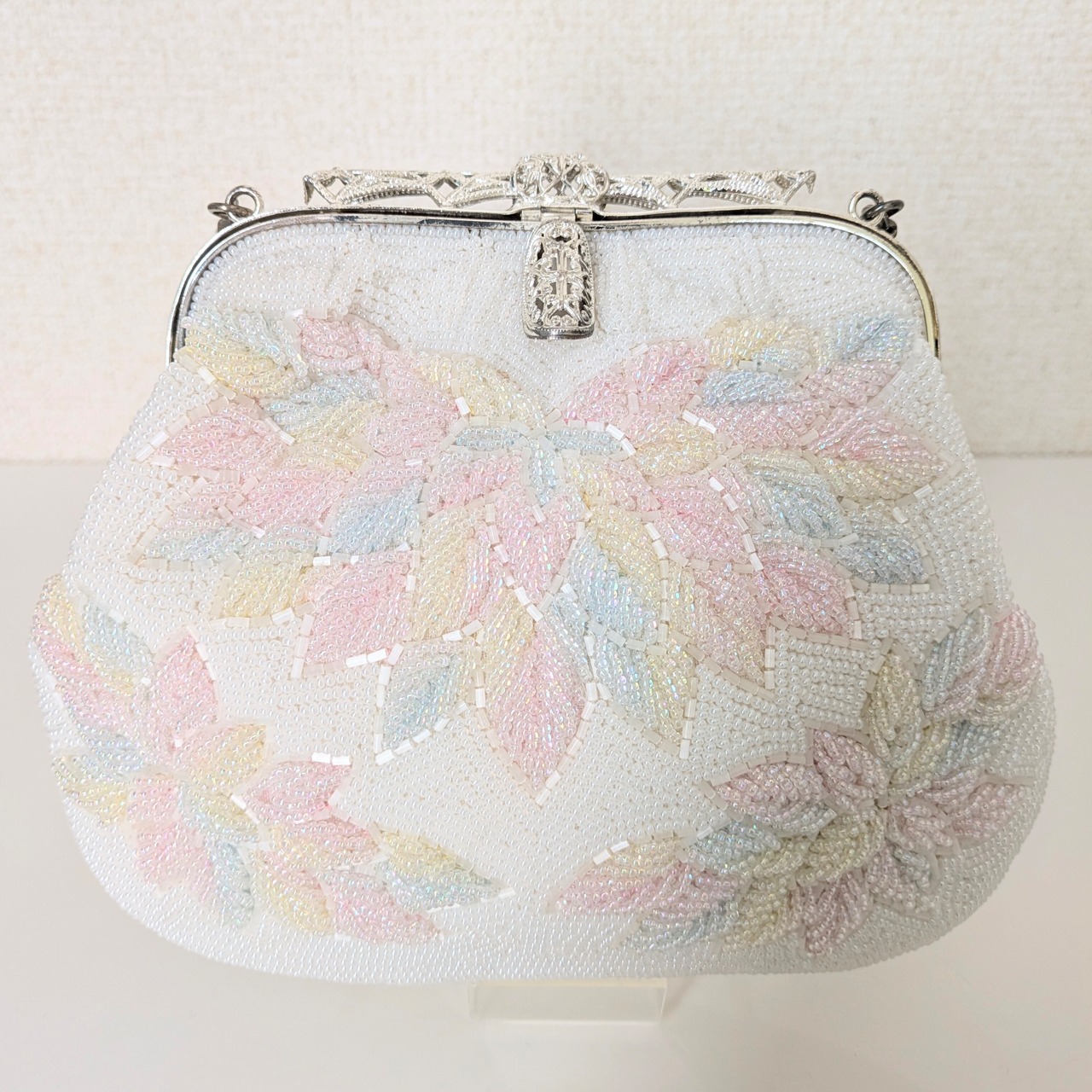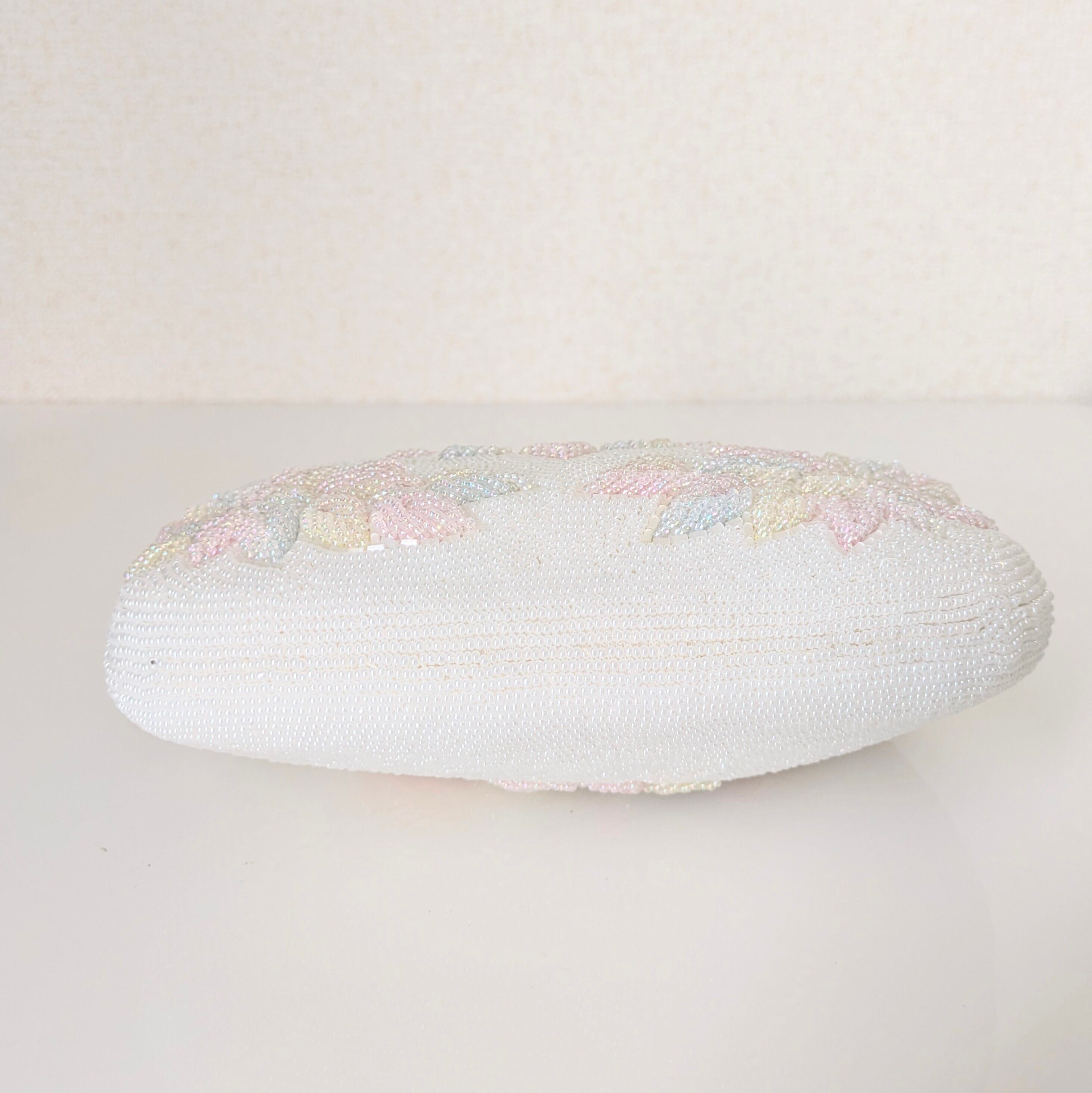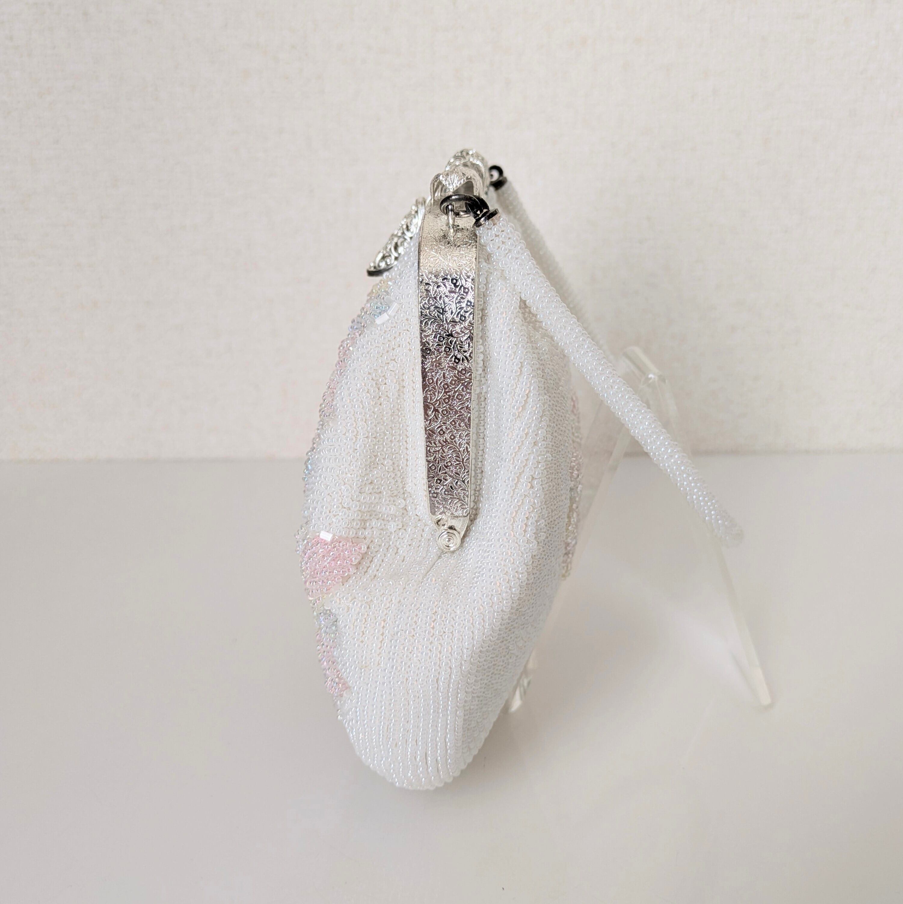 白地にパステルカラーの菊模様をあしらった小ぶりのビーズバッグです。パステルカラーの菊は、ふっくらと咲いているかのような美しい仕上がりです。